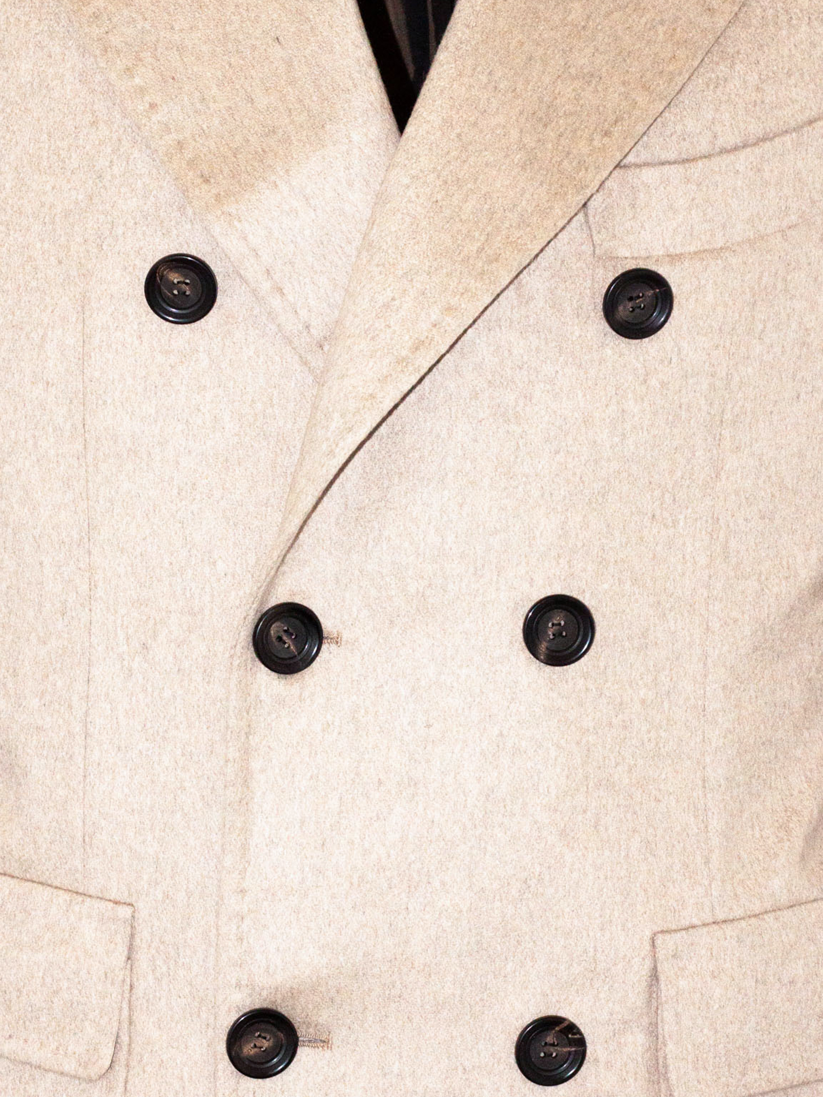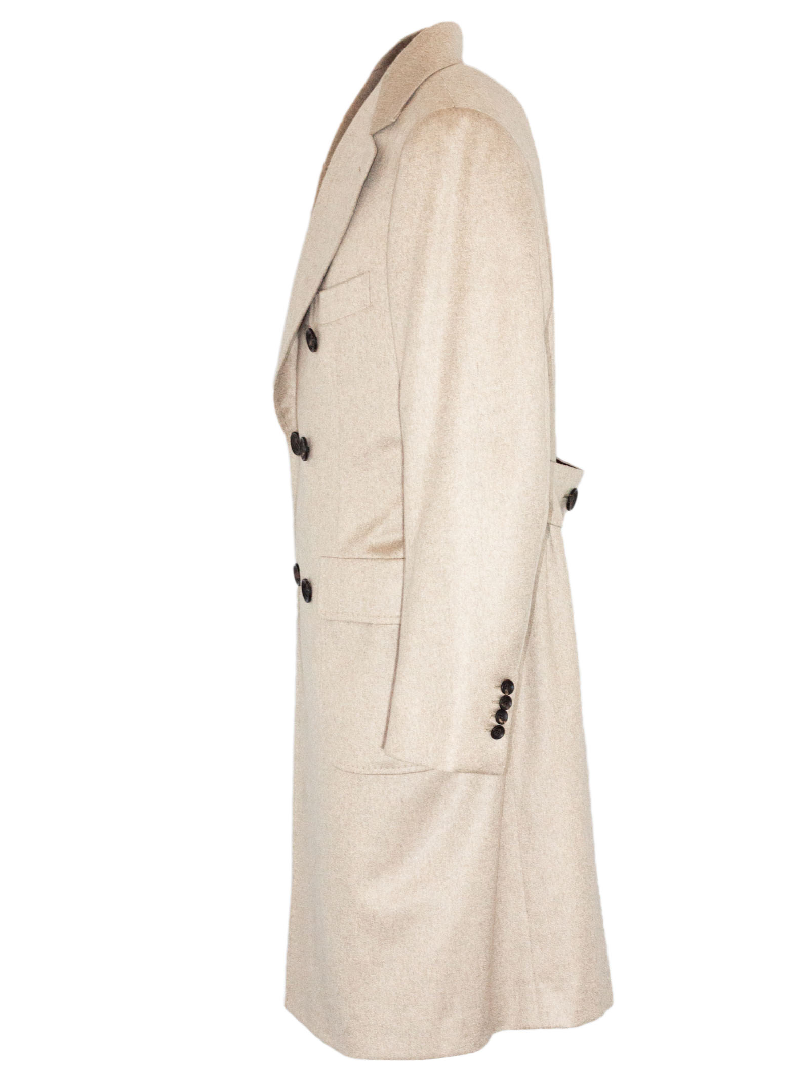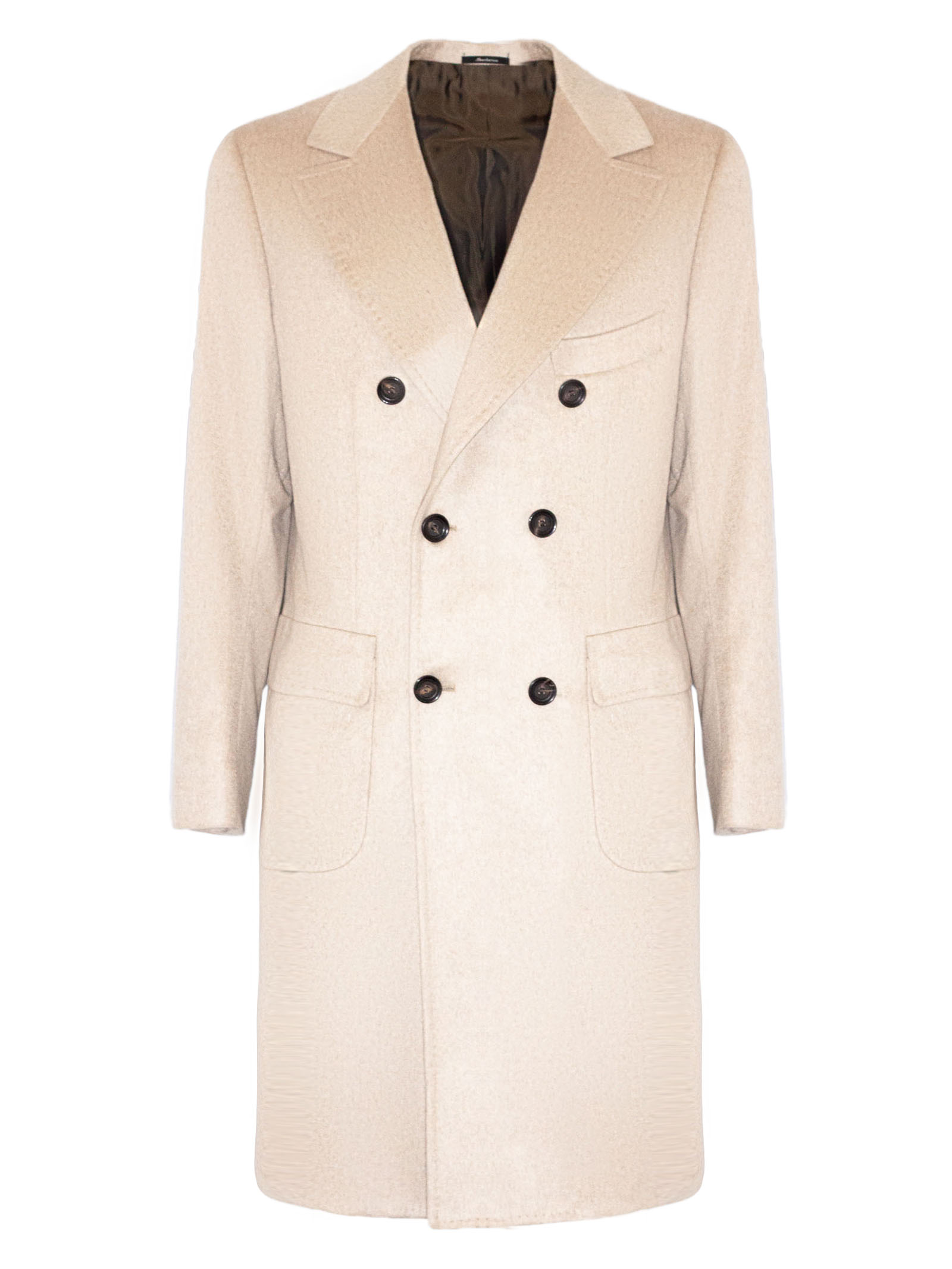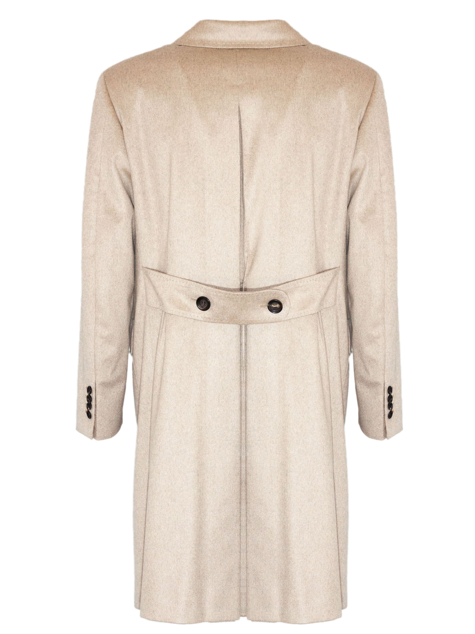 Beige cashmere coat with double-breasted fastening, classic lapel, breast pocket, side pockets with flaps, long sleeves with buttons, slit at the back