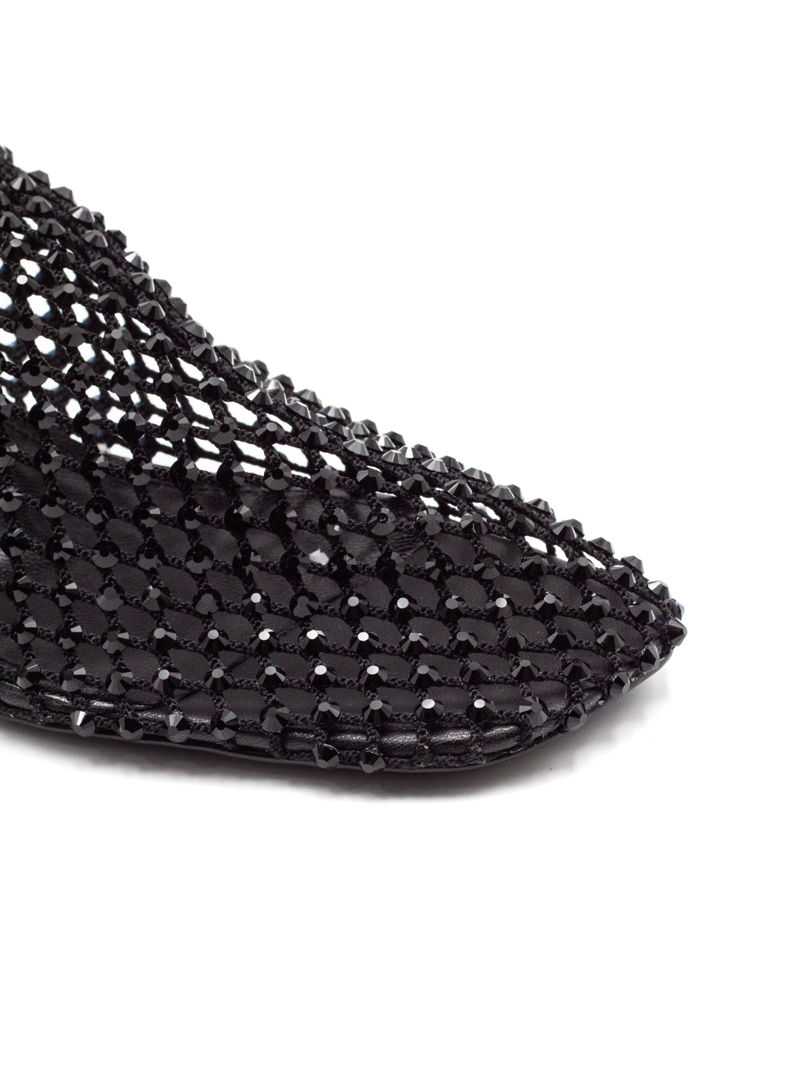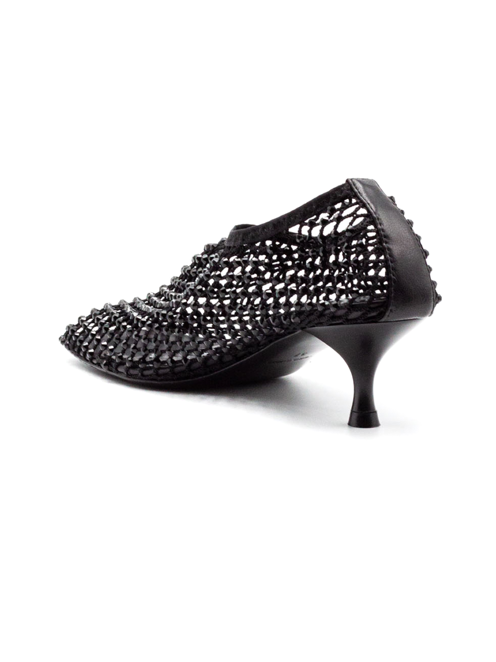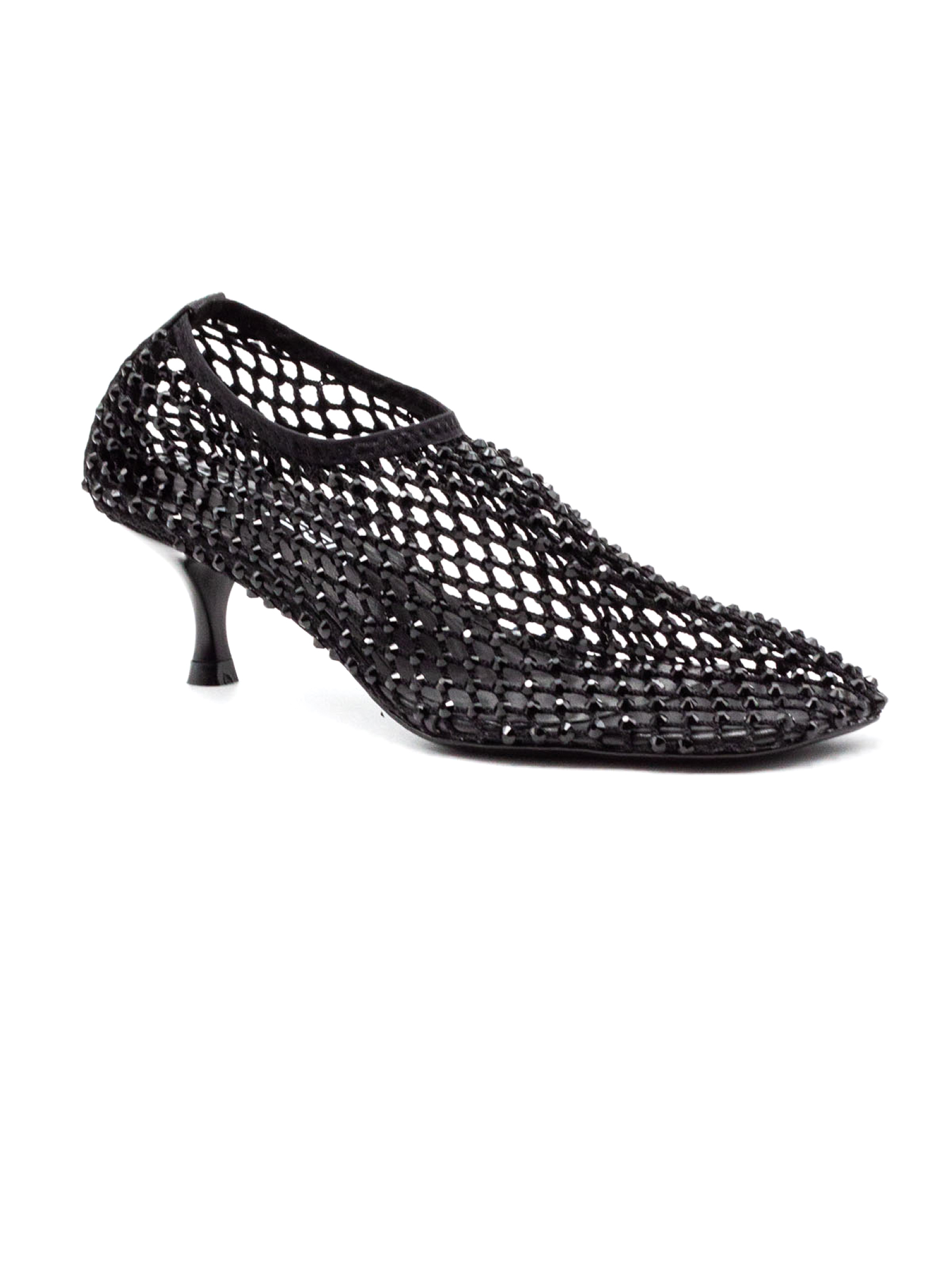 Black mesh pumps, sparkling rhinestone detailing and appliqués, matching elastic, leather insole and leather sole, altezza tacco 4 cm