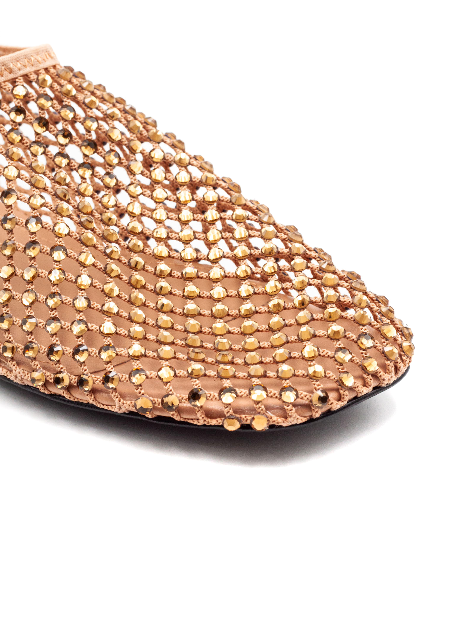 Copper-tone mesh ballet flats with sparkling rhinestone detailing and appliqués, matching elastic, leather insole and leather sole.