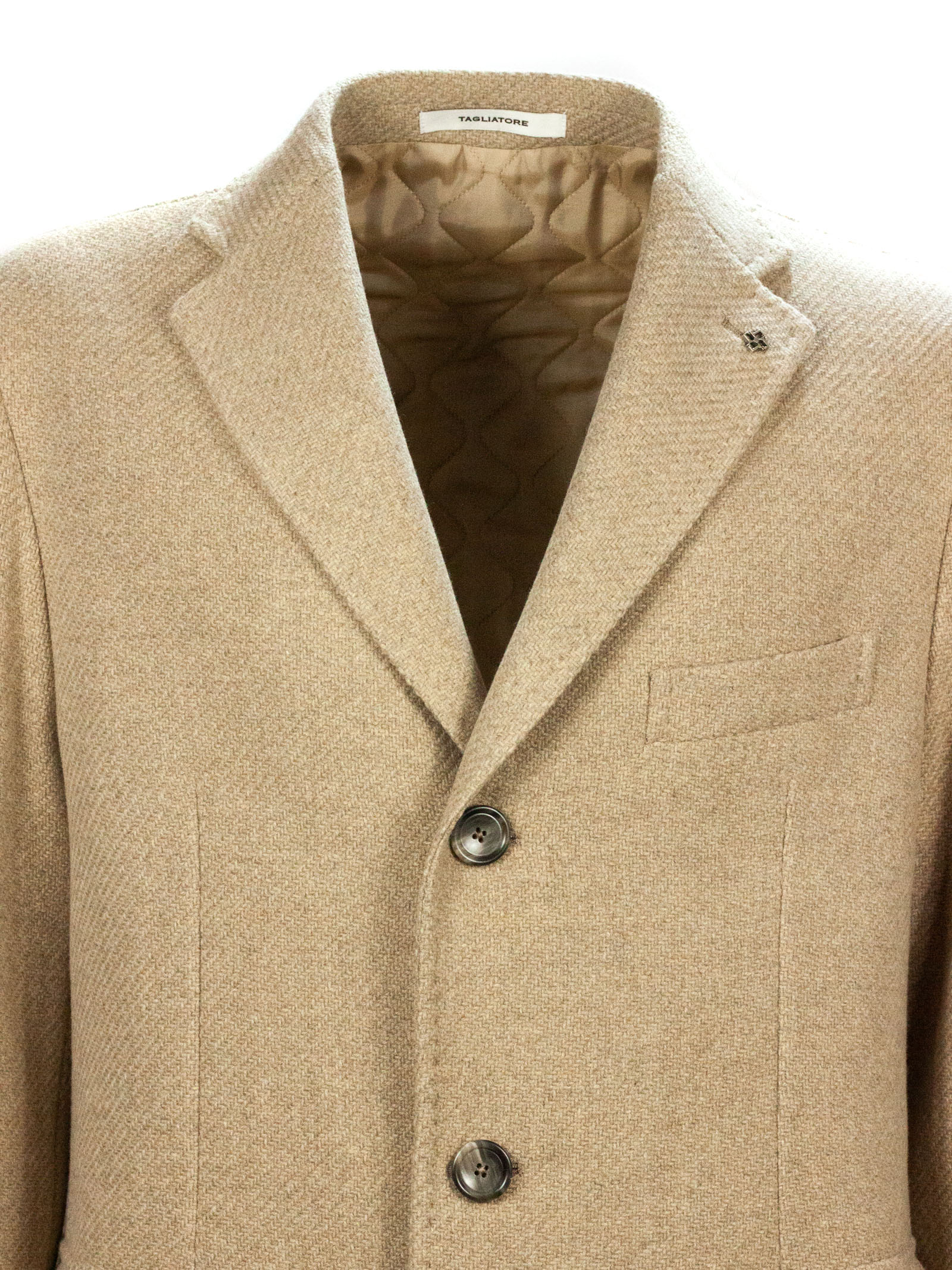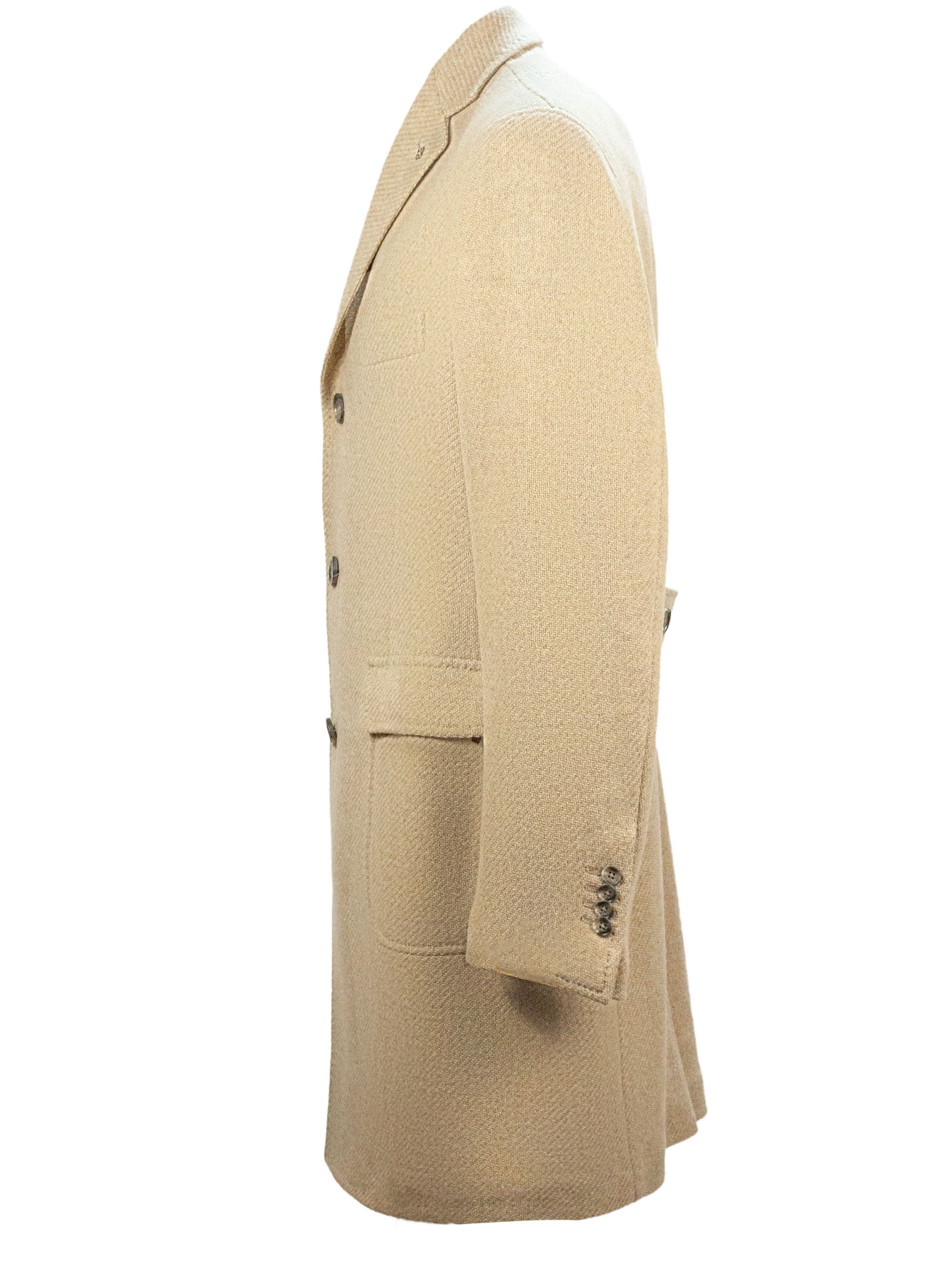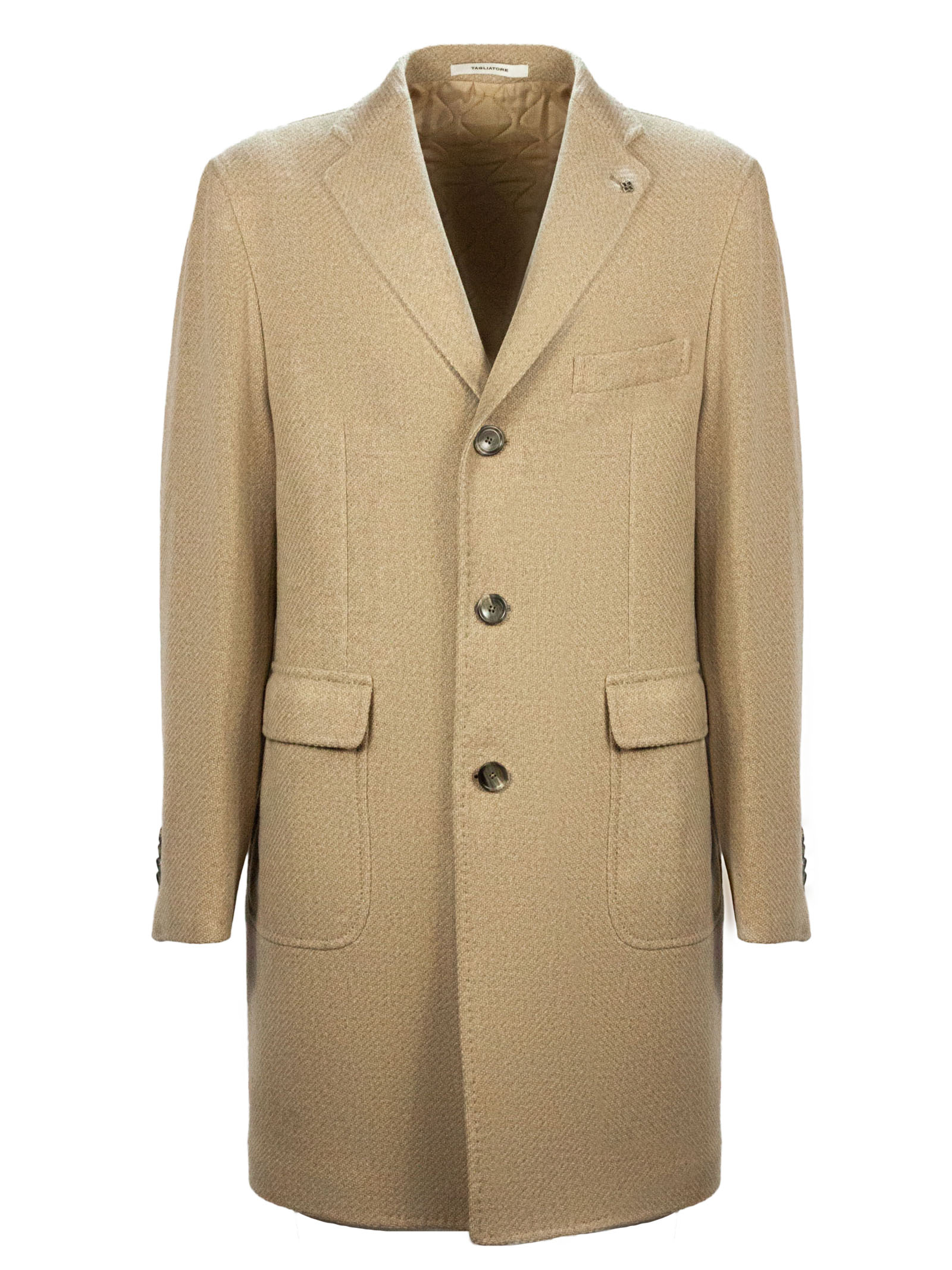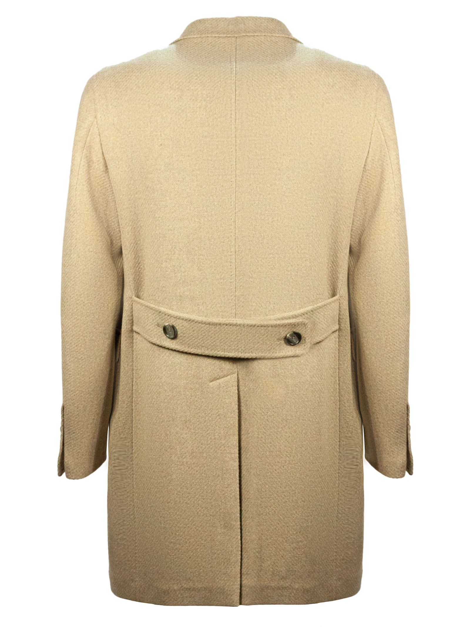Beige virgin wool and cashmere blend coat, single-breasted closure, iconic brand brooch detail, classic lapel, side pockets with flaps, breast pocket, buttoned cuffs, back vent, cupro lining, 90% Virgin wool 10% Cashmere, Lining: 100% Cupro