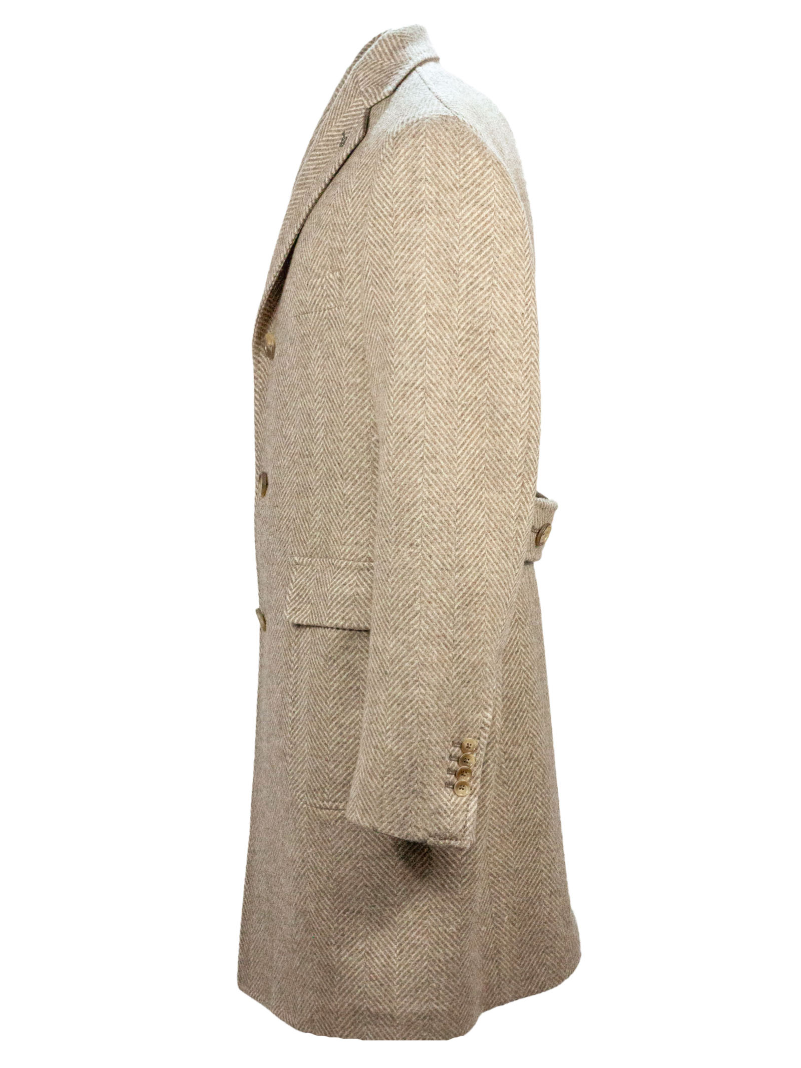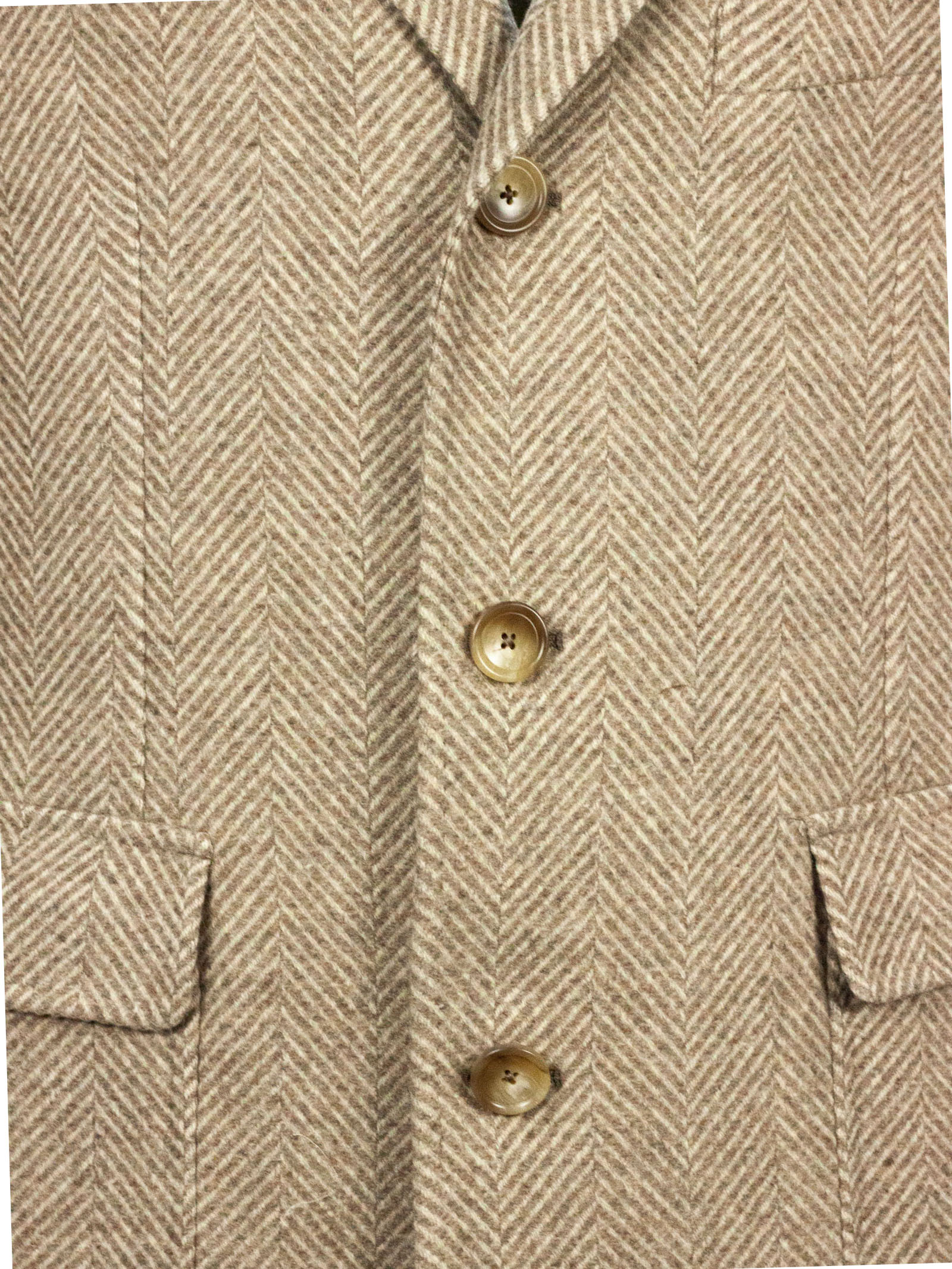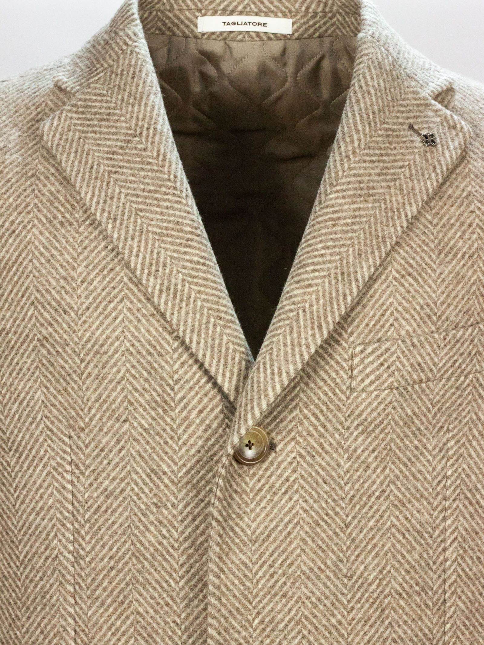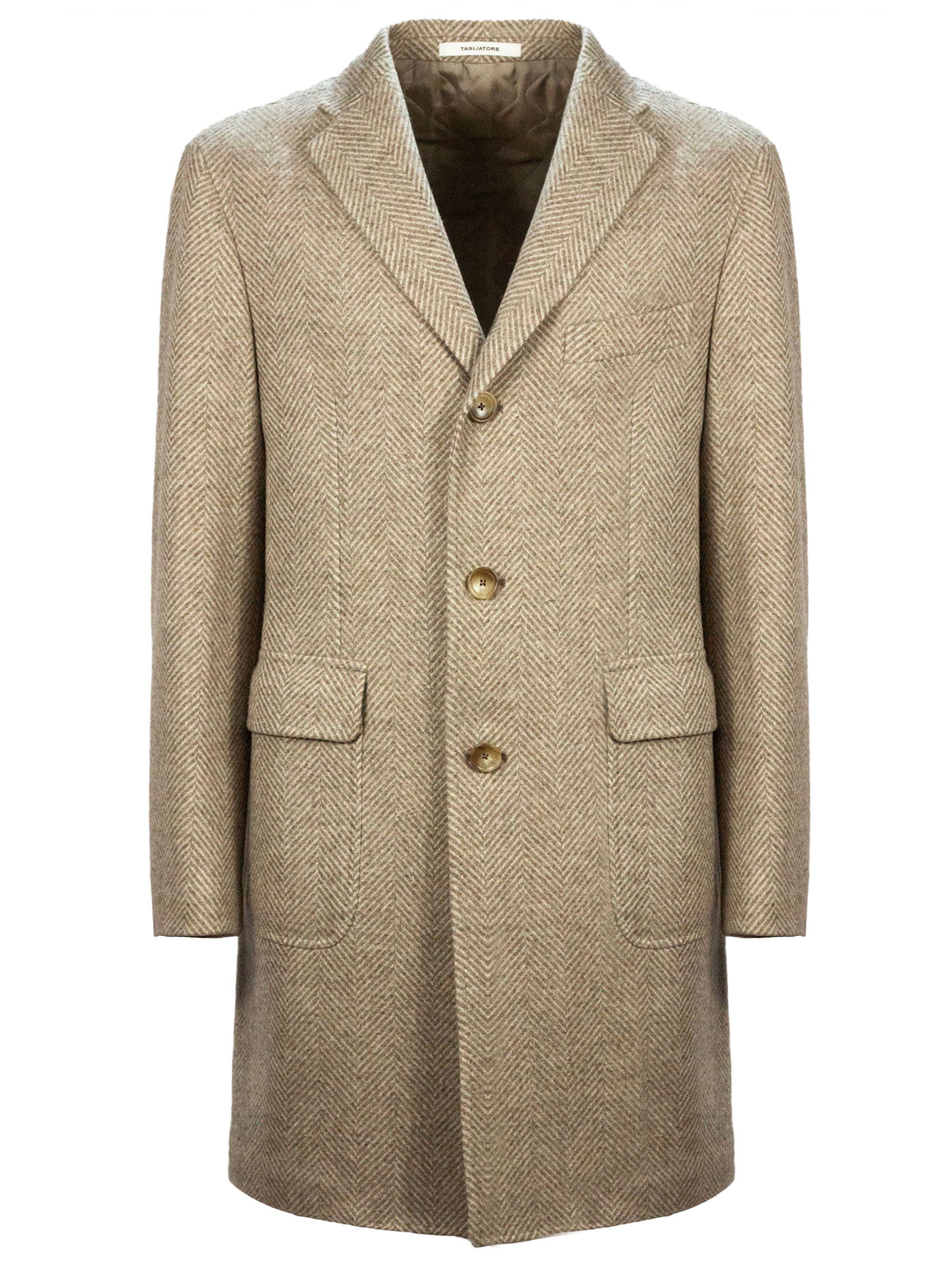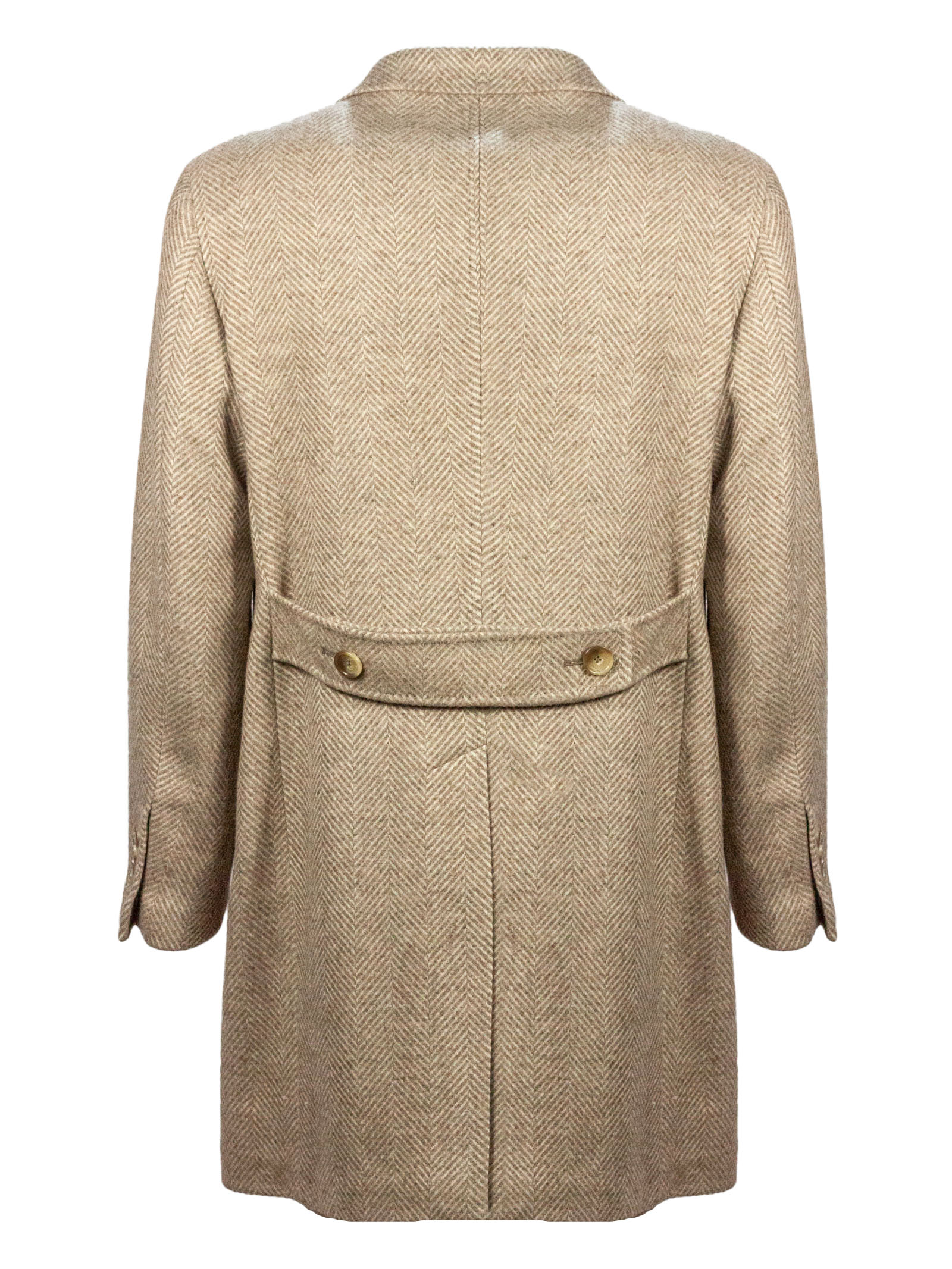 Beige virgin wool blend coat with herringbone weave, single-breasted closure, iconic brand brooch detail, classic lapel, side pockets with flaps, breast pocket, buttoned cuffs, back vent, cupro lining, 80% Virgin wool 20% Polyester, Lining: 100% Cupro
