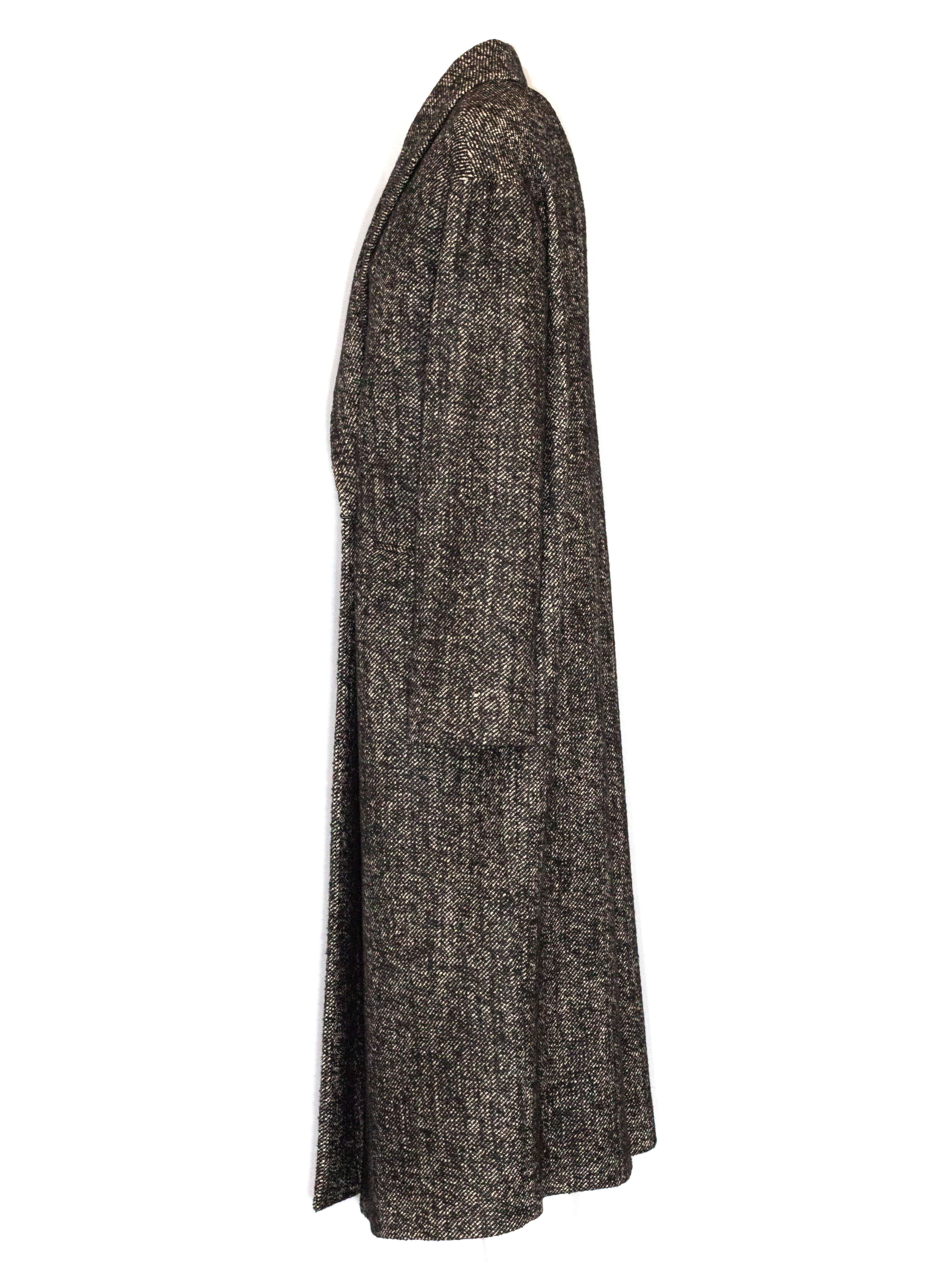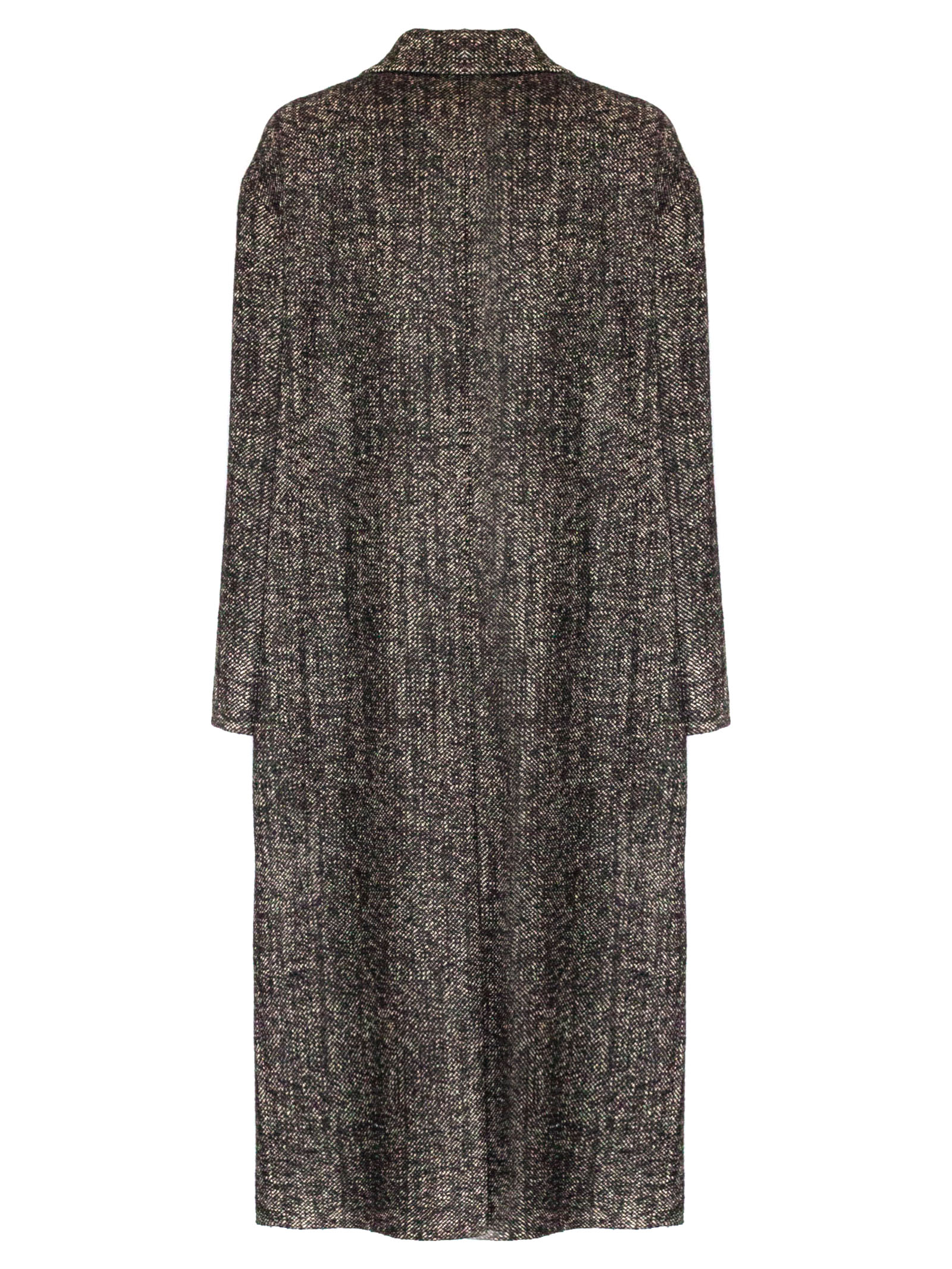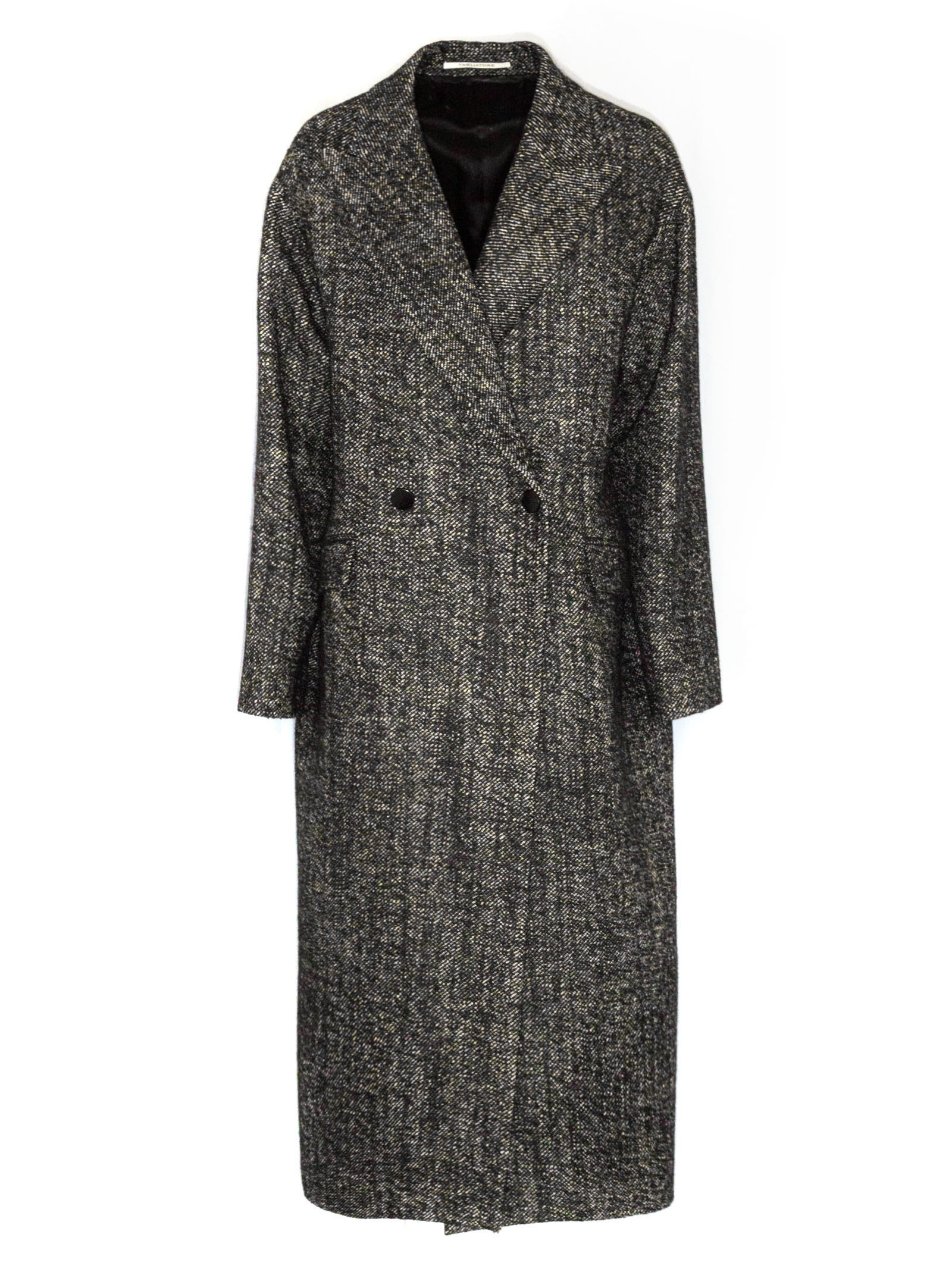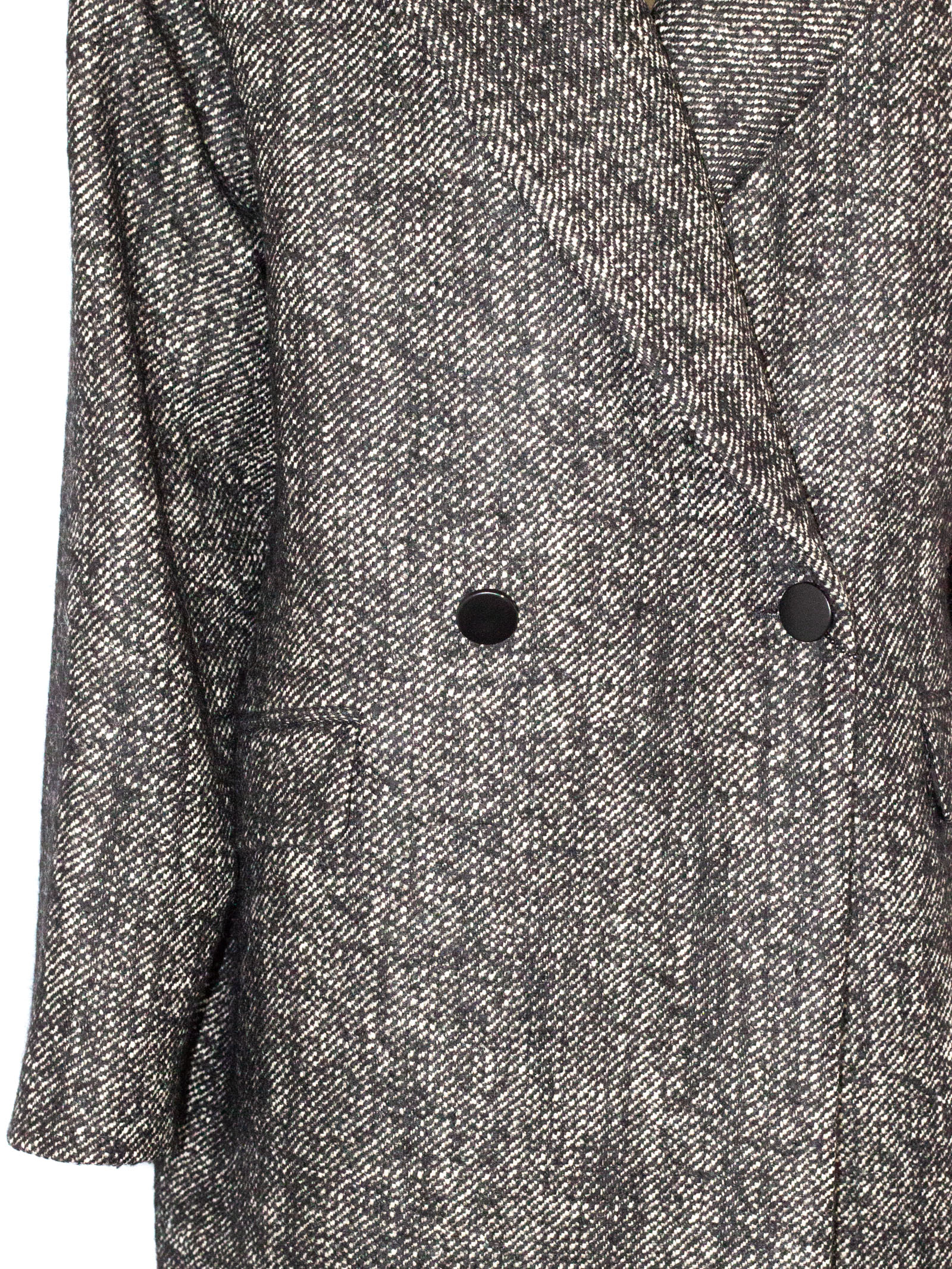 Black and white virgin wool blend coat with double-breasted fastening, black buttons, side pockets with flaps, classic lapels, back vent, lined
