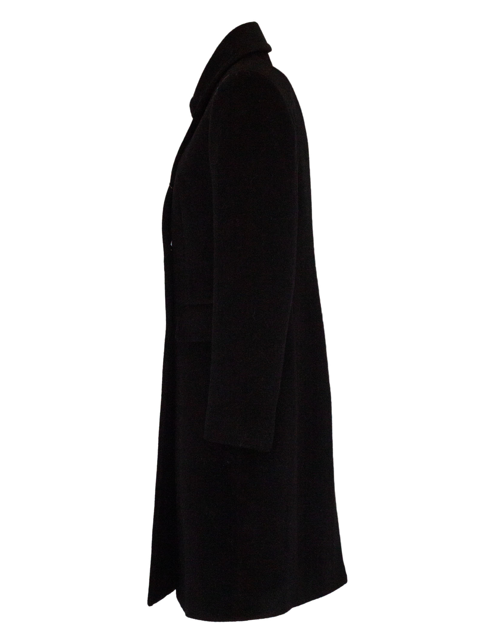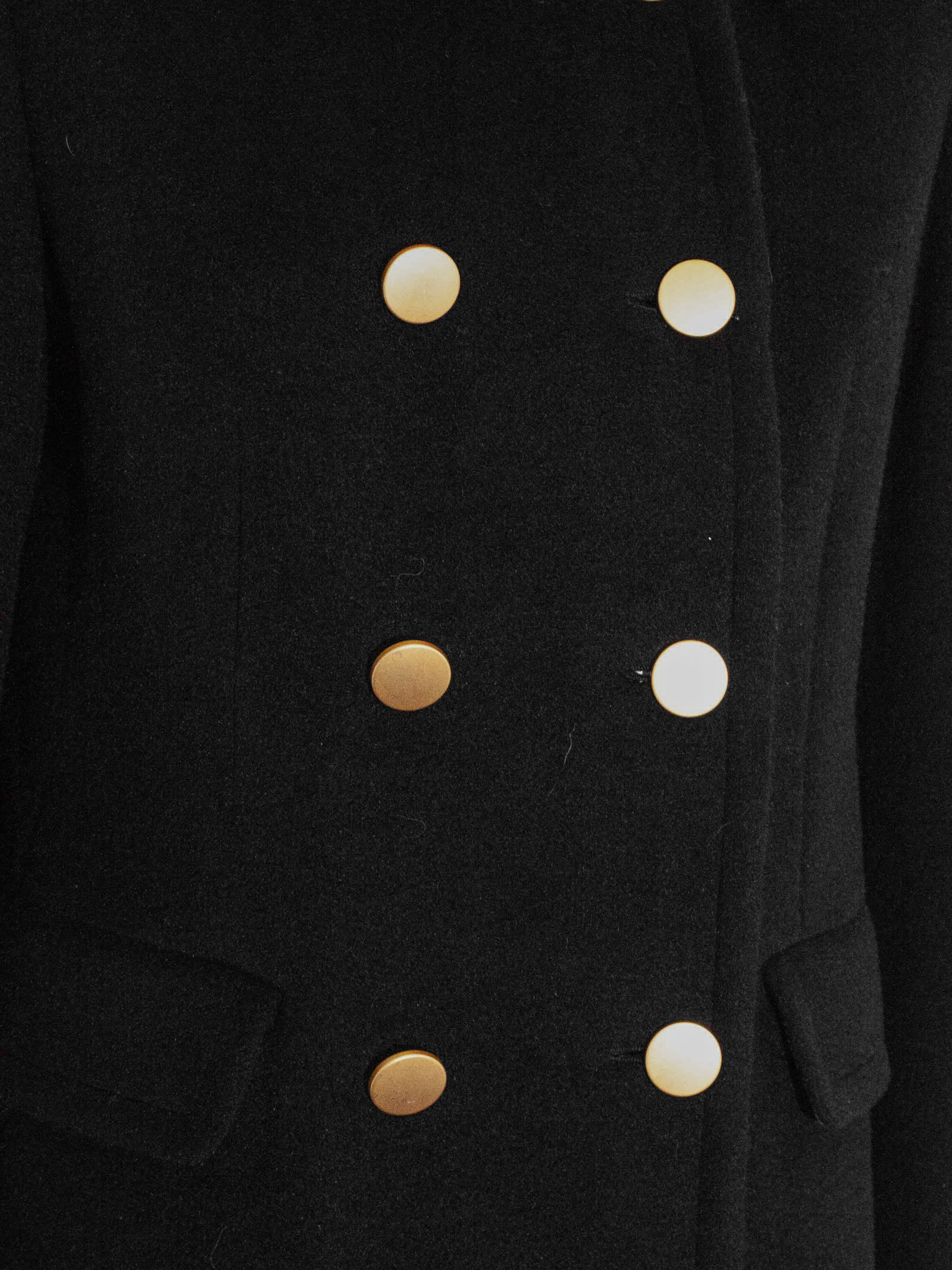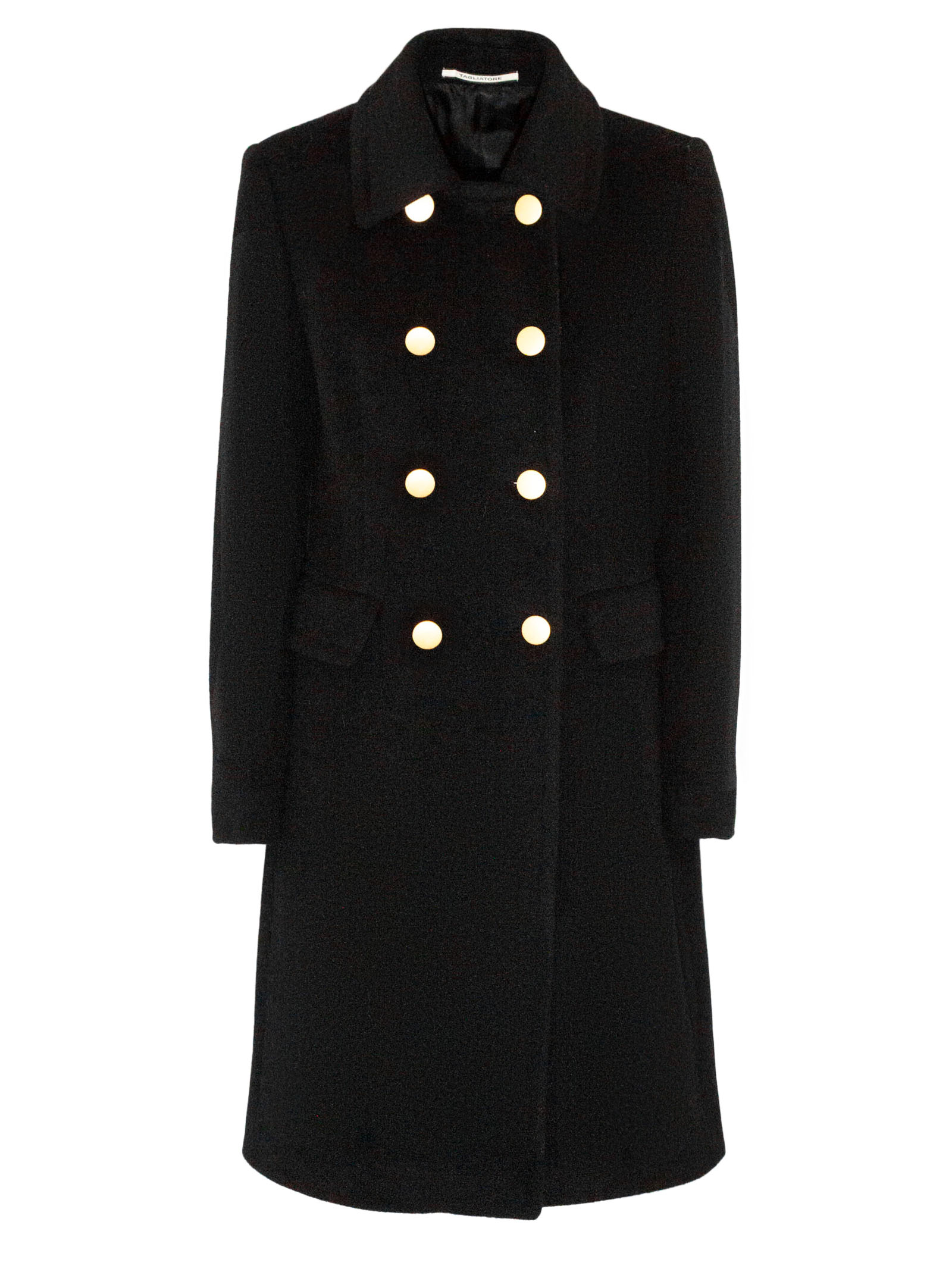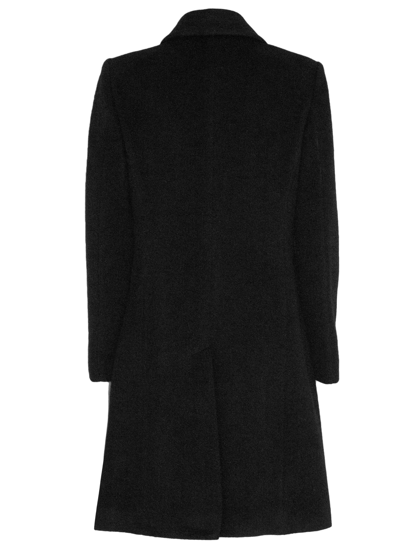 Double-breasted coat in black virgin wool and mohair, gold-tone metal buttons, flap pockets, classic collar, slit at the back