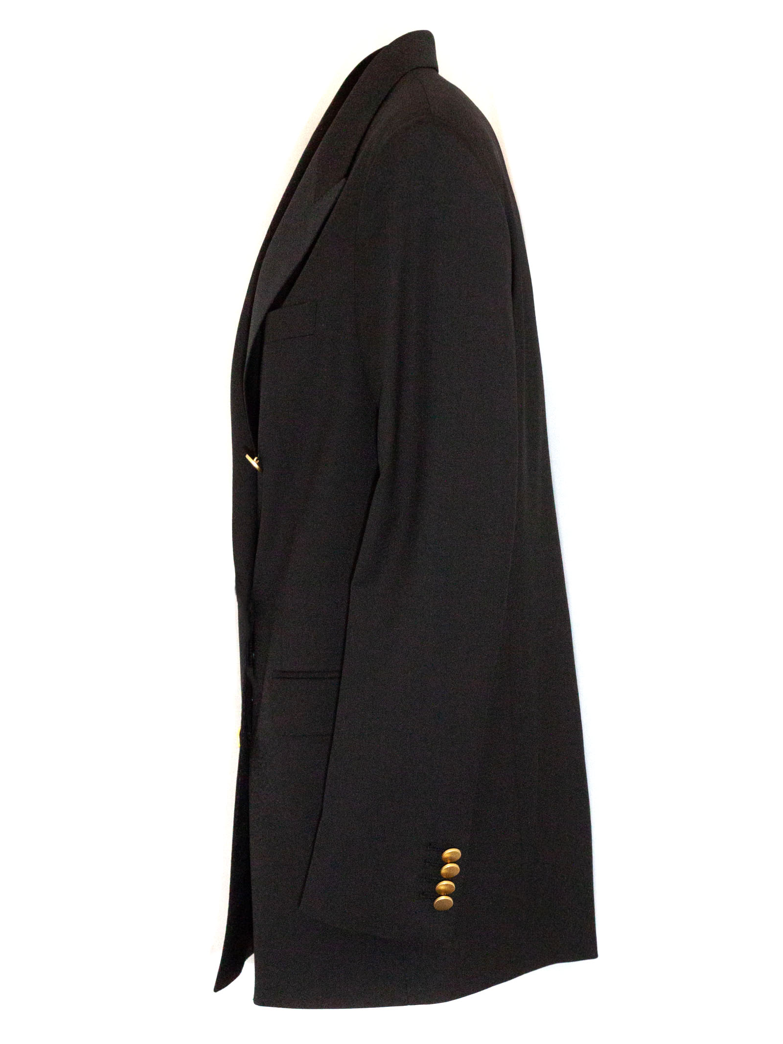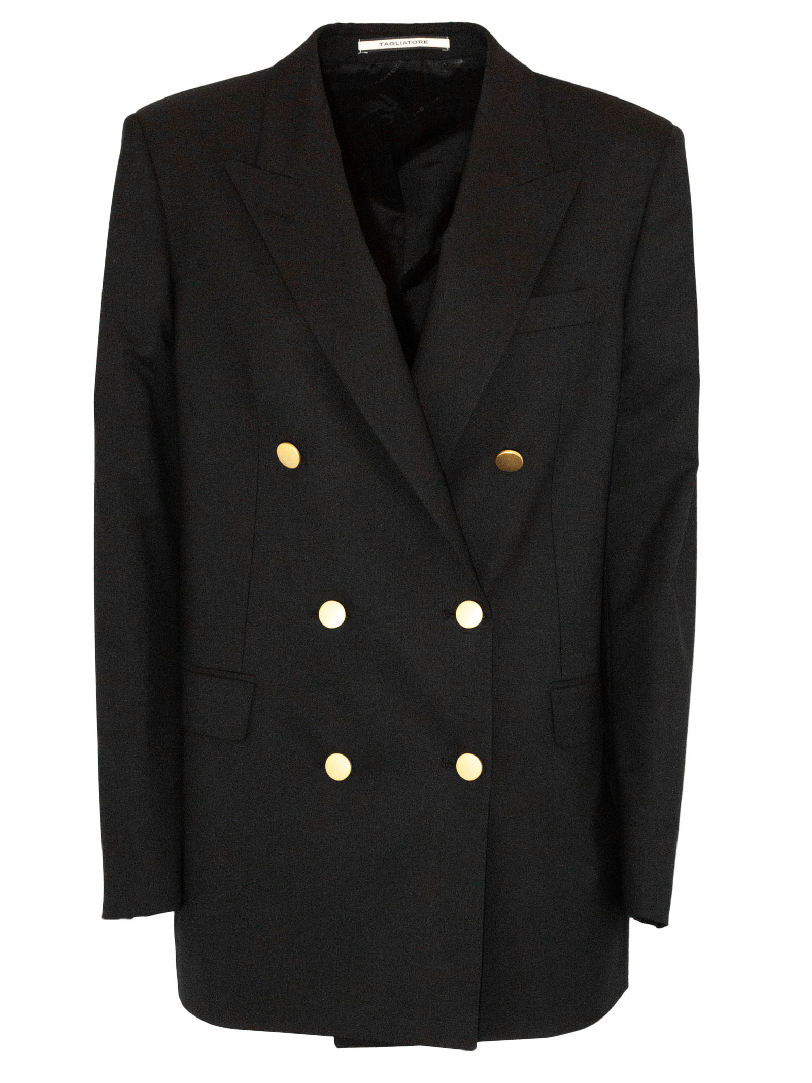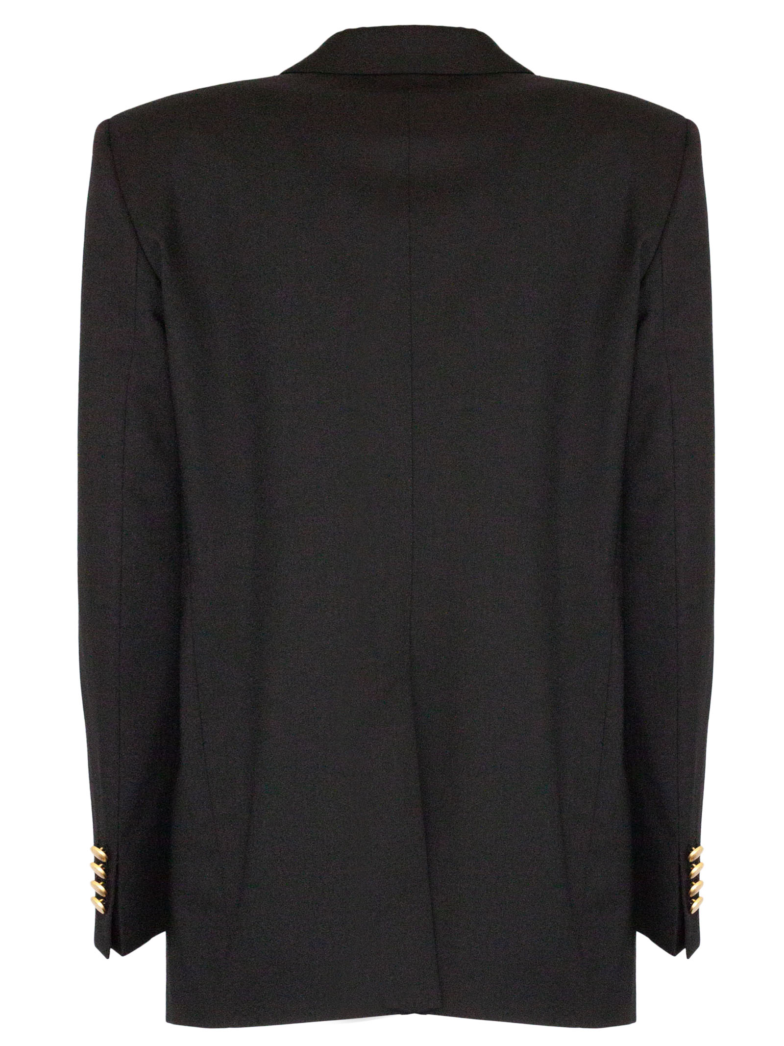 Black virgin wool blazer with double-breasted closure, gold-coloured metal buttons, classic lapels, flap pocket, breast pocket, buttoned sleeves, vent at the back, lined