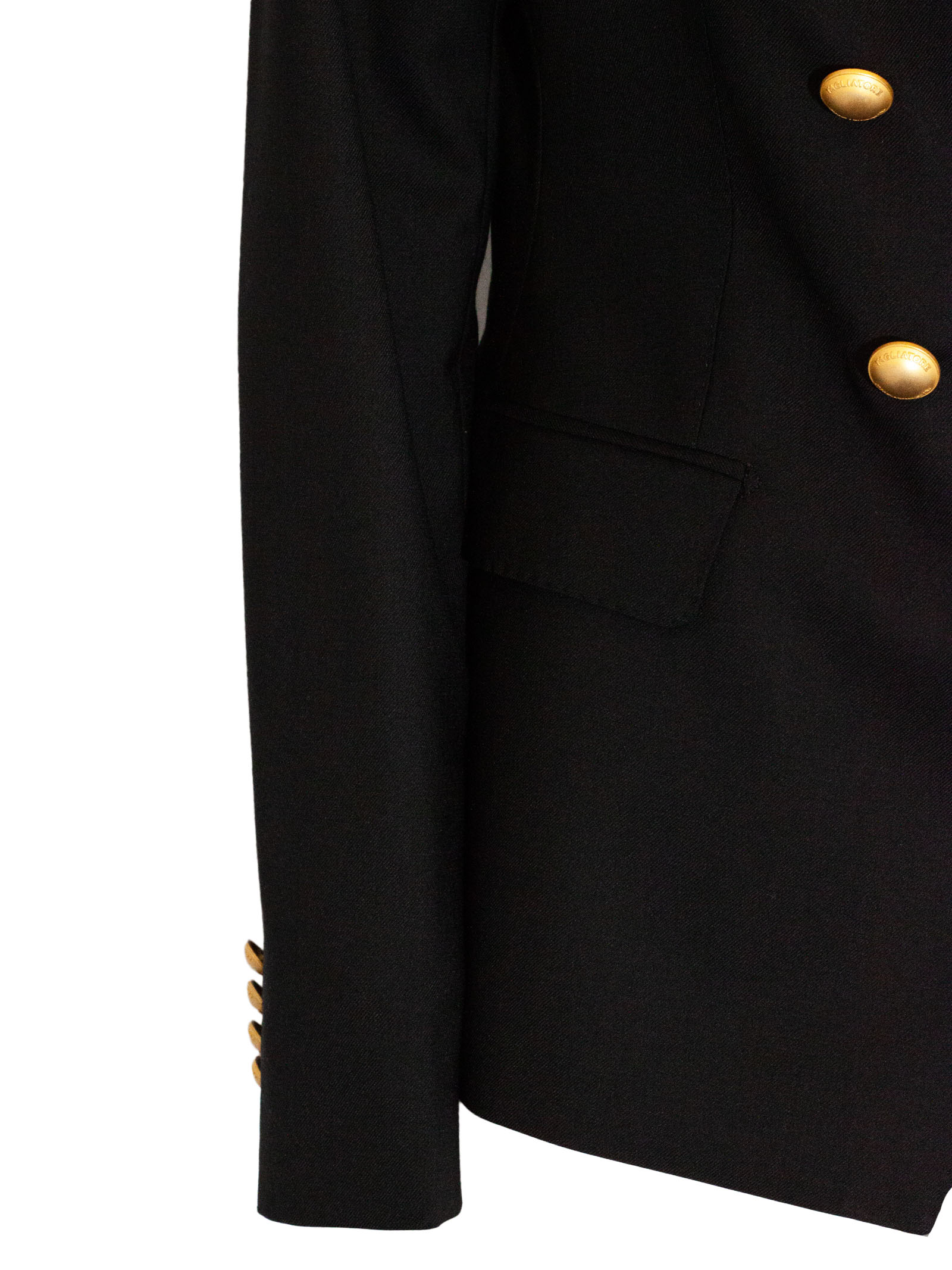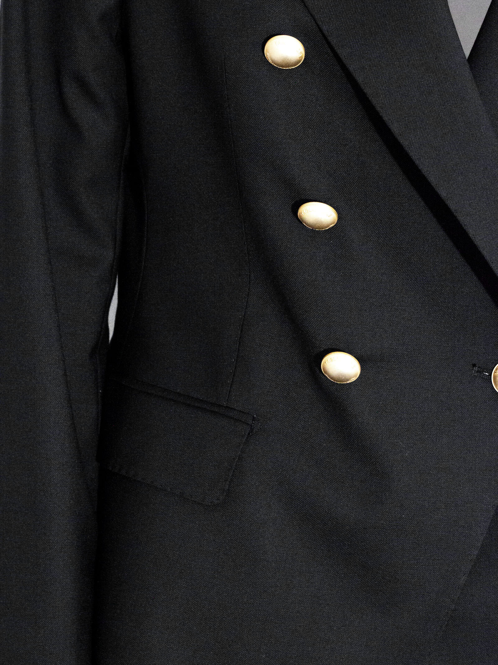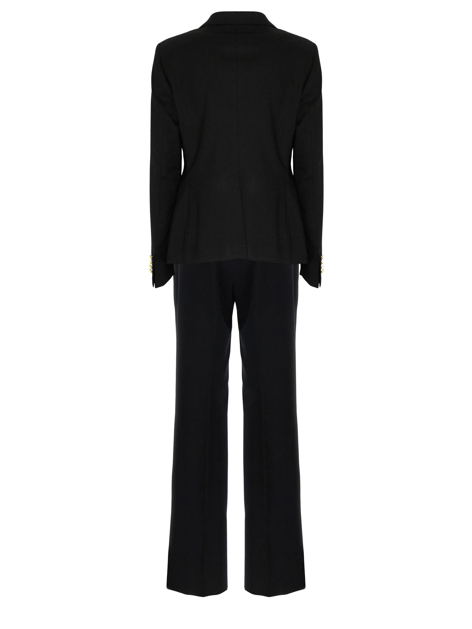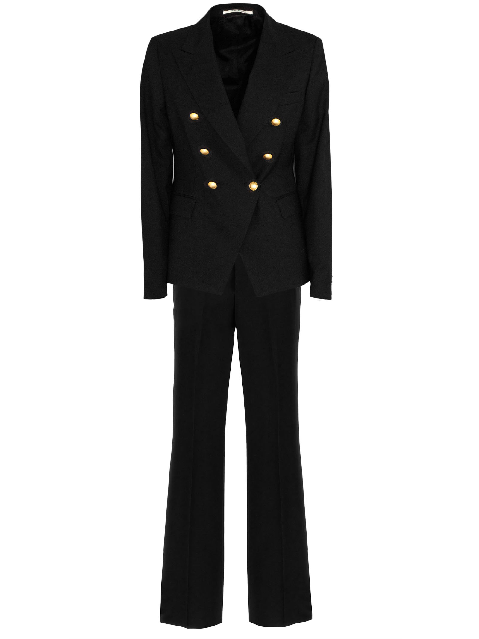 Black virgin wool blend suit with double-breasted closure, classic lapels, gold-coloured metal button closure, back vent, high-waisted trousers with concealed closure, wide leg
