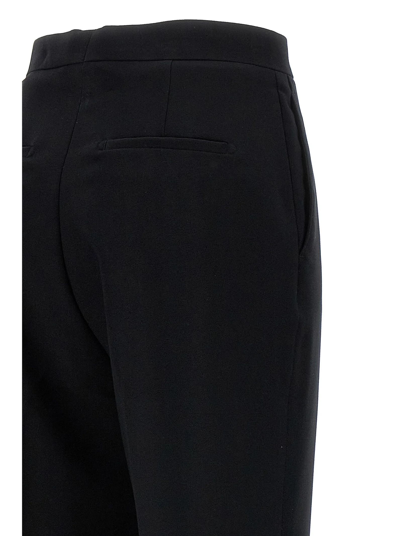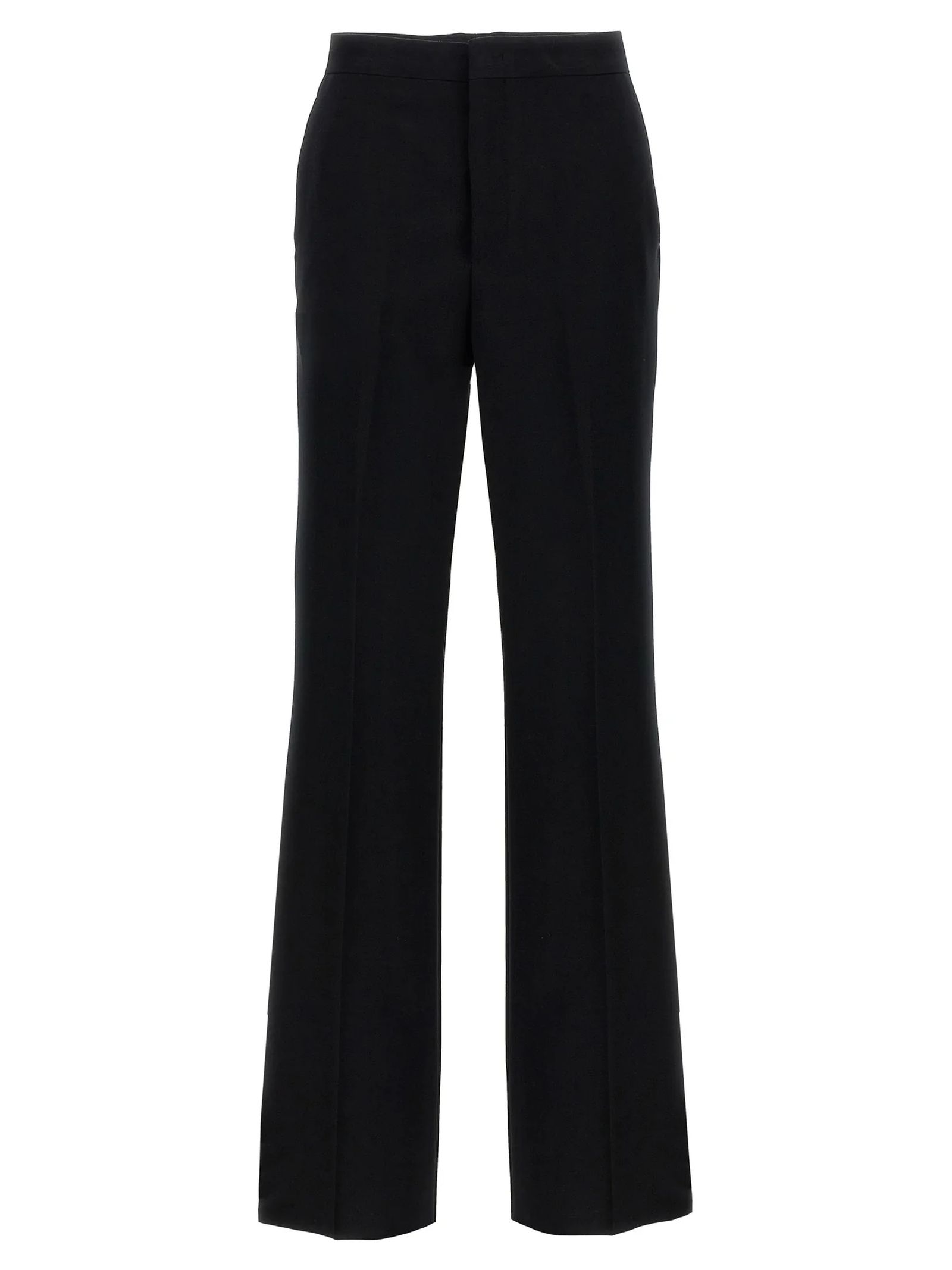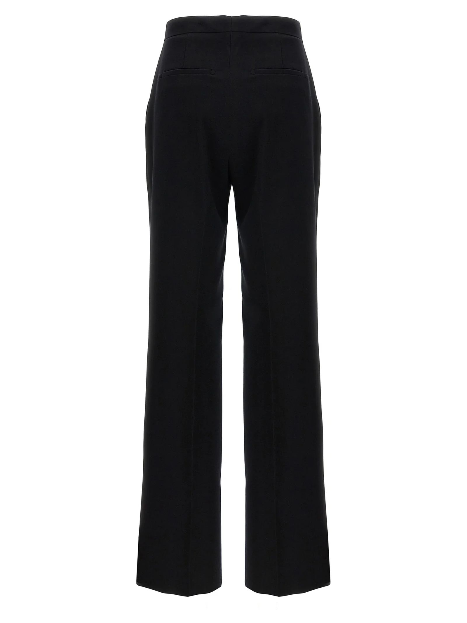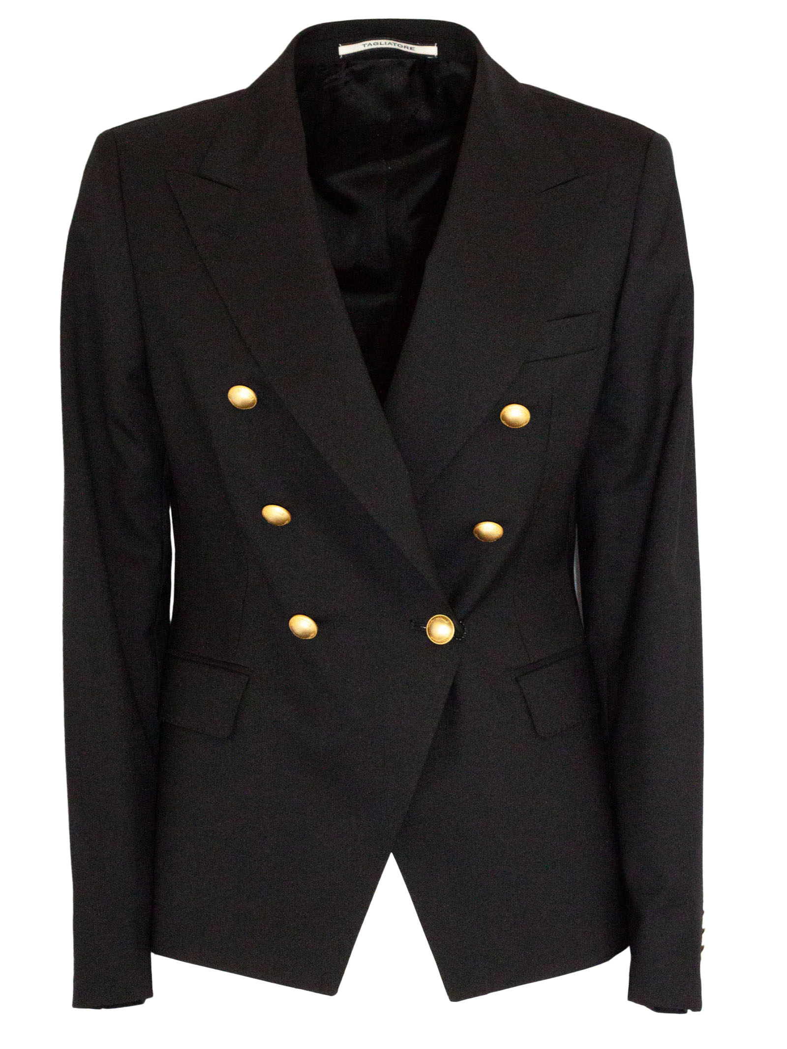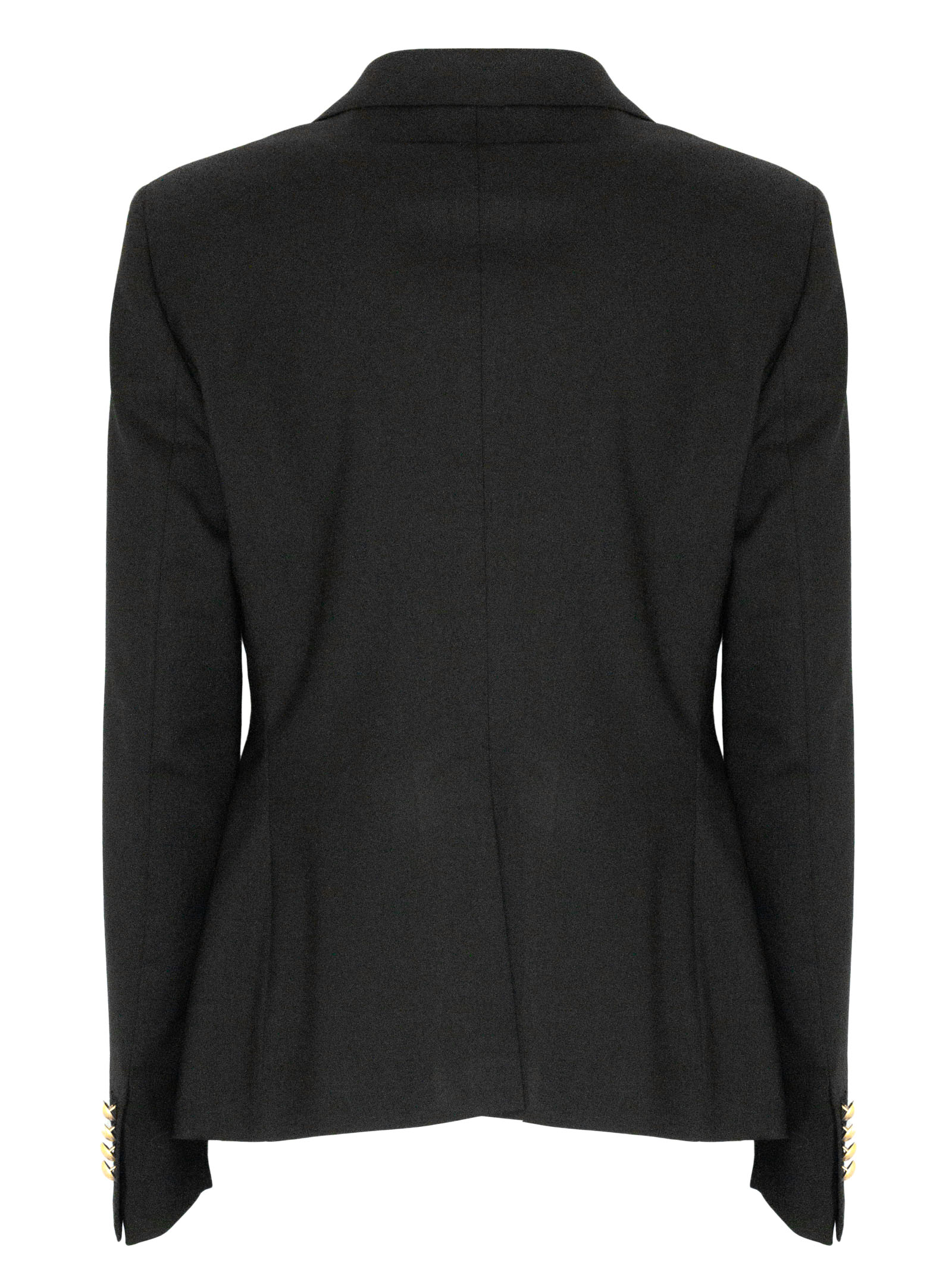 Black virgin wool blend suit with double-breasted closure, classic lapels, gold-coloured metal button closure, back vent, high-waisted trousers with concealed closure, wide leg