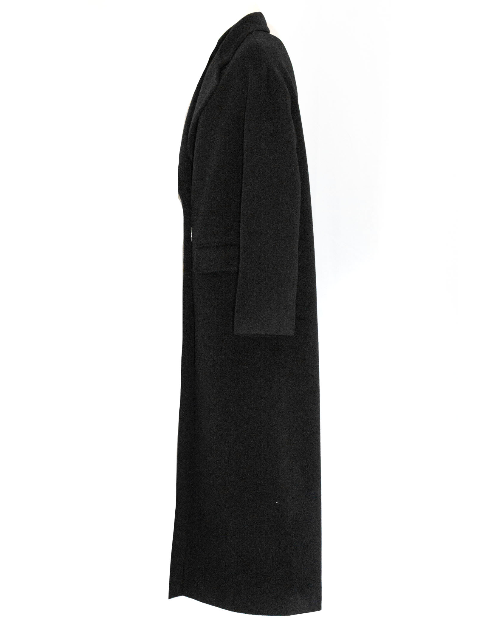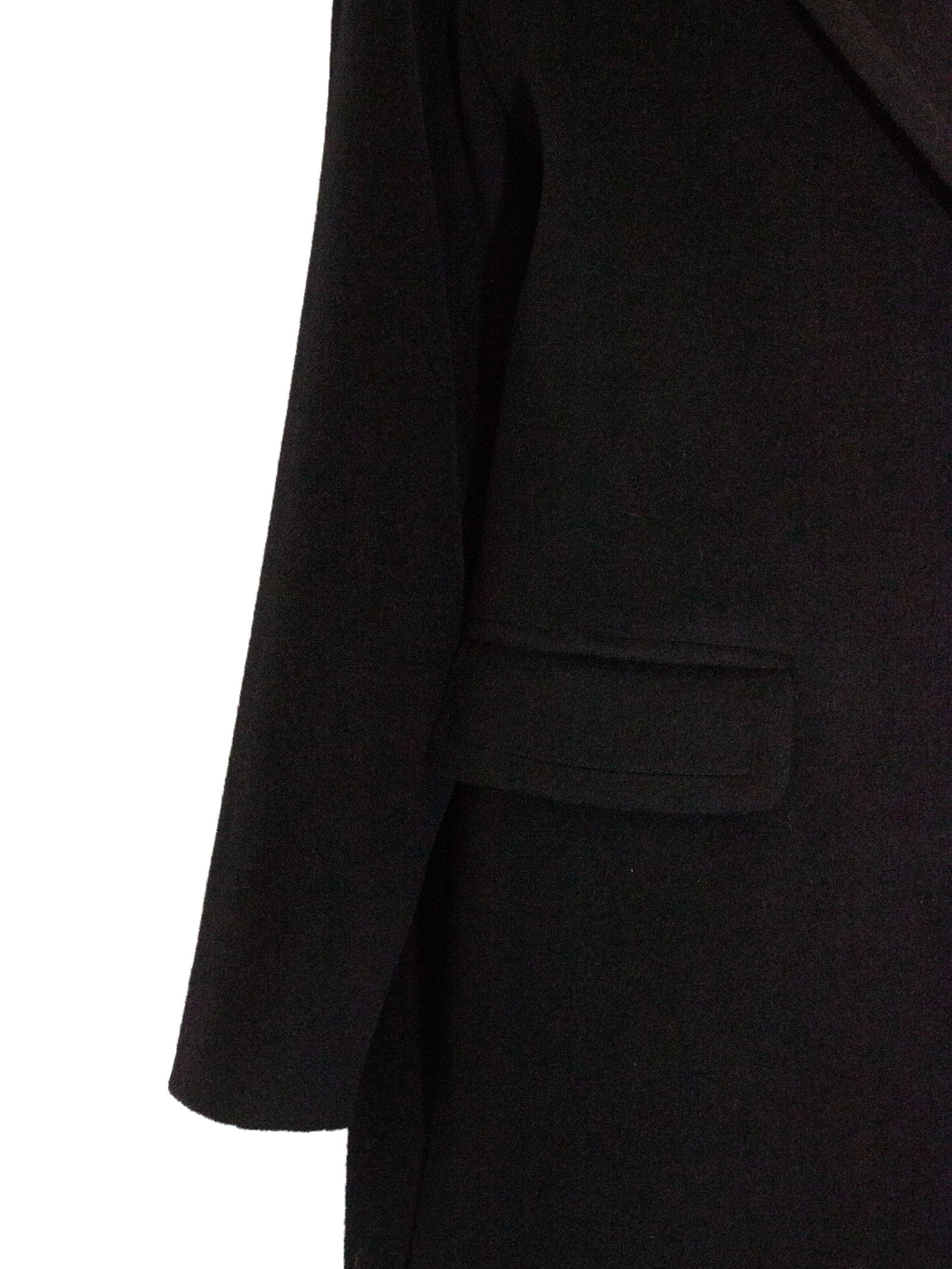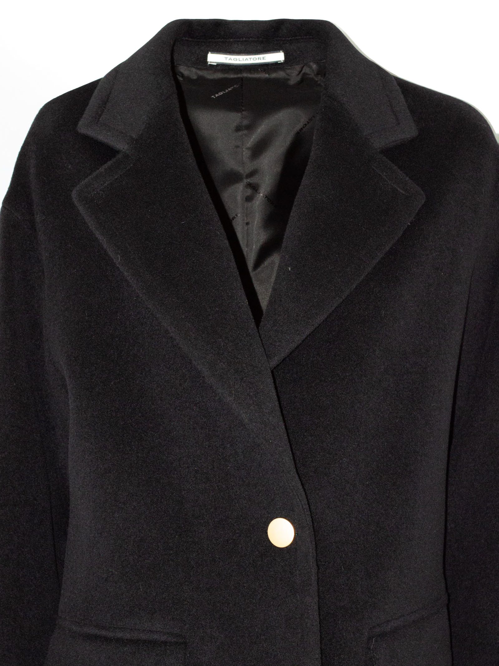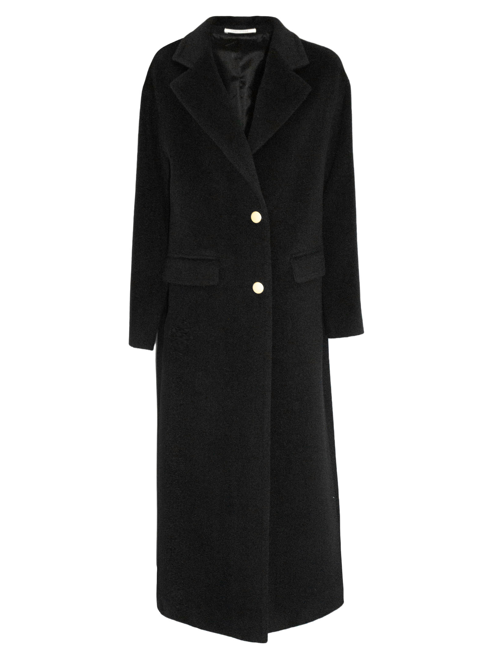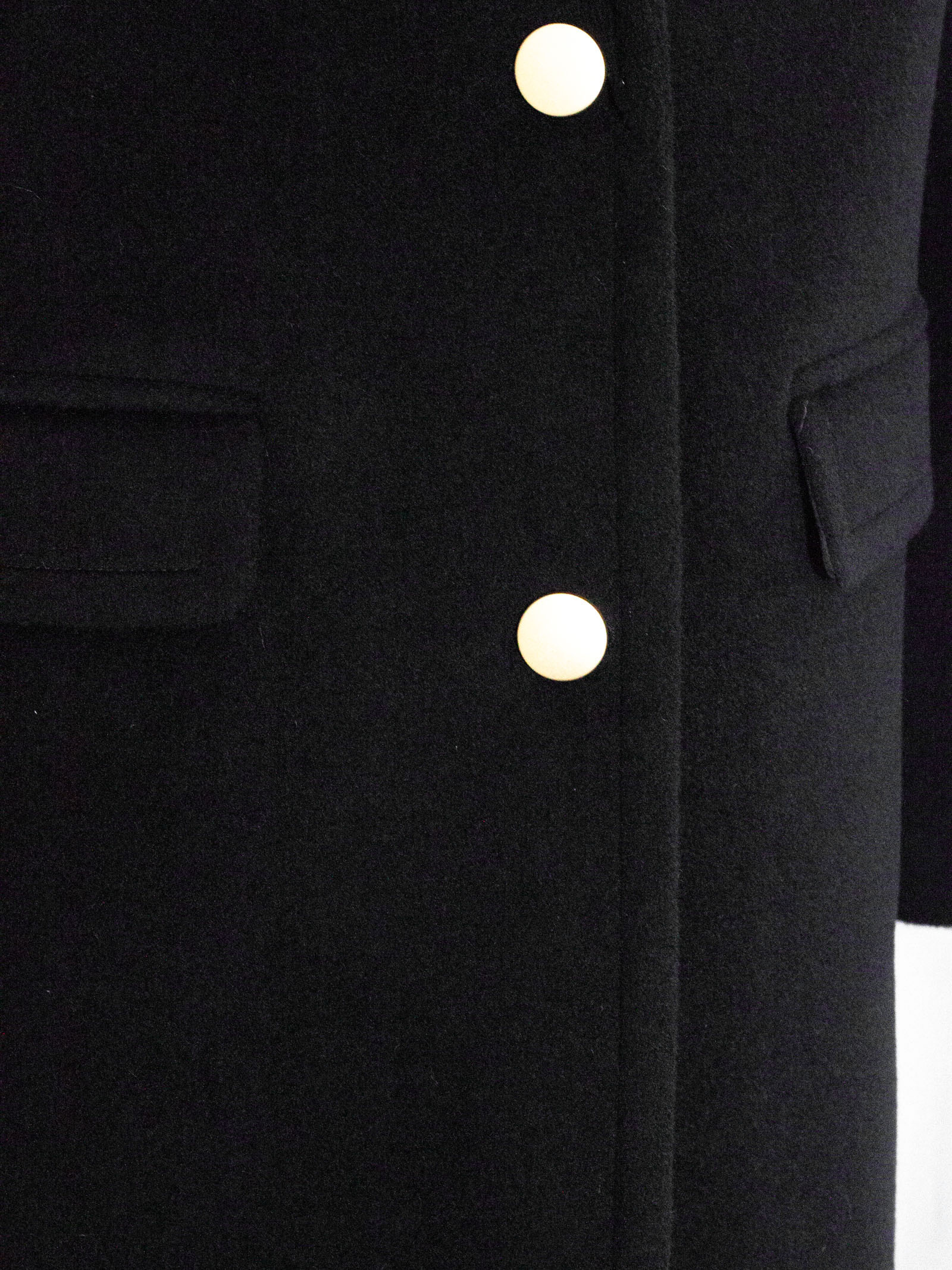 Black virgin wool coat with single-breasted closure, gold-coloured metal buttons, side pockets with flaps, classic lapels, back vent, lined