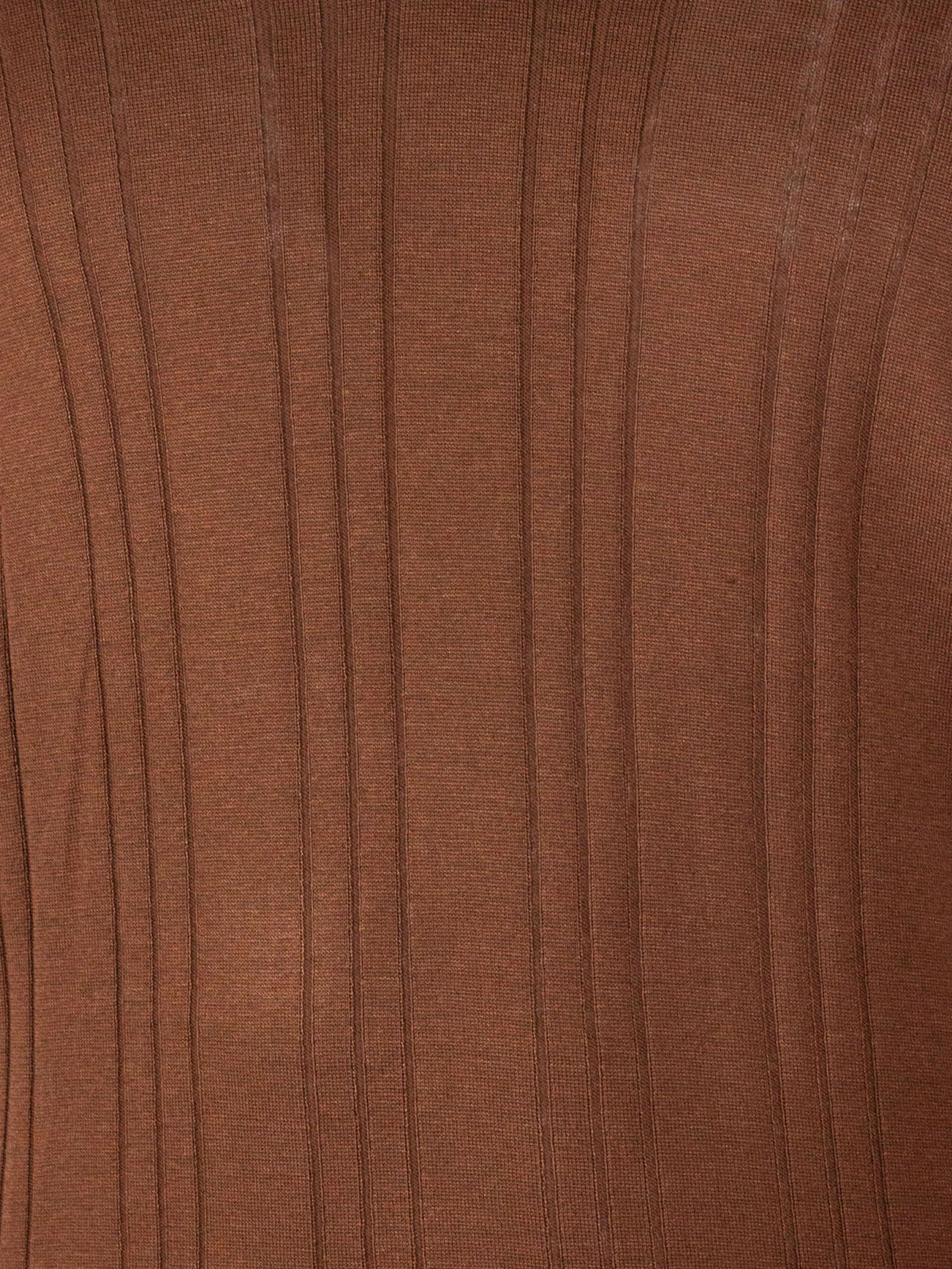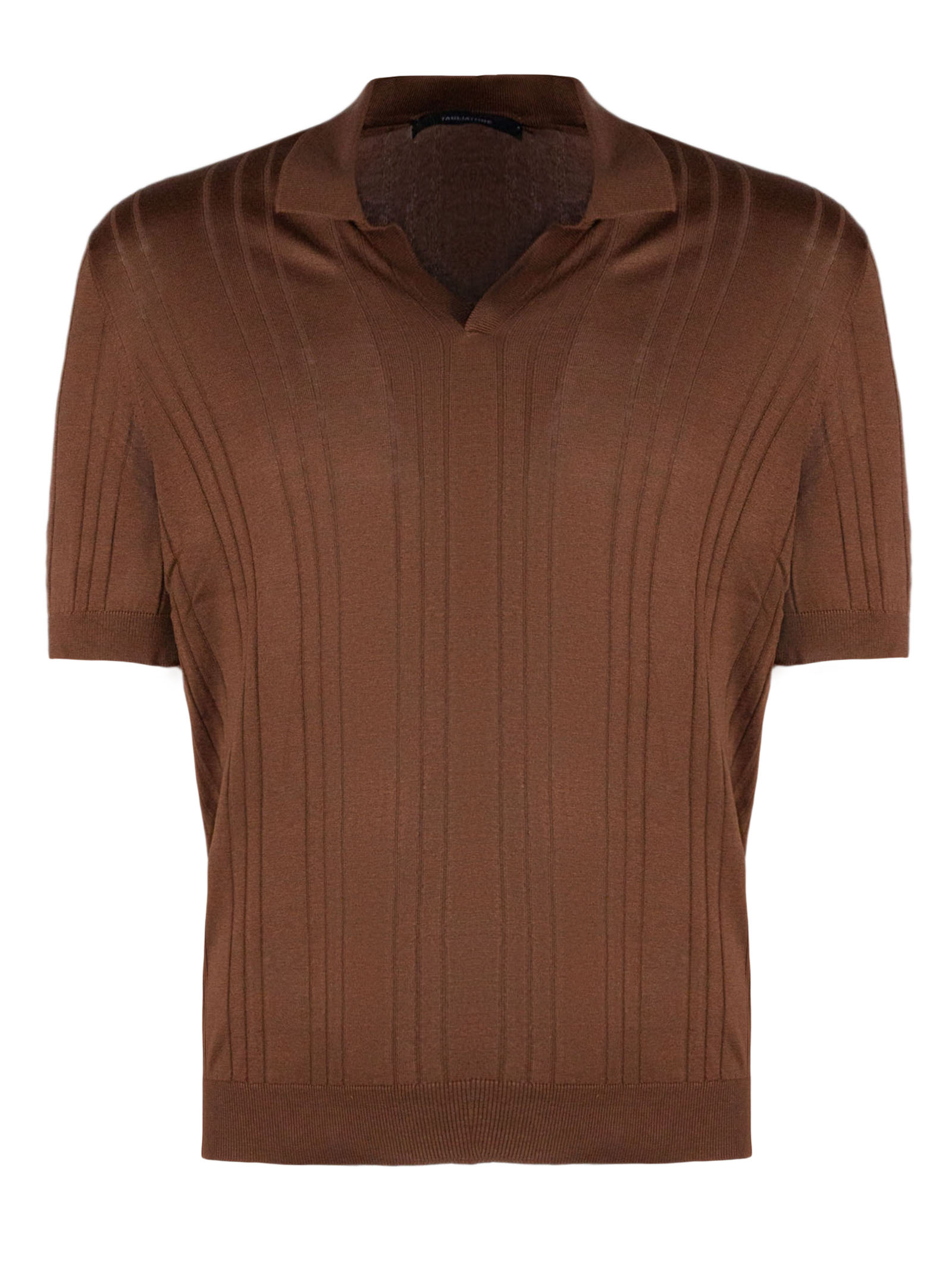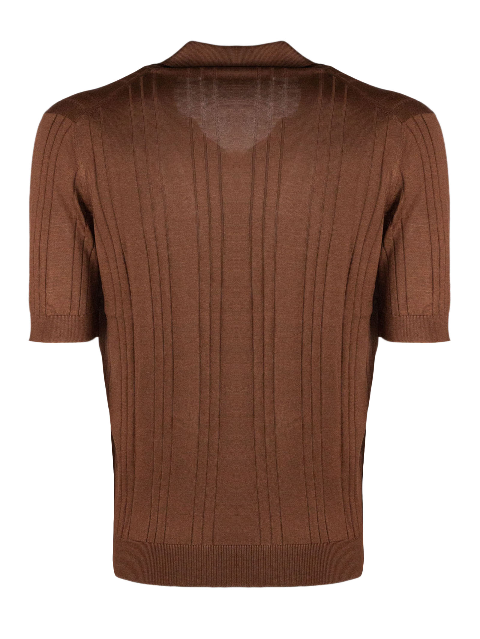 Brown silk polo shirt with classic collar without buttons, ribbed design, short sleeves with elasticated ribbing