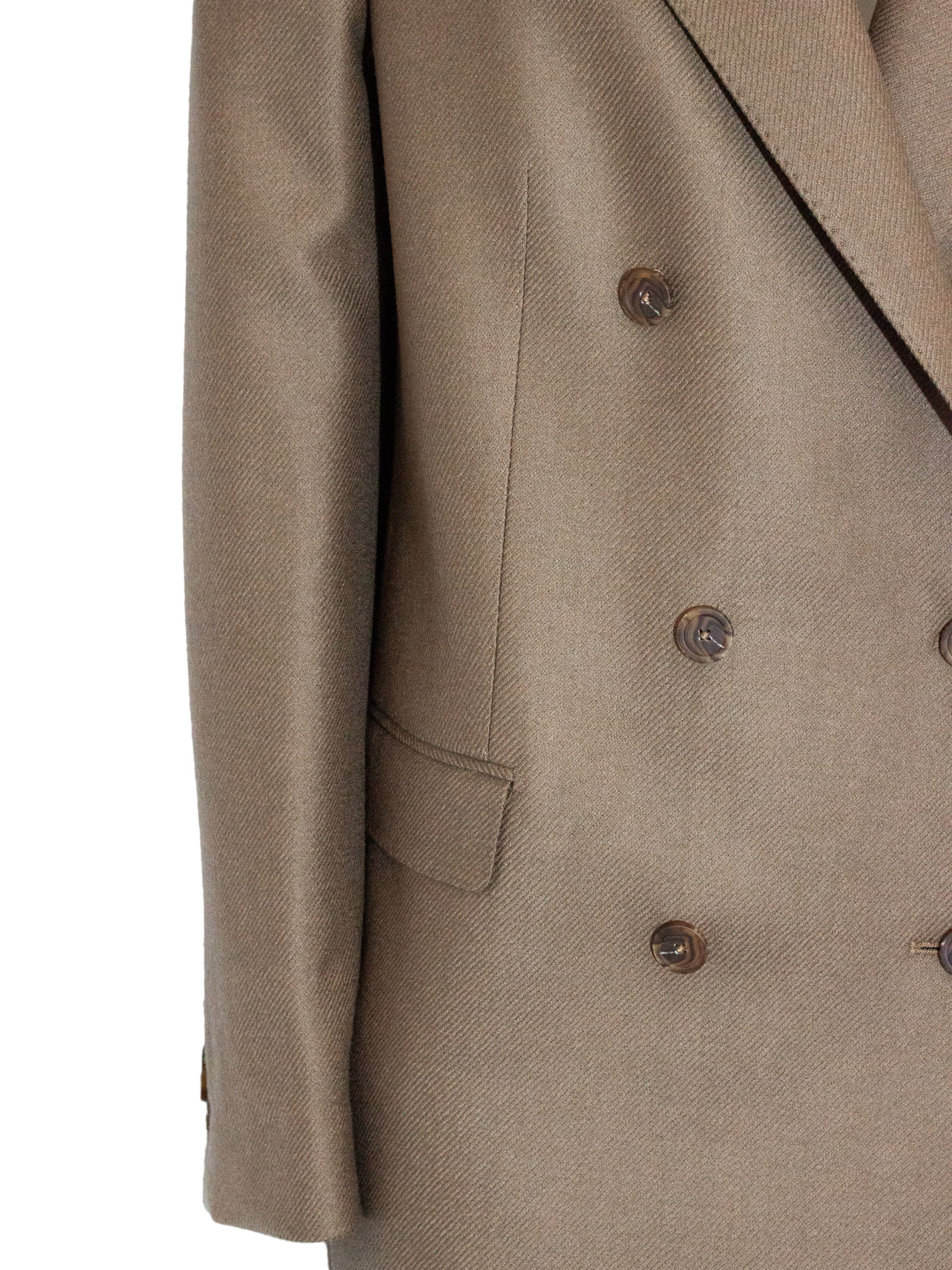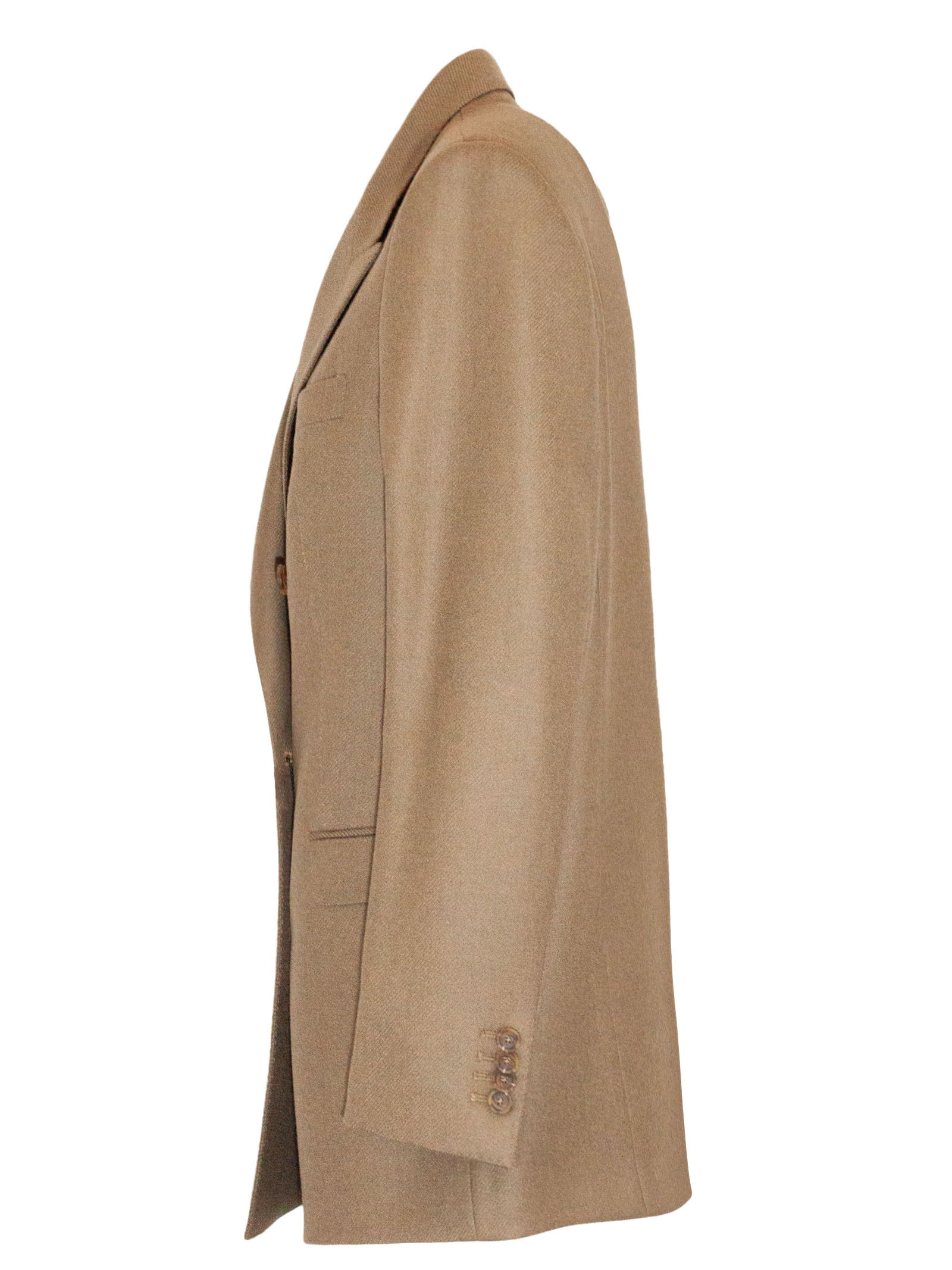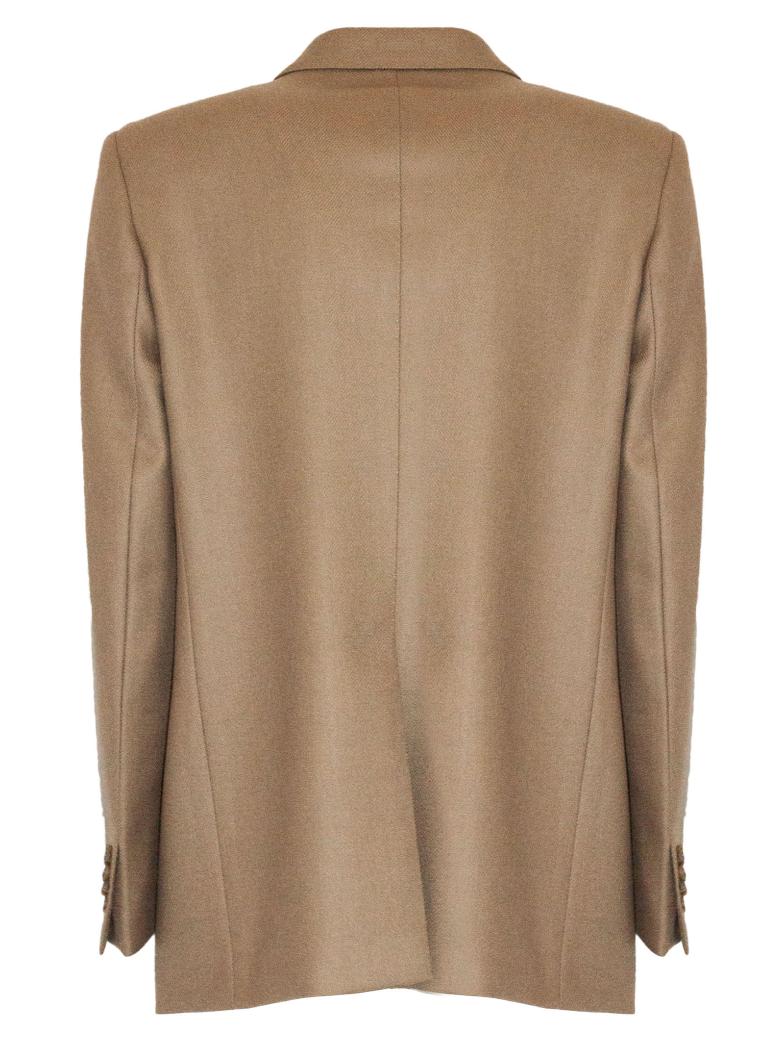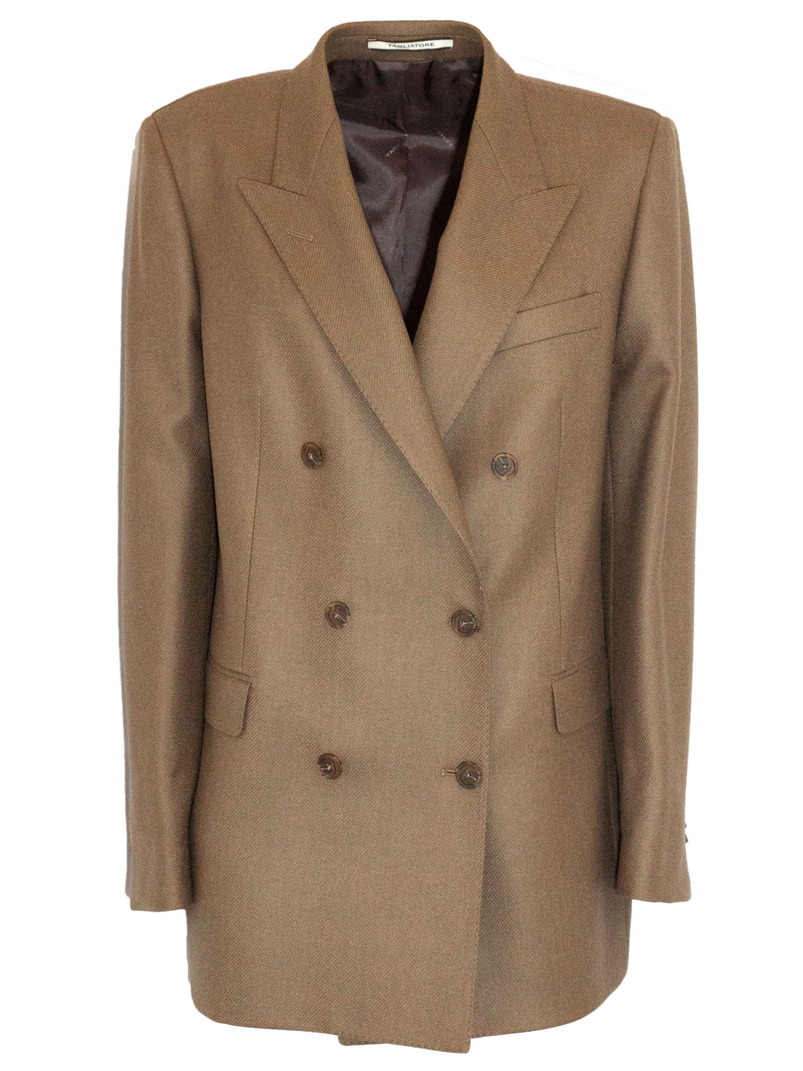 Brown virgin wool blazer with double-breasted closure, buttons, classic lapels, flap pocket, breast pocket, buttoned sleeves, vent at the back, lined