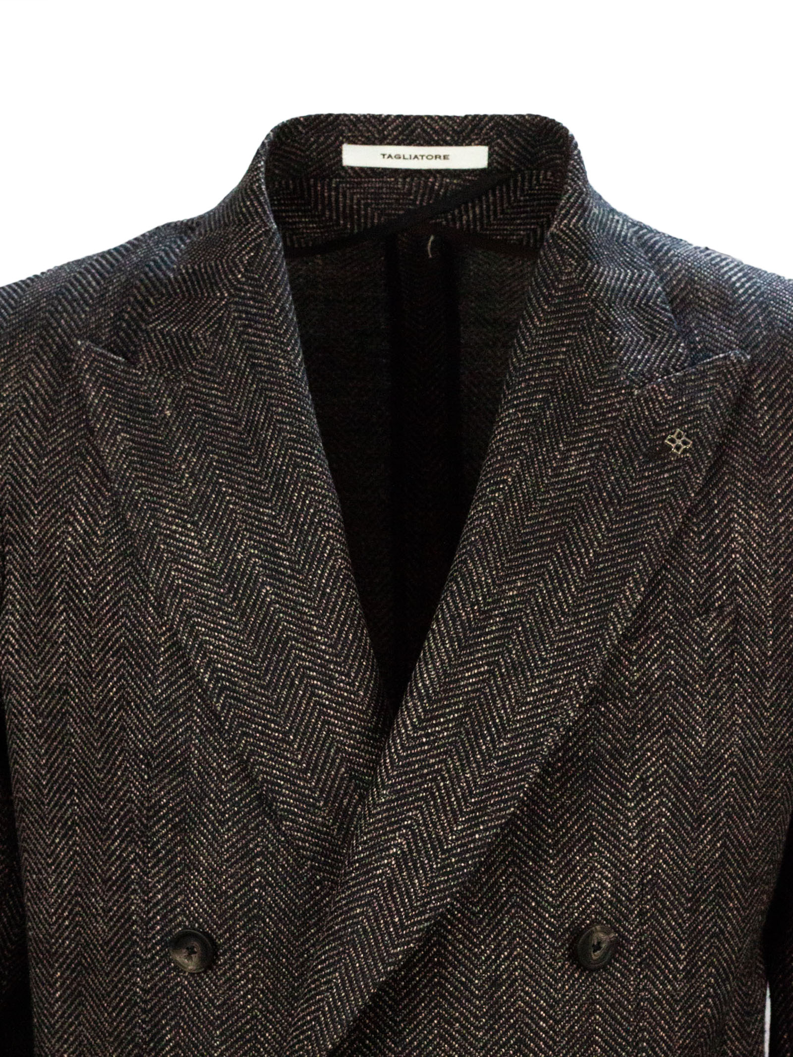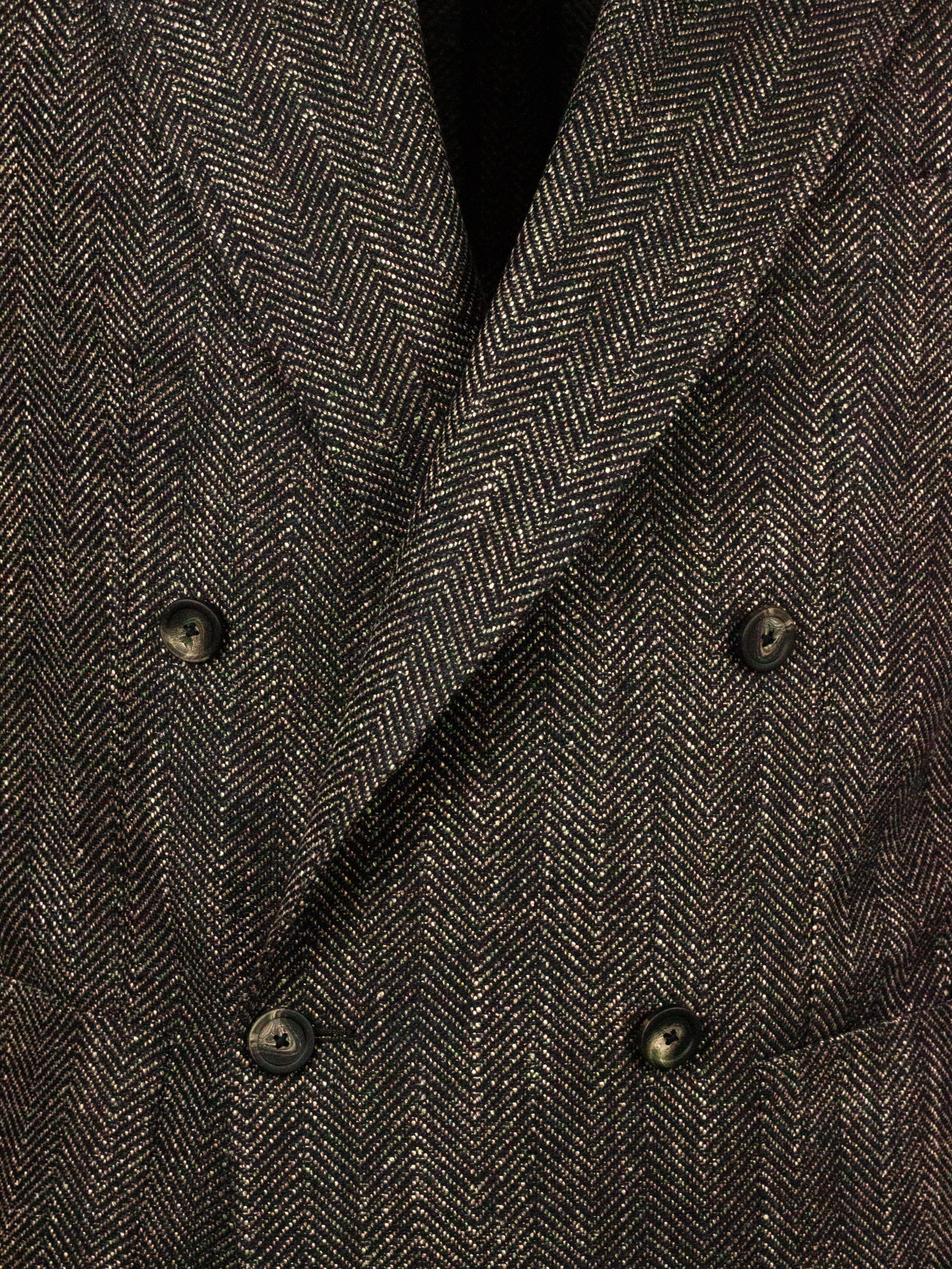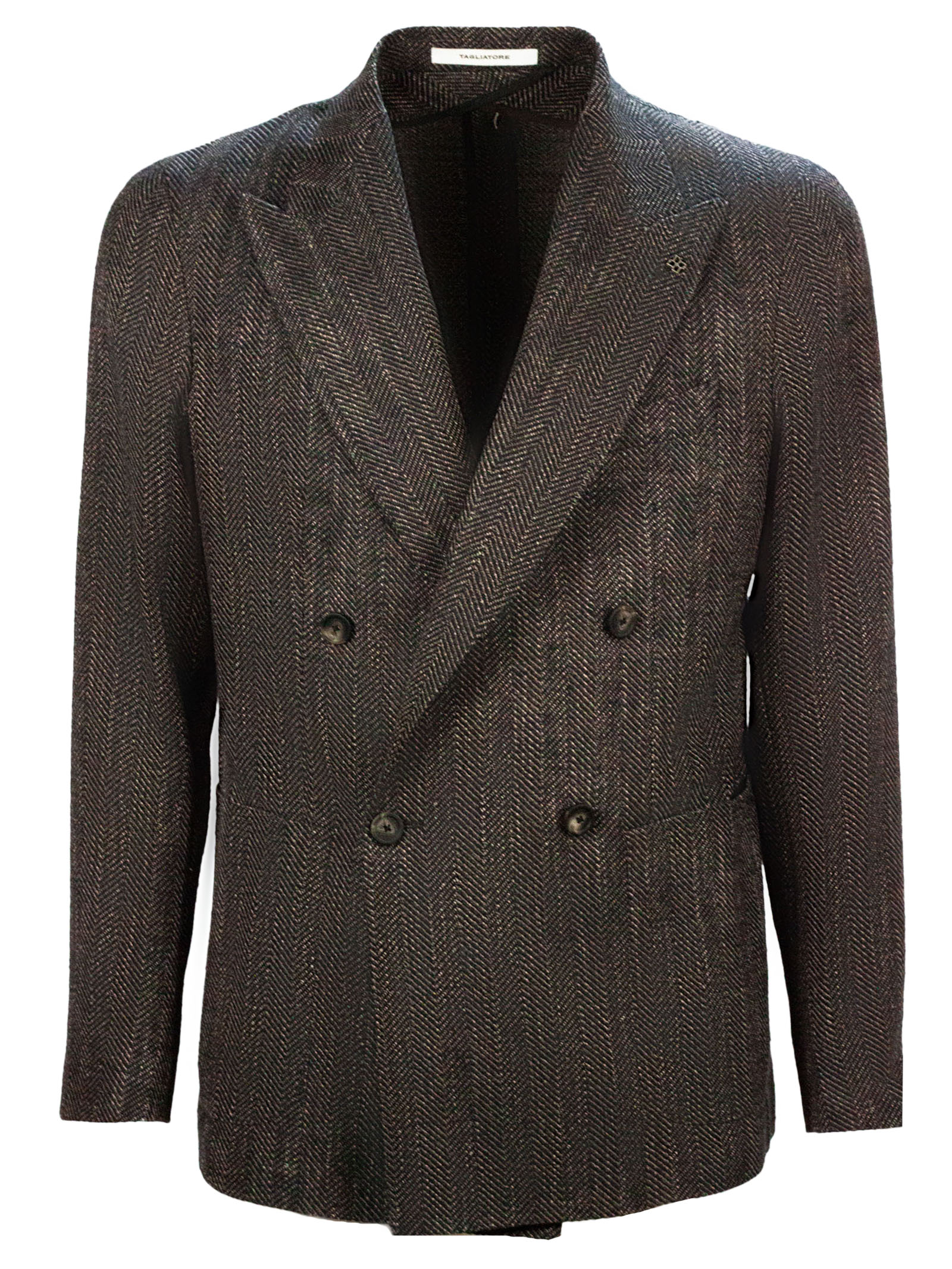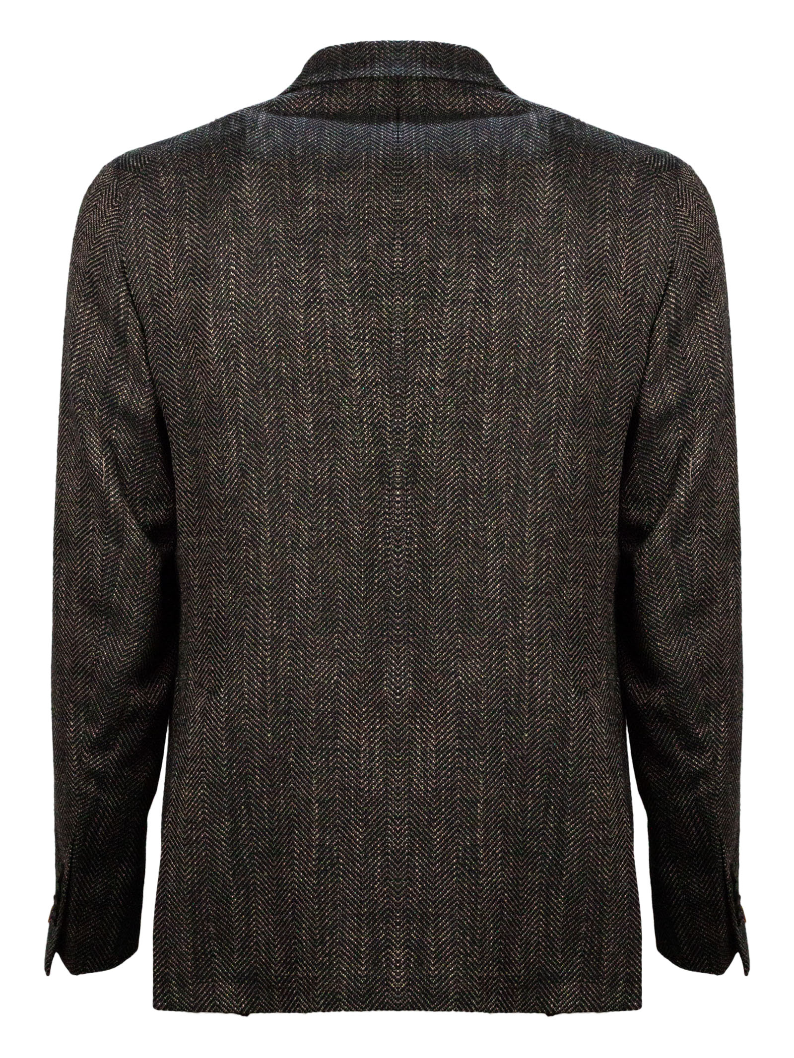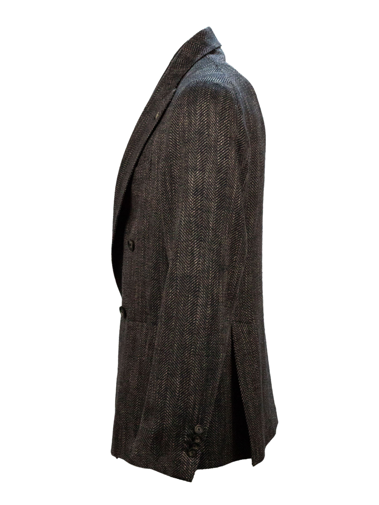 Brown virgin wool, silk and cotton blend double-breasted blazer, herringbone weave, side welt pockets, breast pocket, buttoned cuffs, classic lapels, double vent at the back, 52% Virgin wool, 22% Silk, 13% Cotton, 3%Polyamide