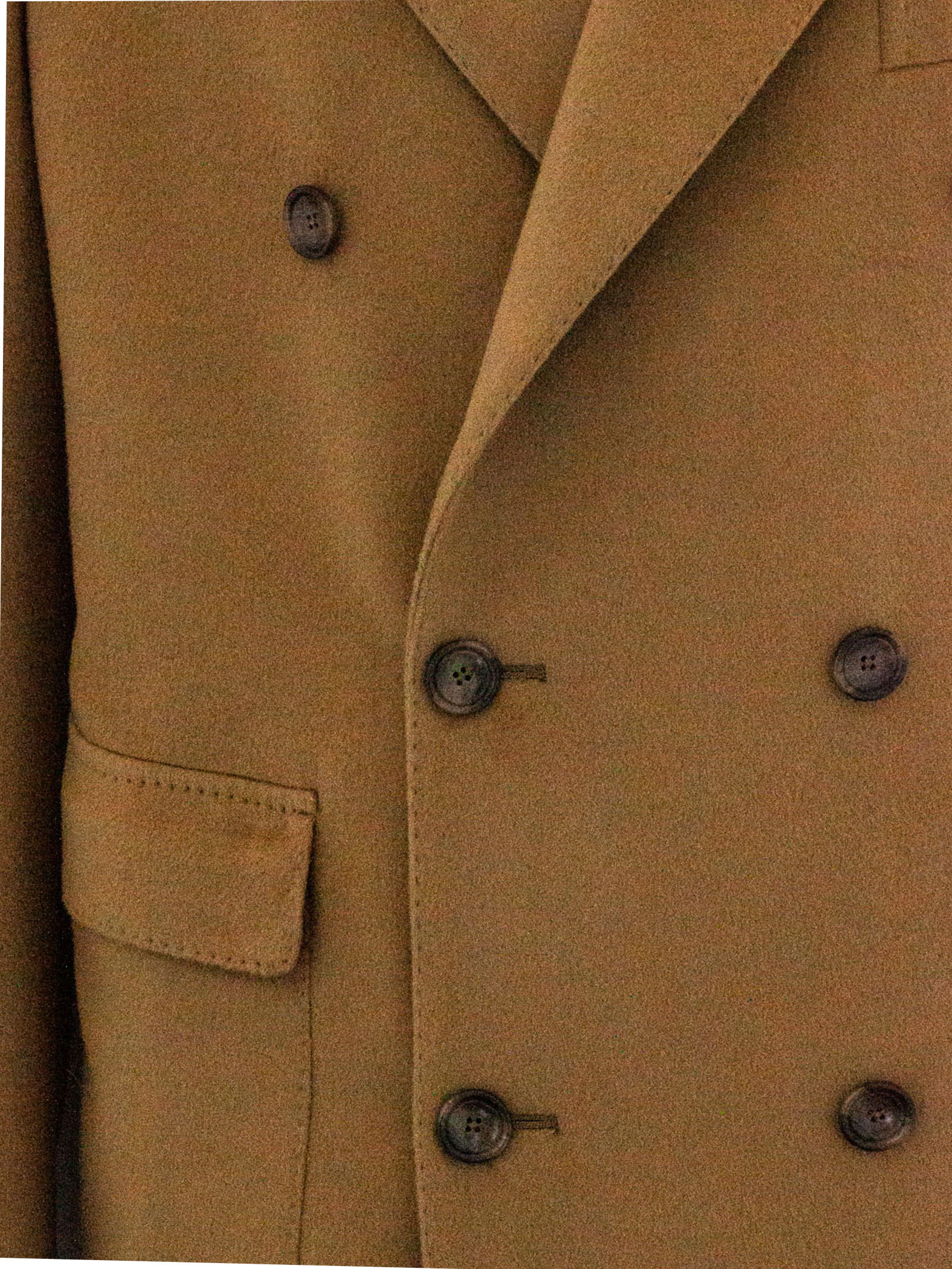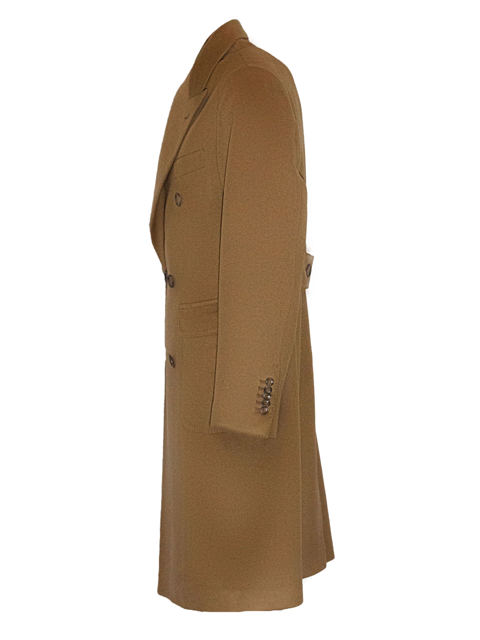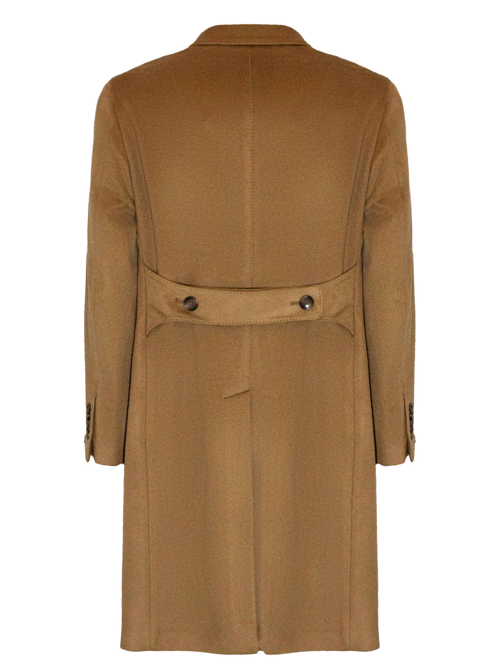 Double-breasted coat in camel-coloured virgin wool with cupro lining, front button fastening, side pockets with flaps, breast pocket, peak lapel, back vent, back martingale