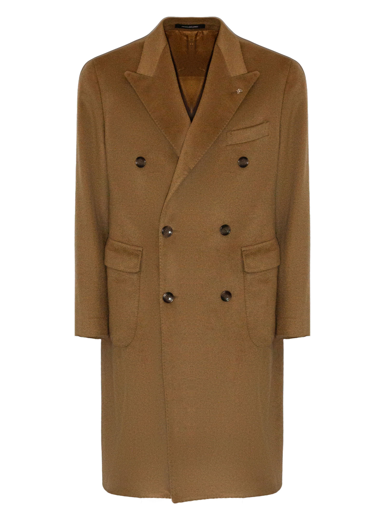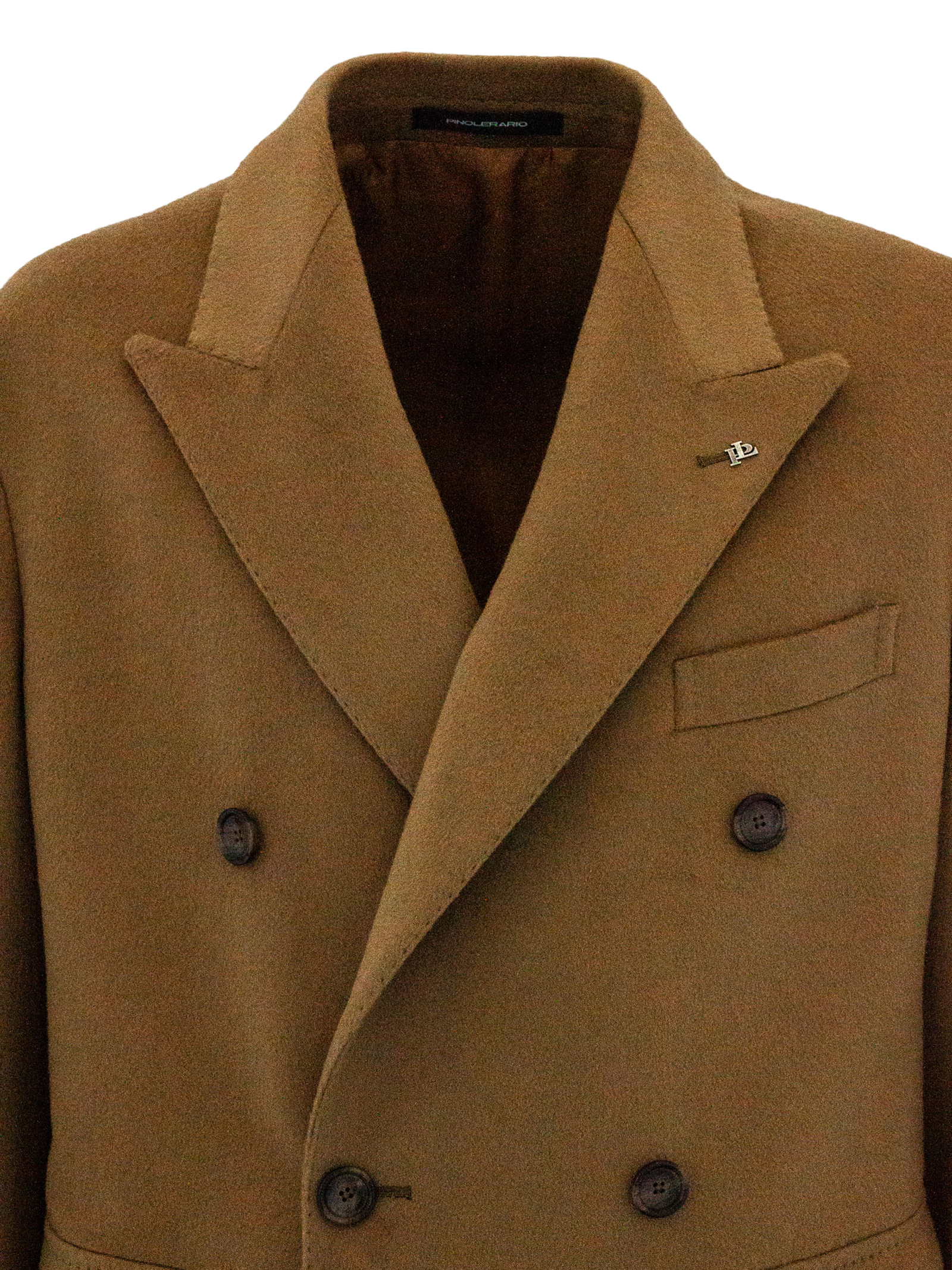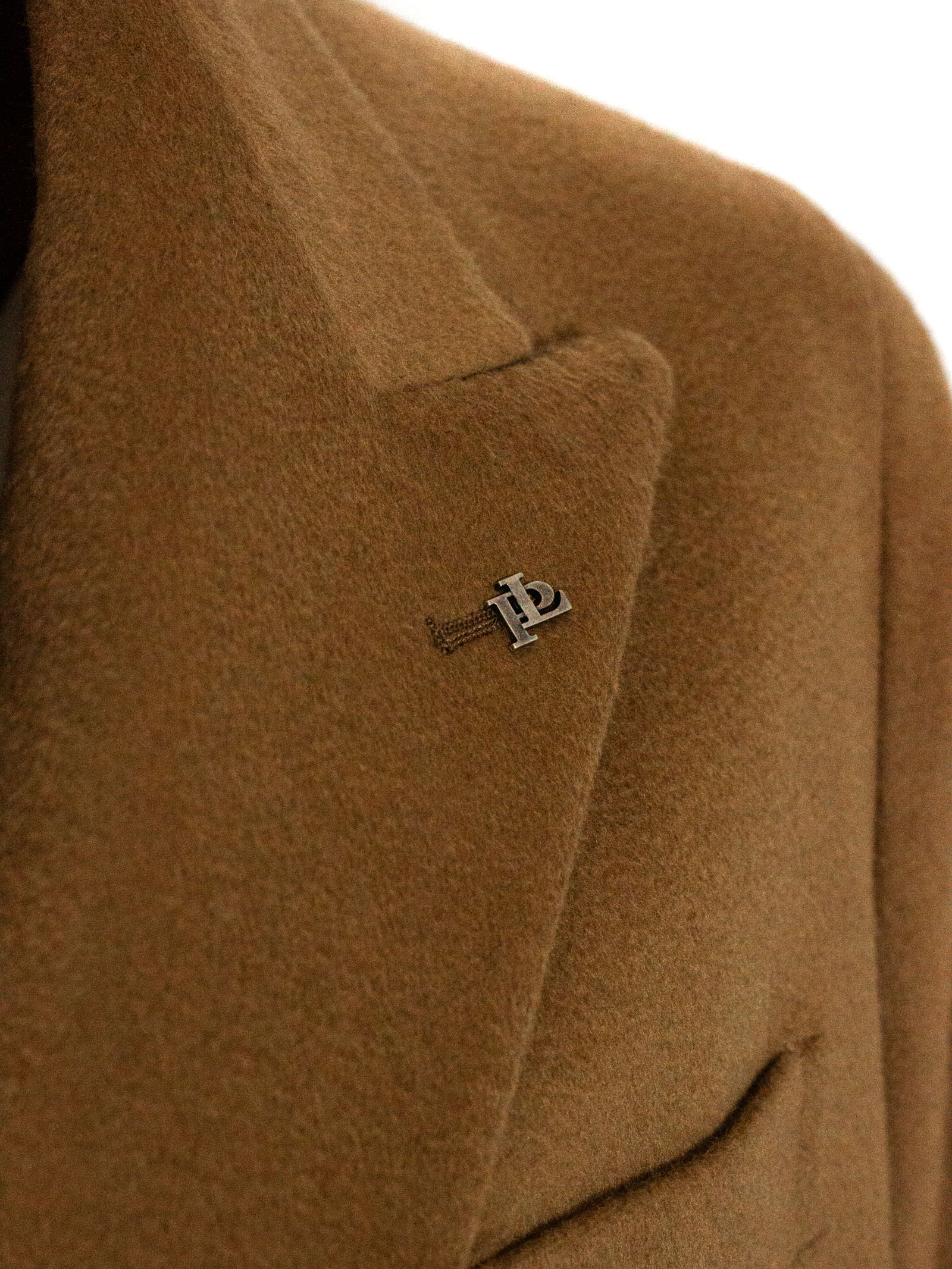 Double-breasted coat in camel-coloured virgin wool with cupro lining, front button fastening, side pockets with flaps, breast pocket, peak lapel, back vent, back martingale