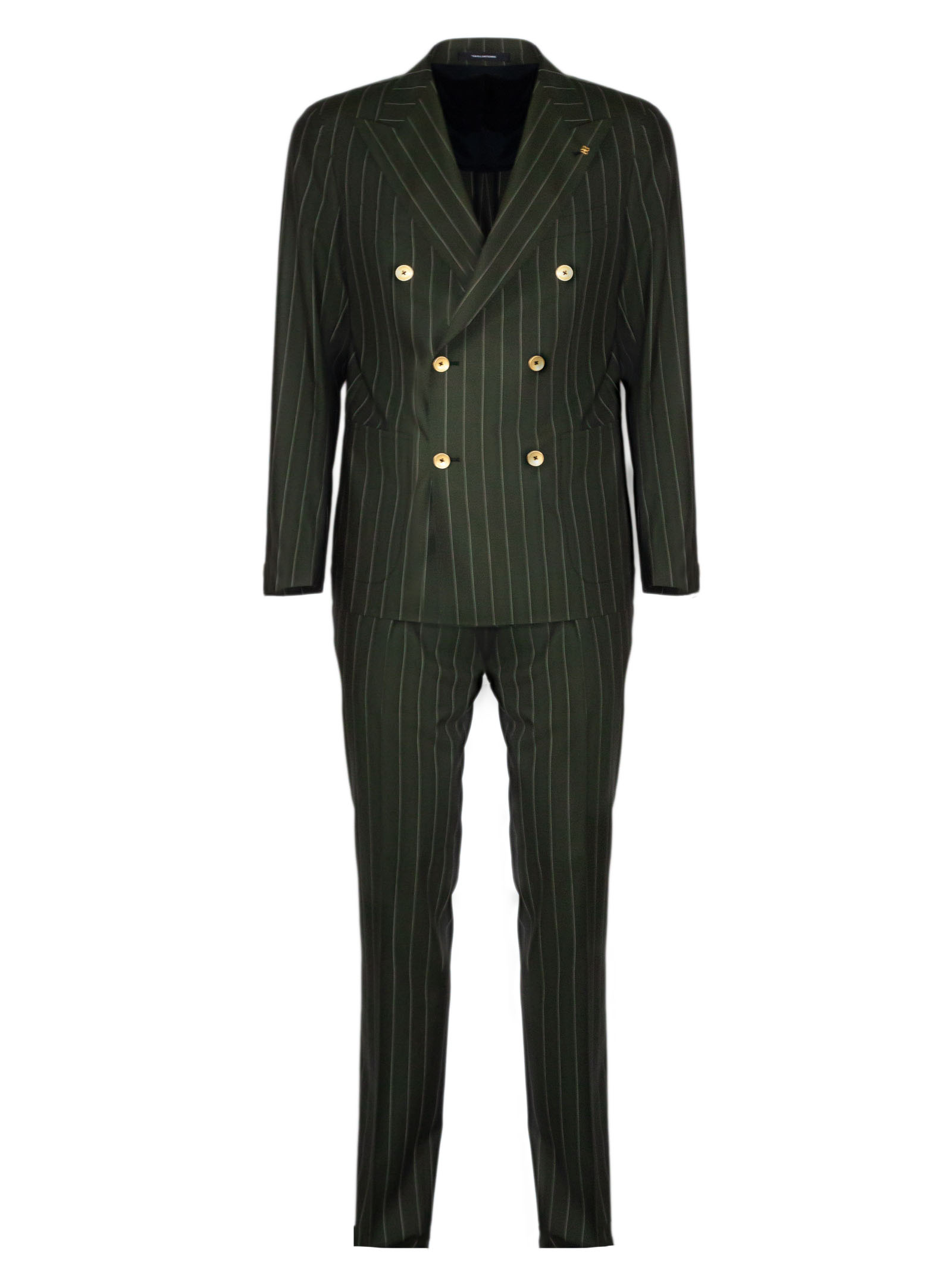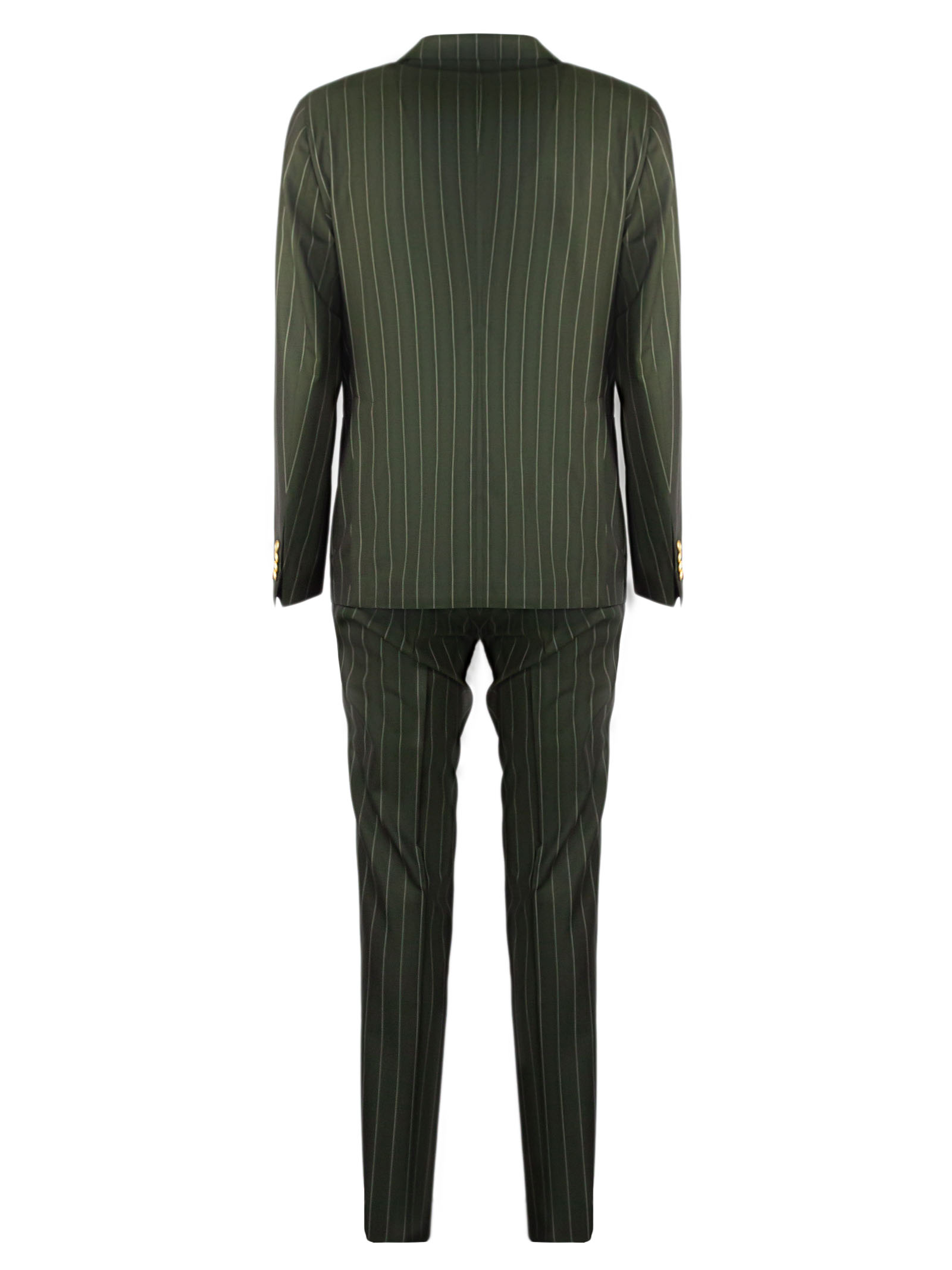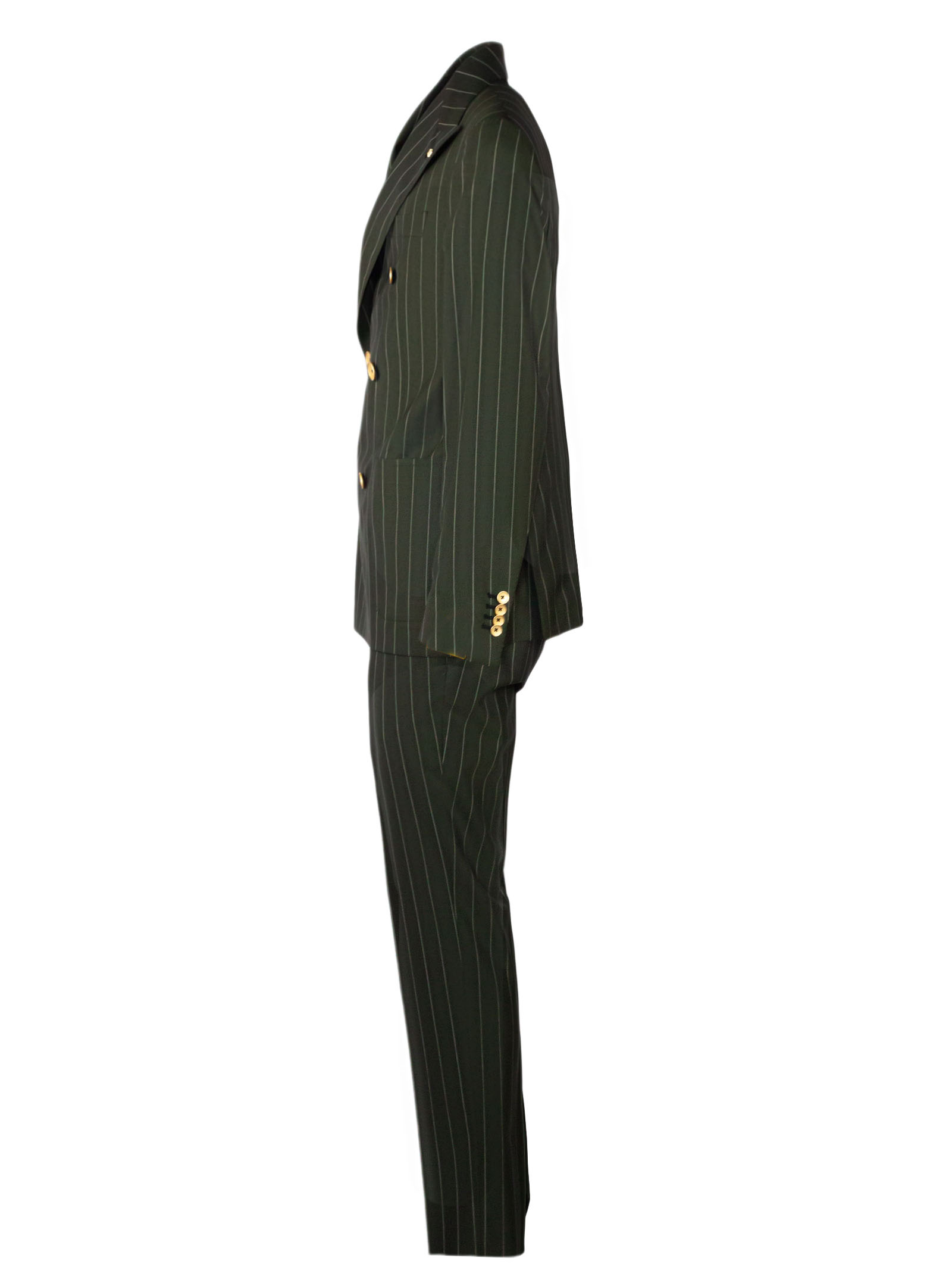 Double-breasted suit in 100% Super 130's wool, pinstriped on a green background, double-breasted jacket with classic lapels and contrasting buttons, side welt pockets, breast pocket, trouser closure with hook and button