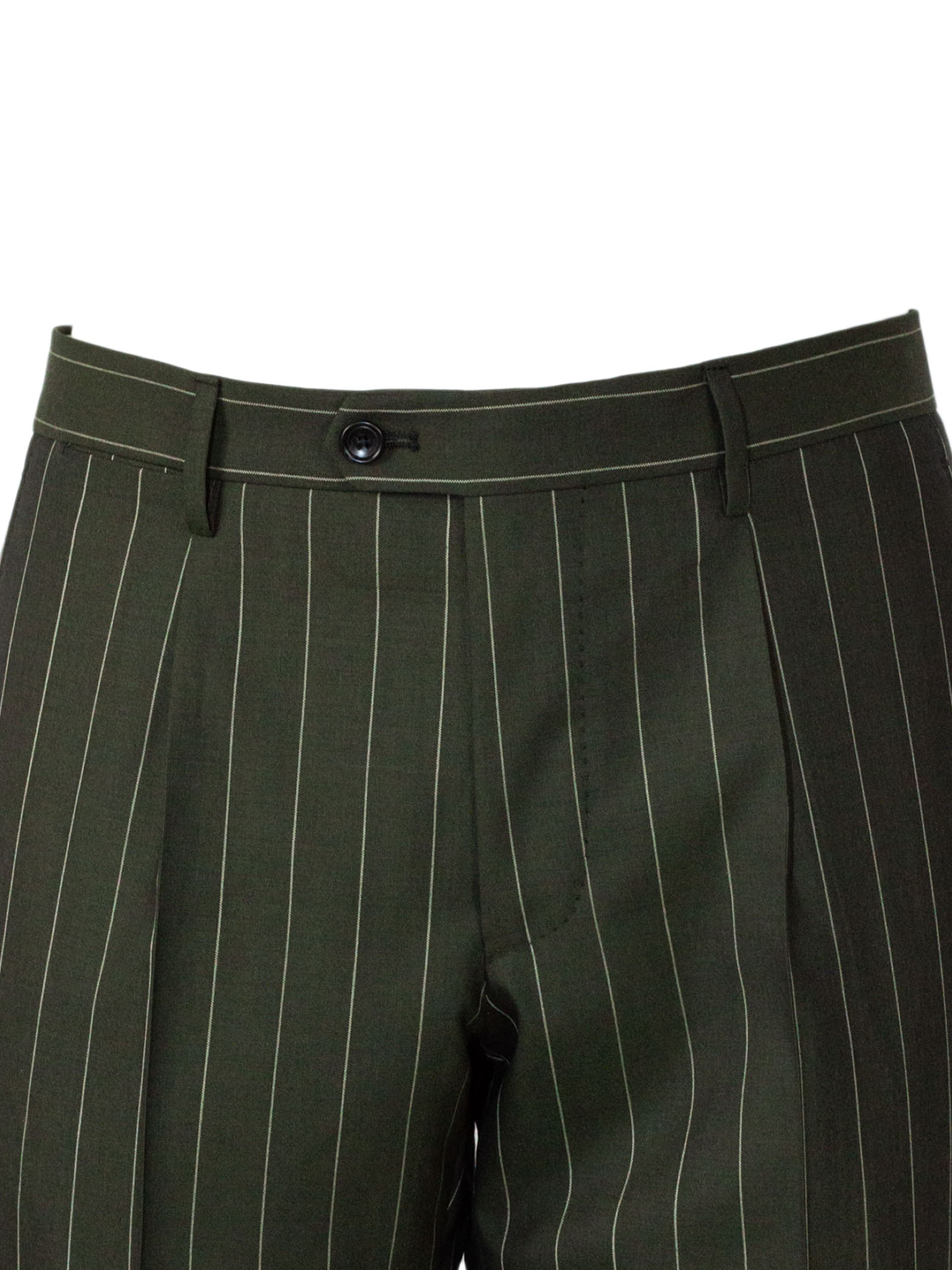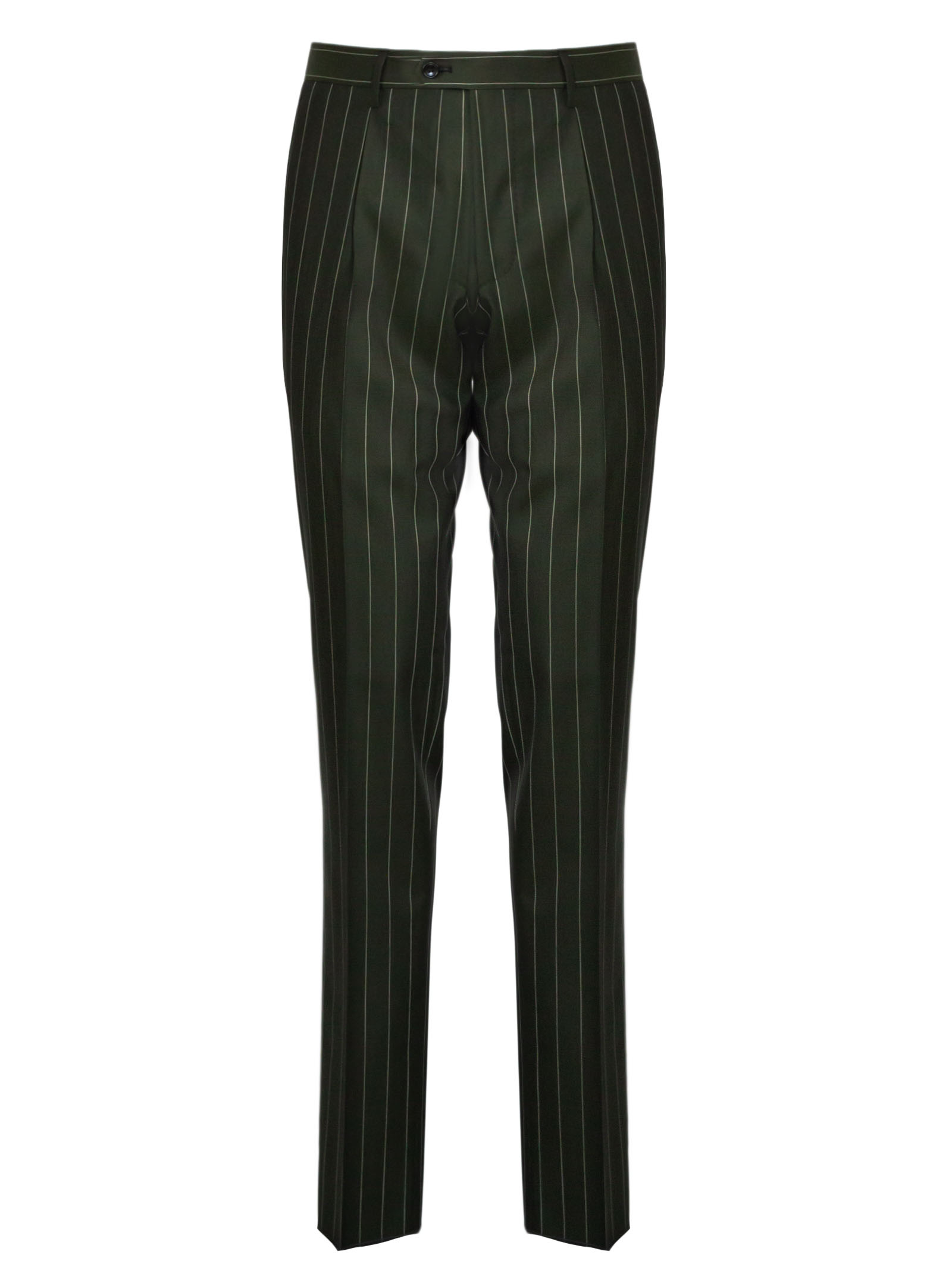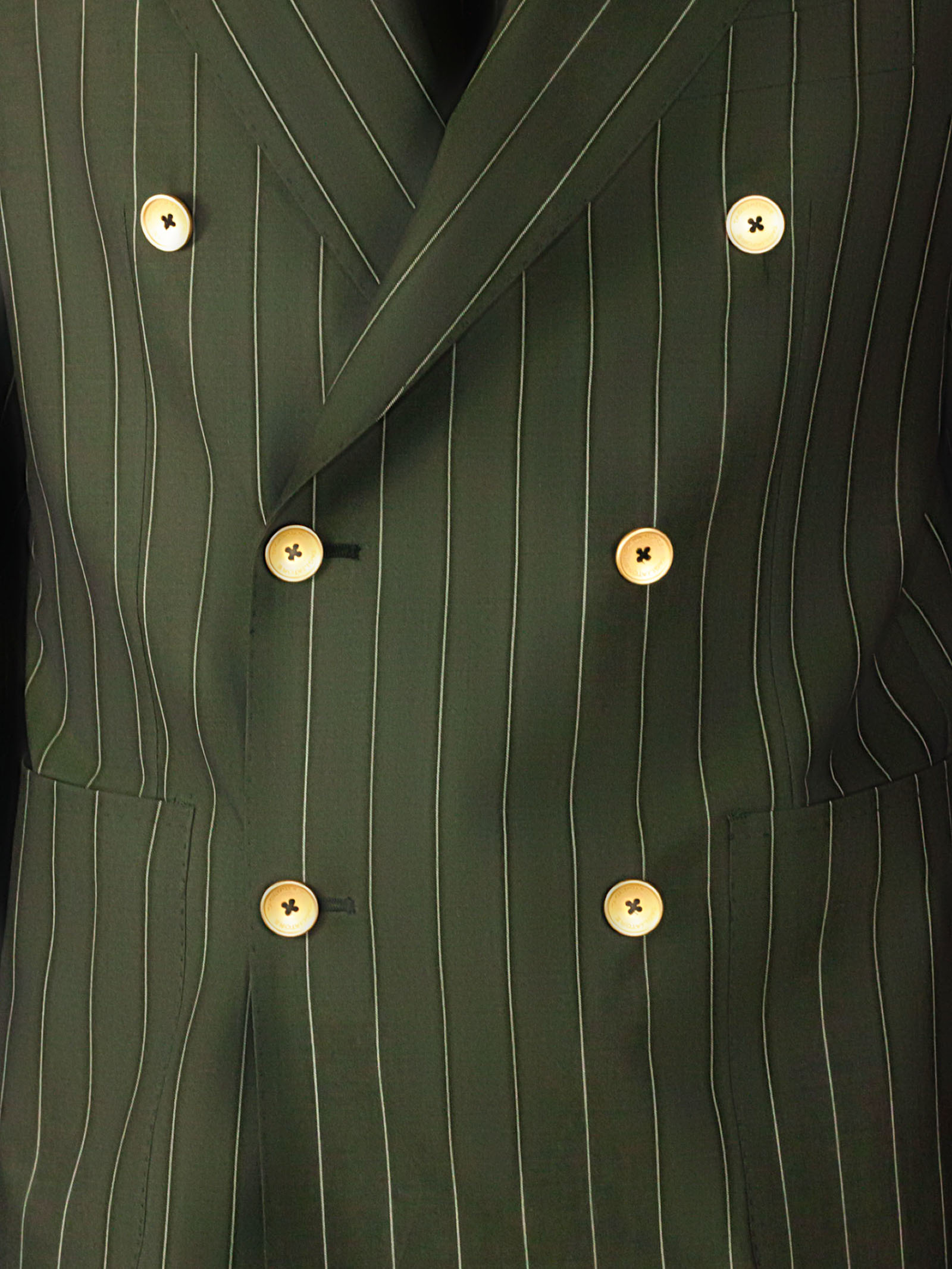 Double-breasted suit in 100% Super 130's wool, pinstriped on a green background, double-breasted jacket with classic lapels and contrasting buttons, side welt pockets, breast pocket, trouser closure with hook and button