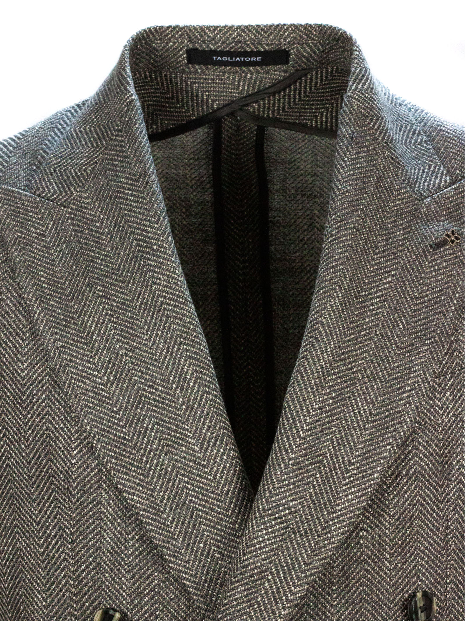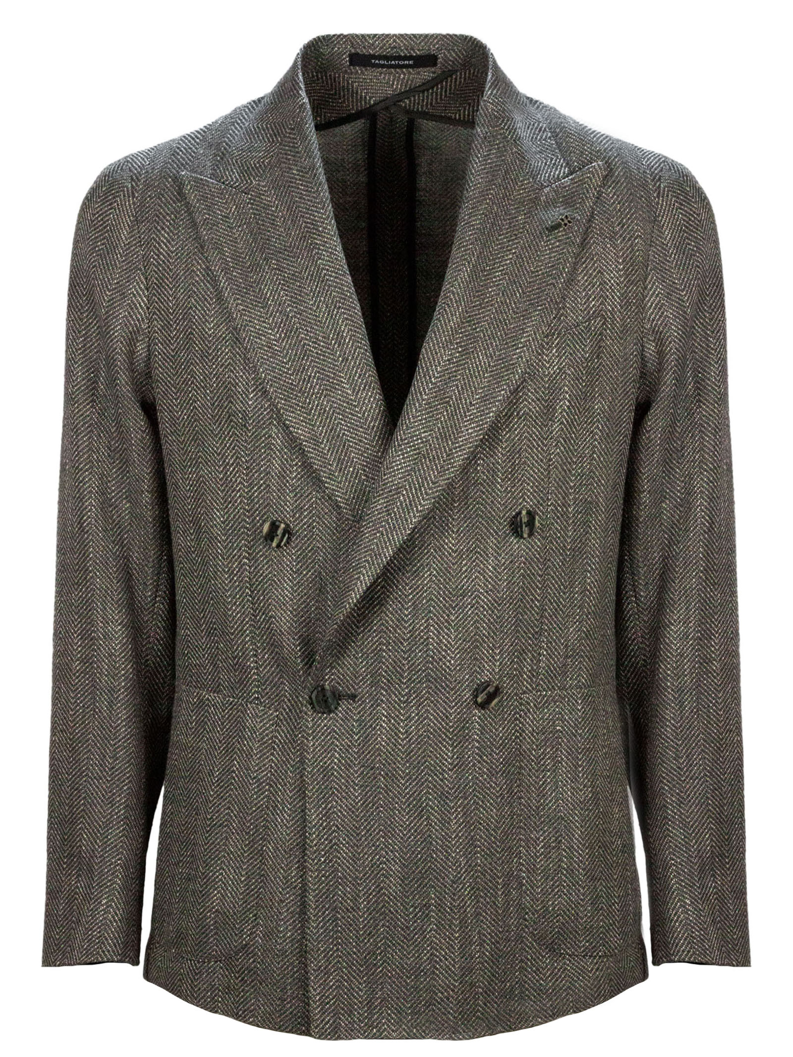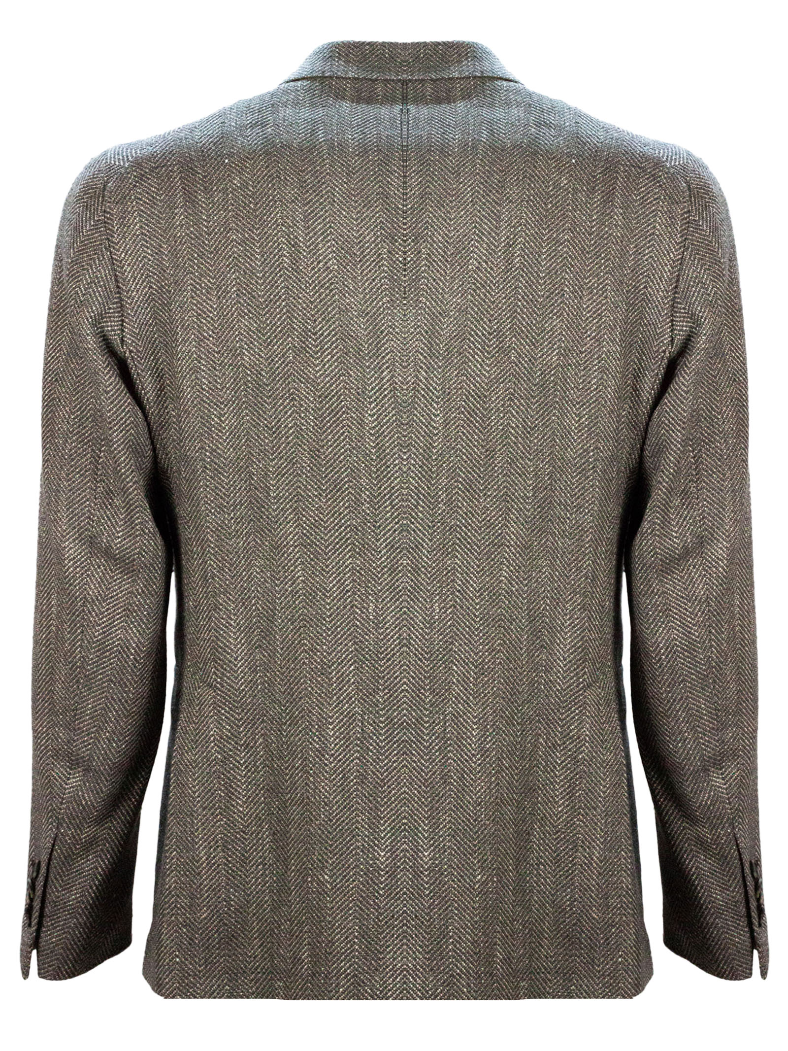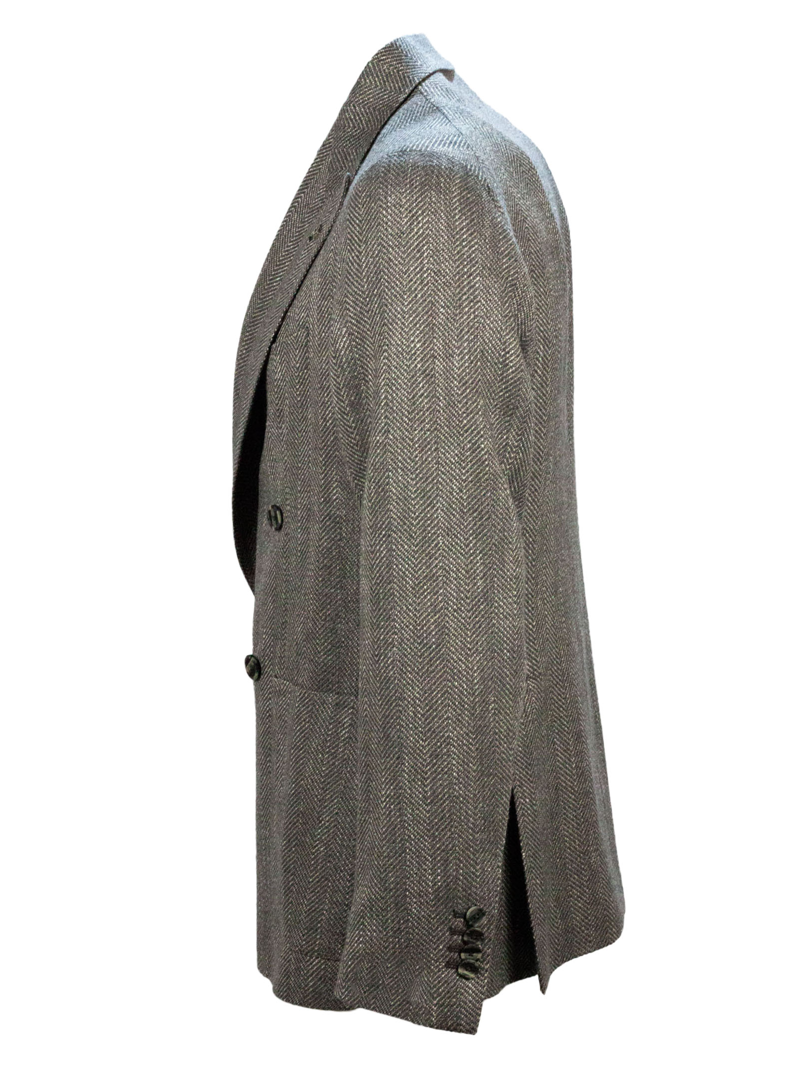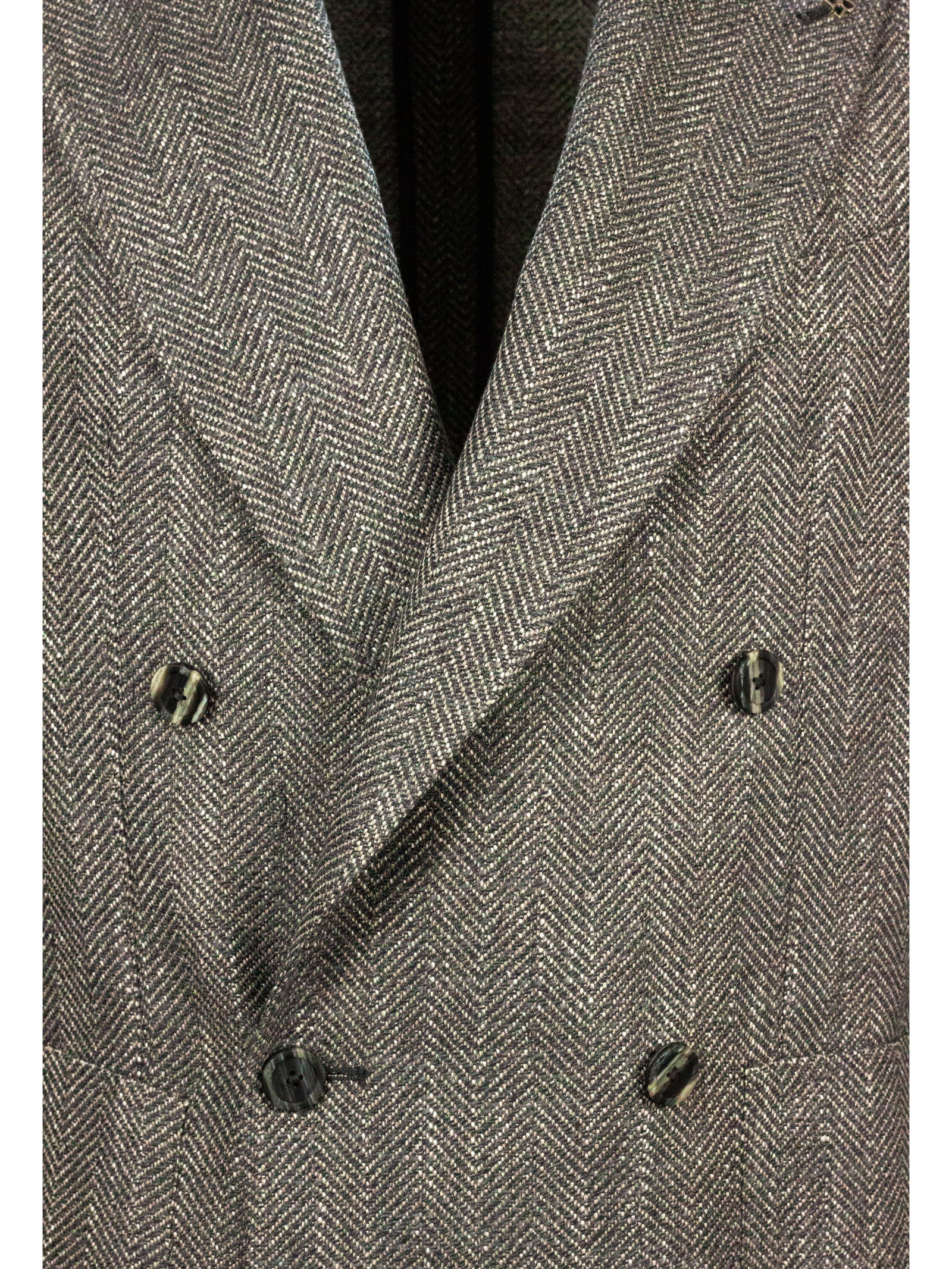 Grey virgin wool, silk and cotton blend double-breasted blazer, herringbone weave, side welt pockets, breast pocket, buttoned cuffs, classic lapels, double vent at the back, 52% Virgin wool, 22% Silk, 13% Cotton, 3%Polyamide