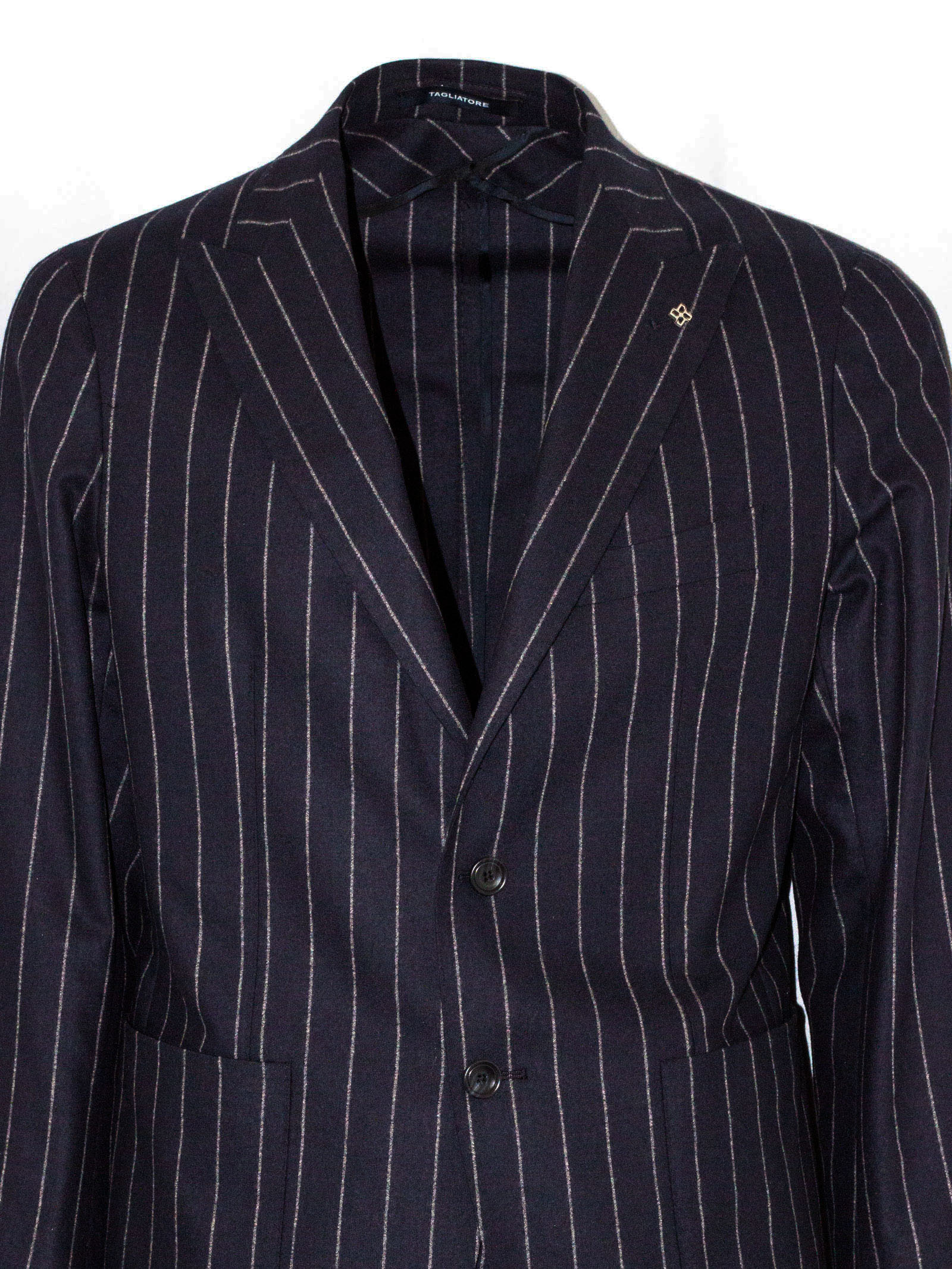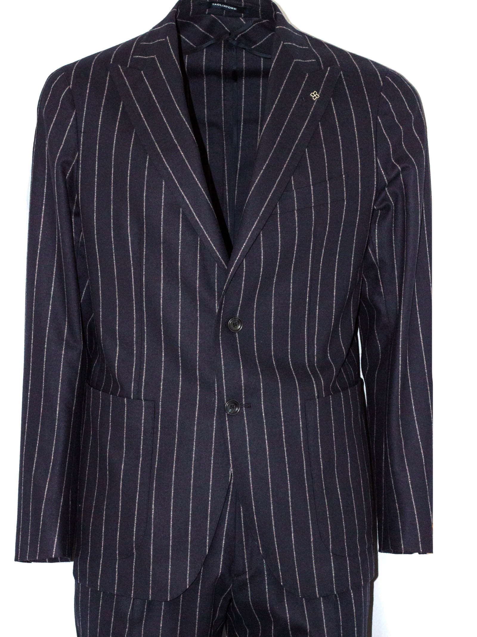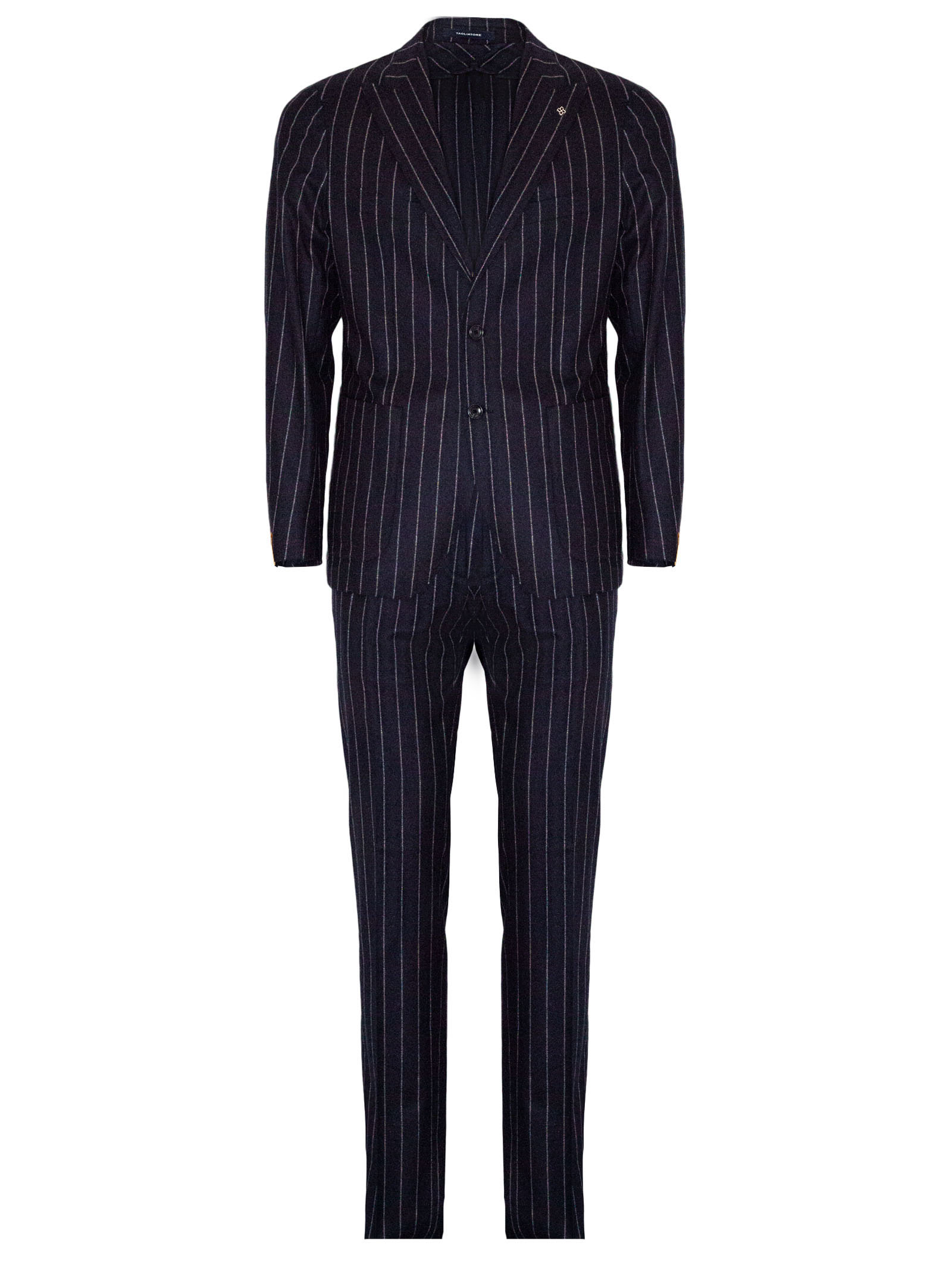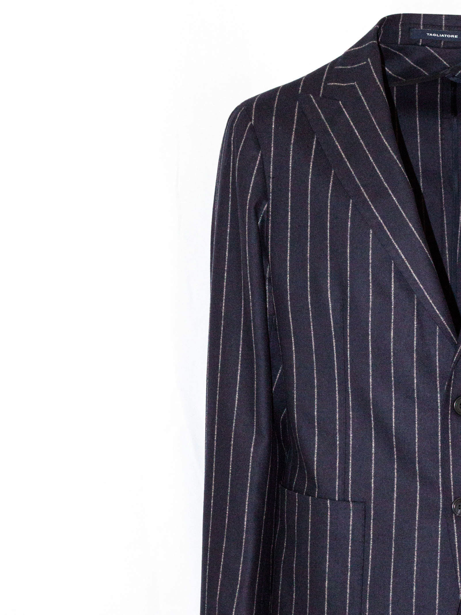 Virgin wool and cashmere pinstripe suit, jacket features two-button closure, classic lapels and flap pockets, welt pockets, breast pocket, trousers have a straight and clean line, zip closure and hidden button, 90%Virgin wool, 5%Cashmere 3%Polyamide 2%Elastane