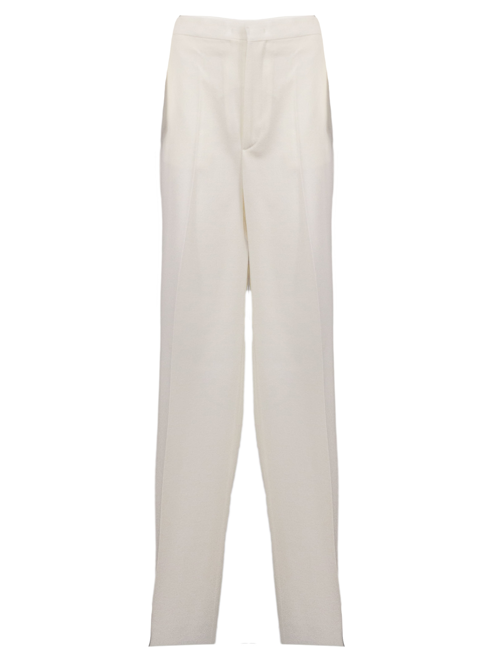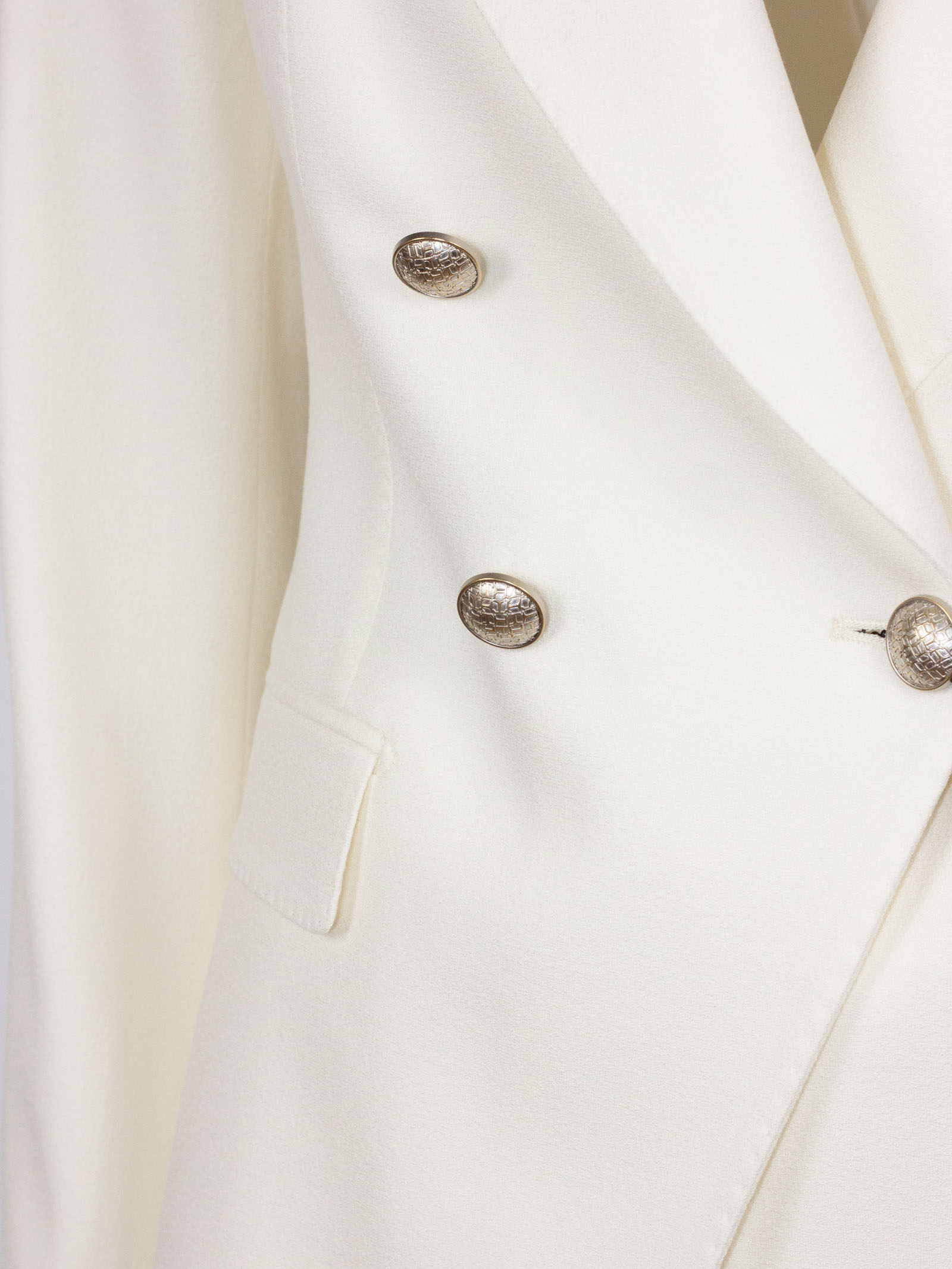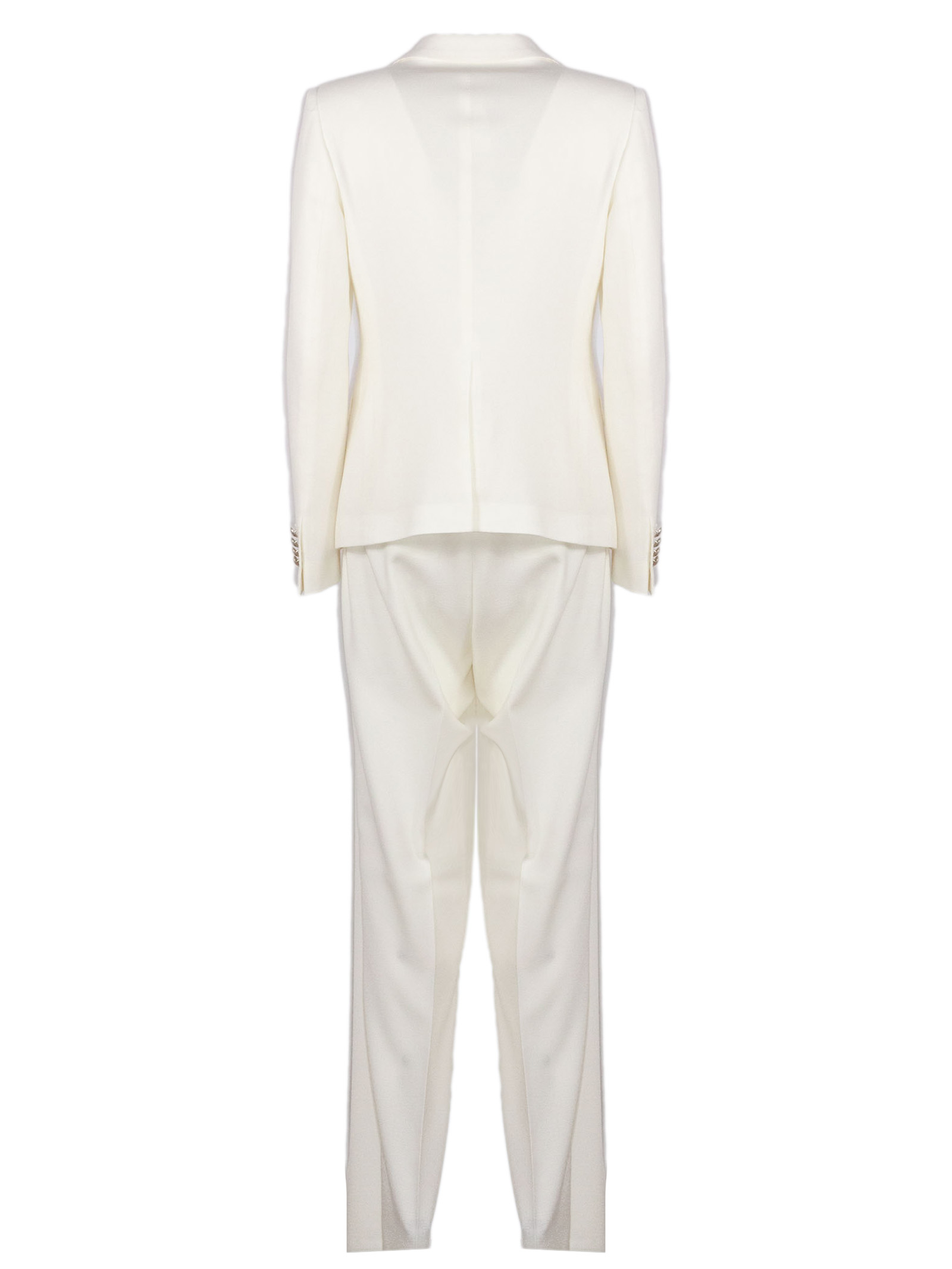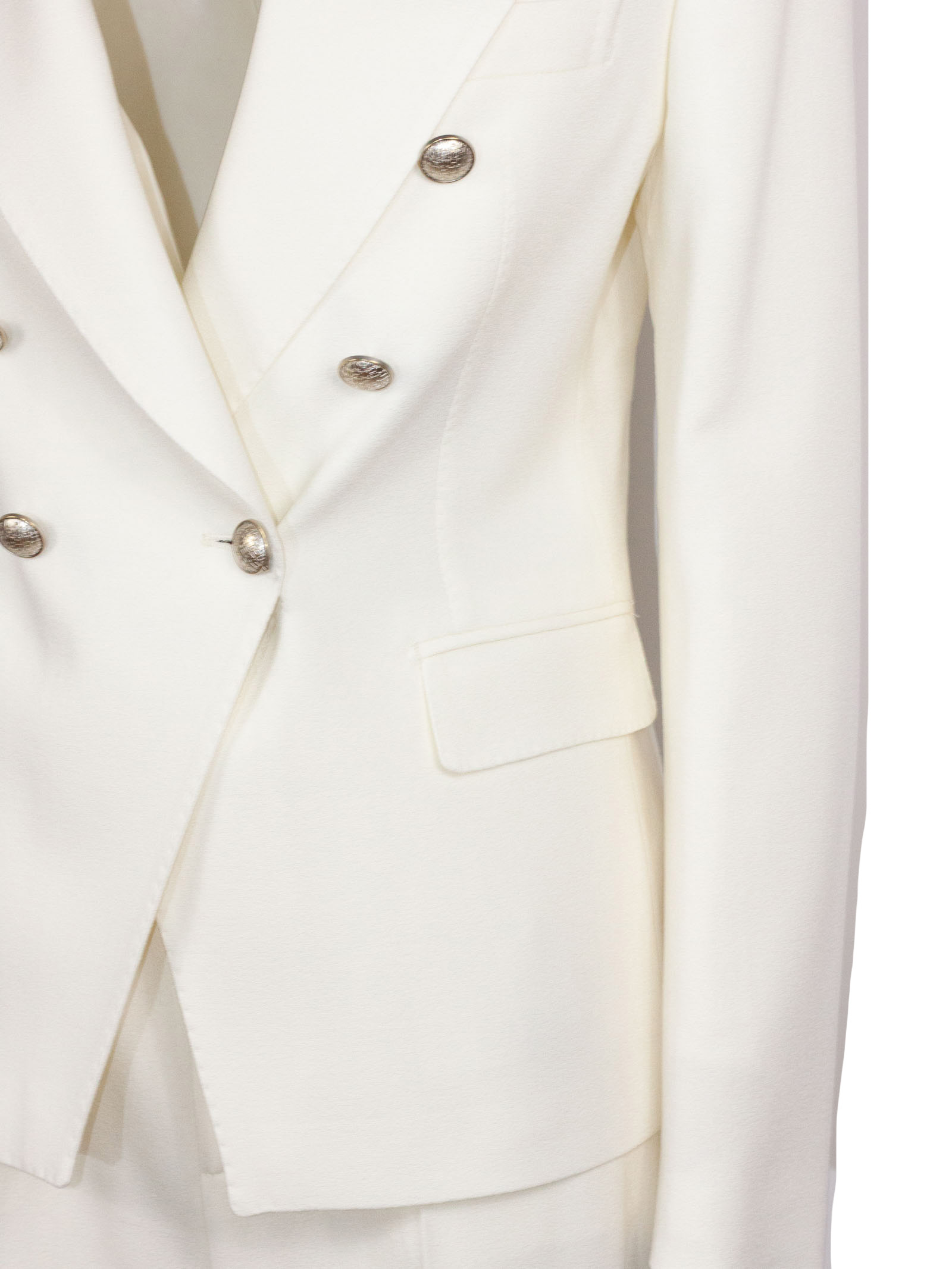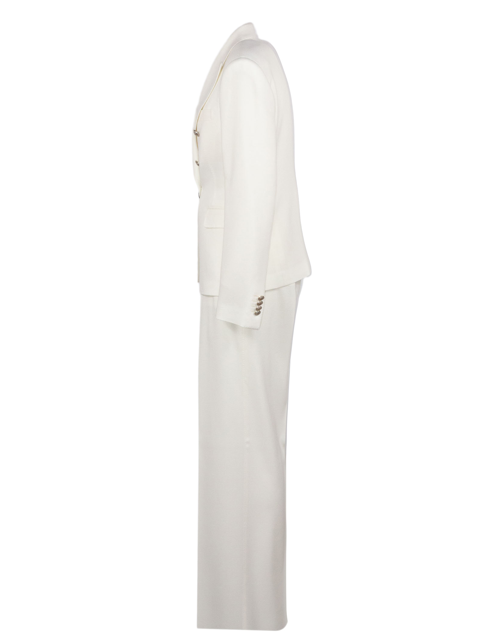 White virgin wool suit with a double-breasted fastening, classic lapels, side pockets with flaps, a breast pocket, a cupro lining, high-waisted trousers with a concealed fastening, and a wide leg