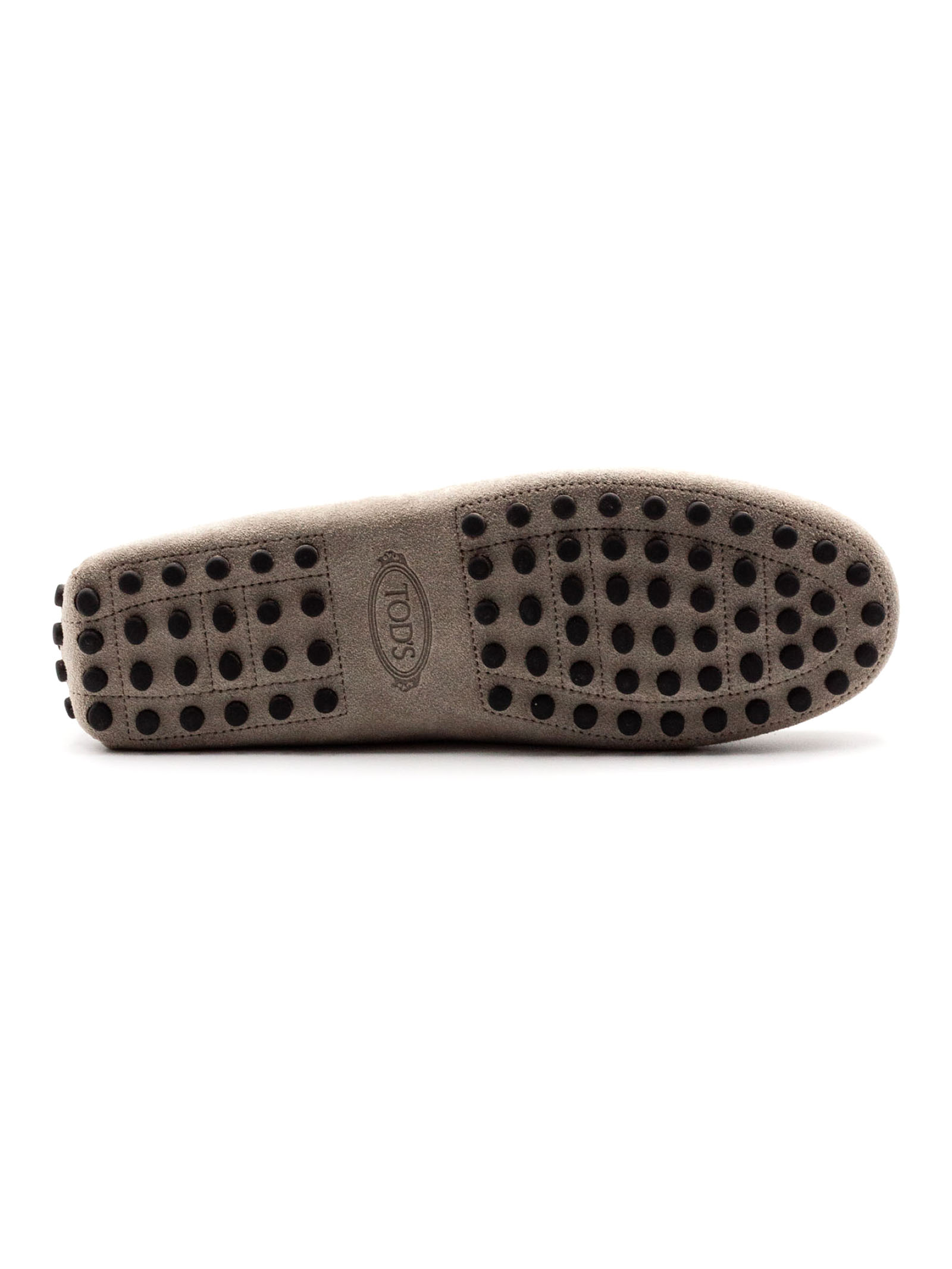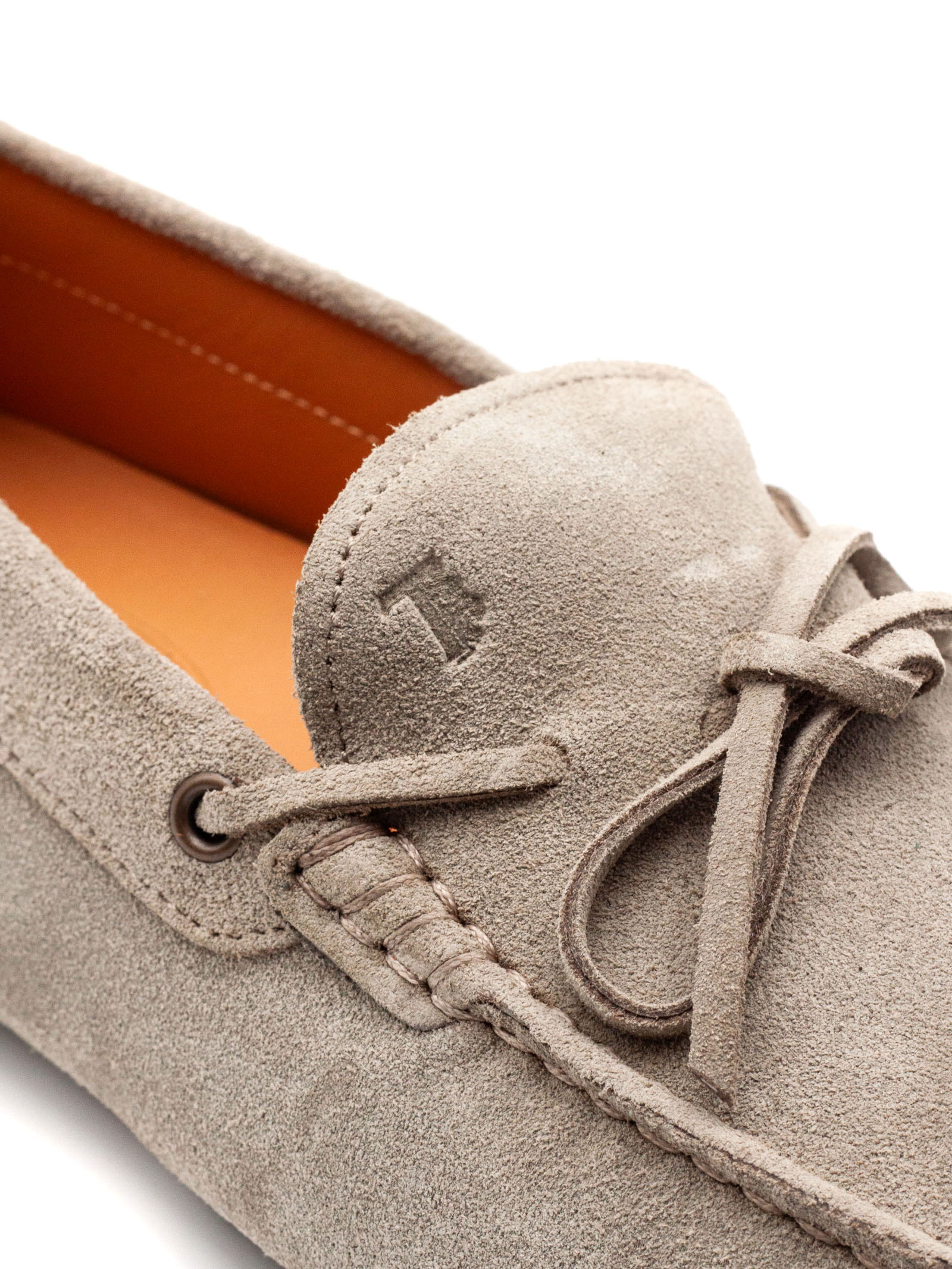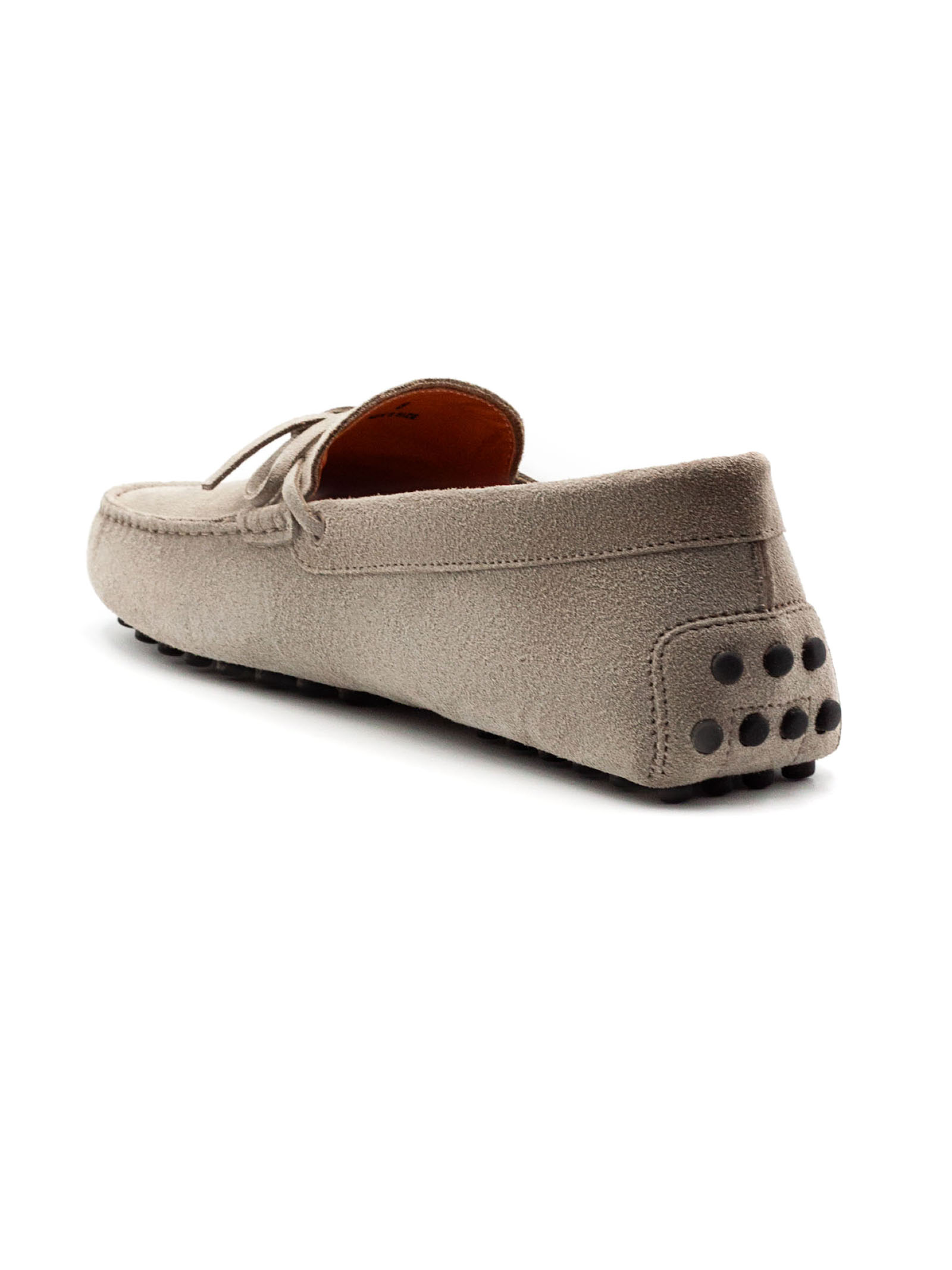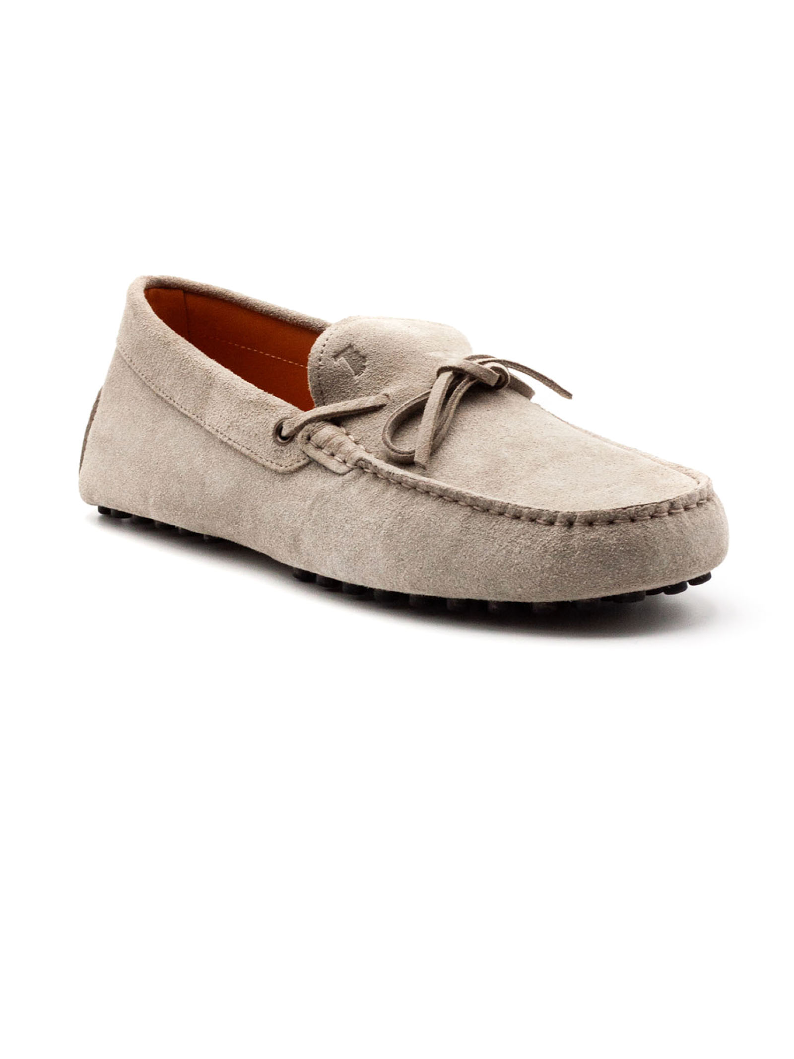 Beige suede loafers with rubber sole, lace-up fastening, embossed Tod's monogram, visible hand-stitching, leather lining and insole, iconic Tod's sole