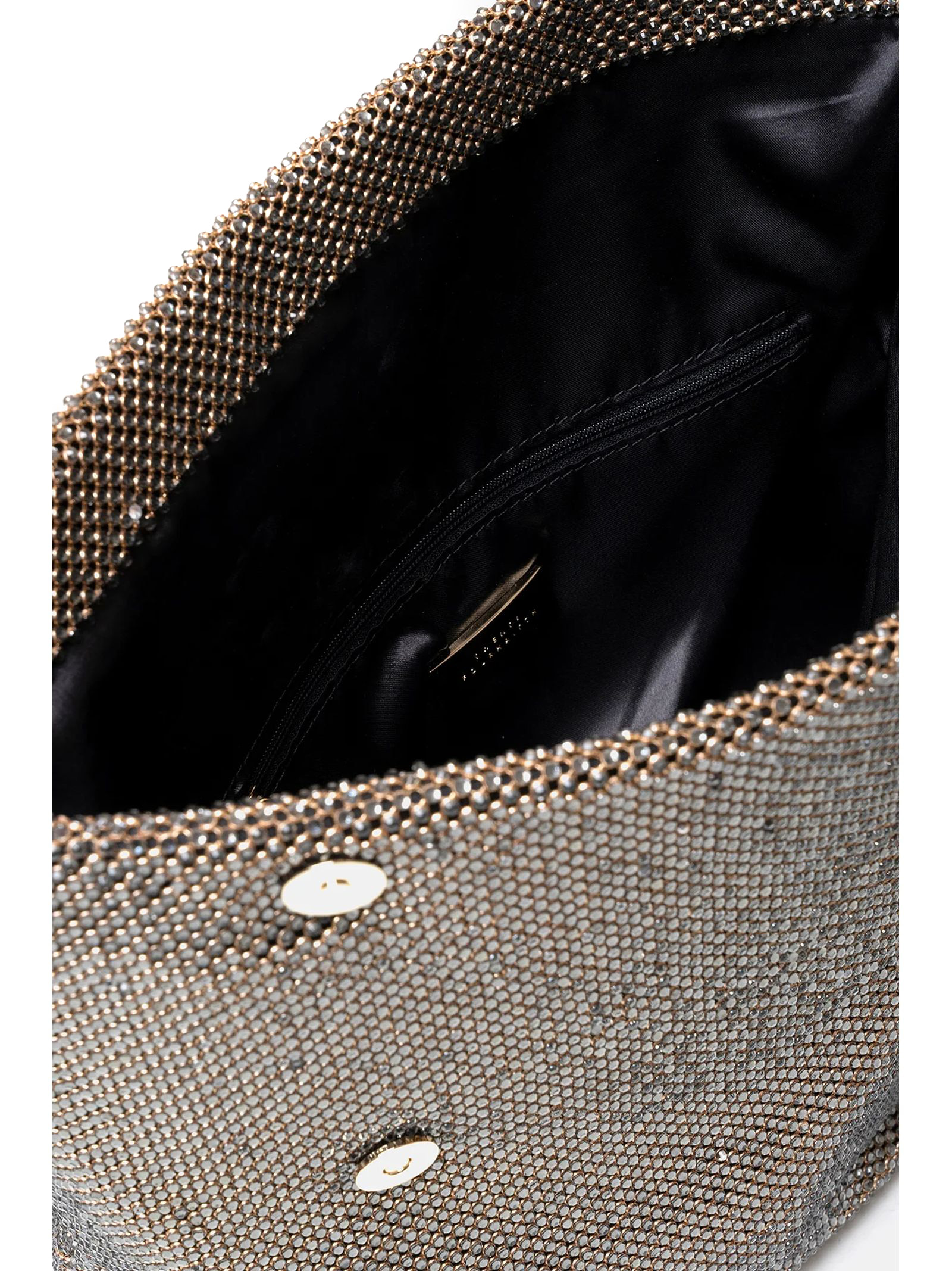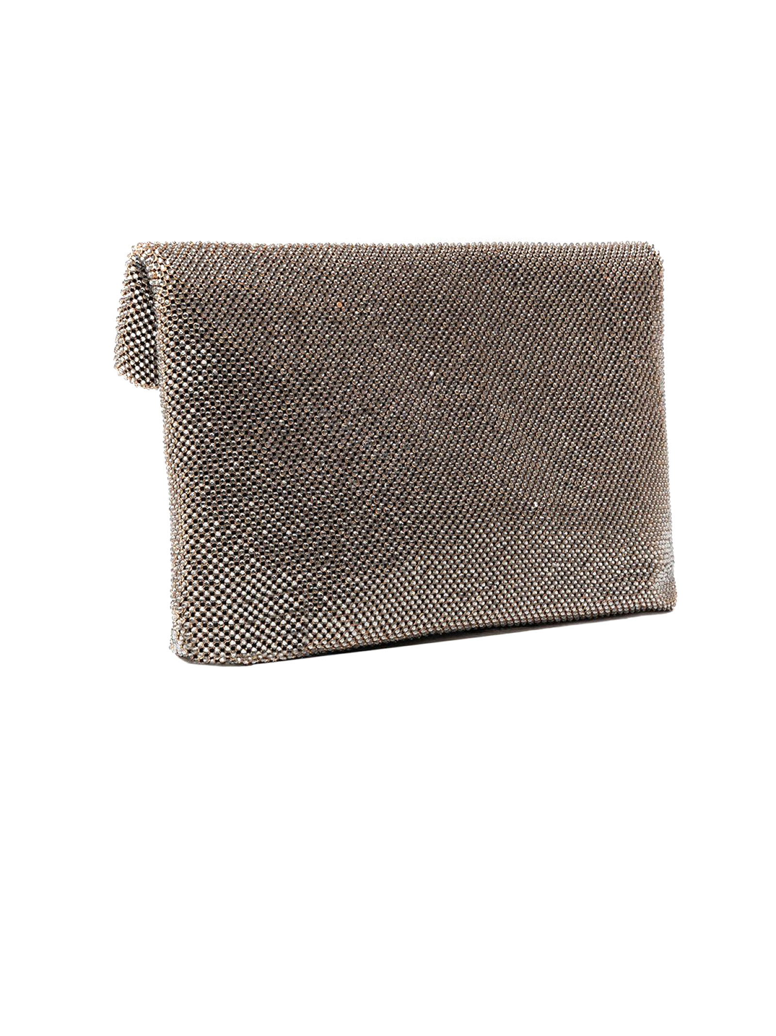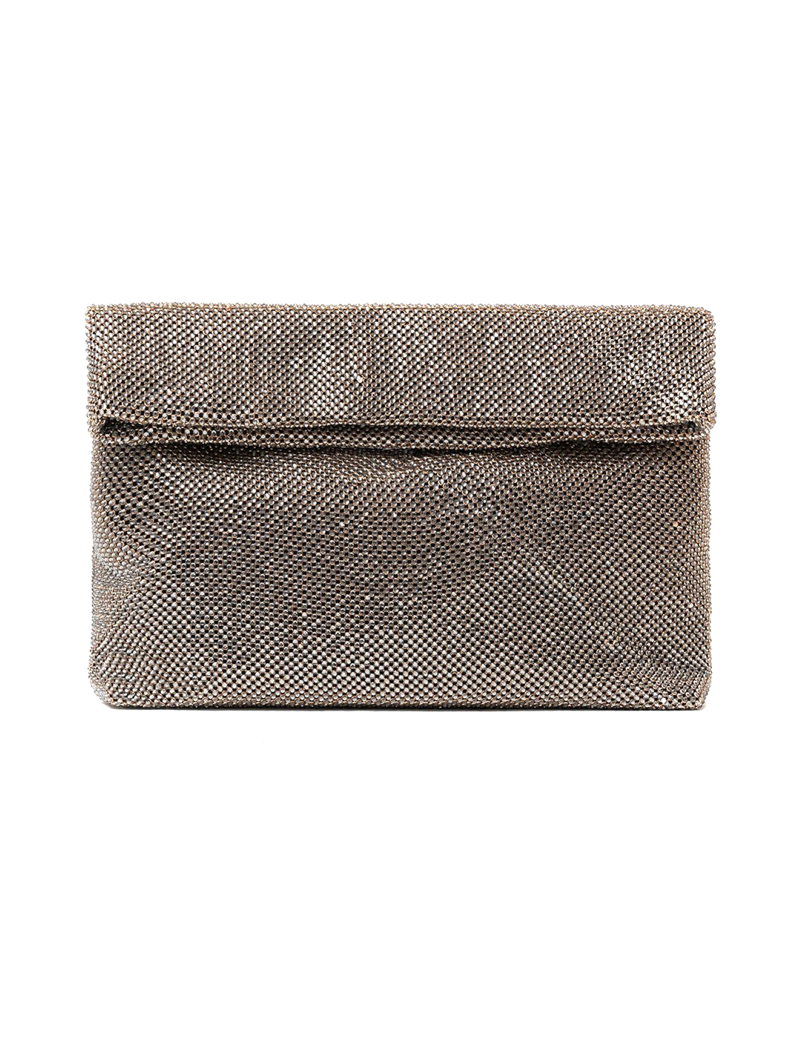 Dunham pewter maxi clutch bag in rhinestone knit, with magnetic closure, 38 x 20 x 11 cm