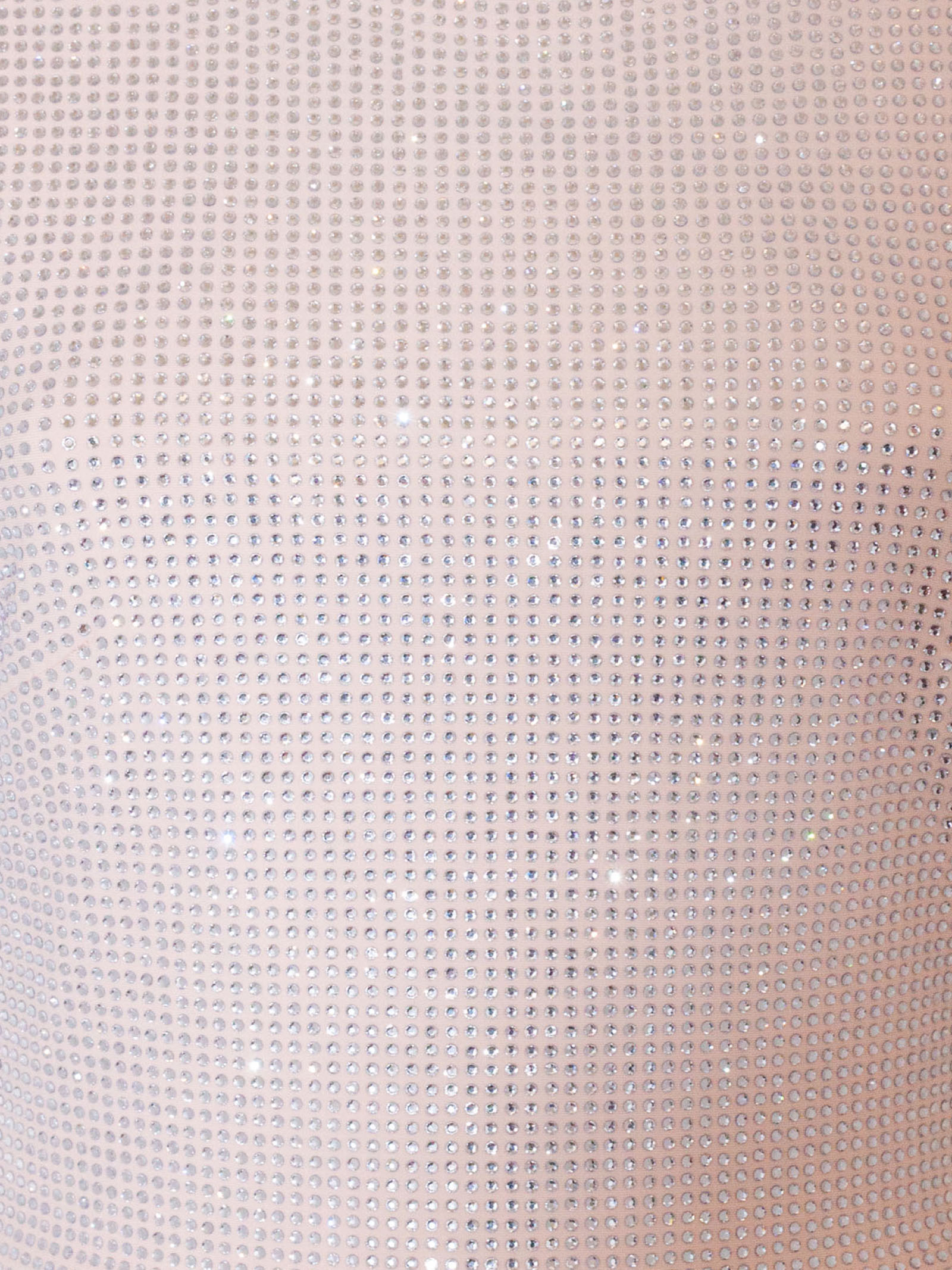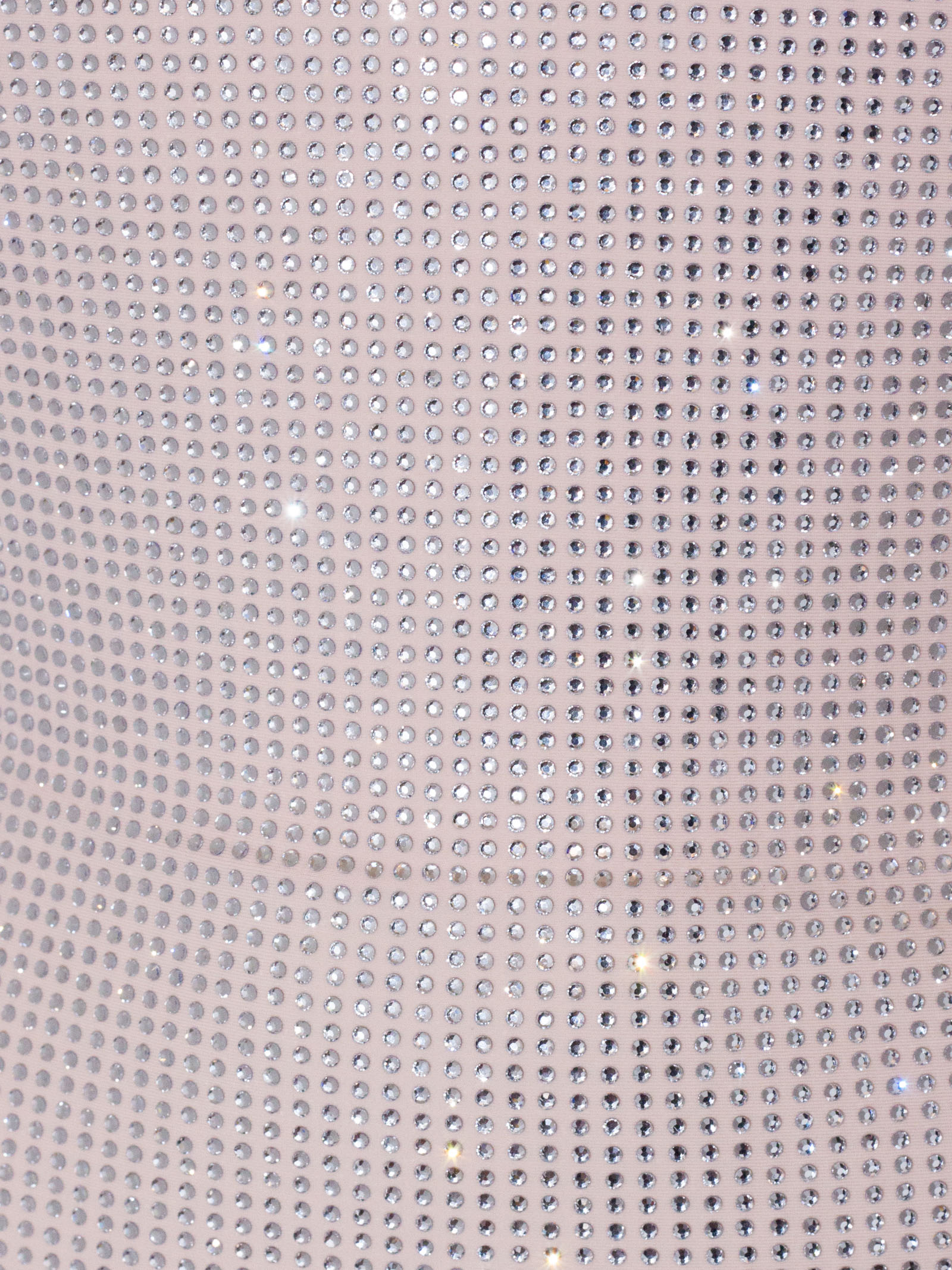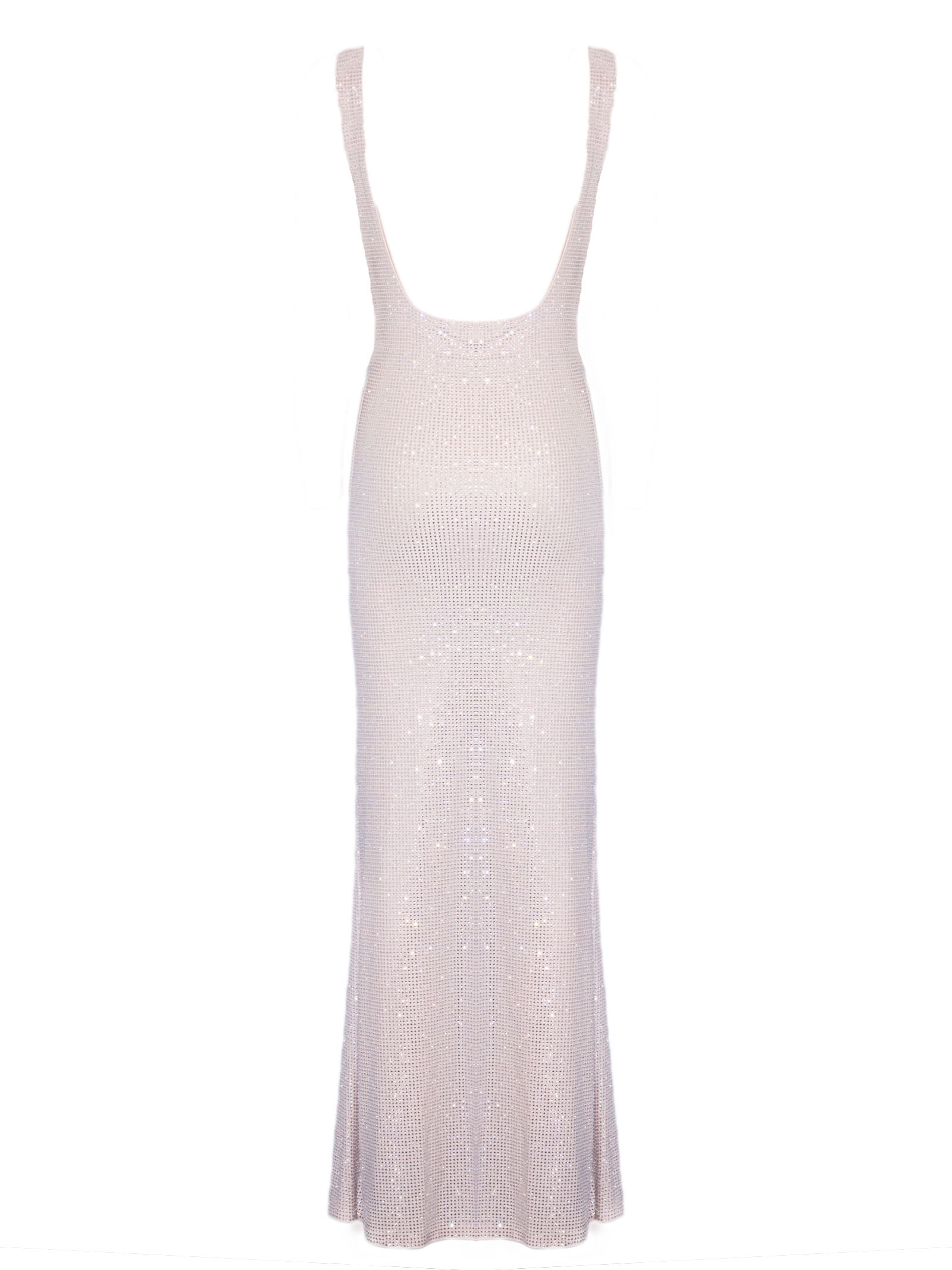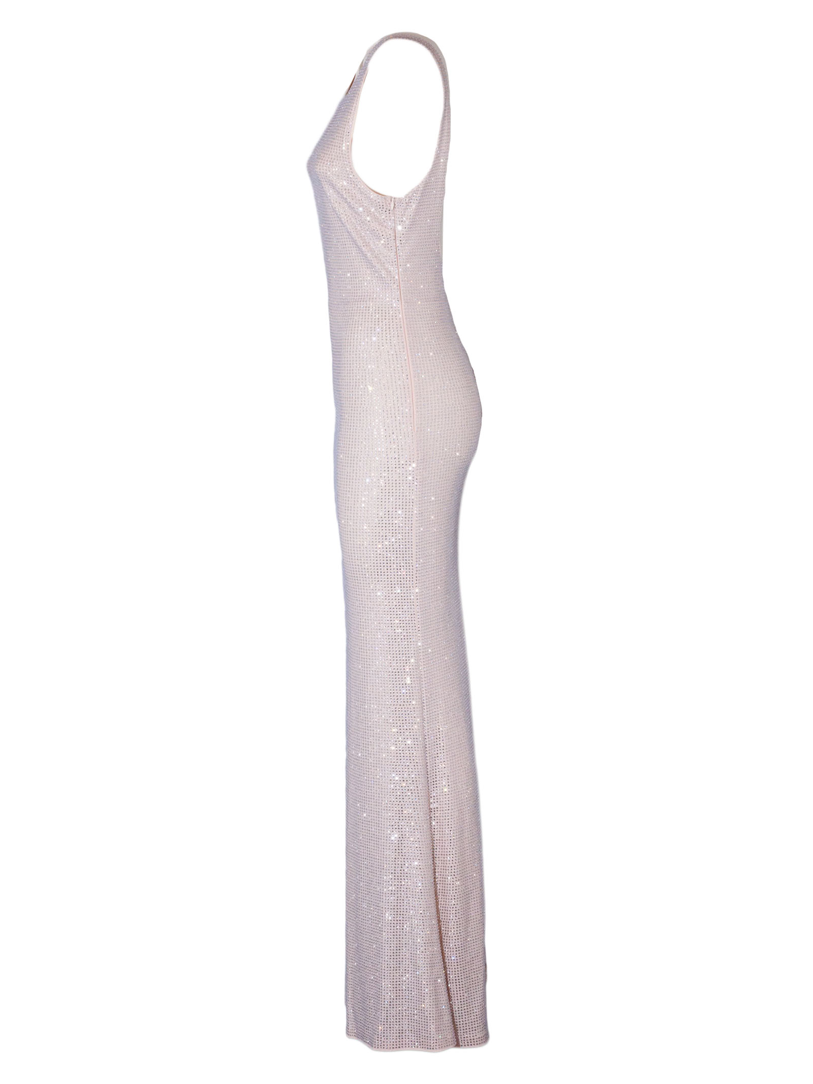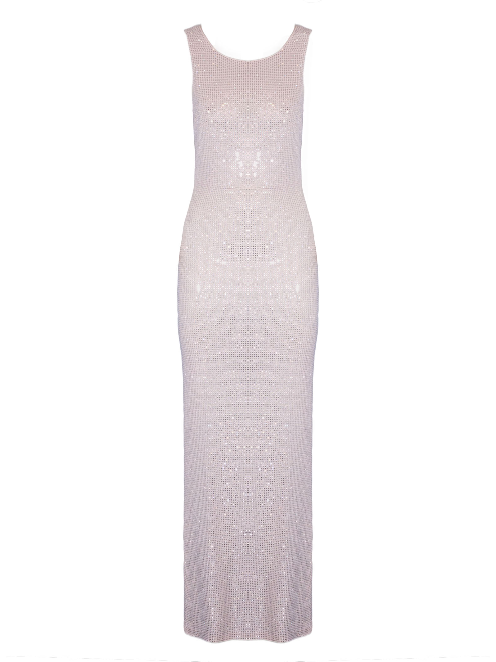 Long pink dress in tulle fabric entirely covered with rhinestones, wide neckline at the back, sleeveless