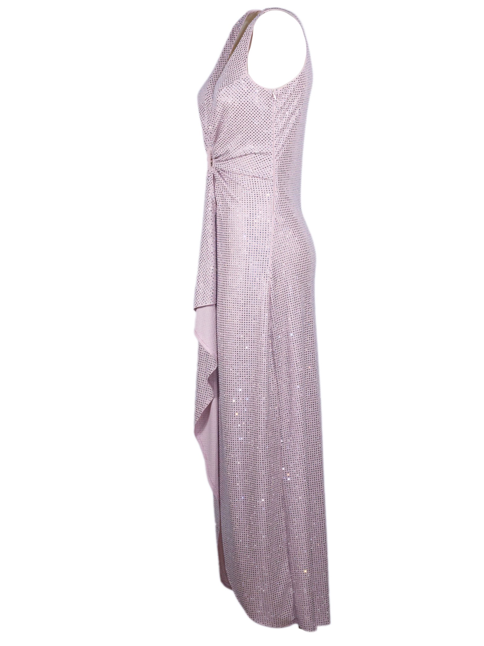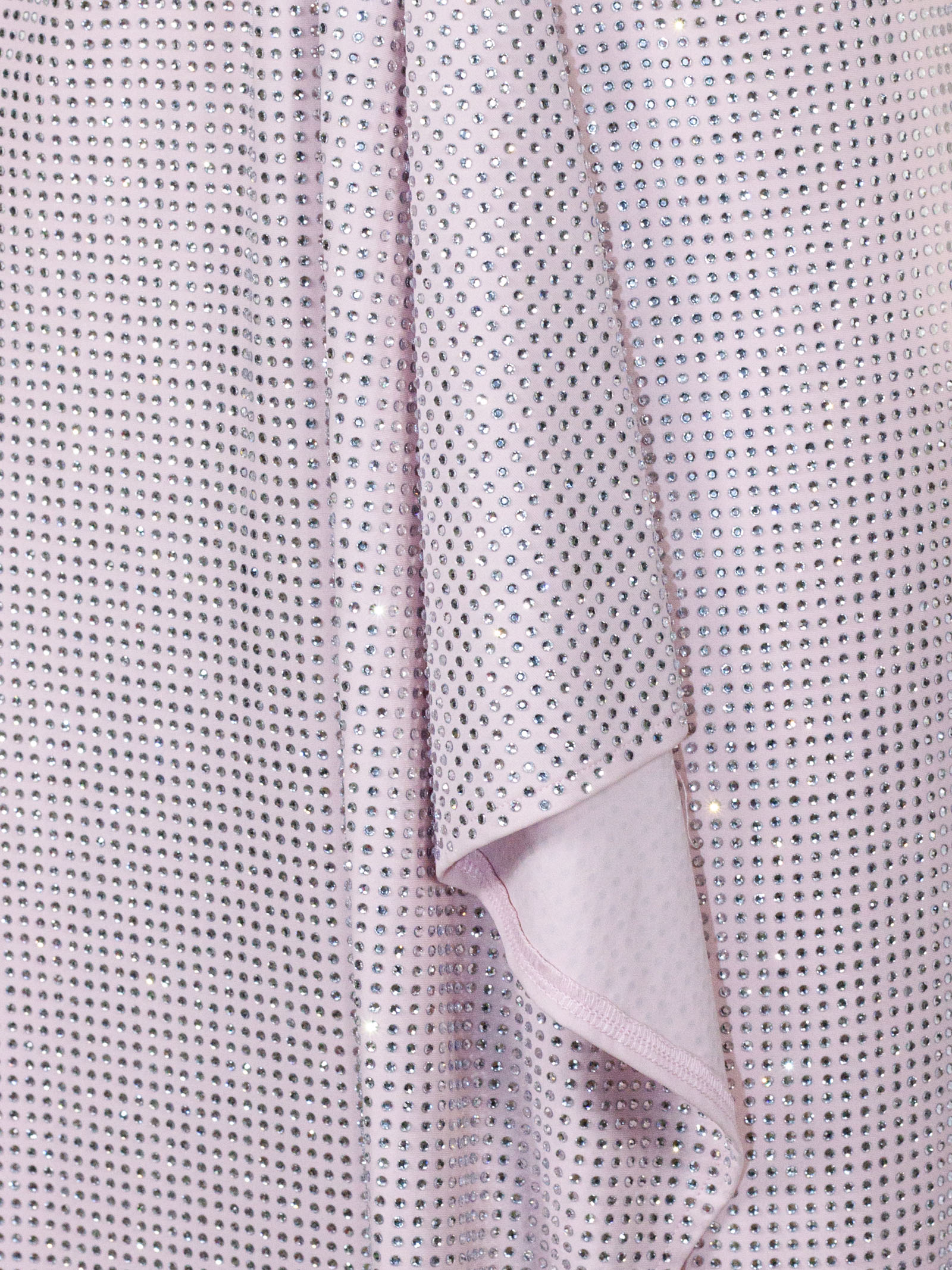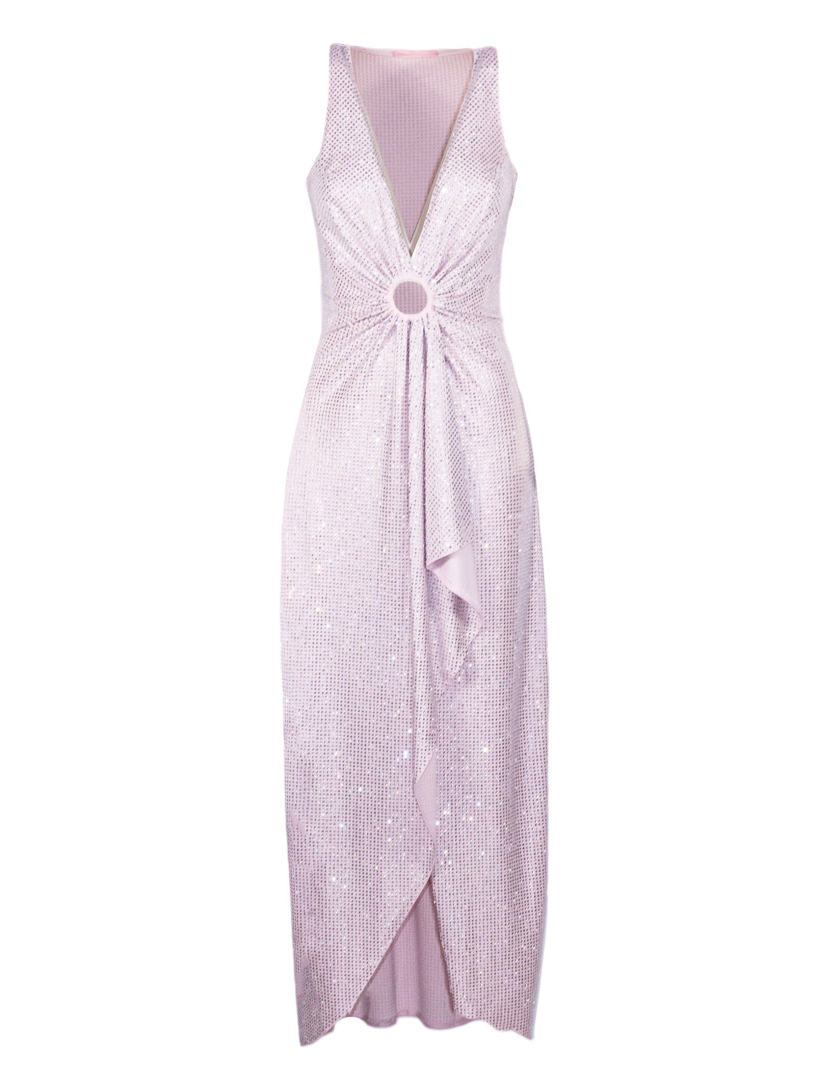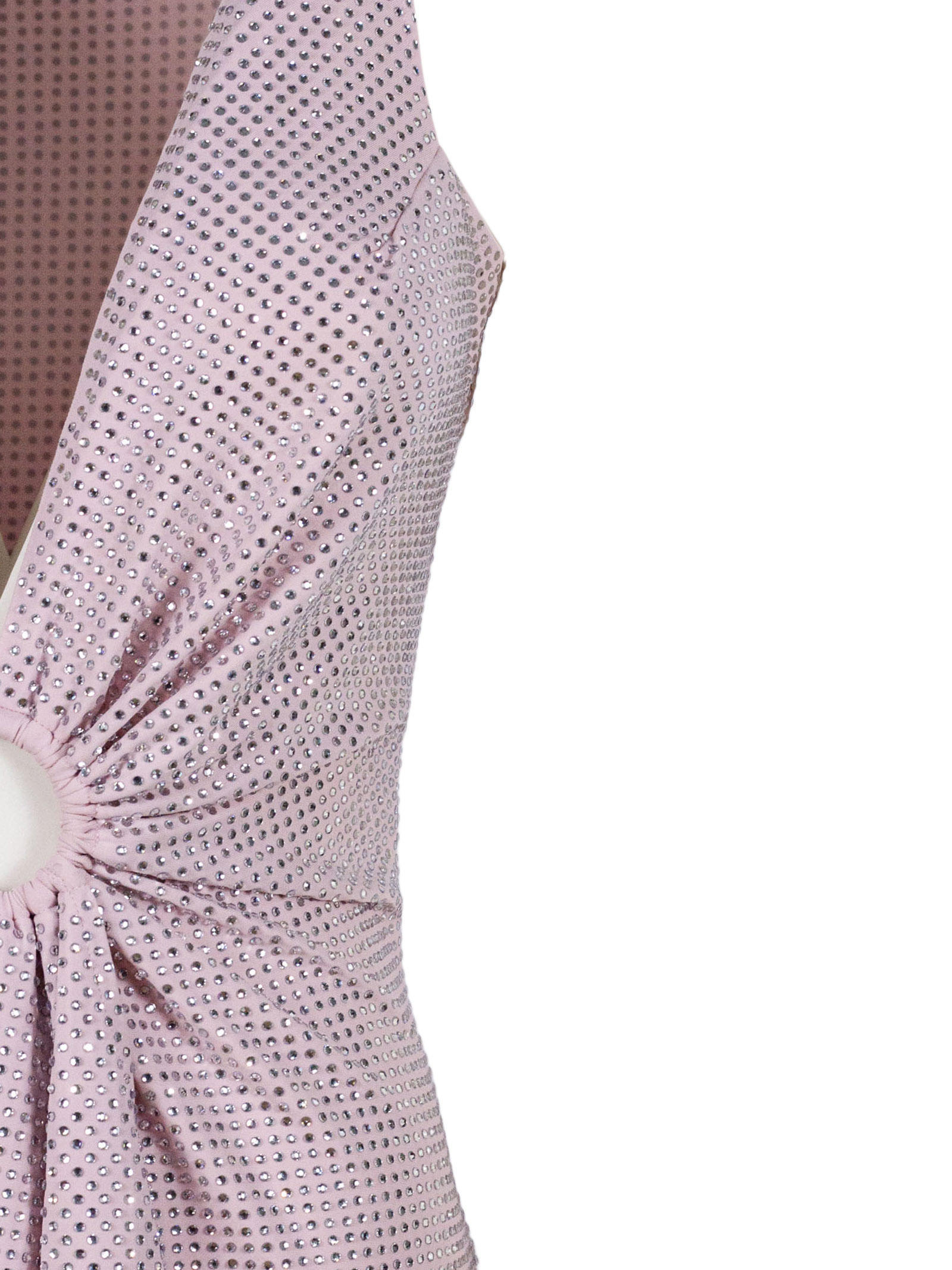 Navagio midi dress is crafted from Pink stretch fabric, entirely covered in rhinestones applied across the entire surface for a radiant, uniform finish. The deep neckline at the front features a central oval buckle that defines the waistline, whilst draping is incorporated into both the neckline and the skirt to accentuate the garments silhouette. The front slit is enhanced by a wide ruffle, incorporated as a structural element that accompanies movement whilst maintaining a regular fit