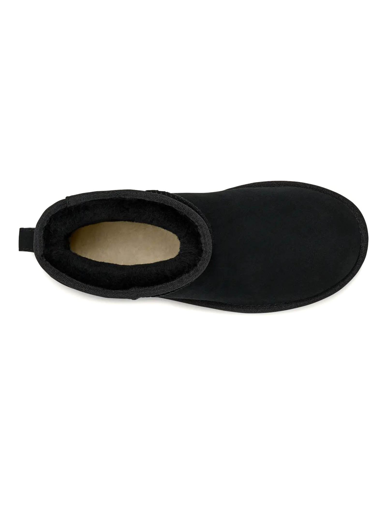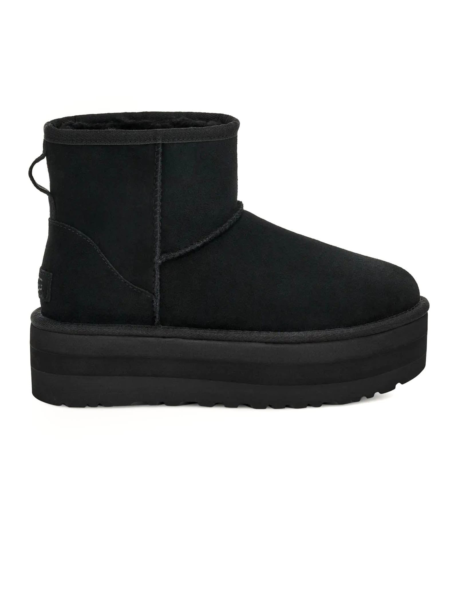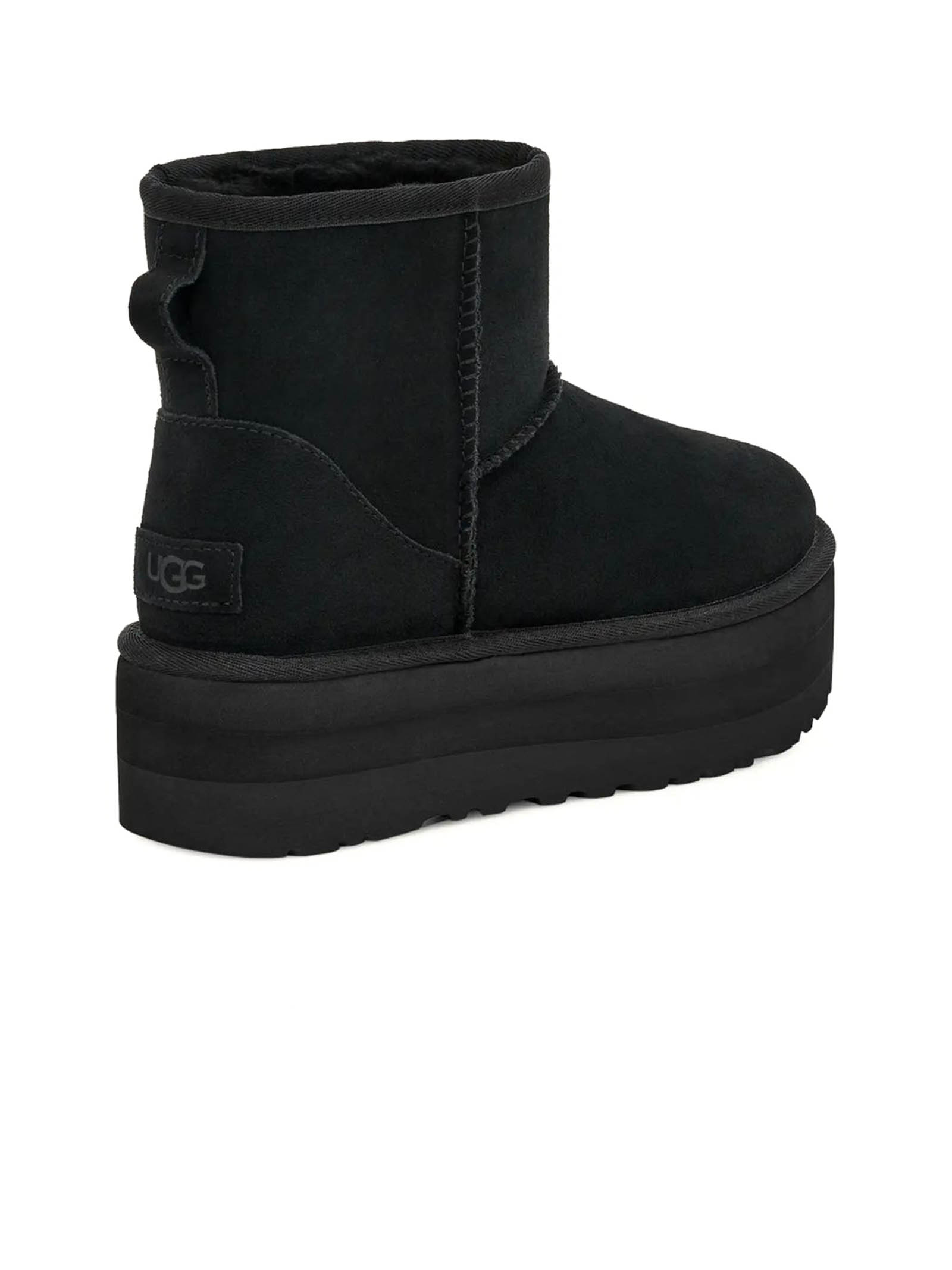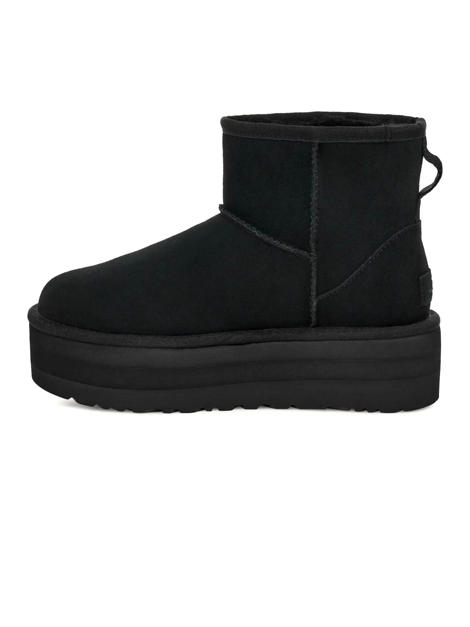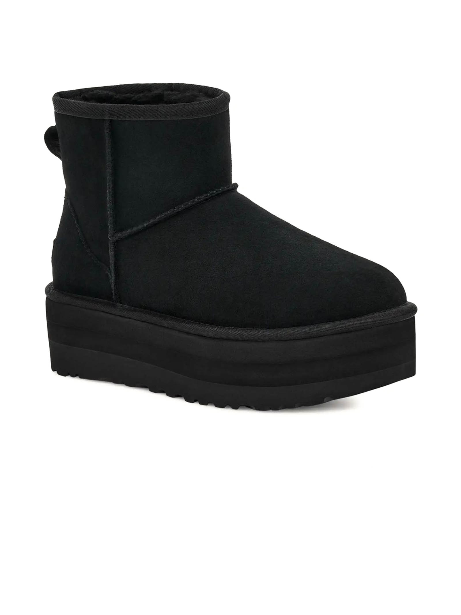 Black Classic Mini Platform Boot, Suede upper, Overlock stitch detailing on seams, Rear pull tab, 17mm UGGplush 80% upcycled wool, 20% TENCEL Lyocell lining or 17mm UGGplush 60% upcycled wool, 40% TENCEL Lyocell lining, 17mm UGGplush 80% upcycled wool, 20% TENCEL Lyocell sockliner or 17mm UGGplush 60% upcycled wool, 40% TENCEL Lyocell sockliner, EVA midsole, Sugarcane EVA outsole or Treadlite by UGG EVA outsole, Recycled polyester binding, 5" shaft height, 2" platform height, The UGG® Logo, embossed suede heel label