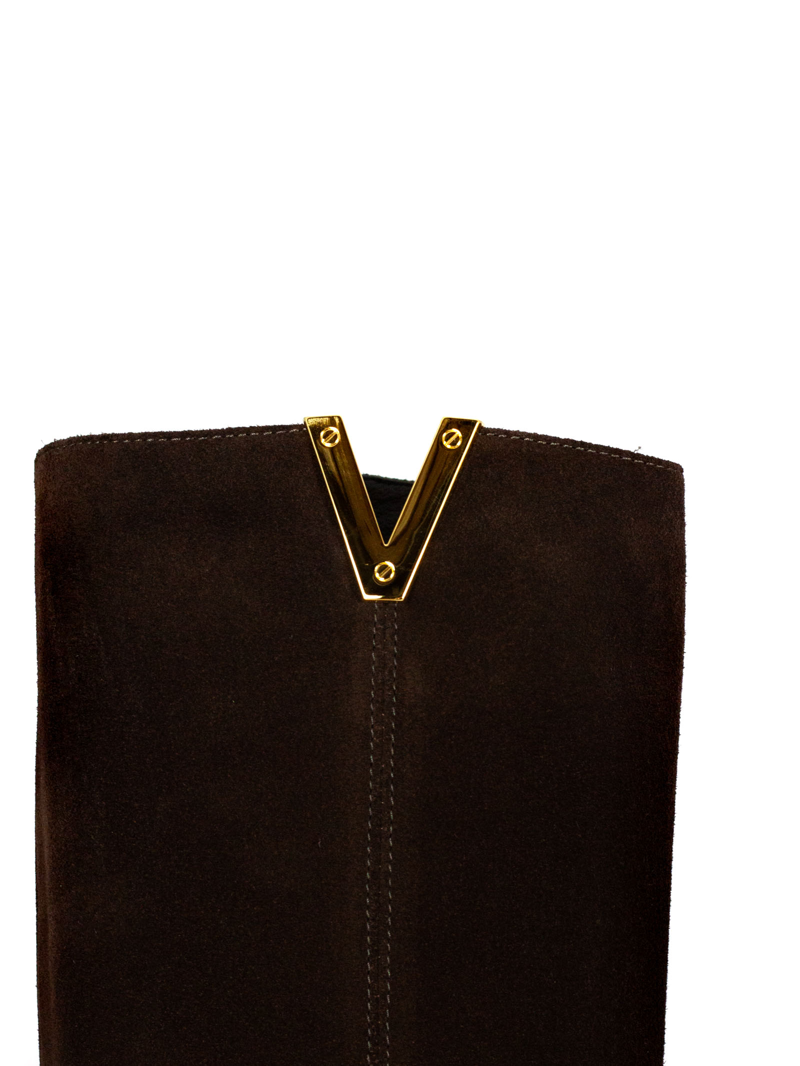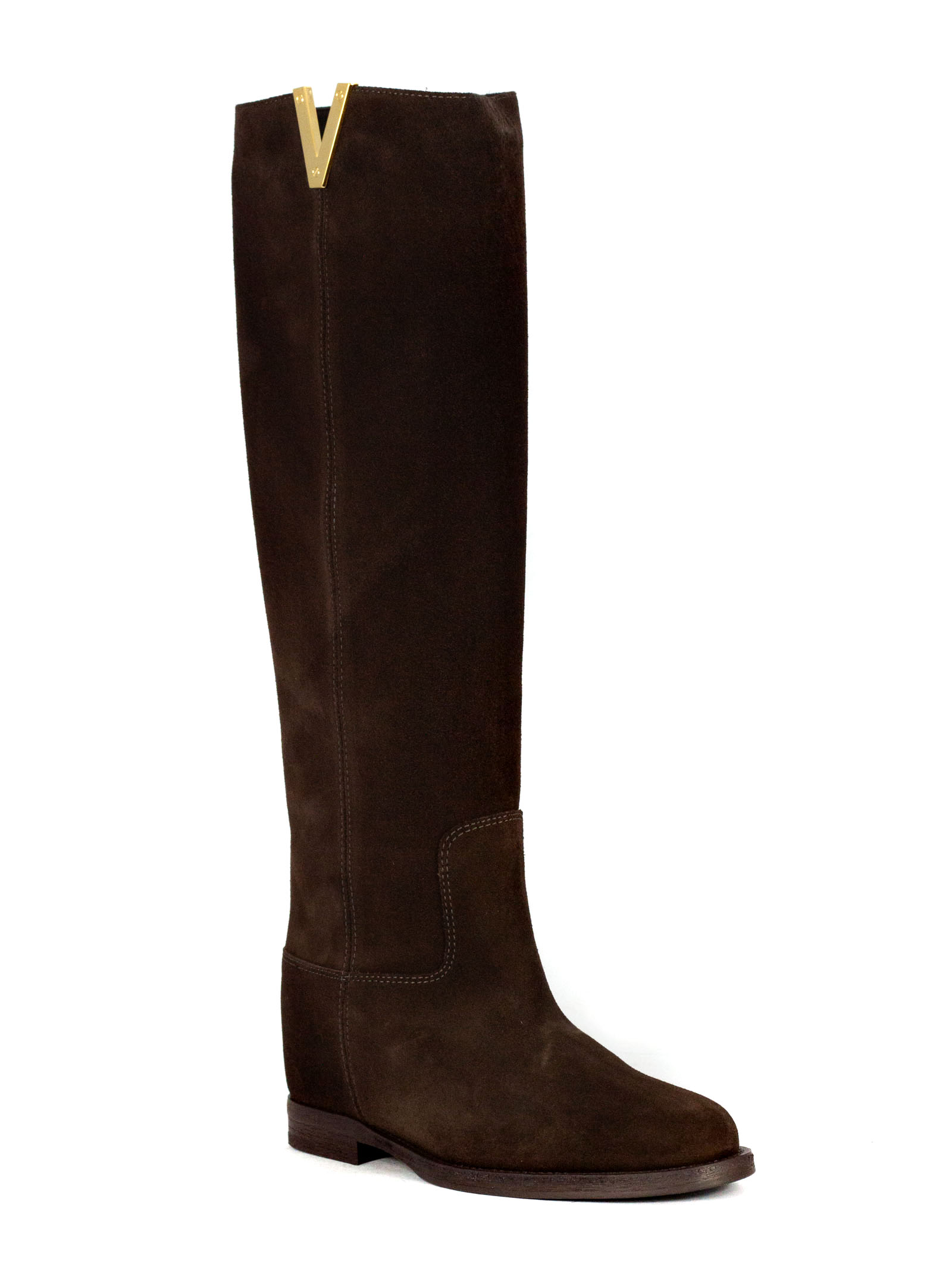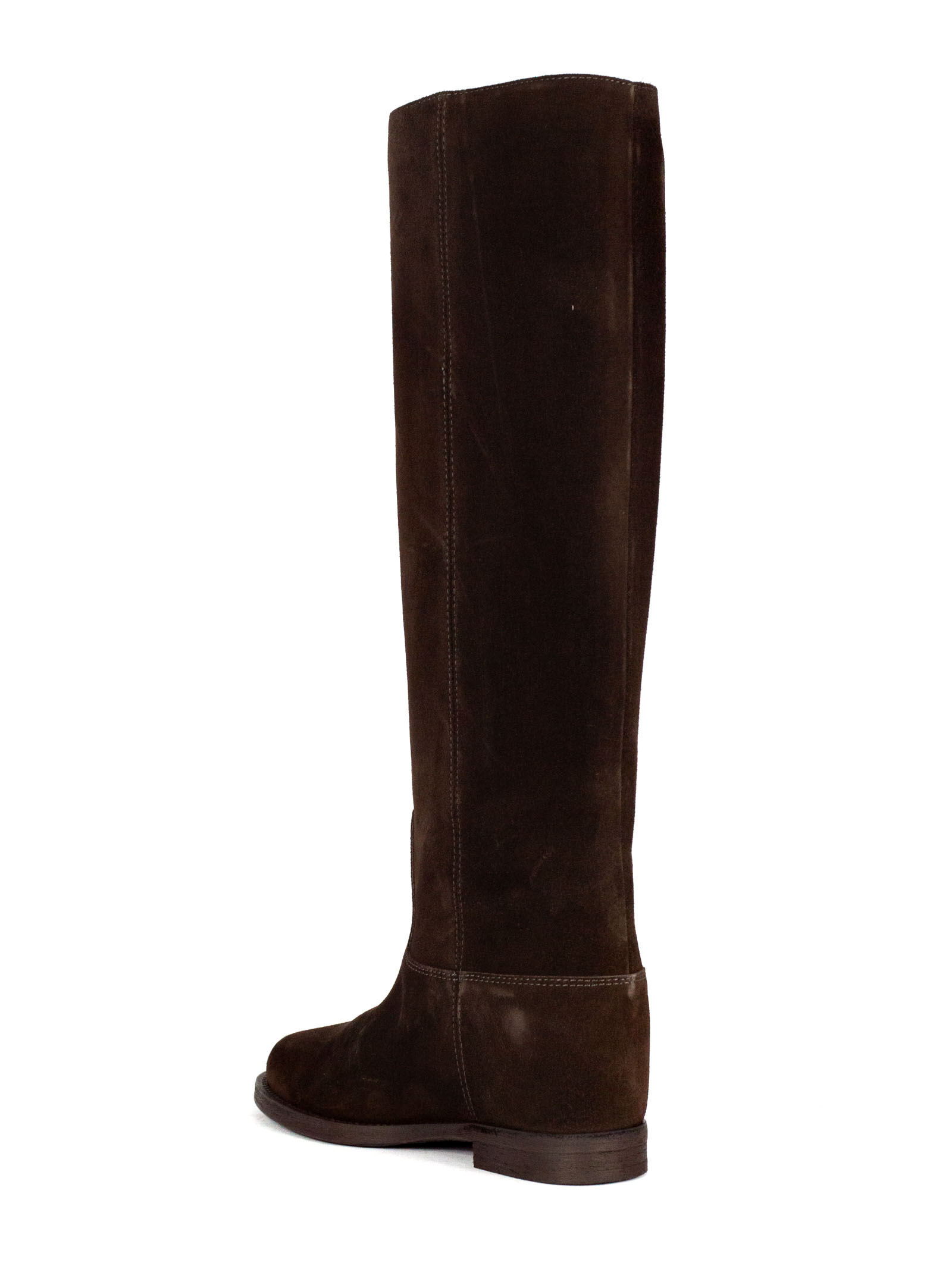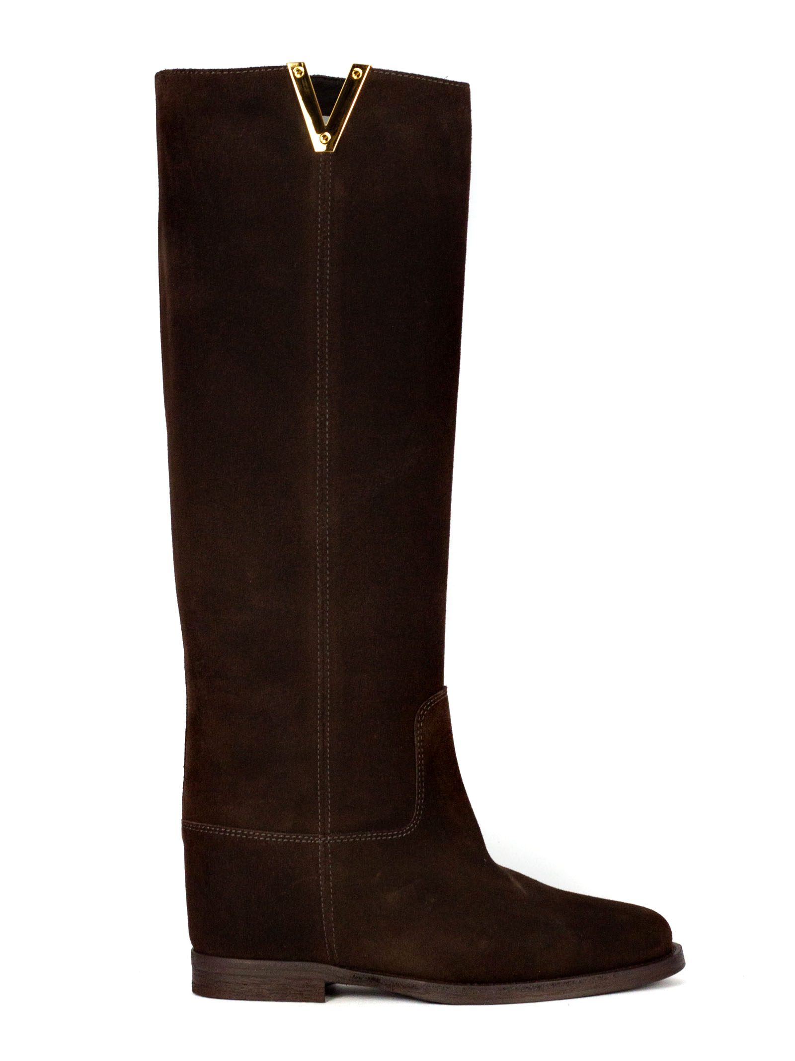 Brown suede high boot with gold-tone metal hardware detail, knee height, leather sole with logo, 6 cm internal wedge
