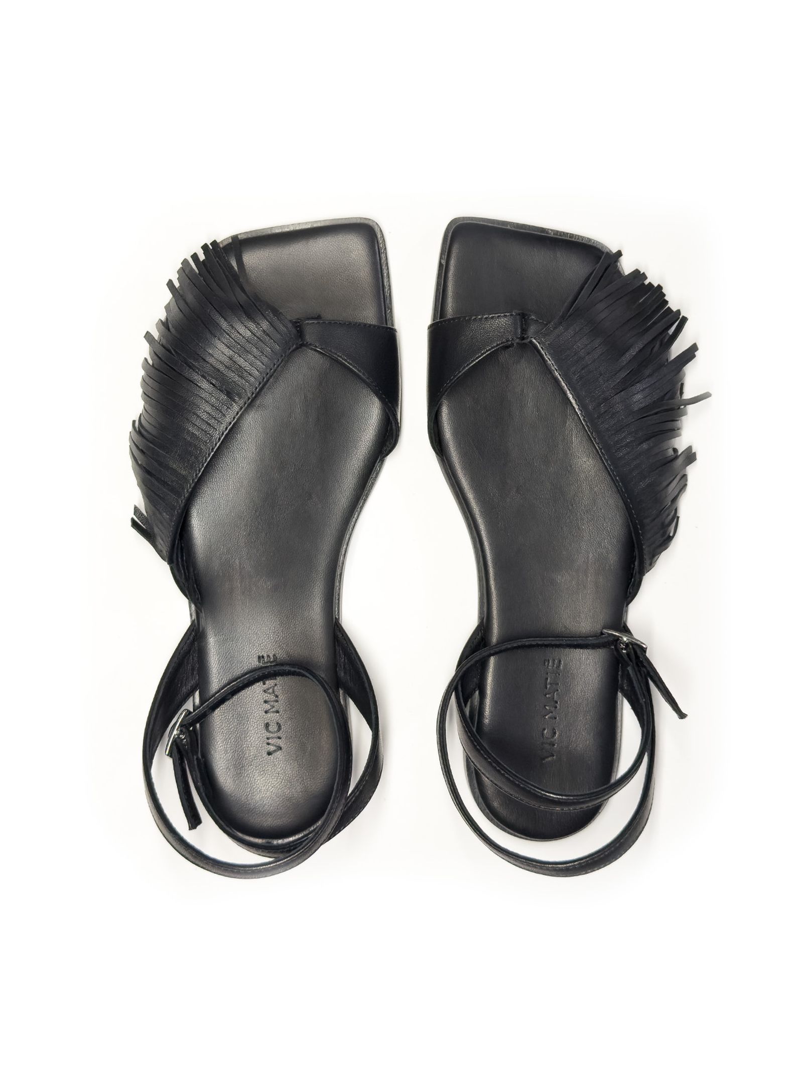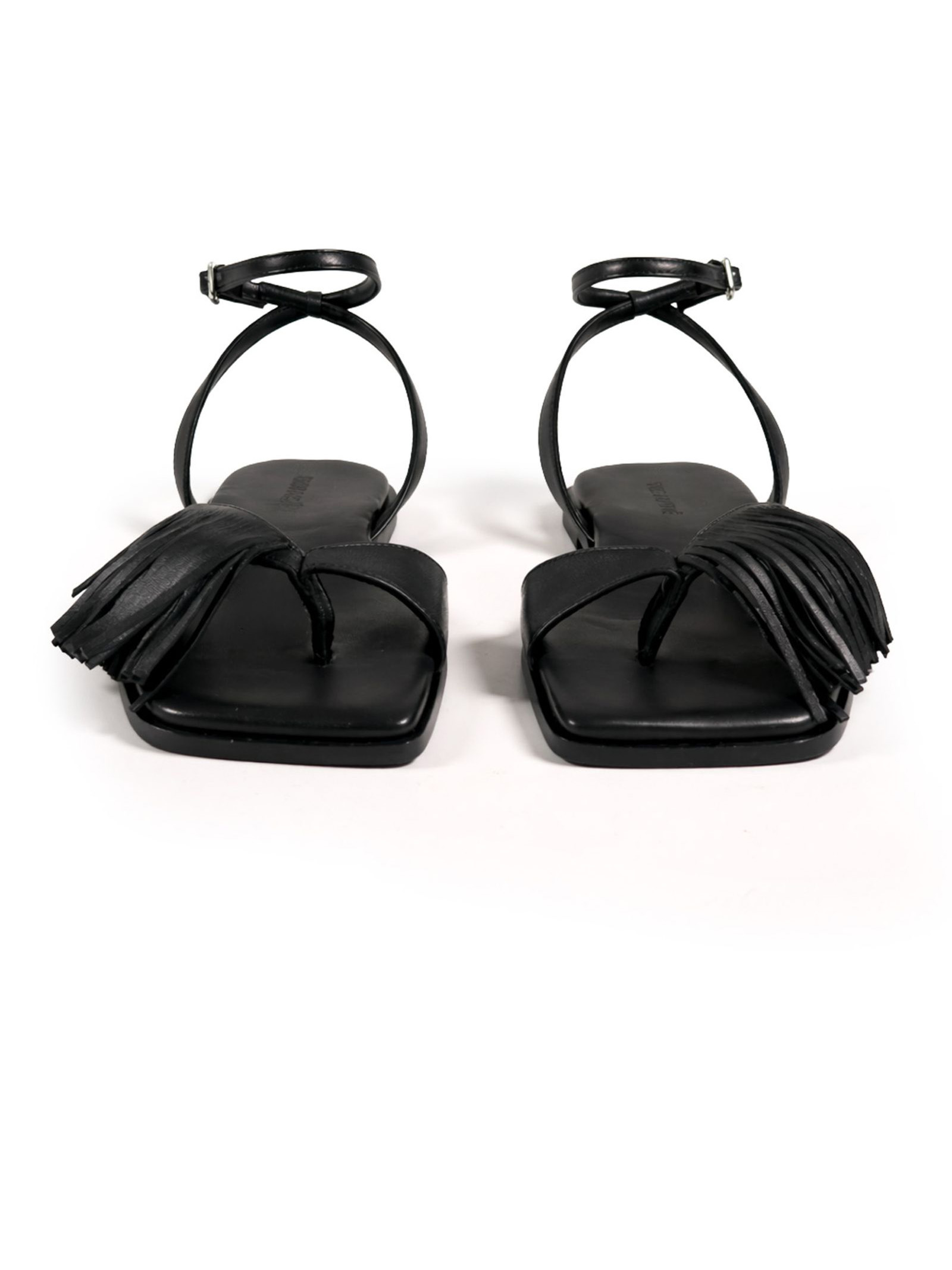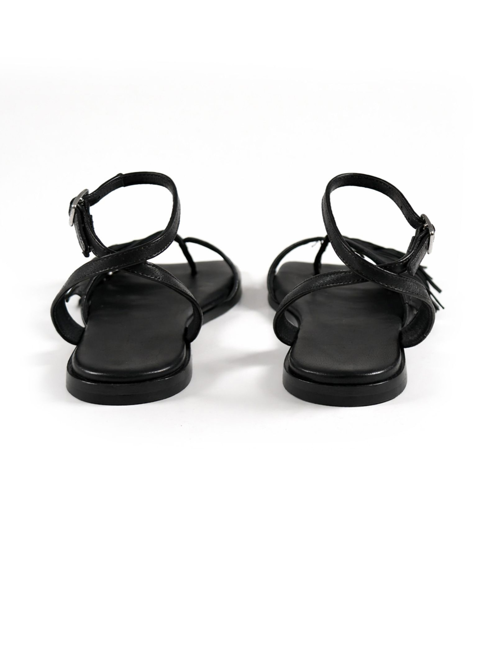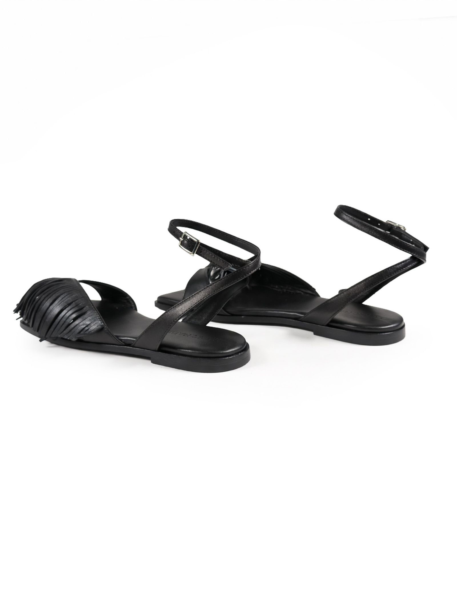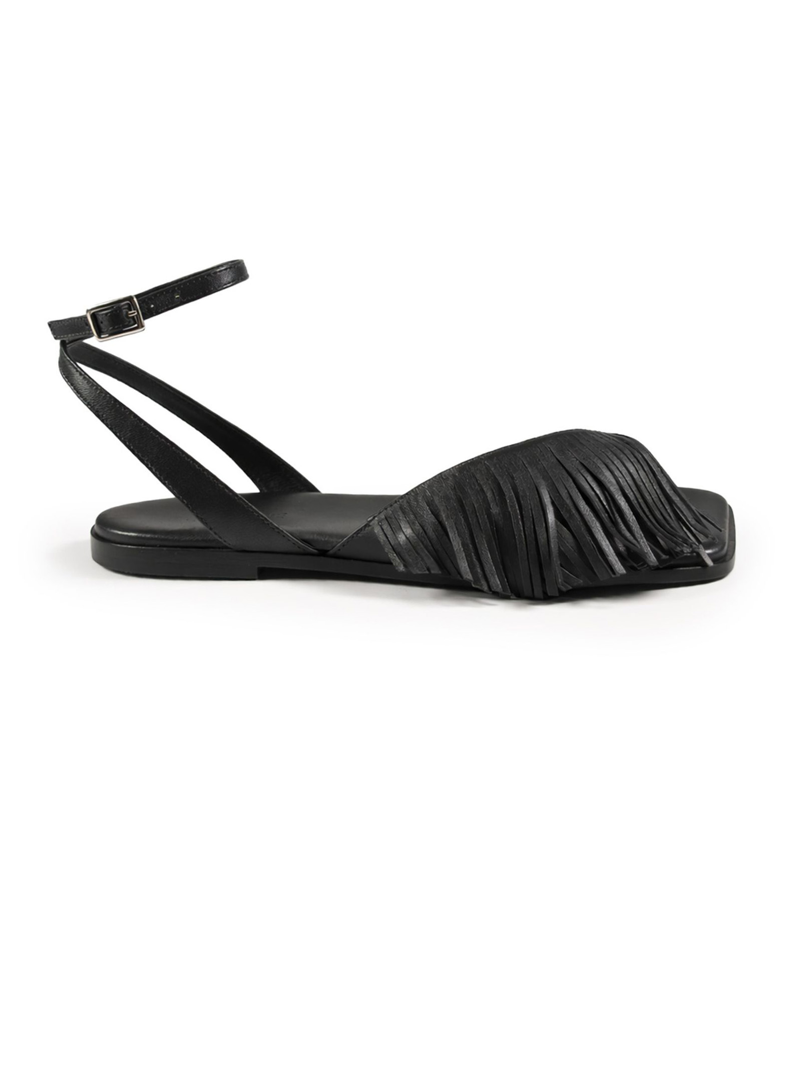 Black nappa leather sandals with a front strap adorned with delicate fringes for a boho look, an adjustable ankle strap with a metal buckle, a flat leather sole with a non-slip rubber heel, and a padded leather insole