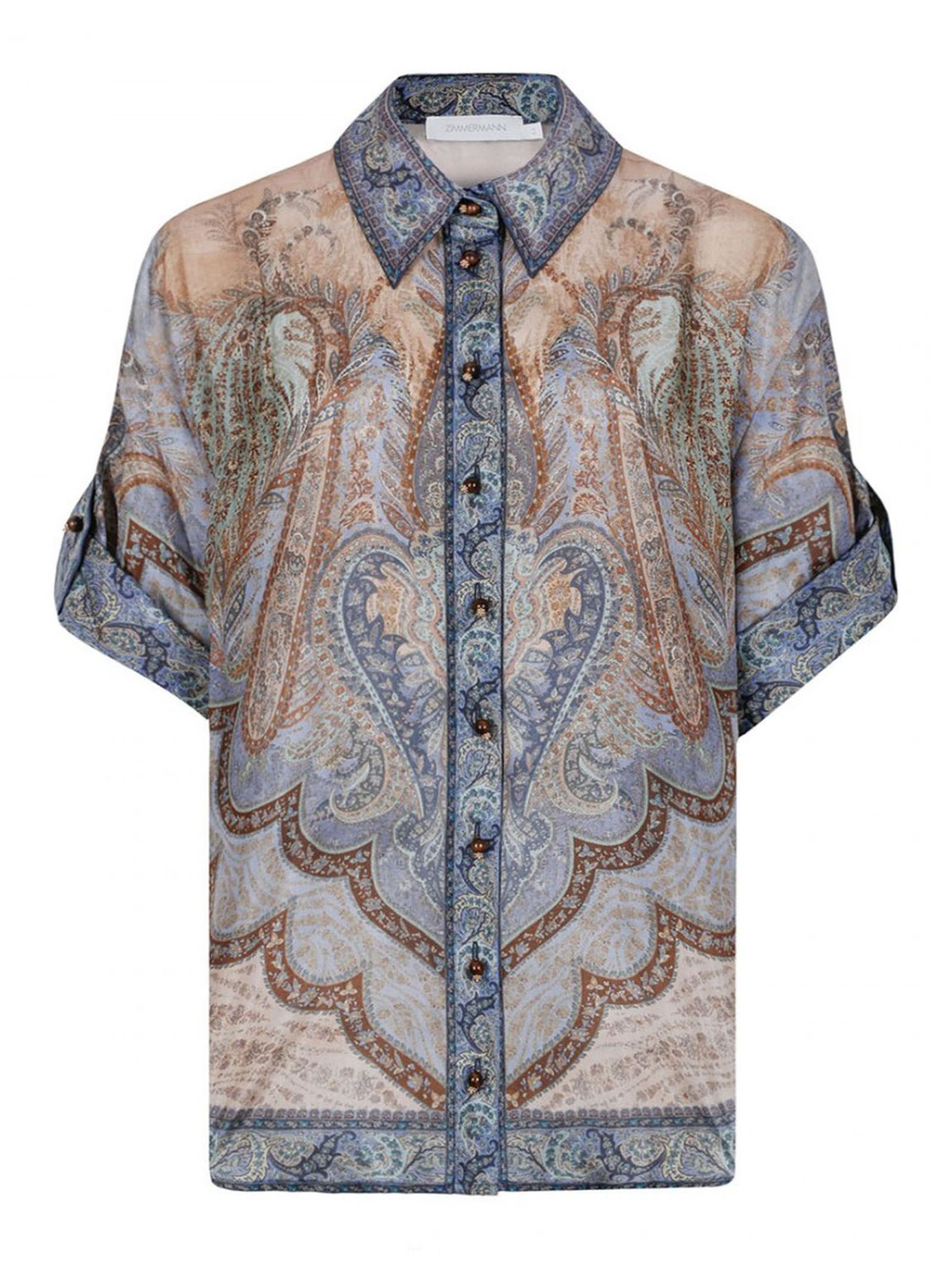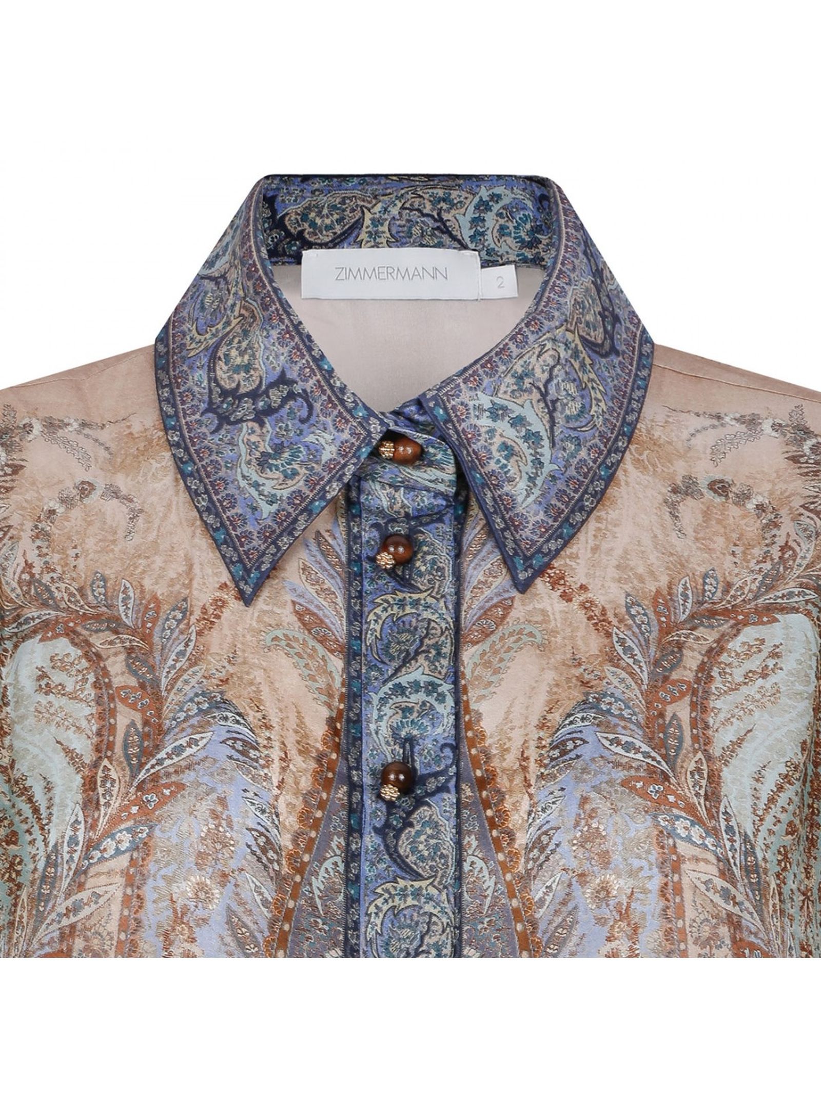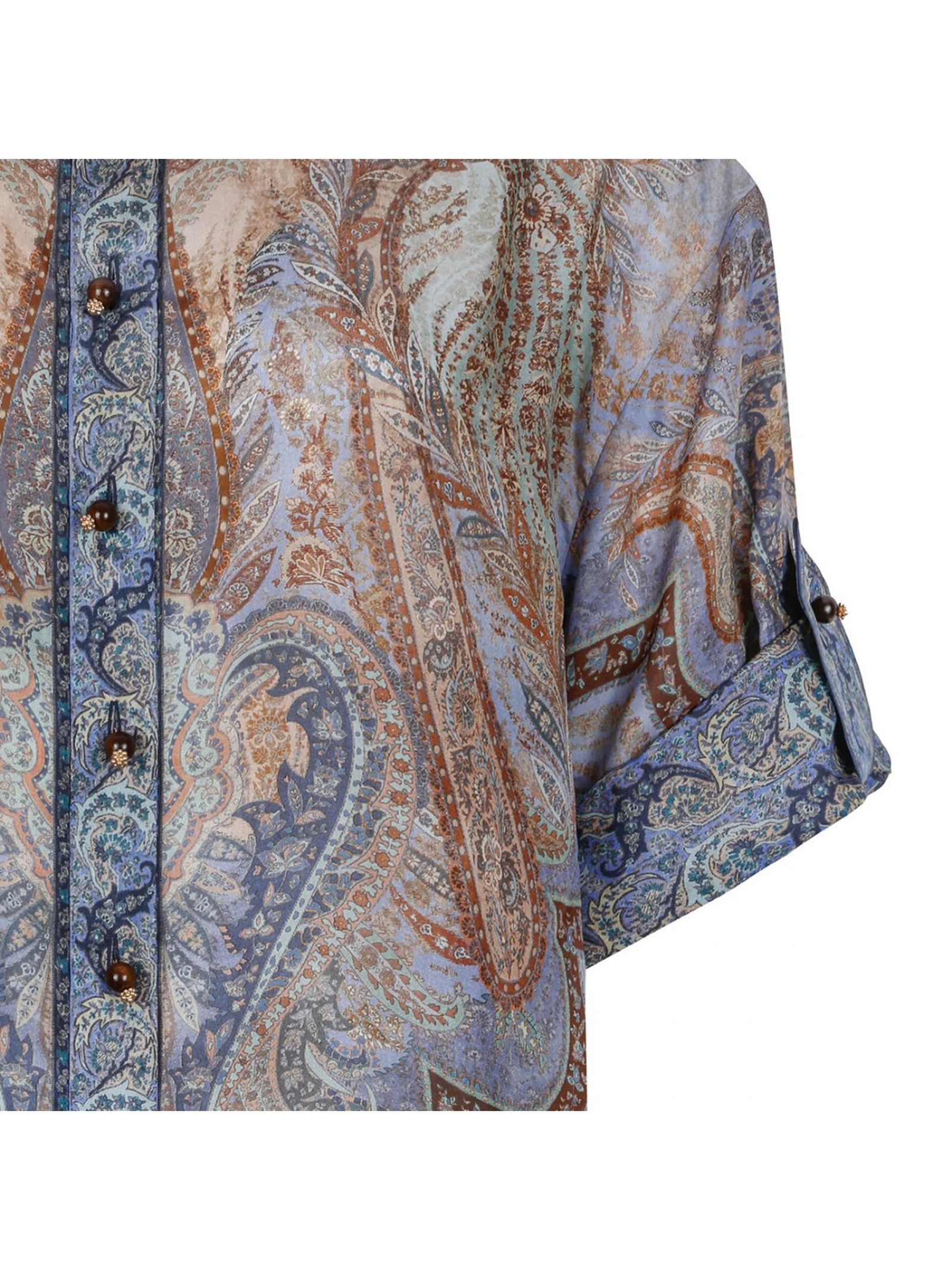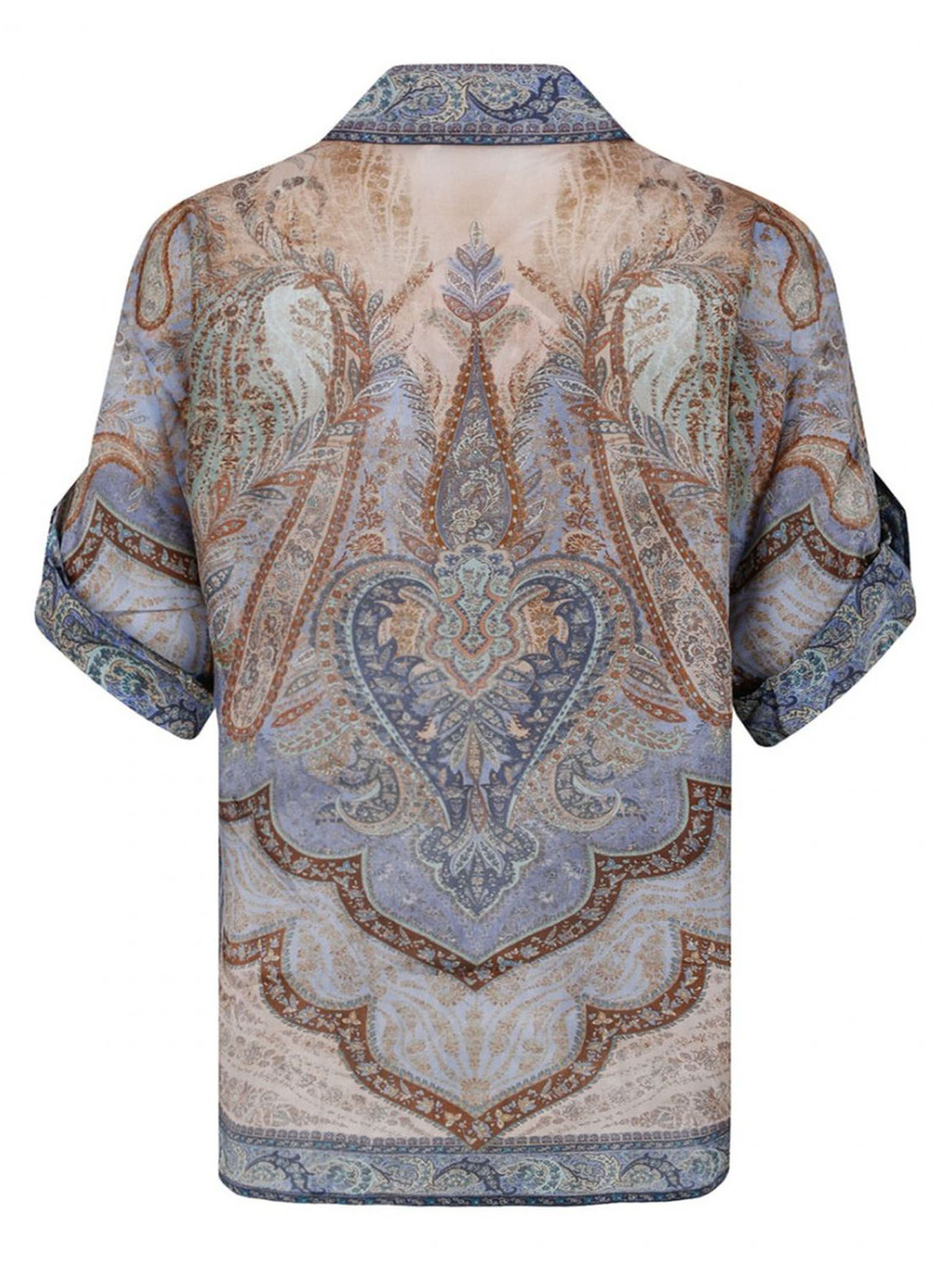 Blue silk habutae fabric Wanderlust shirt featuring tapestry motif, classic collar, short sleeves, rolled cuffs with tabs, button fastening on centre front, asymmetrical hem, 100% SILK