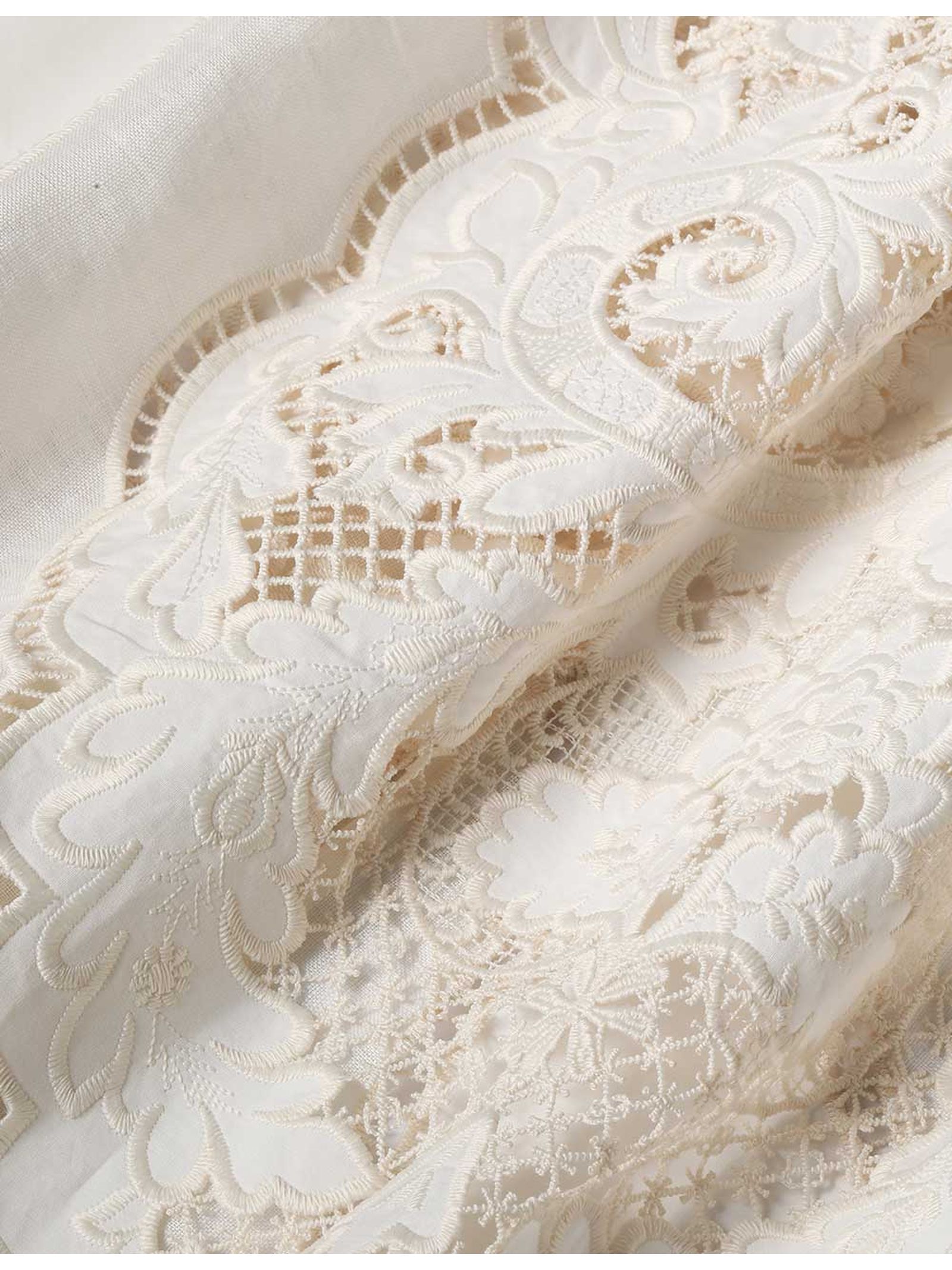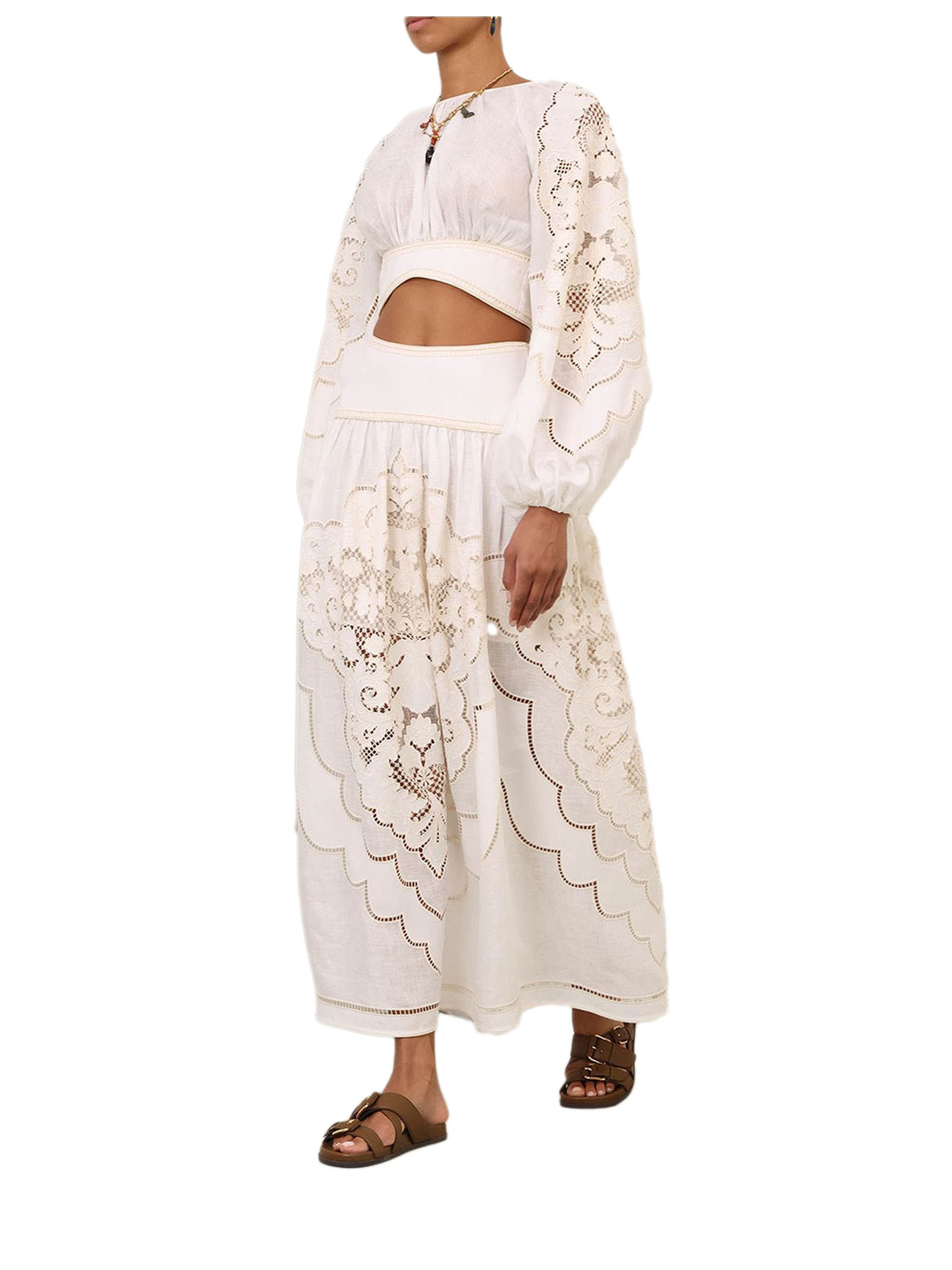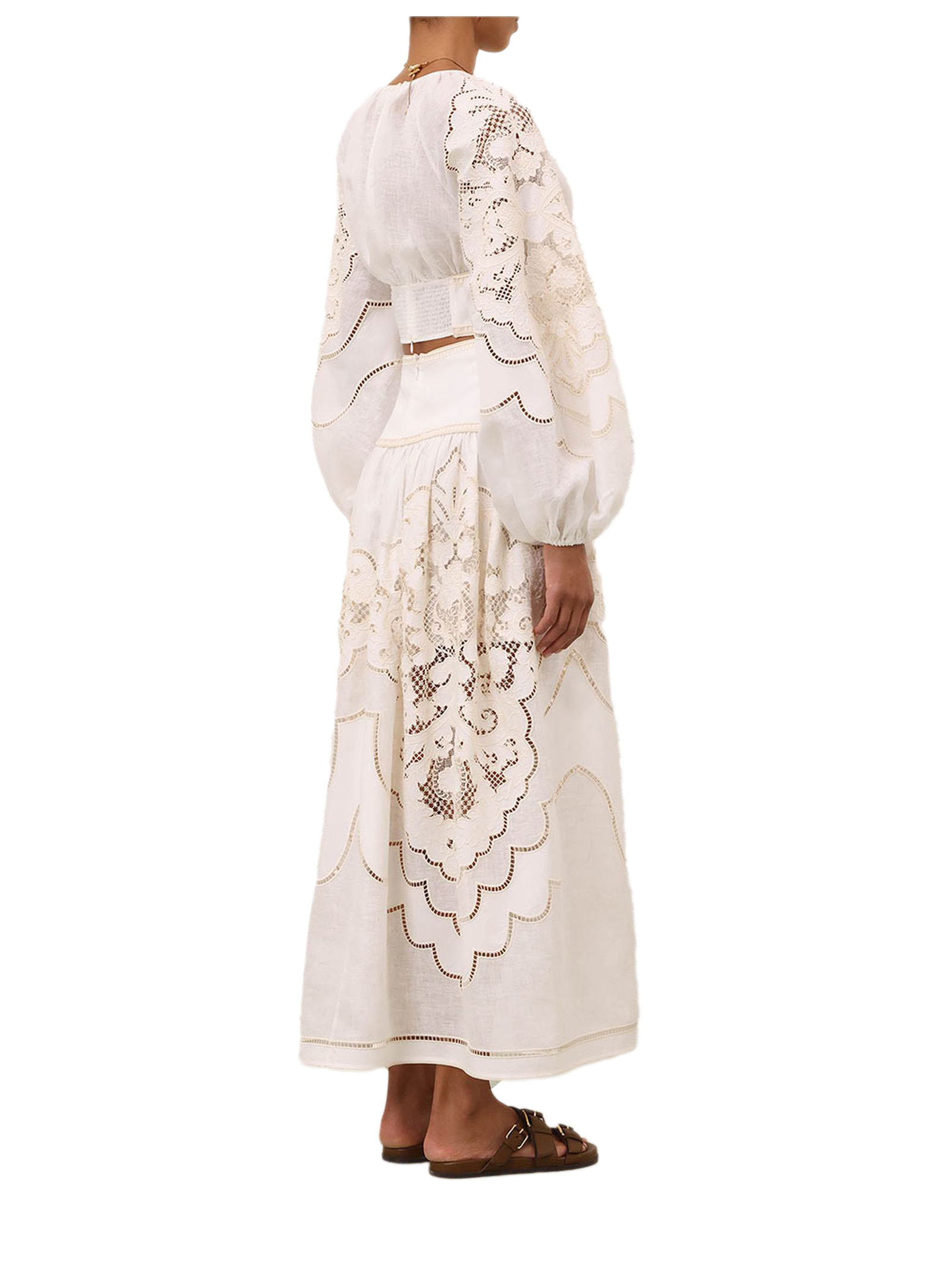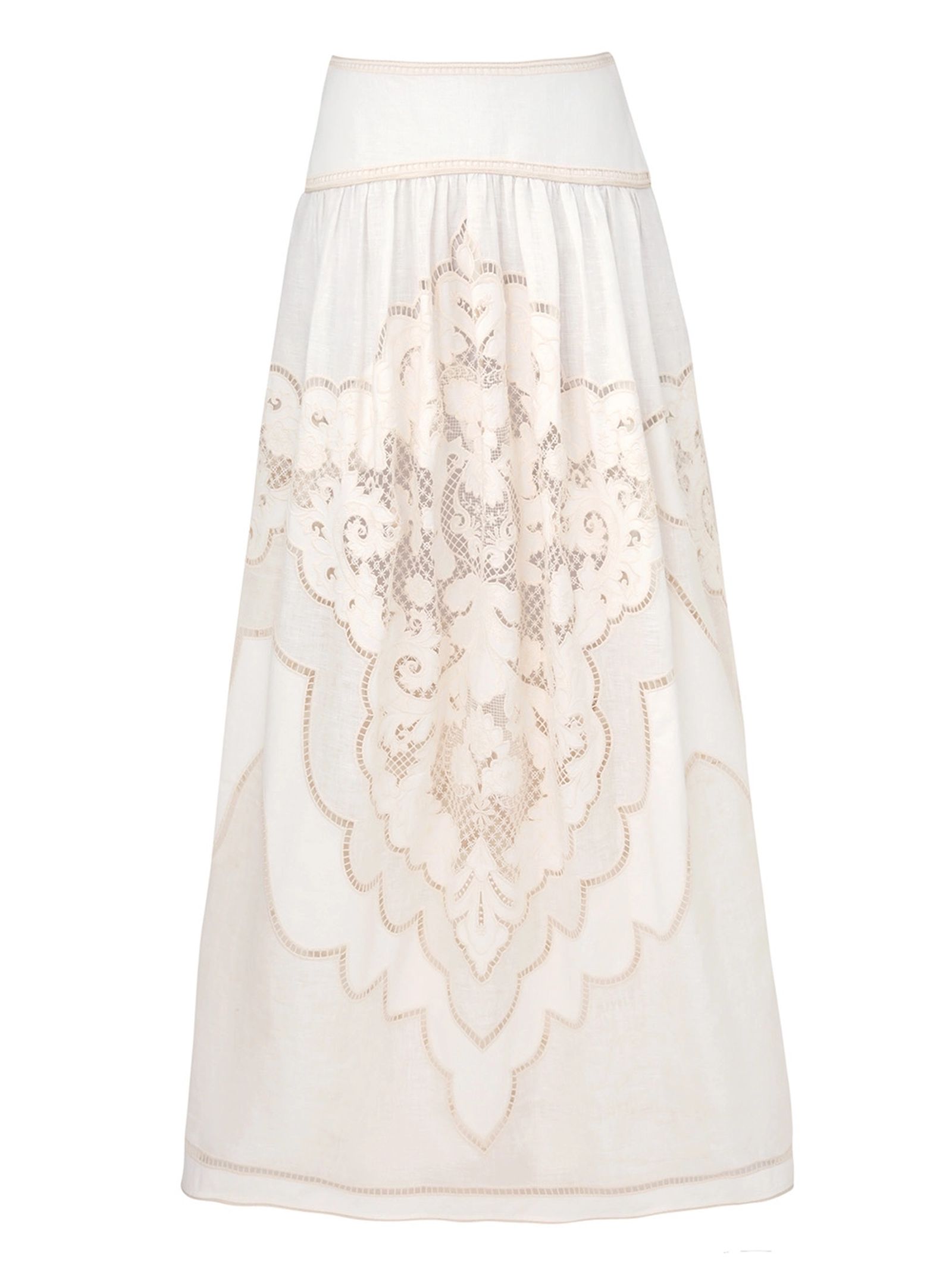 Daylight Maxi Skirt in Cream, Linen fabric, High-rise, full-length skirt, Invisible centre back zip closure, Heavily gathered, Placement embroidery, Mini length, lining, 100% linen; contrast: 100% cotton; embroidery: 100% polyester; lining: 100% cotton