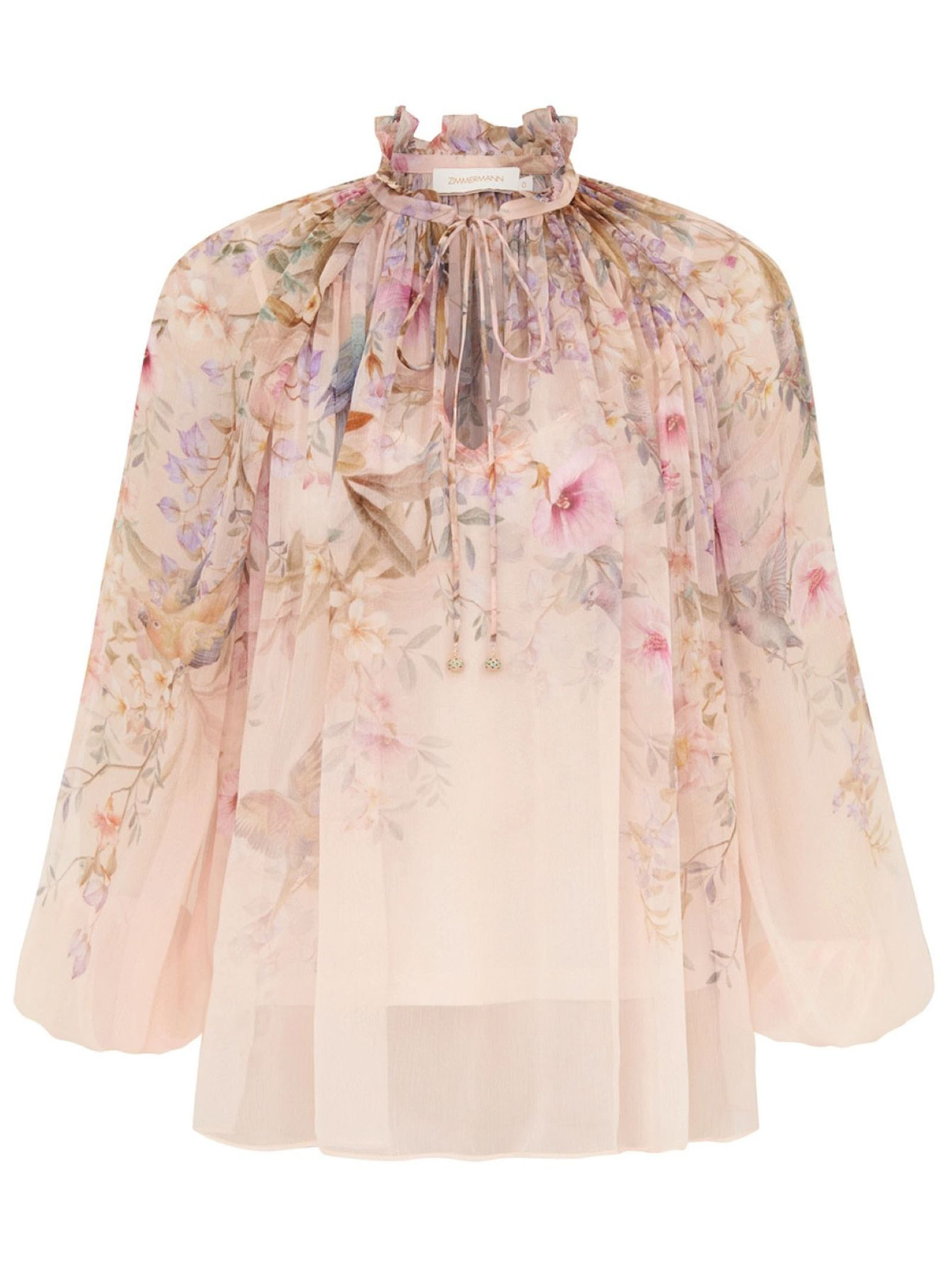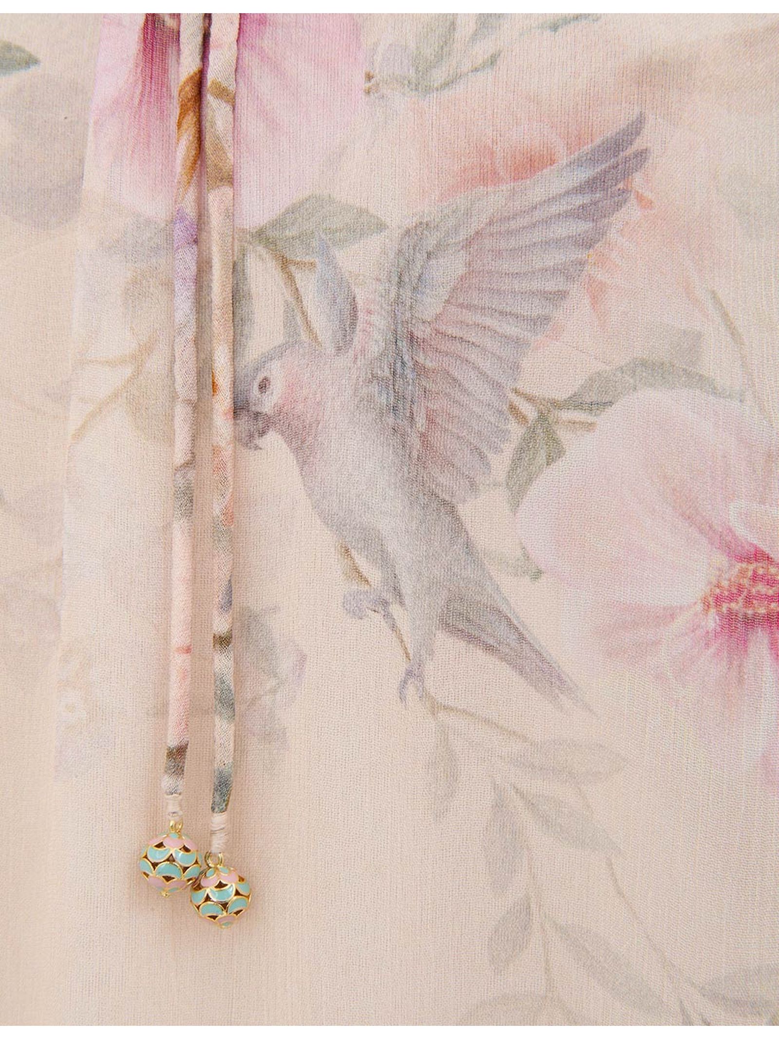 Rebellion Billow Blouse in Cream Aviary, Relaxed blouse, Self rouleau tie at neckline with frill collar, Blouson sleeves with elasticated cuffs, Heavily gathered, Comes with a separate cami, 100% viscose; slip: 86% recycled polyester, 14% elastane