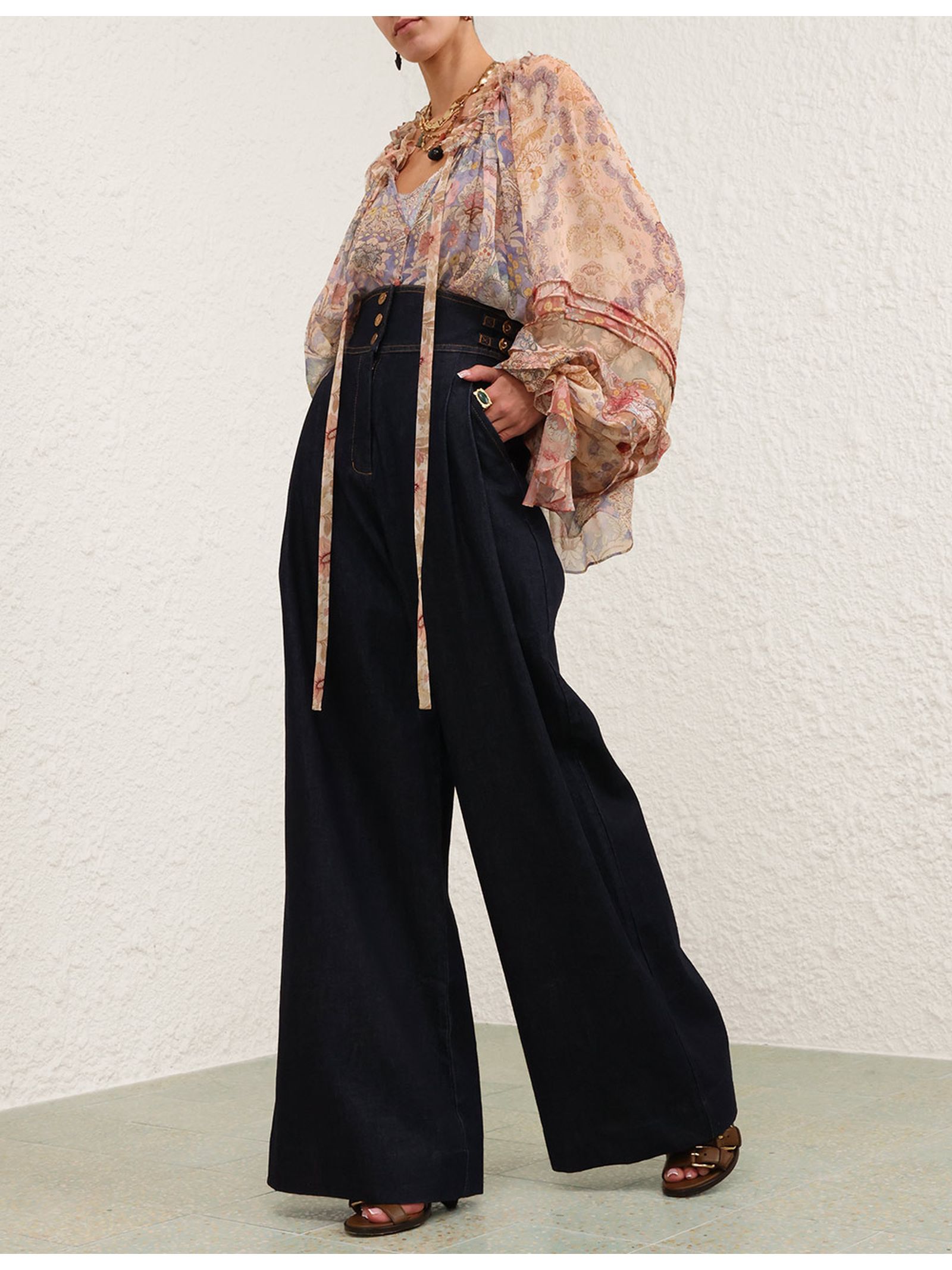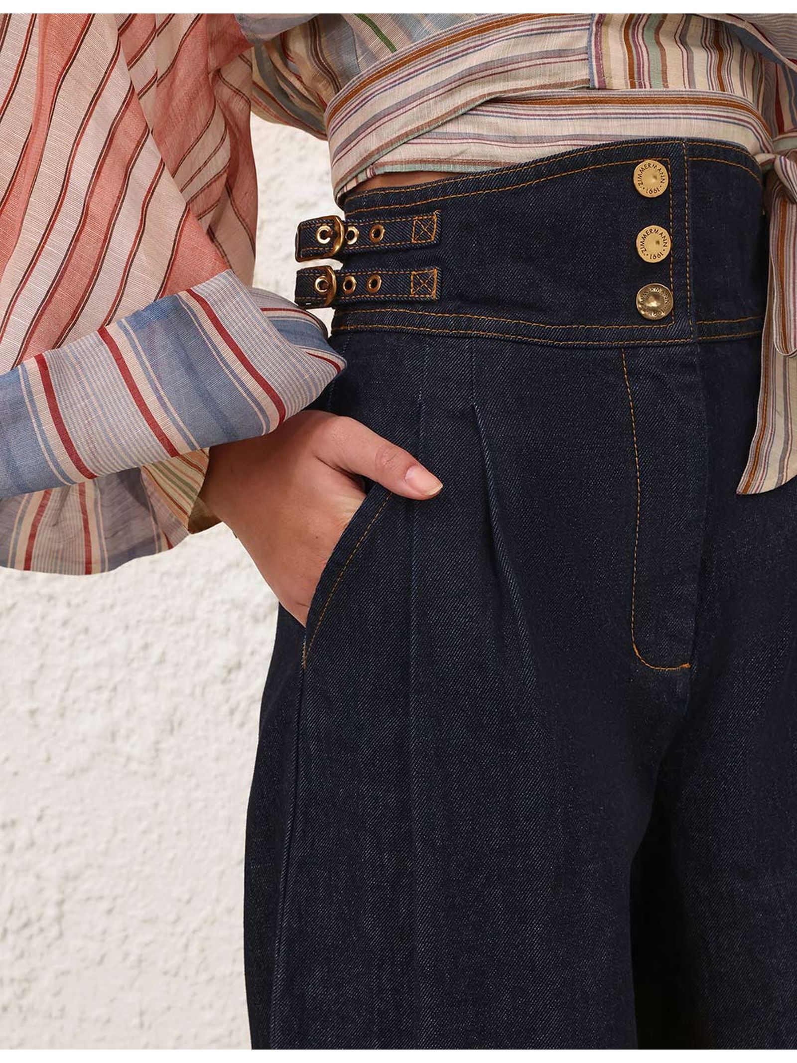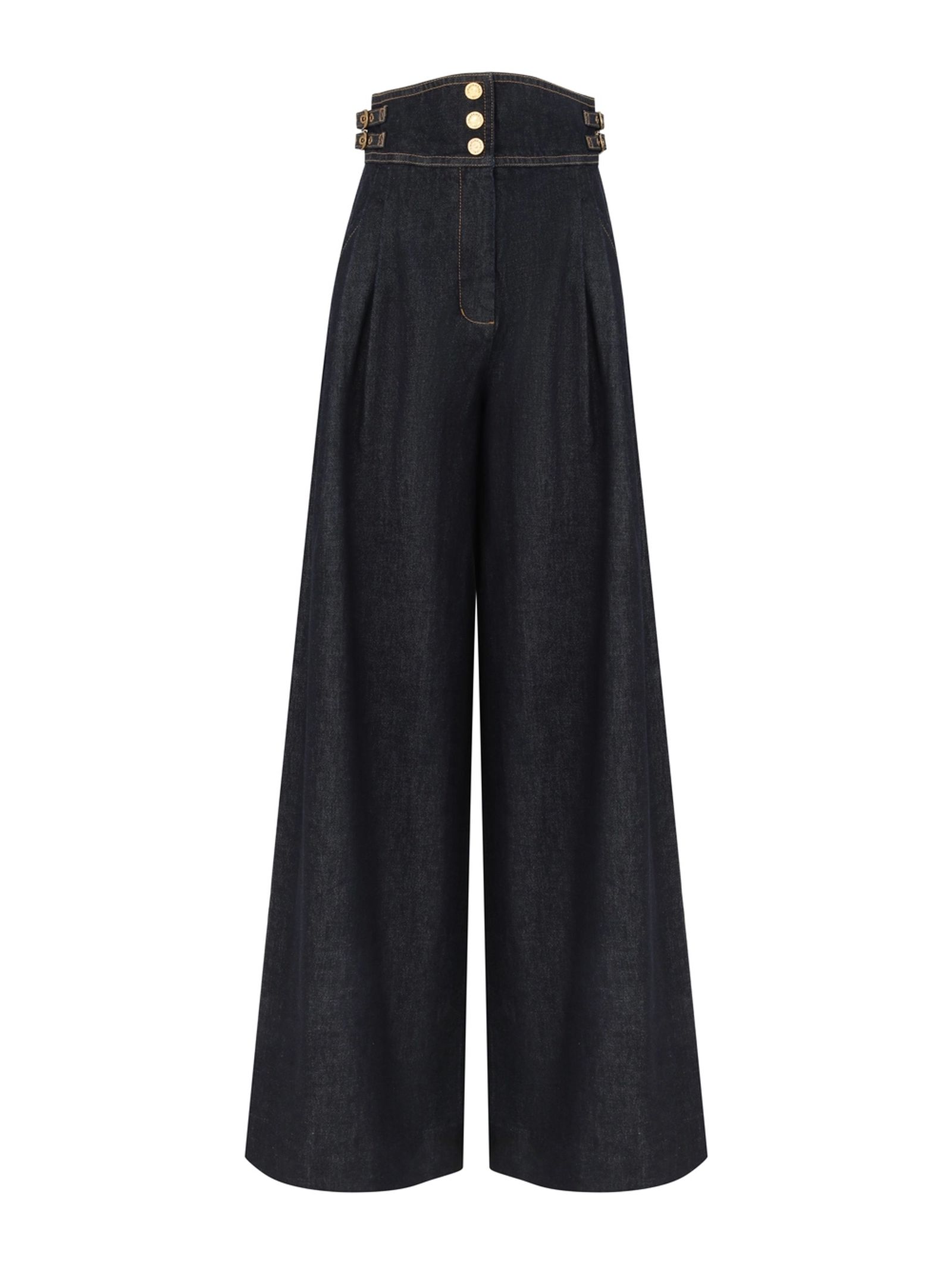 Rebellion Denim Tailored Pant in Night Sky featuring gold buttons down the centre front, topstitching throughout and side pockets, finished with a flared hem, High-rise waist with buckle tabs, Centre front fly closure with gold buttons, Pintucks through centre front legs