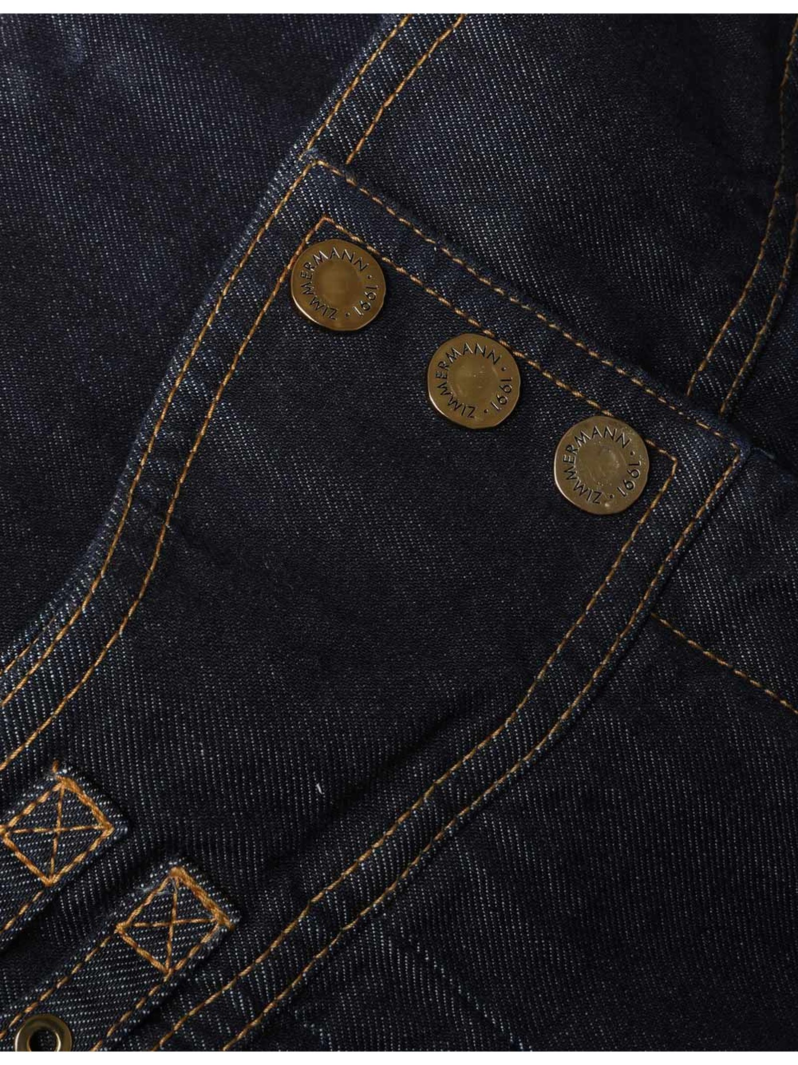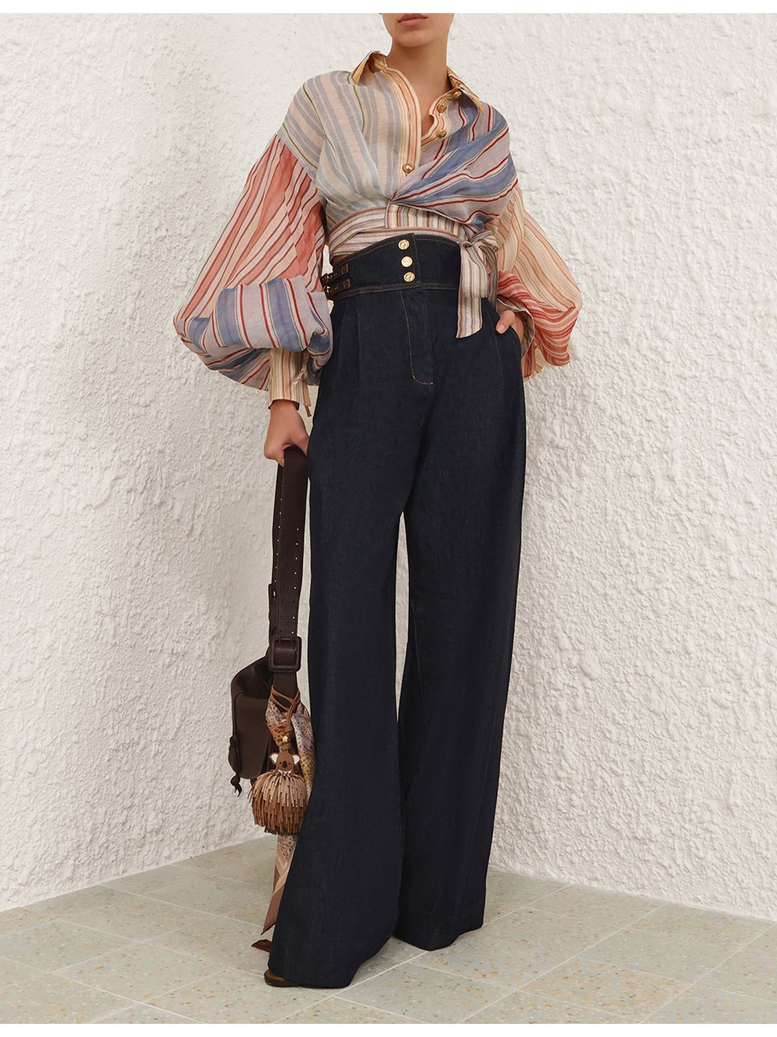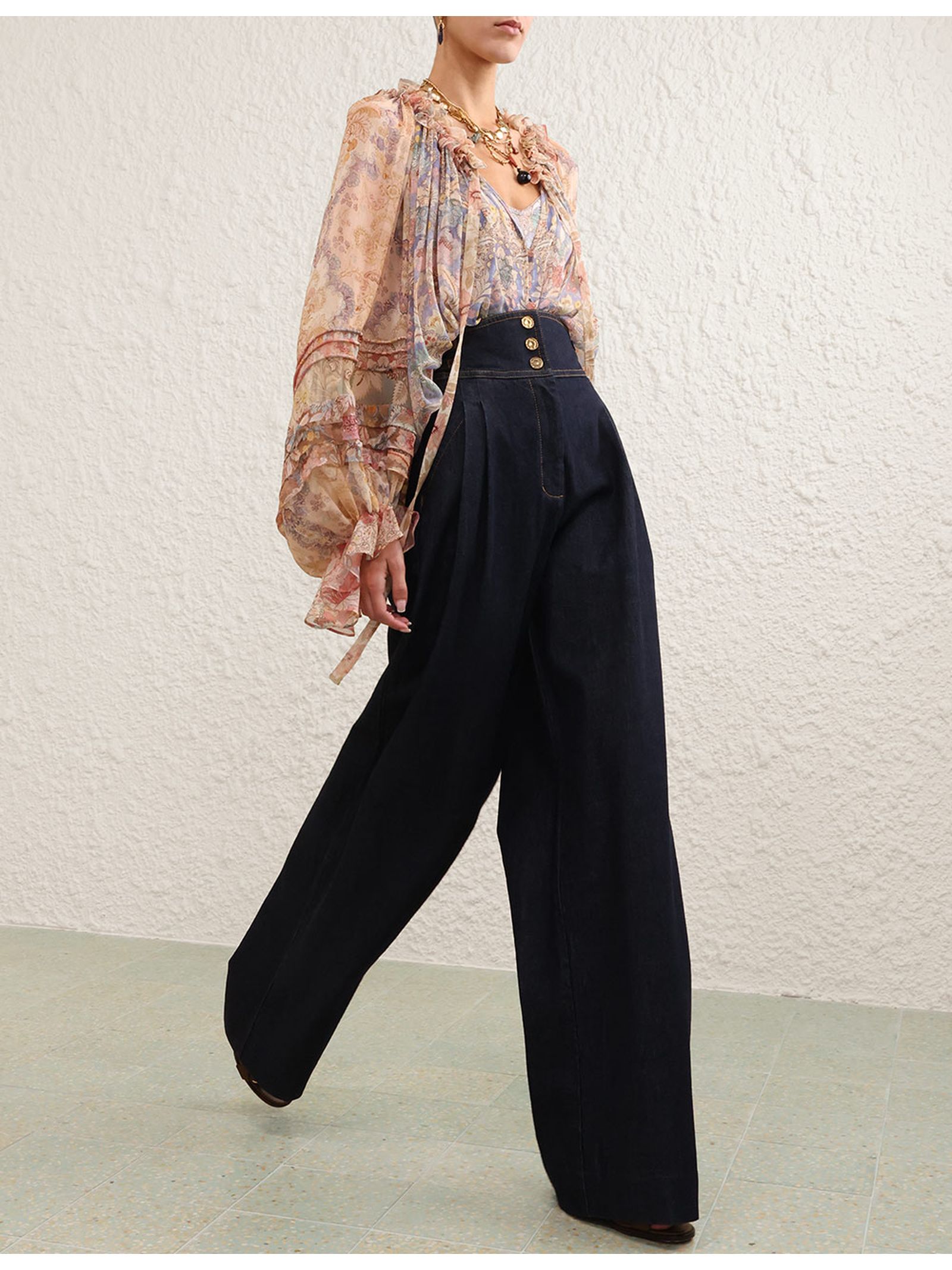 Rebellion Denim Tailored Pant in Night Sky featuring gold buttons down the centre front, topstitching throughout and side pockets, finished with a flared hem, High-rise waist with buckle tabs, Centre front fly closure with gold buttons, Pintucks through centre front legs