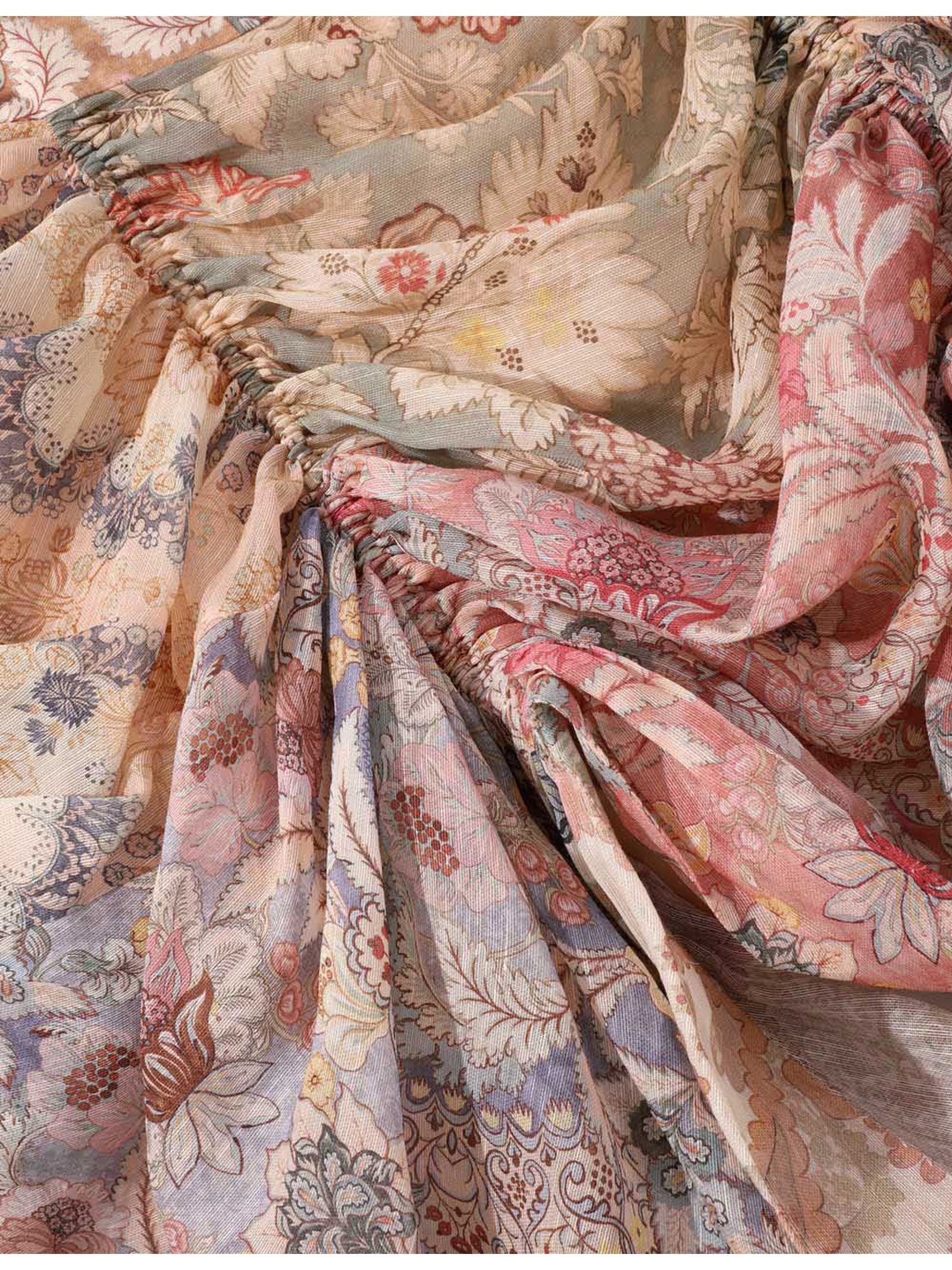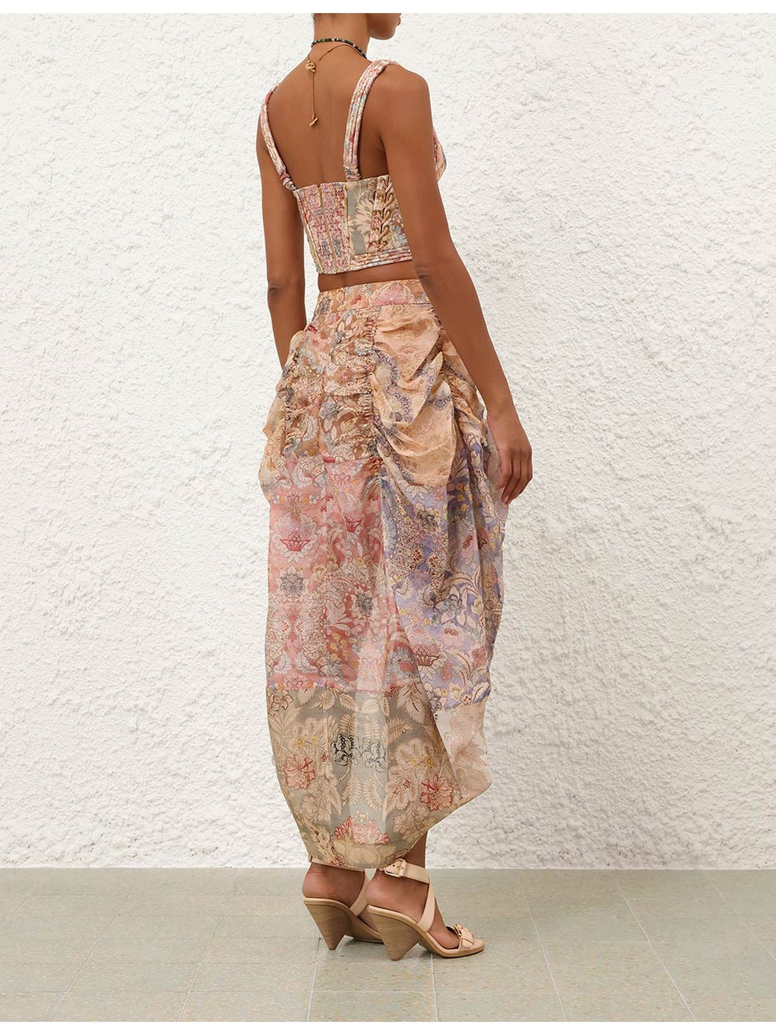 Rebellion Draped Midi Skirt in Spliced Floral, Silk-linen blend fabric, Mid-rise waist with high-low hem, Invisible zip closure at centre back, Ruched gathering at centre front and back