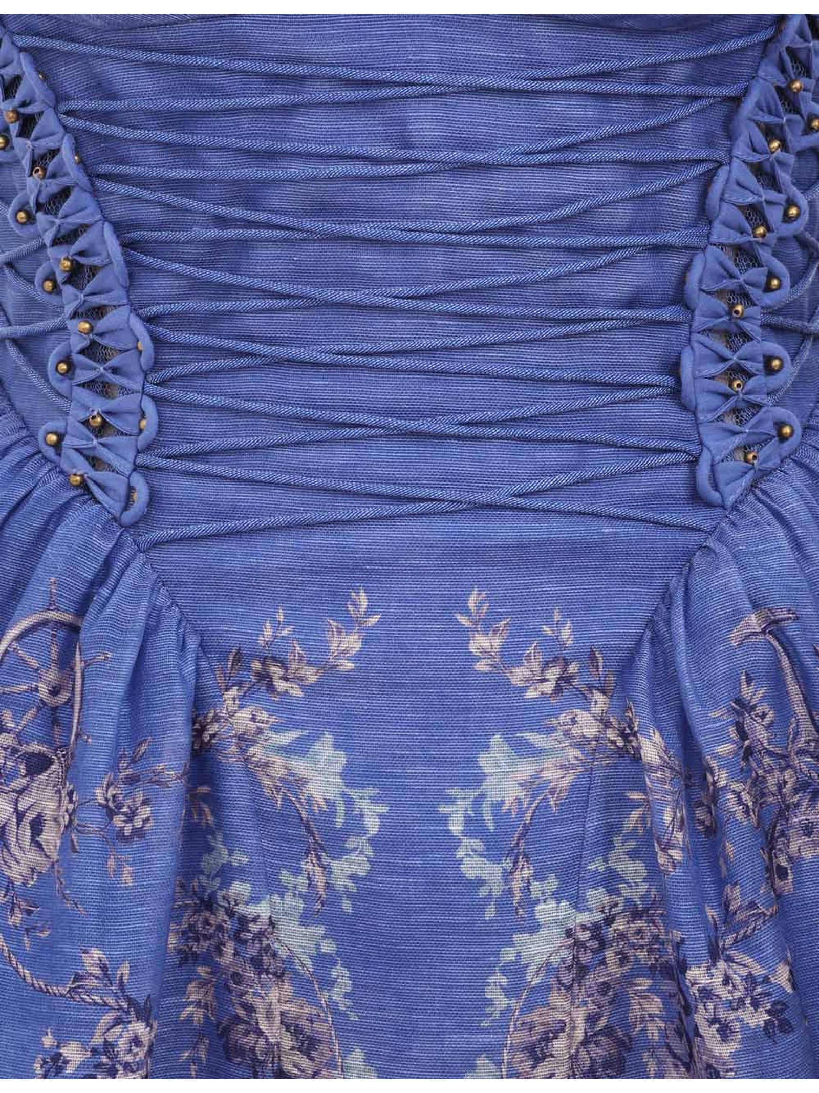 Rebellion Mermaid Picnic Dress in Blue Mermaid, Silk-linen blend fabric, Bust with internal boning, Rouleau lace up bodice with panels, Shirred elastic across back, Invisible centre back zip closure, Skirt has tulle underlayer, Rouleau beaded trim, 55% linen, 45% silk; lining: 100% cotton; crinoline: 100% polyester