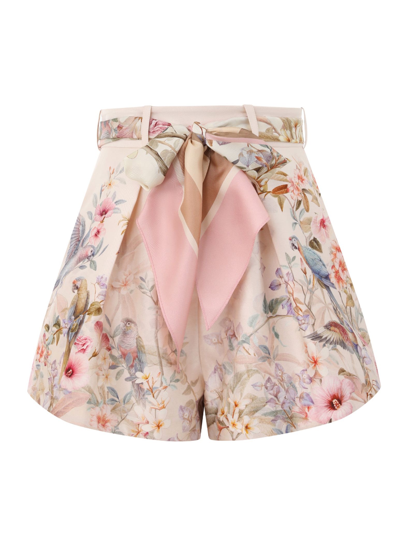 Rebellion Tuck Short in Cream Aviary, Silk-cotton blend short, Fixed waist with belt loops, Removable scarf belt, Invisible centre back zip closure, Side seam pockets, Deep tucks at centre front, Placement printed, Fully lined, 53% silk, 47% cotton; lining: 100% viscose; belt: 100% silk