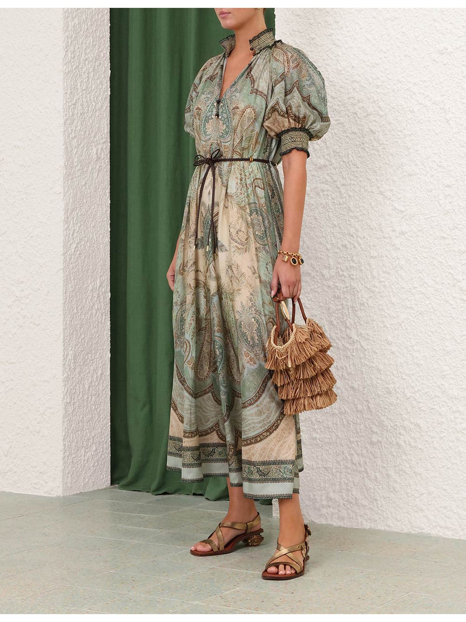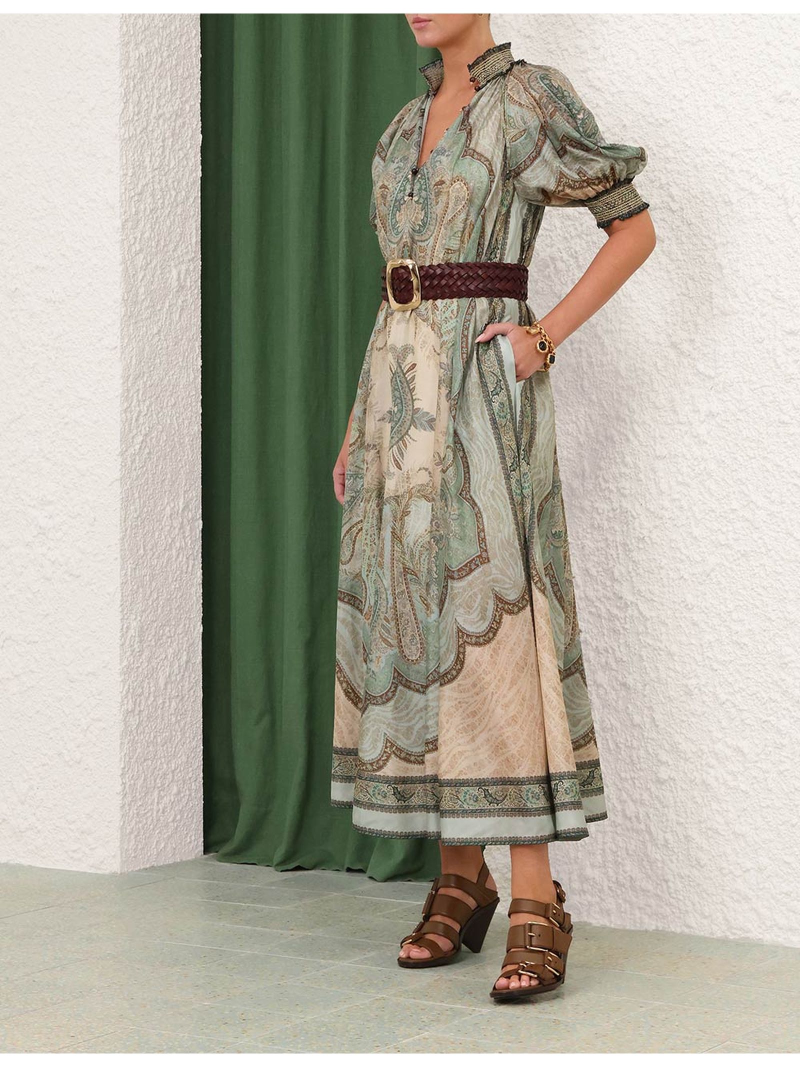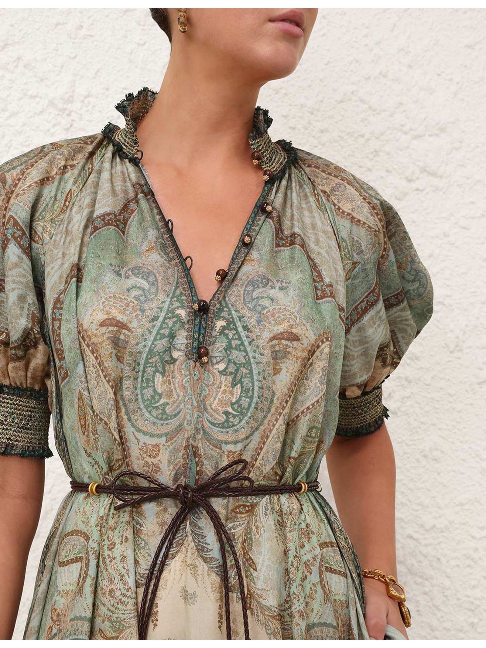 Wanderlust Billow Dress in Tapestry Teal Multi, Silk habutae fabric, Shirred neck and cuffs, Short billow sleeves, Rouleau buttons down the centre front, Removable rope waist belt with beads, Placement printed, Comes with a separate slip