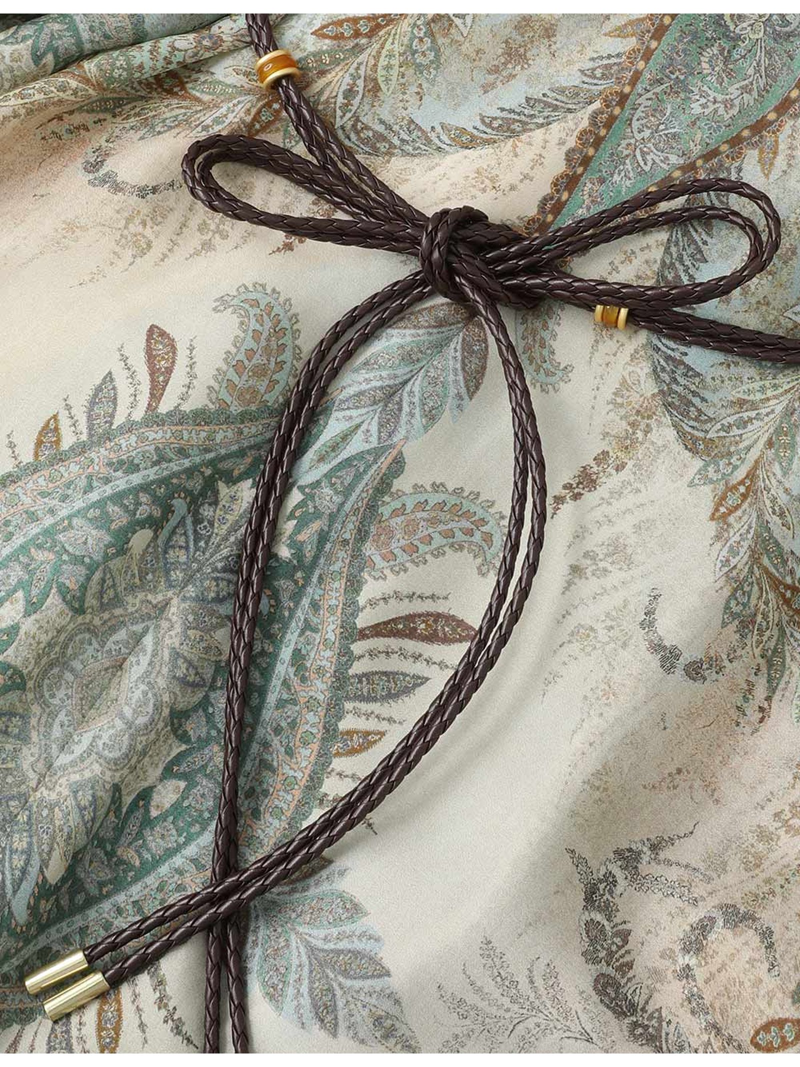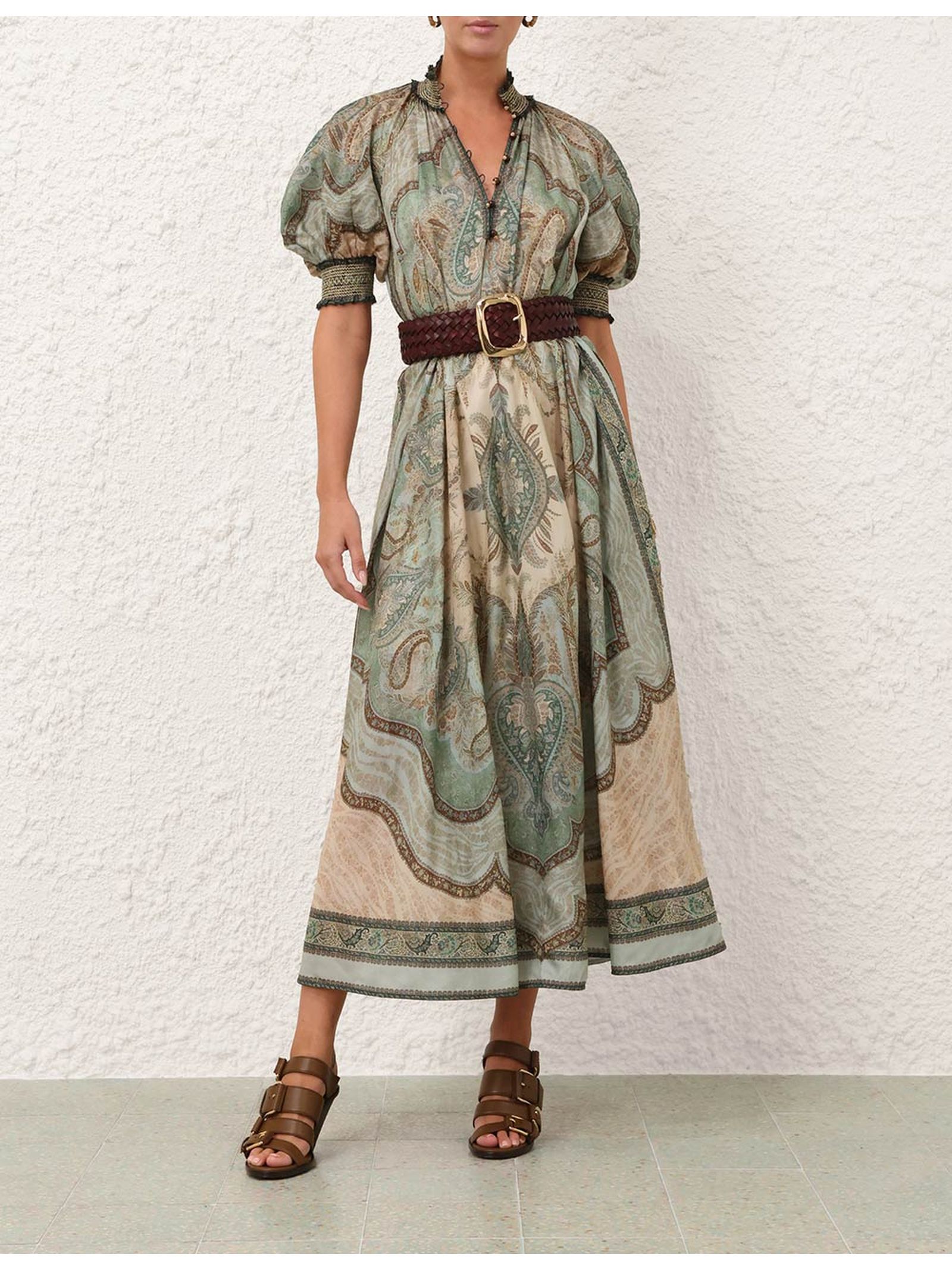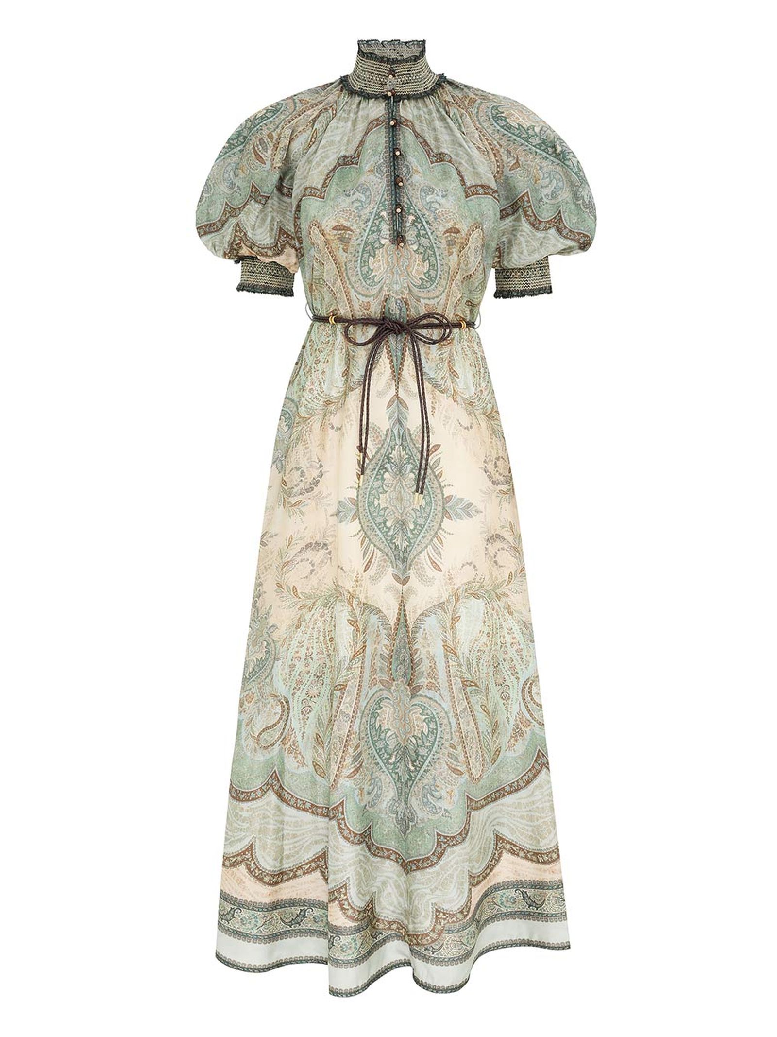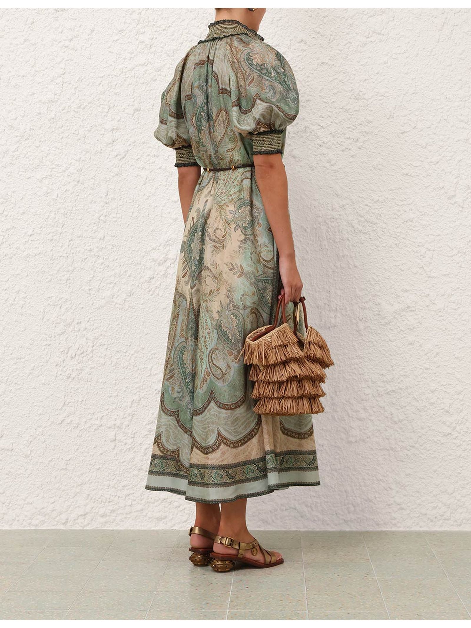 Wanderlust Billow Dress in Tapestry Teal Multi, Silk habutae fabric, Shirred neck and cuffs, Short billow sleeves, Rouleau buttons down the centre front, Removable rope waist belt with beads, Placement printed, Comes with a separate slip