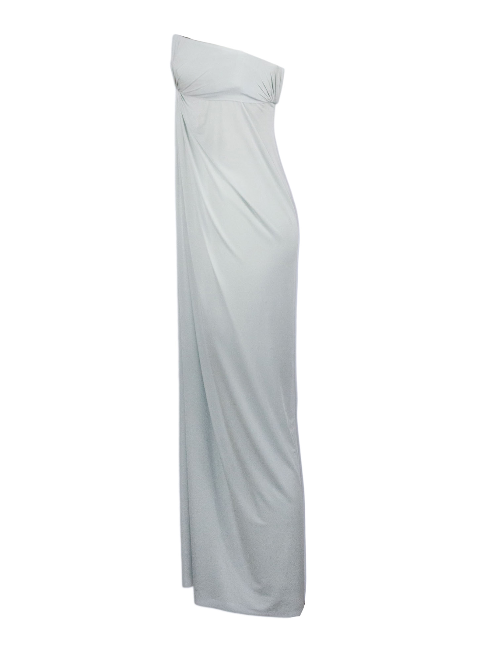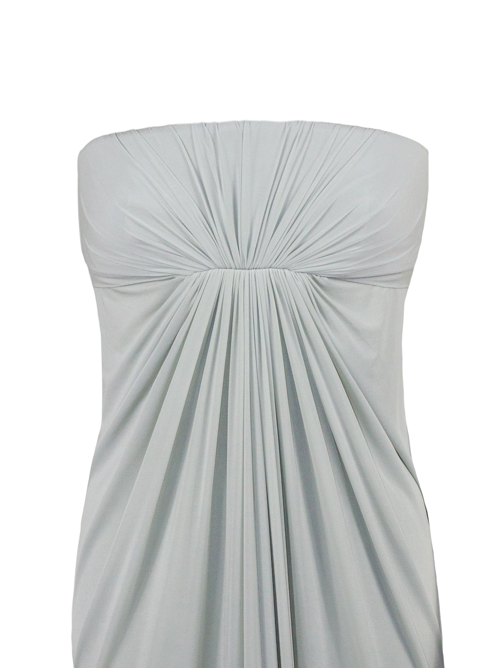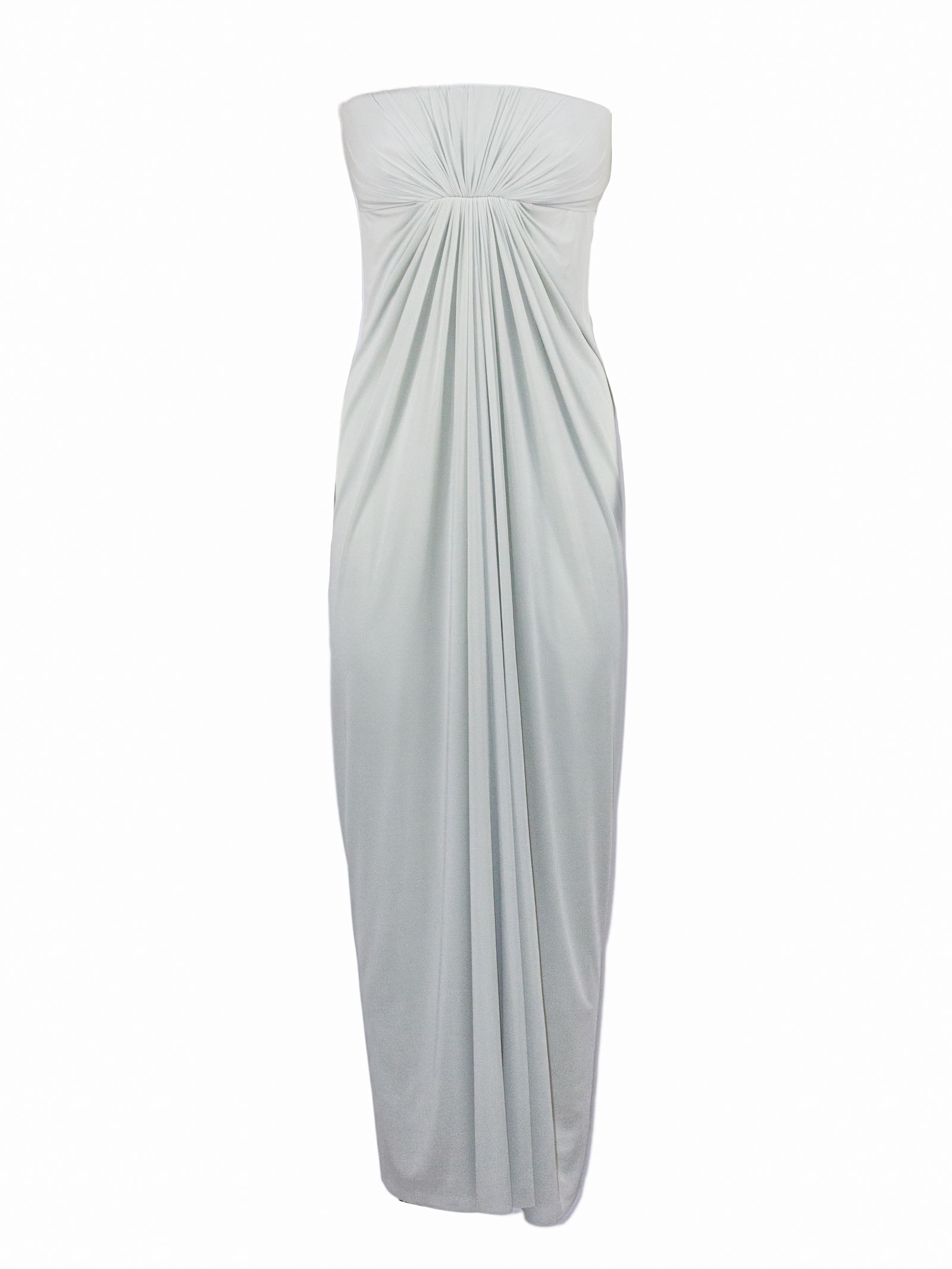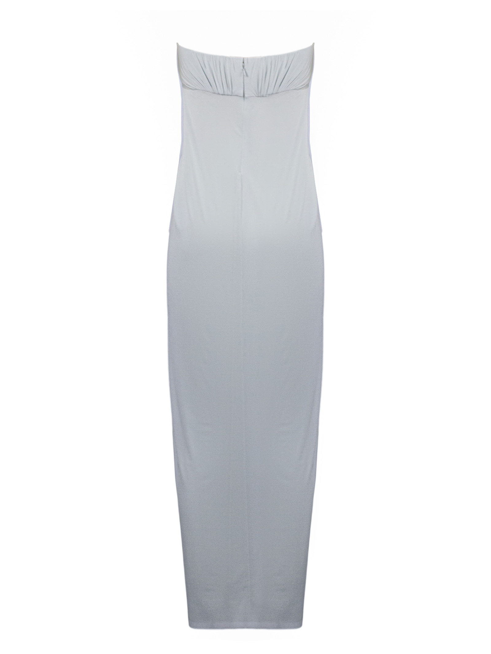 Abito lungo senza spalline in viscosa ed elastan, caratterizzato da un elegante drappeggio frontale che valorizza la silhouette, linea fluida e aderente, con tessuto morbido e stretch