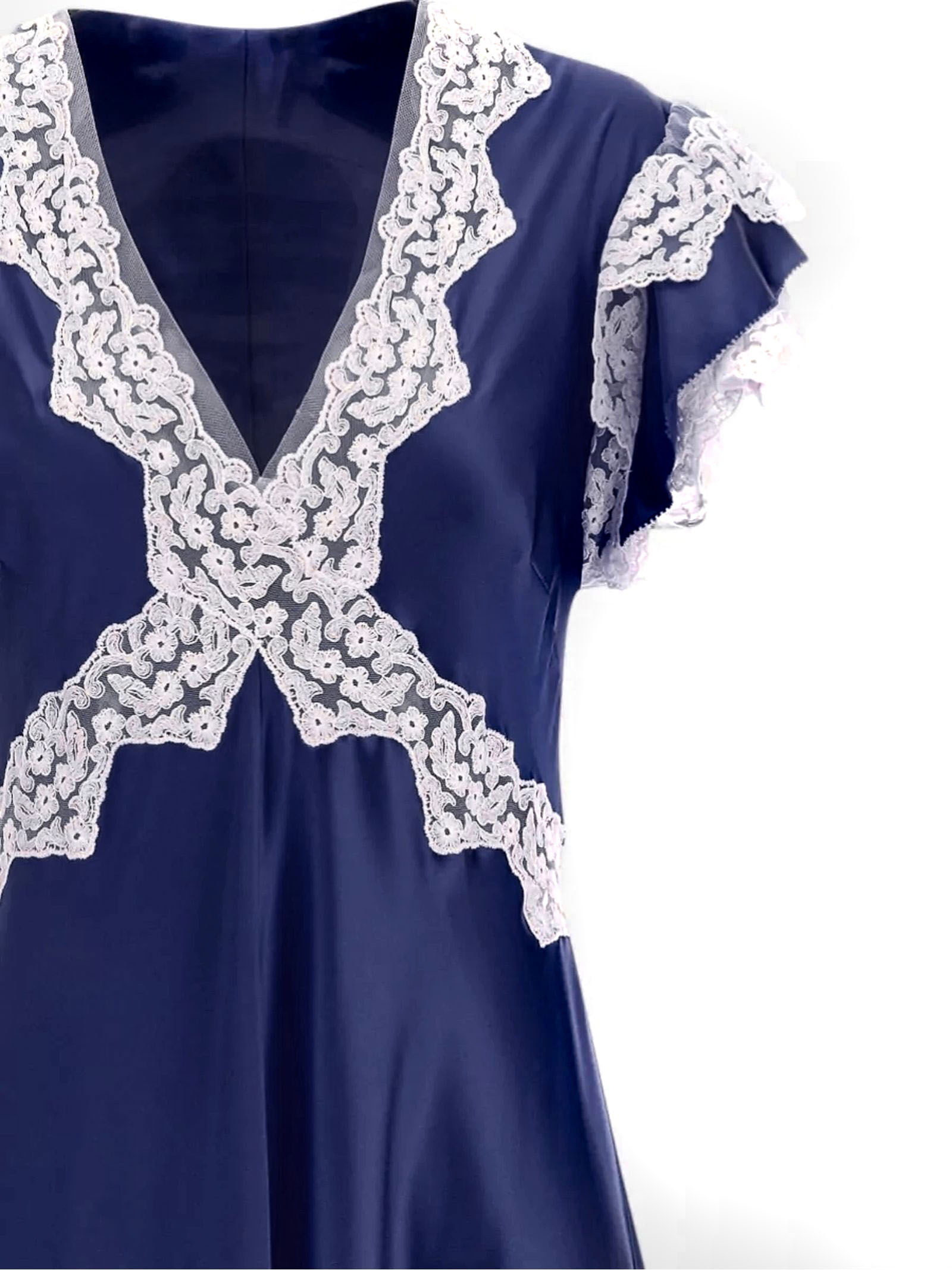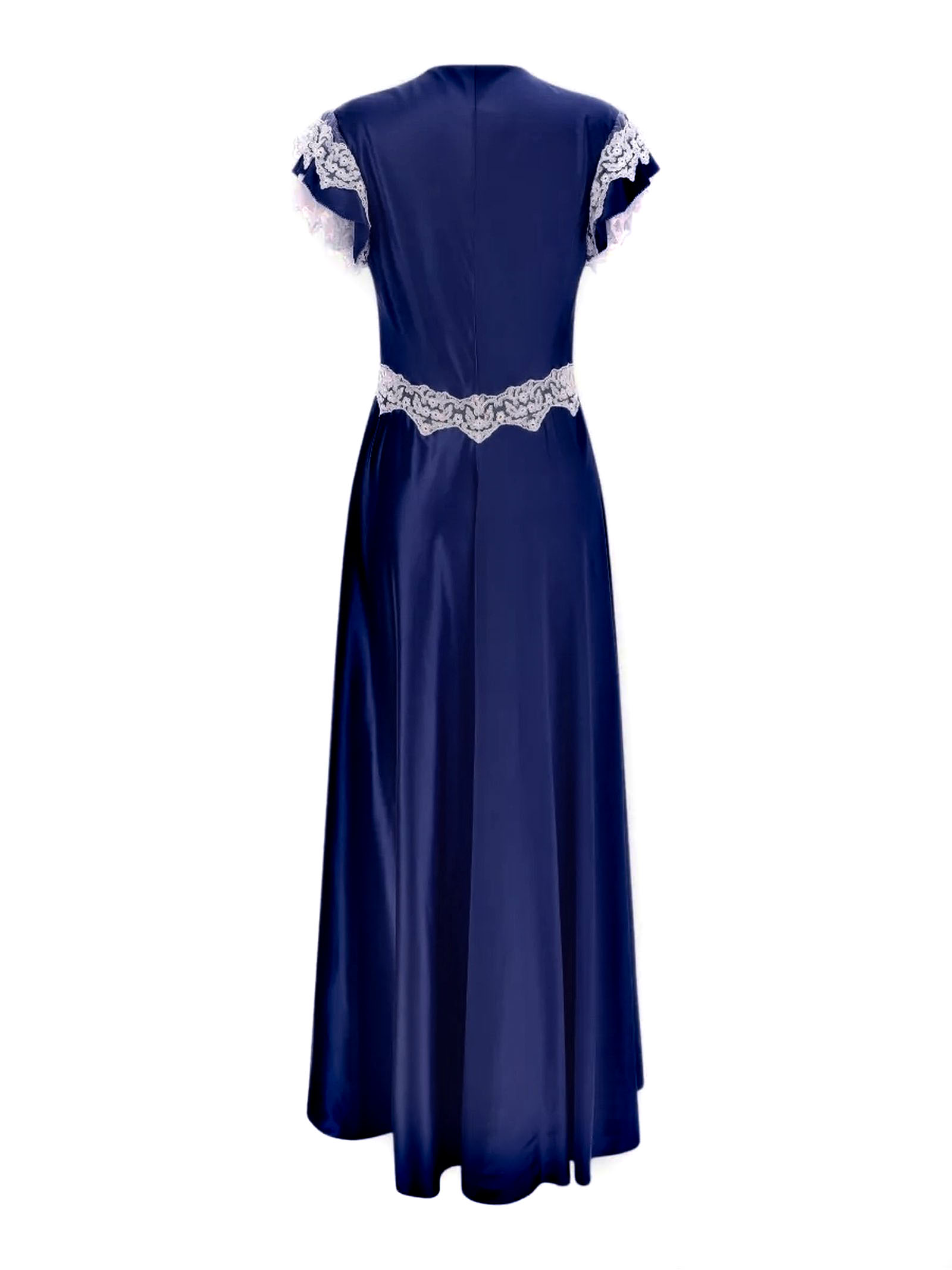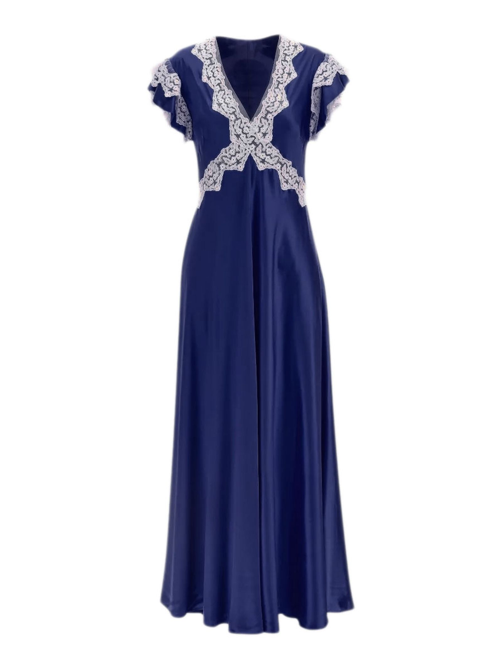 Abito lungo in raso blu, scollo a V, maniche corte, orlo svasato, finitura satinata, dettagli in pizzo