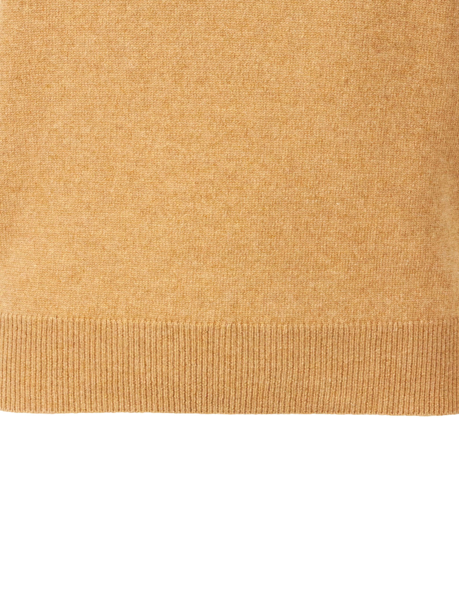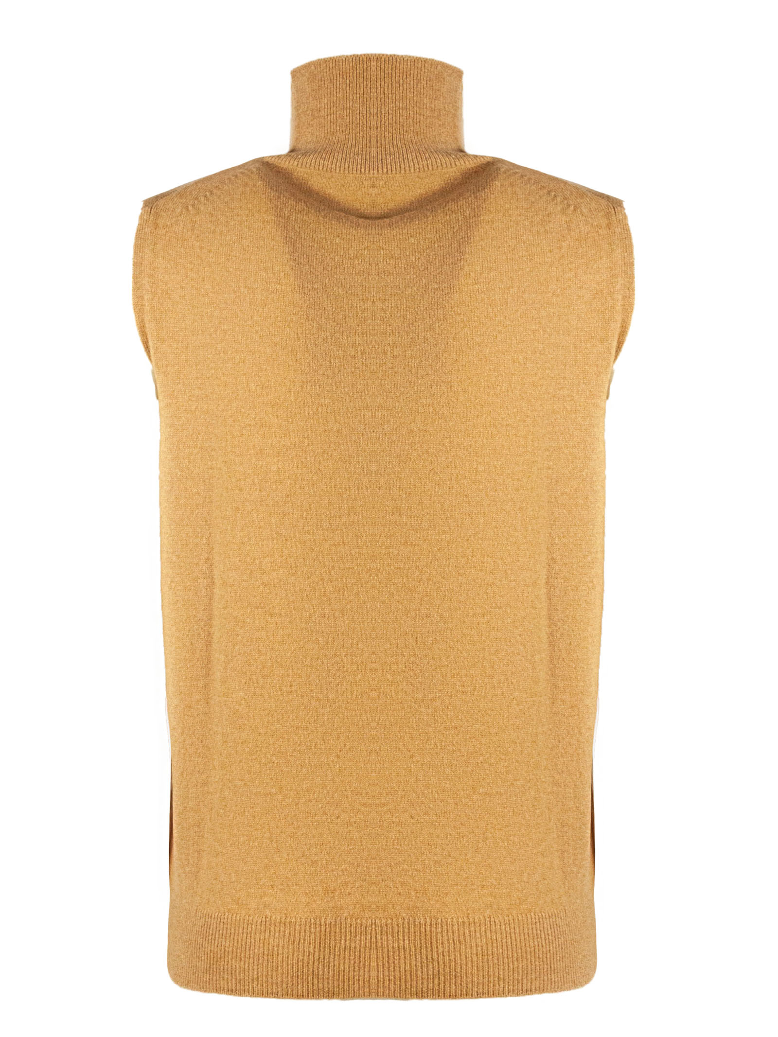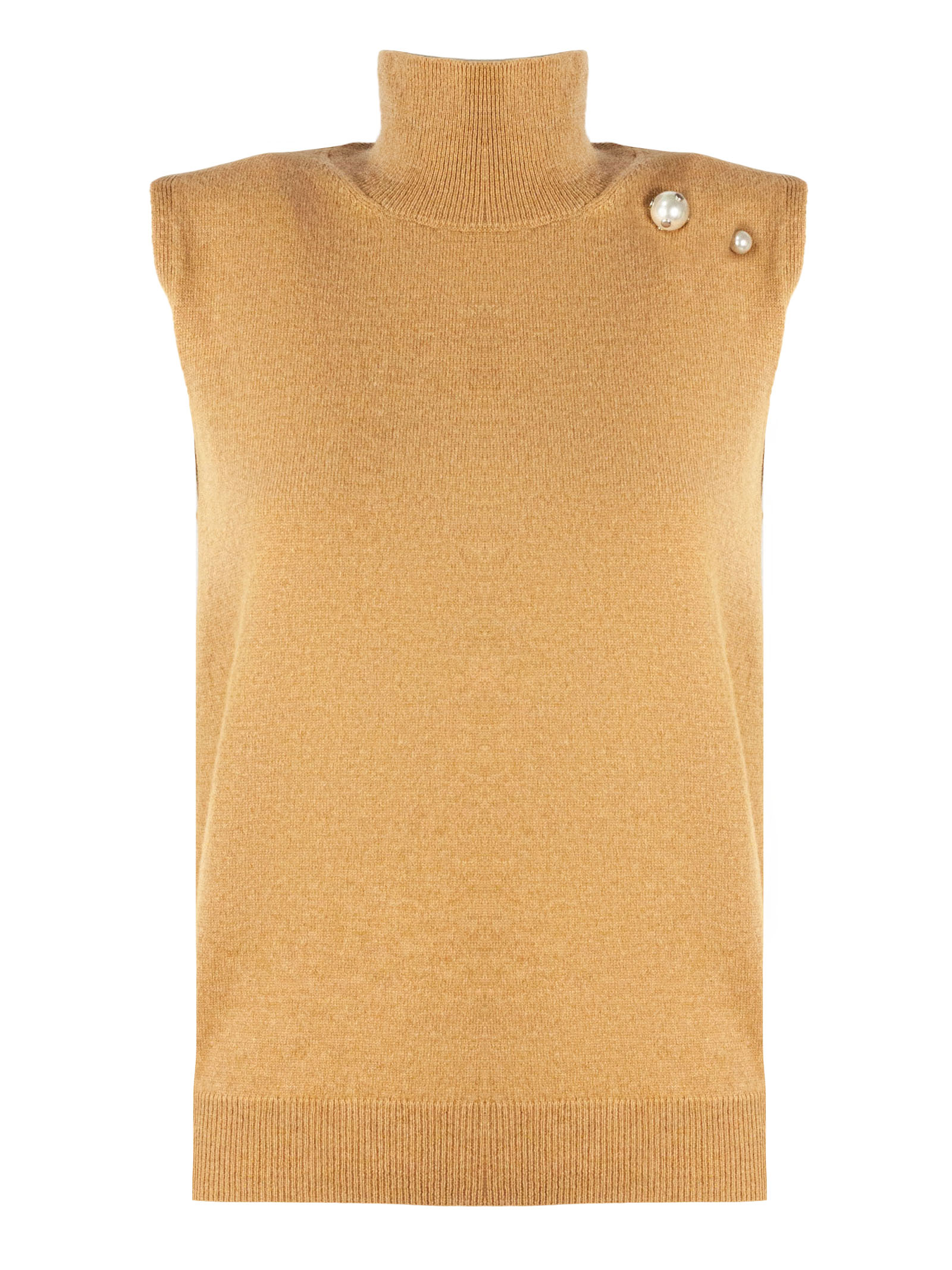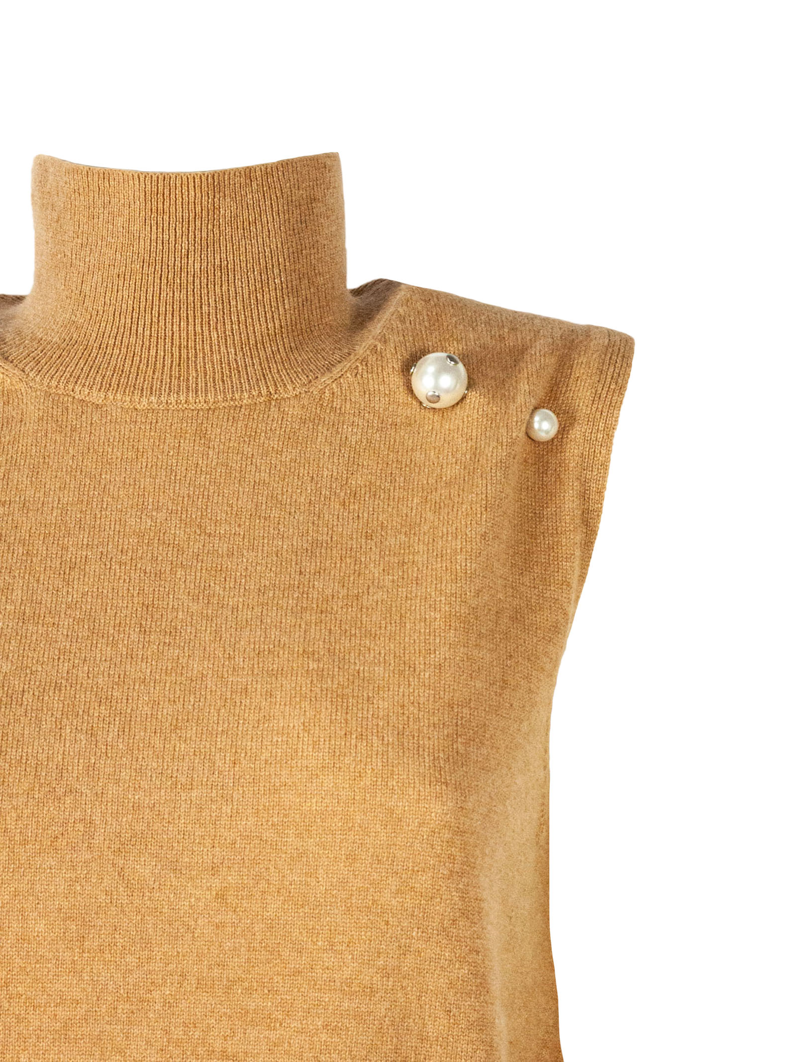 Maglione in cashmere color cammello, collo alto, dettagli impreziositi da perle, senza maniche, lavorazione a maglia, orlo a costine.