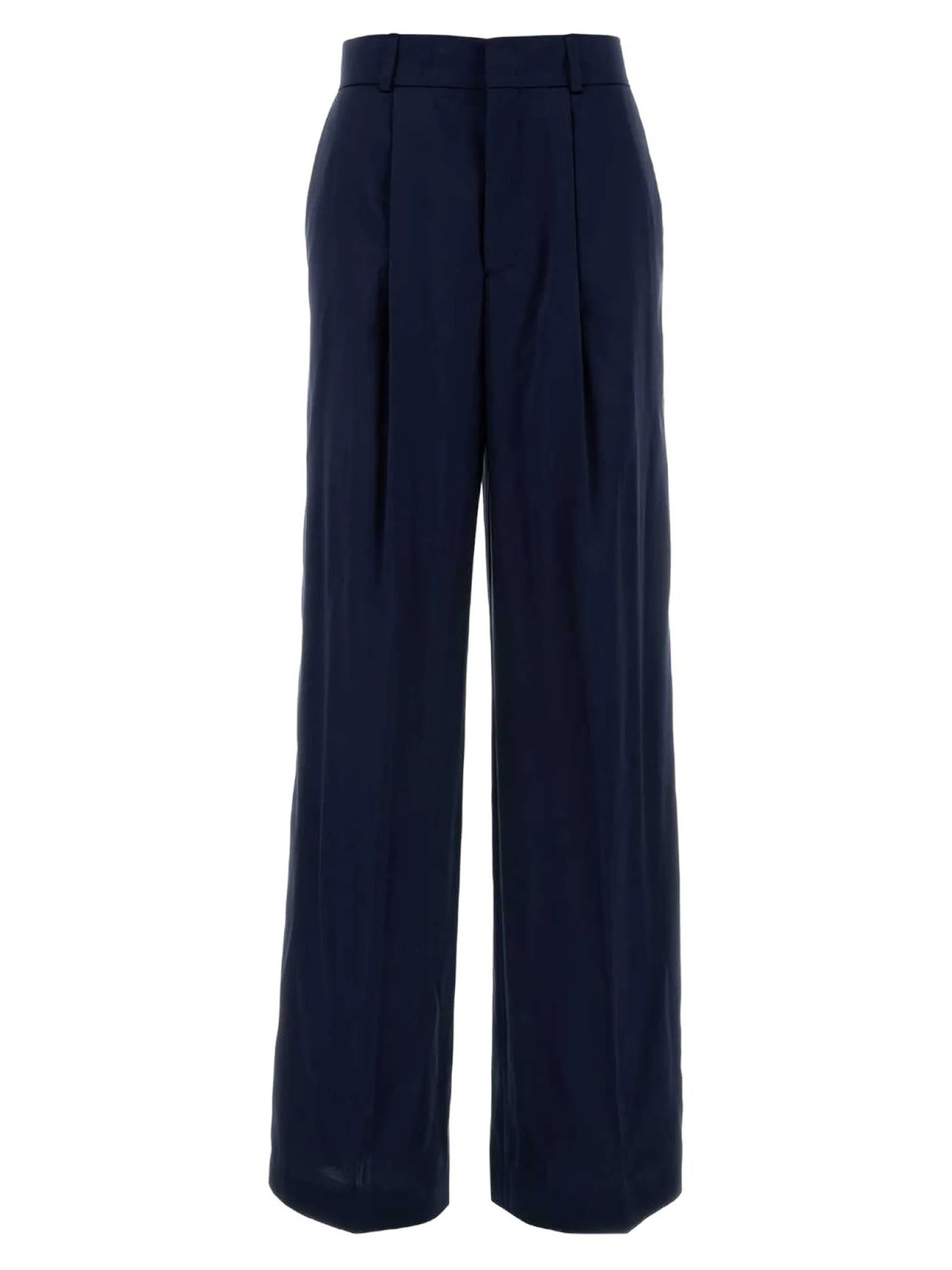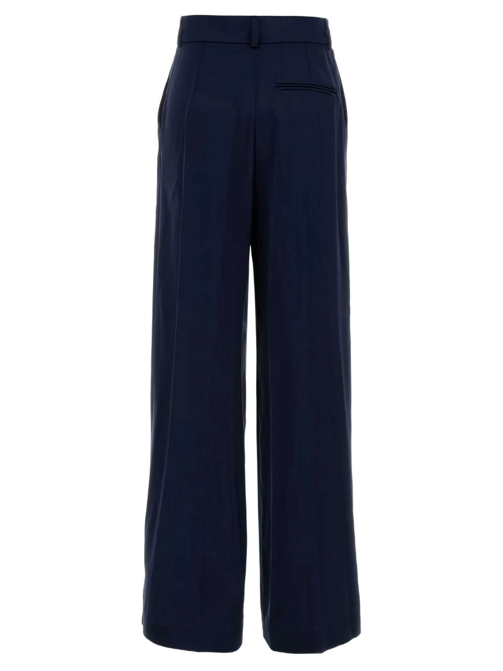 Pantalone Gamba Ampia In Raso Blu, Passanti In Vita Per La Cintura, Chiusura Mediante Zip E Gancetti A Scomparsa, Tasche All'americana E Una Tasca A Fessura Sul Retro, Pieghe Invertite