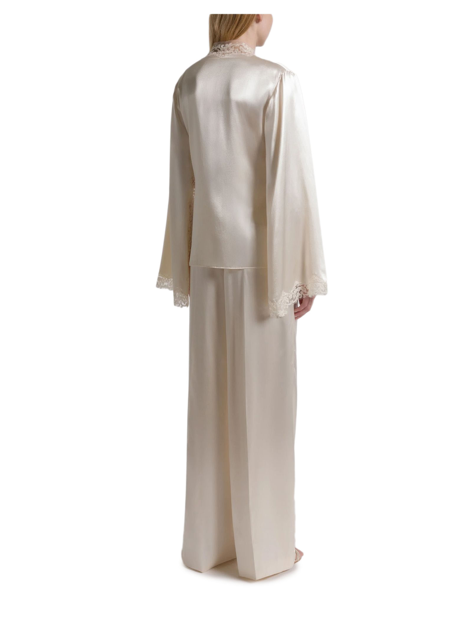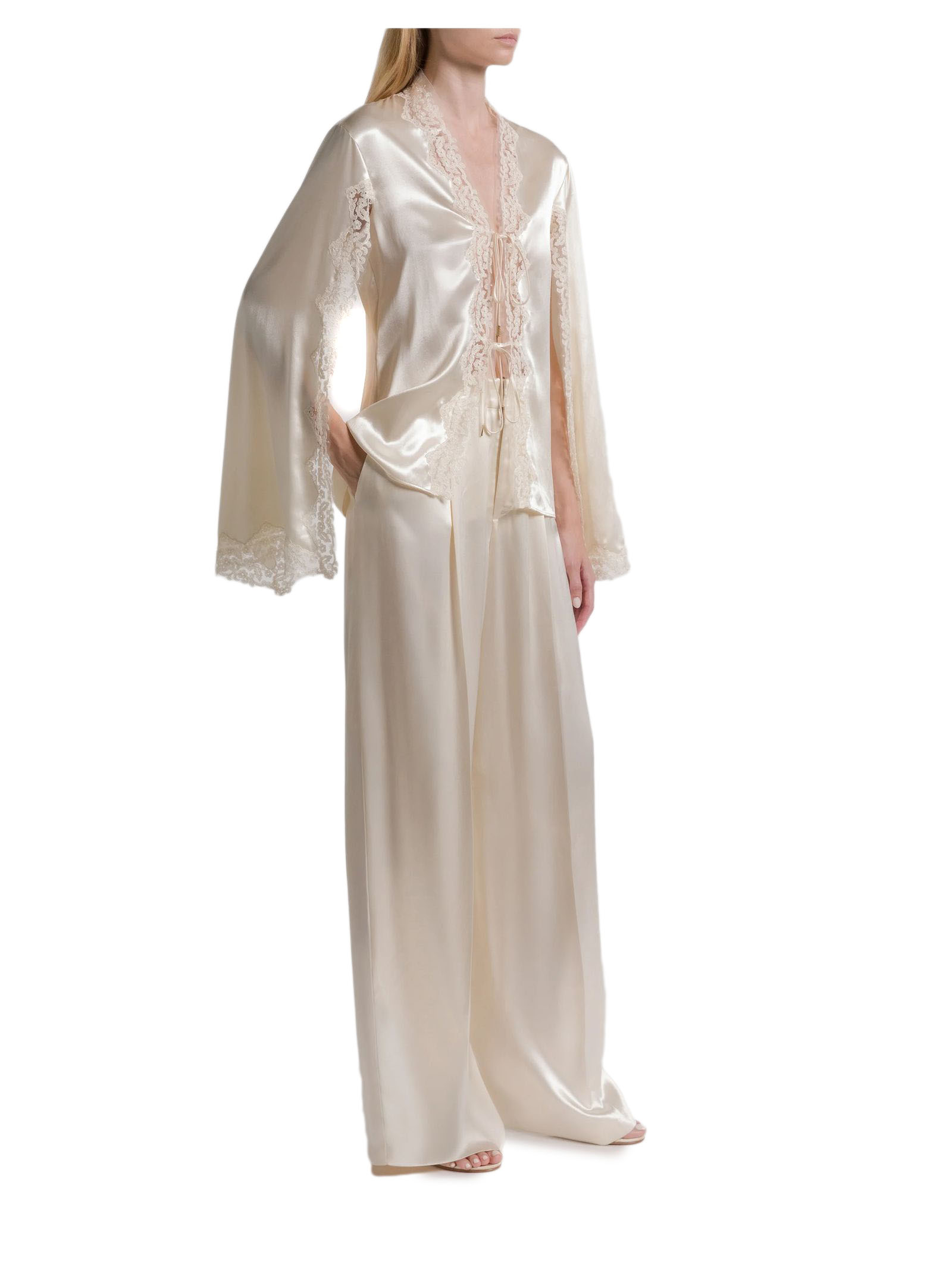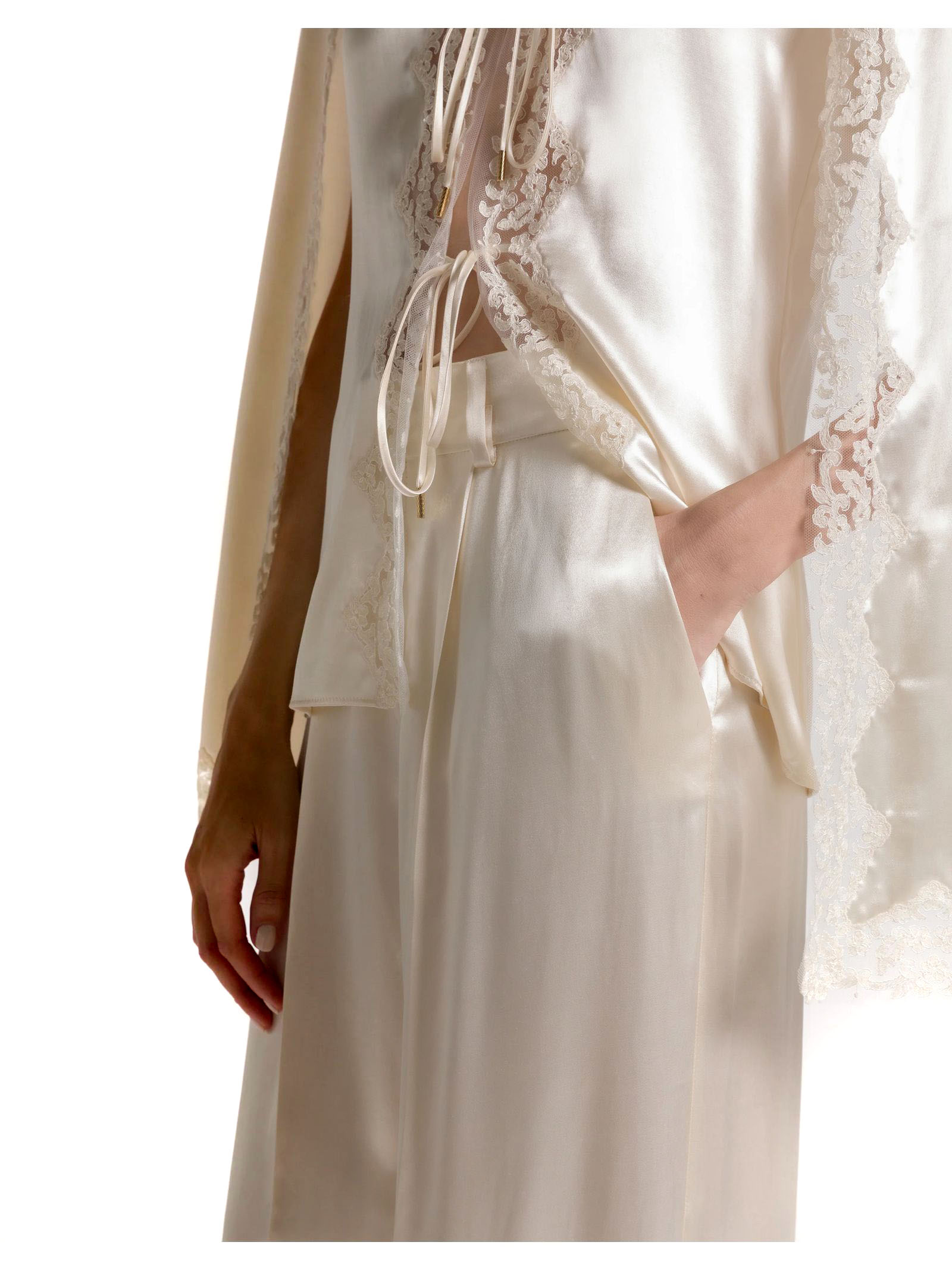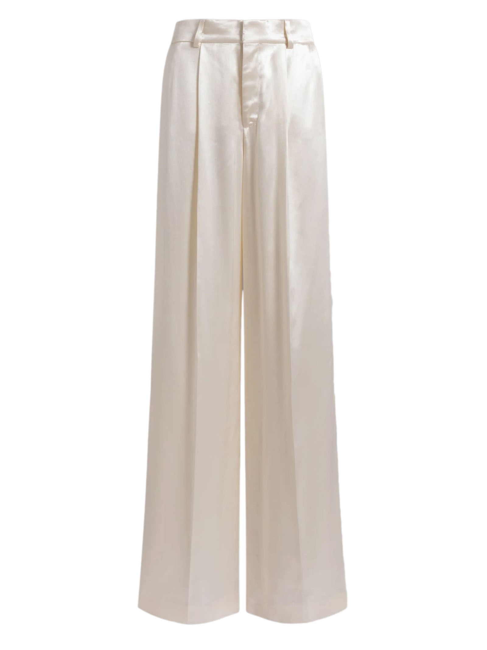 Pantaloni in raso lucido bianco panna, Vita alta, Gamba ampia