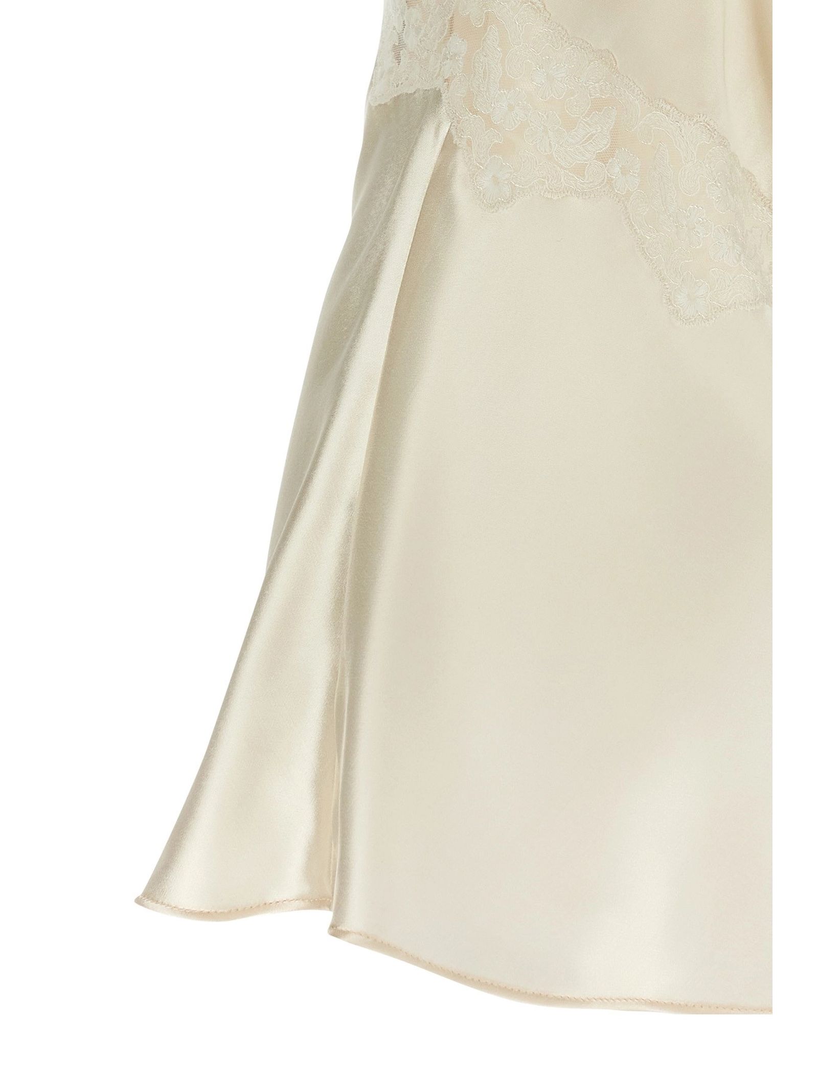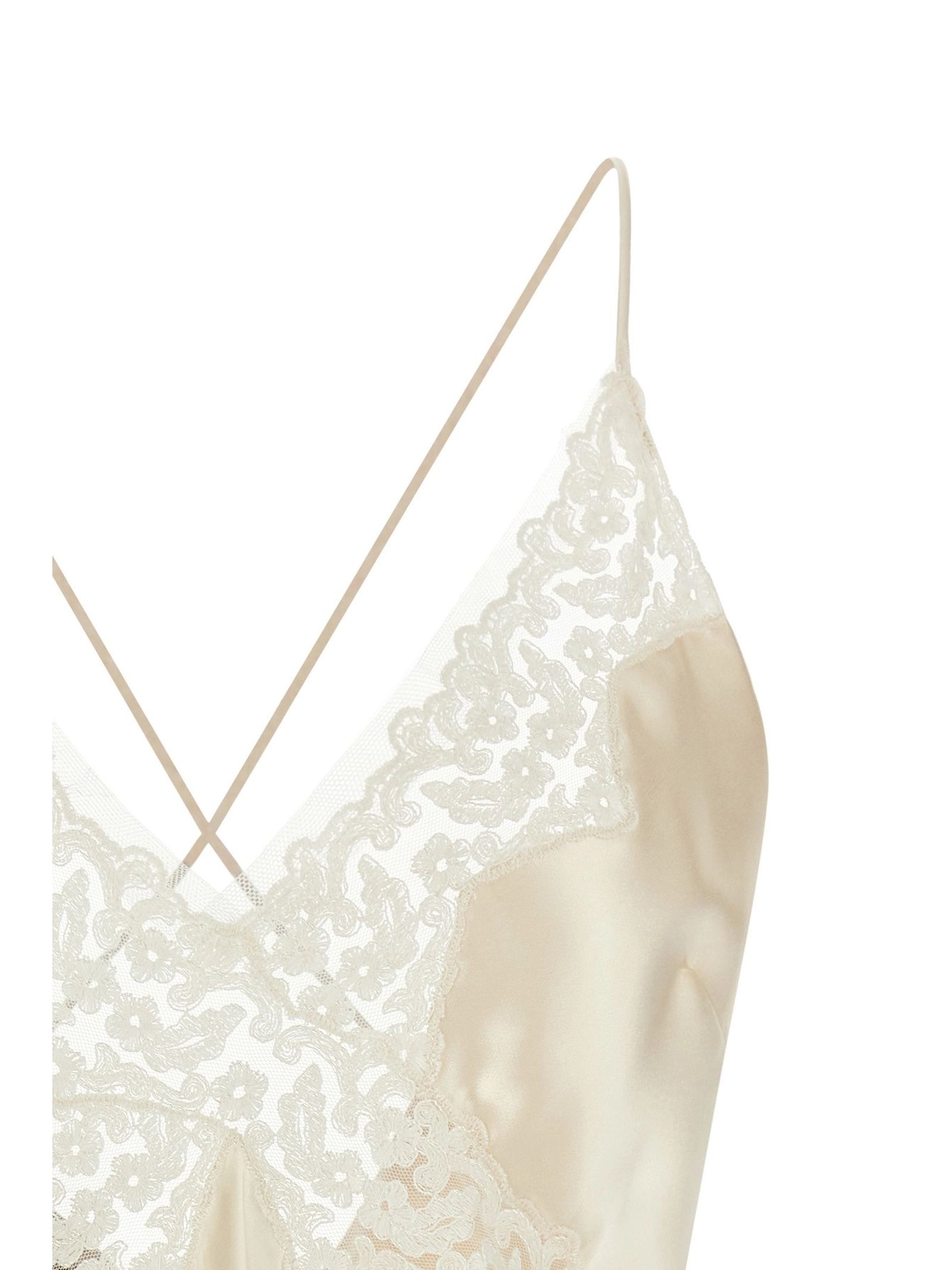 Top in raso bianco panna con spalline sottili, scollo a V, senza maniche, interni in pizzo, dorso aperto