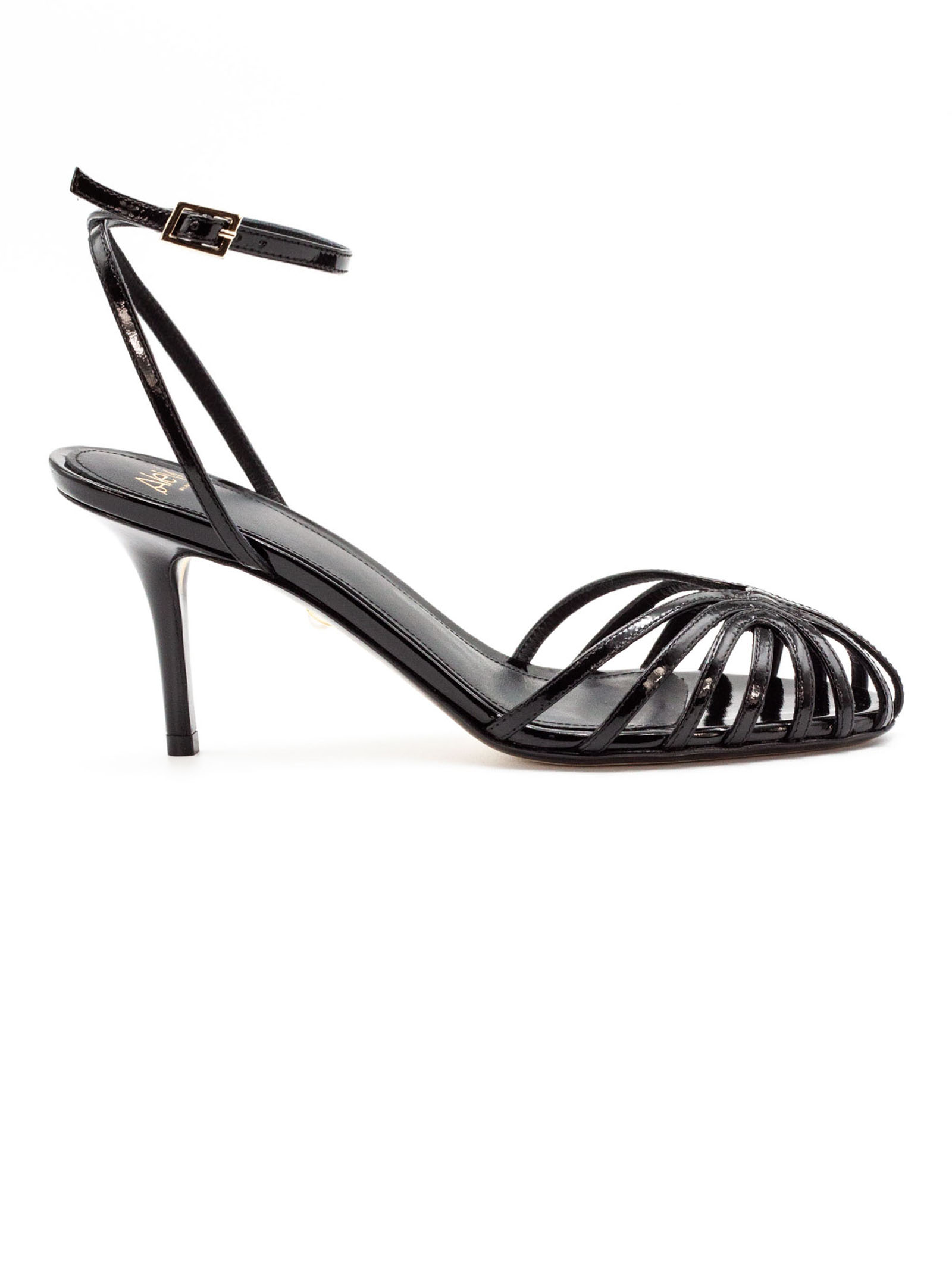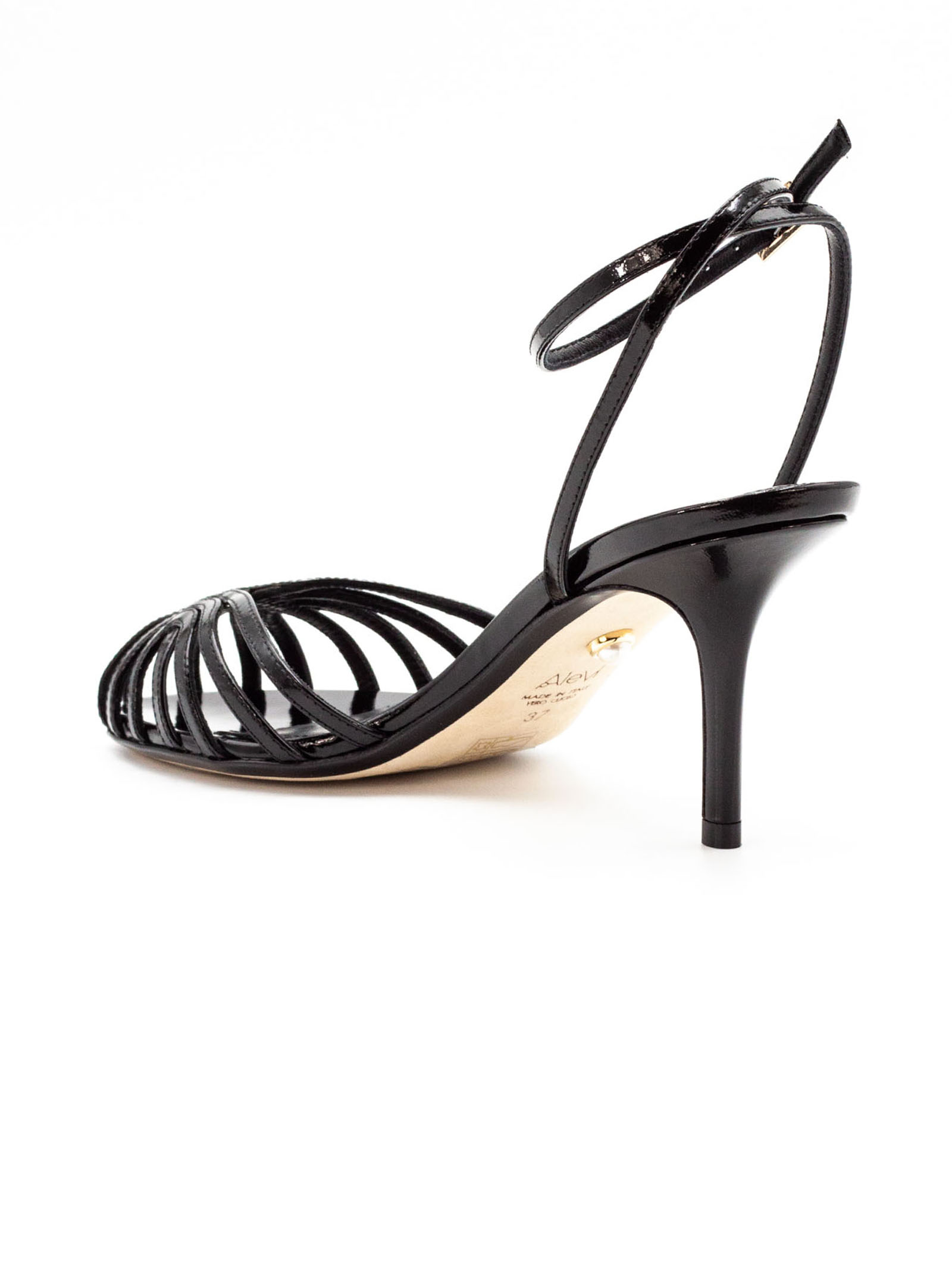 Sandalo Blake 75 Roger Charme Nero, vernice con tacco ricoperto in tono, caratterizzato da listini sottili in punta e cinturino incrociato alla caviglia con piccola fibbia laterale, altezza tacco 75mm