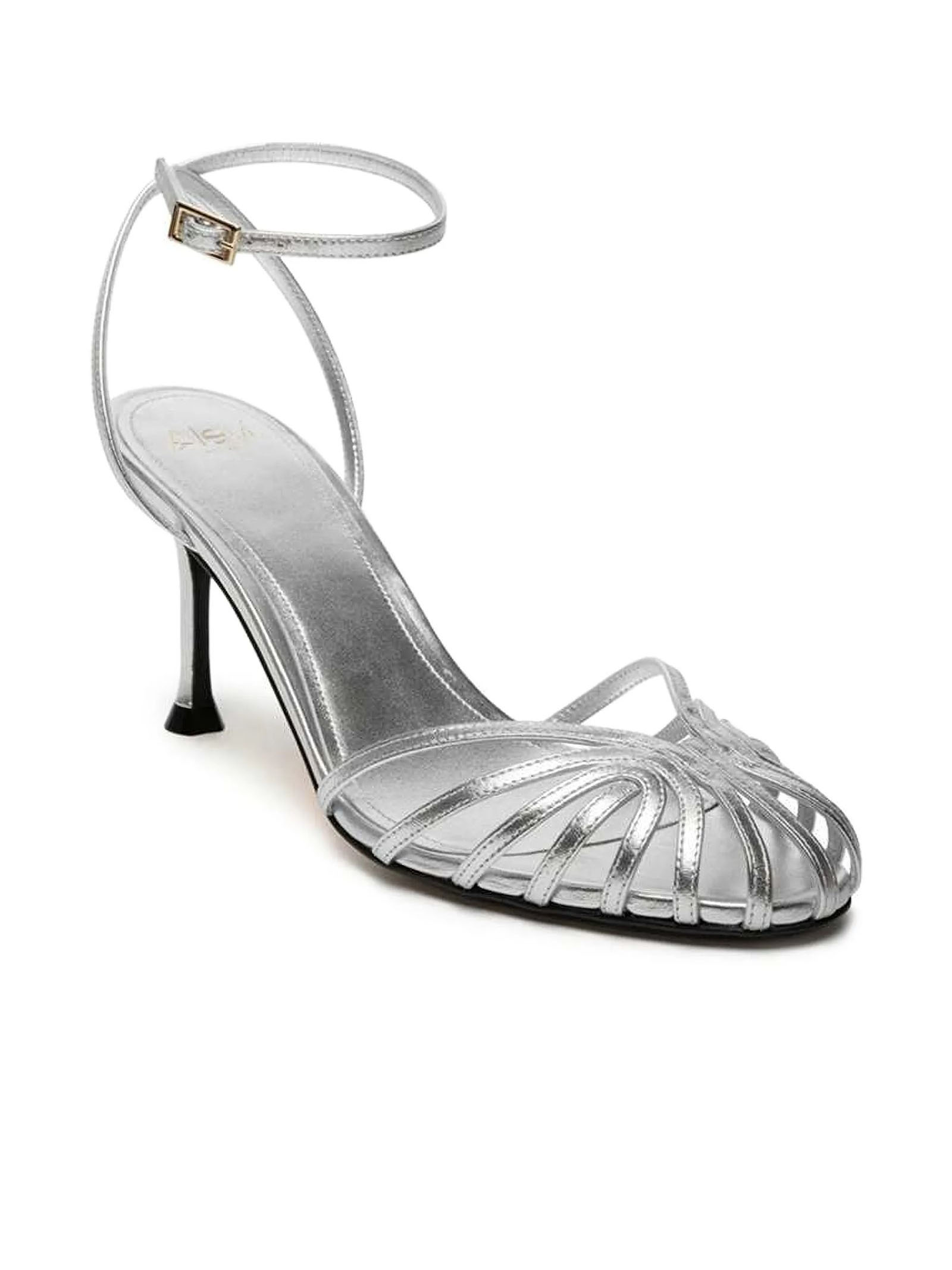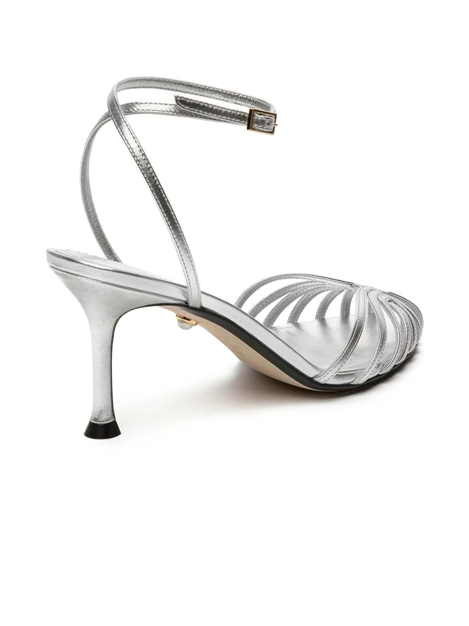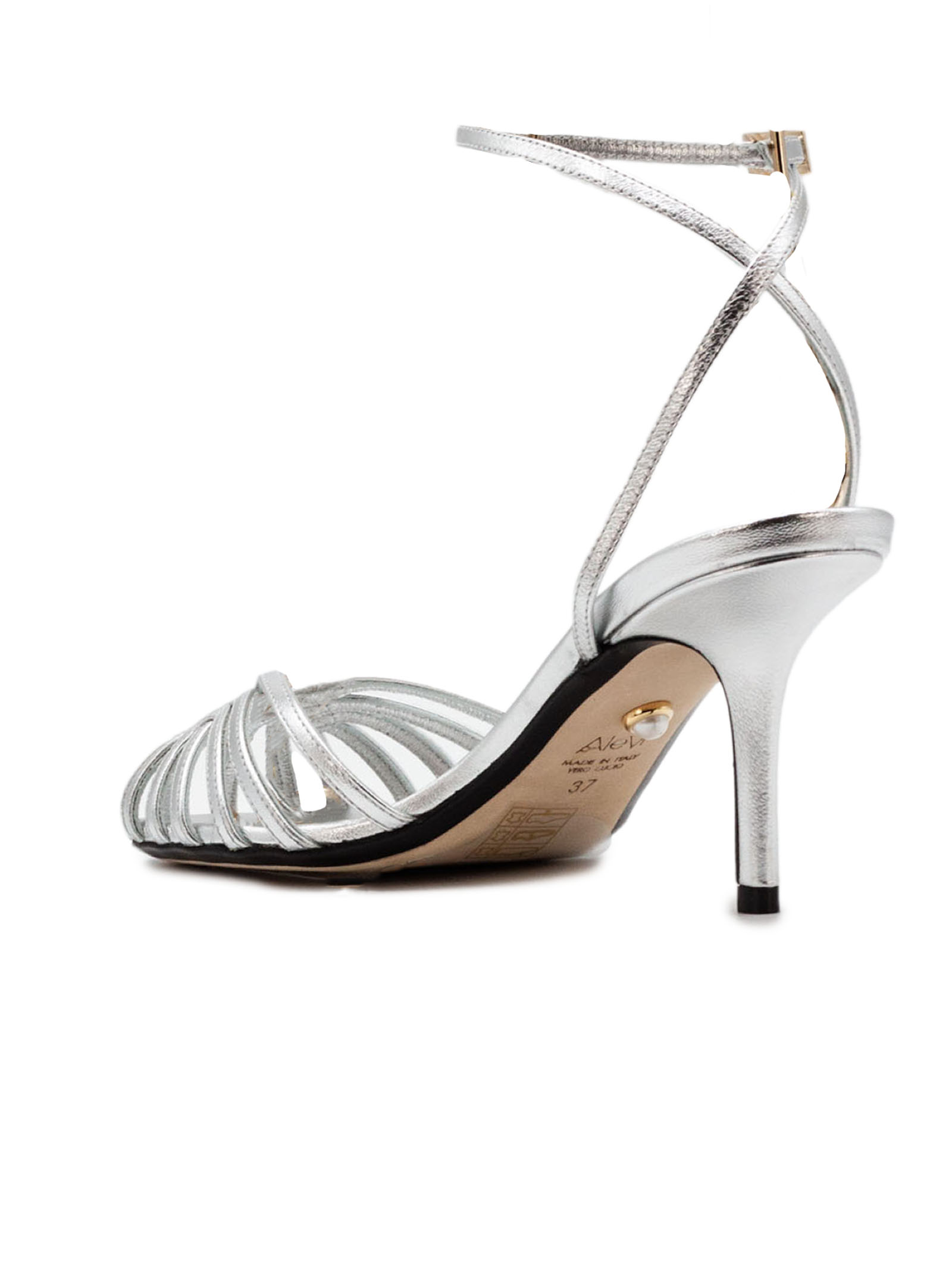 Sandalo Blake 75 Roger Shine argento, gabbia in pelle laminata con tacco ricoperto in tono, caratterizzato da listini sottili in punta e cinturino incrociato alla caviglia con piccola fibbia laterale, altezza tacco 75mm