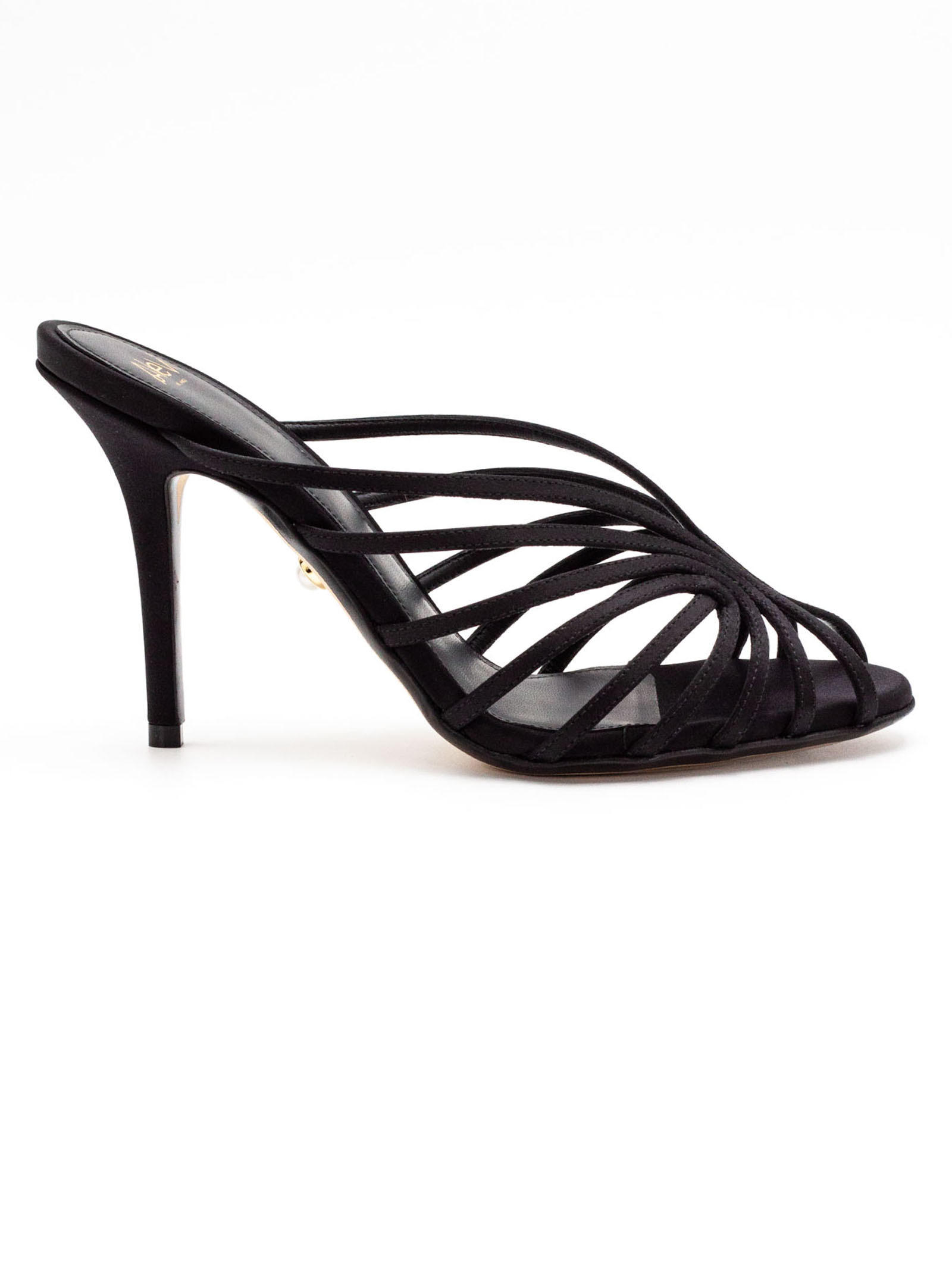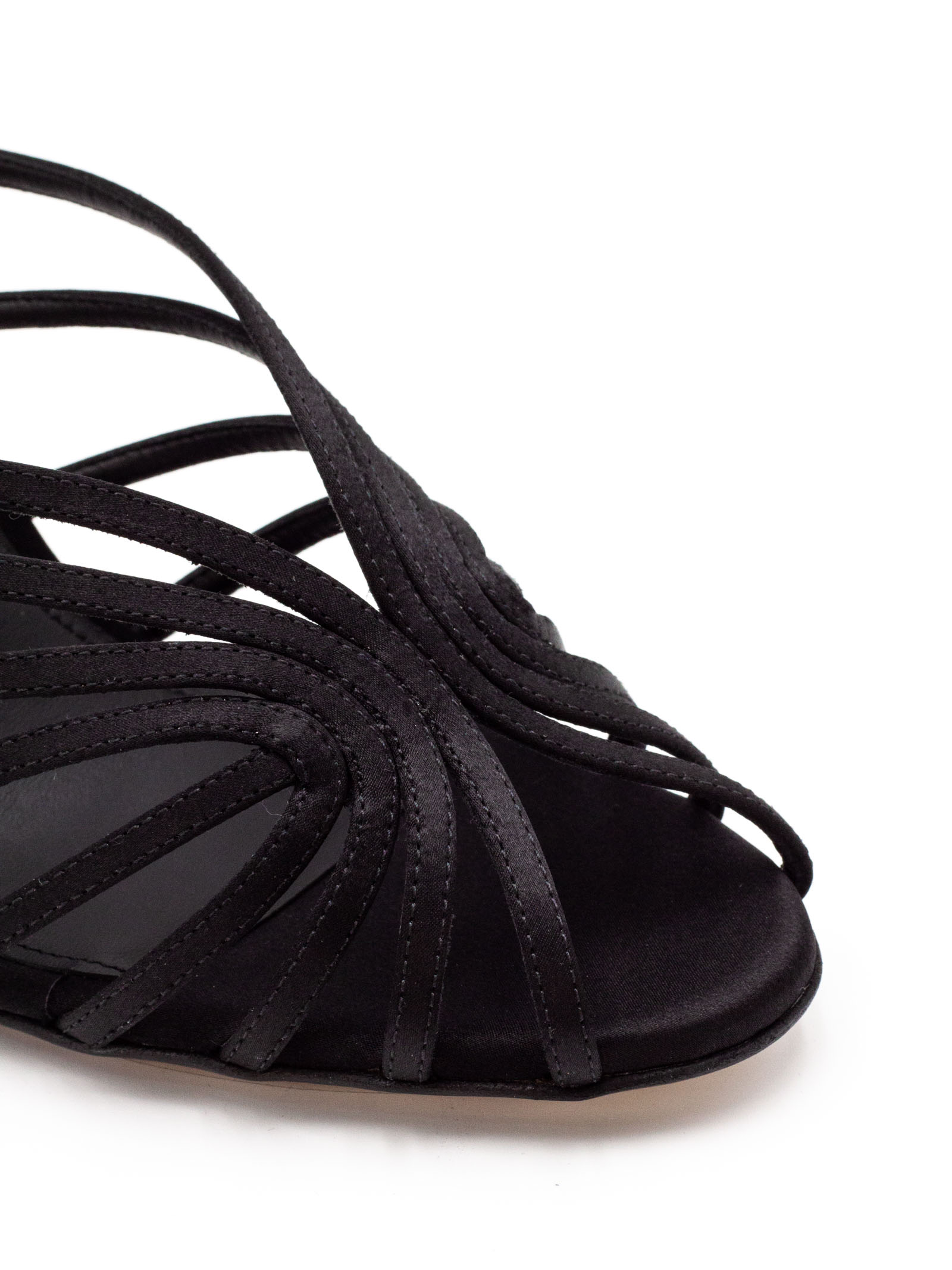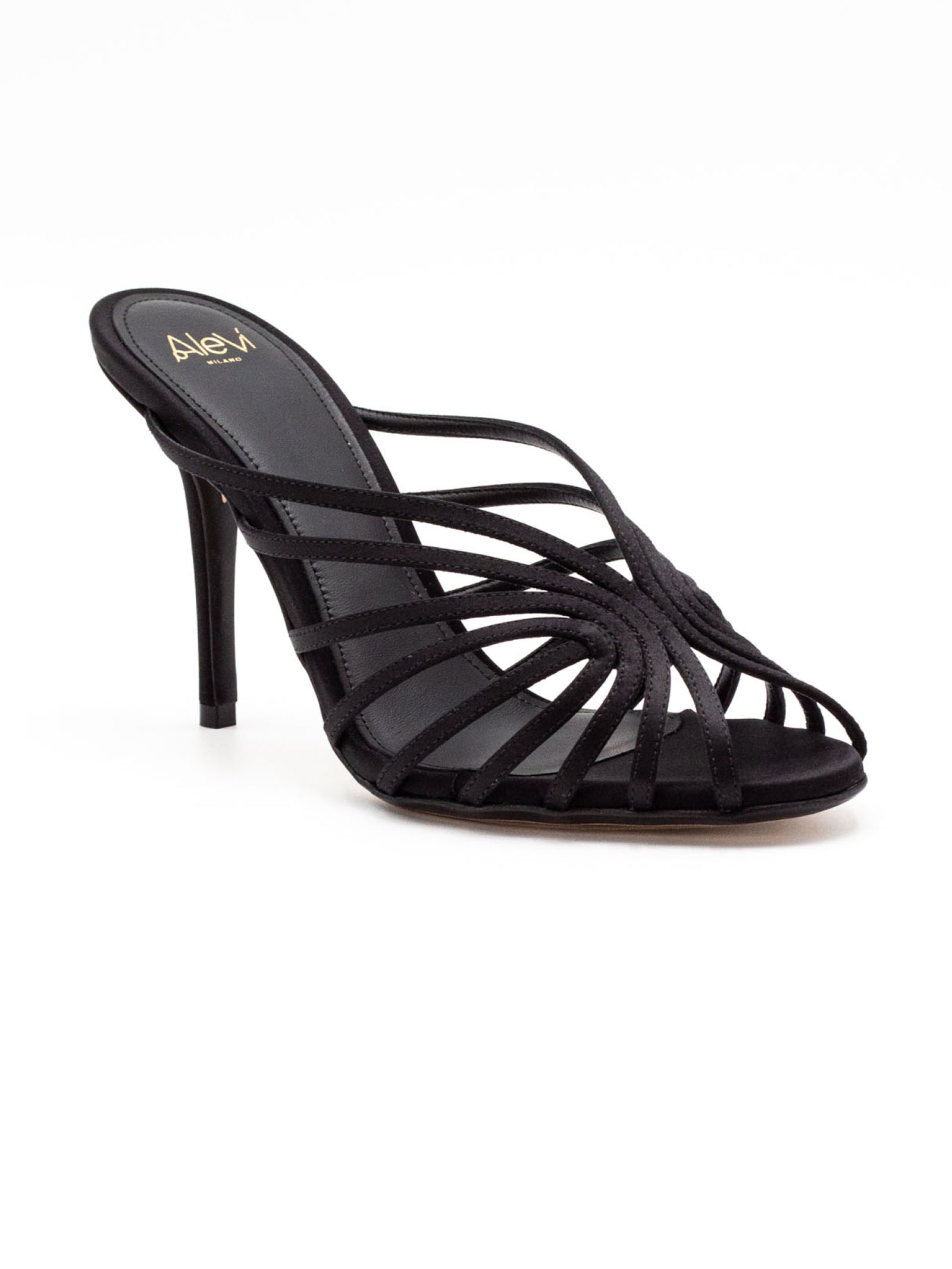 Sandalo Diana 95 in raso nero, listini asimmetrici, suola in cuoio con logo, altezza tacco 95mm