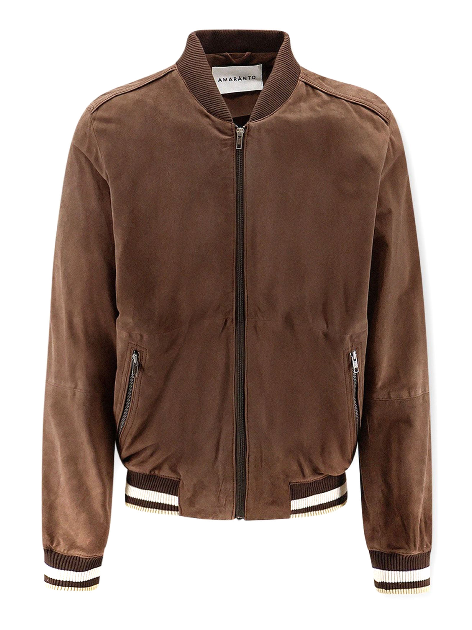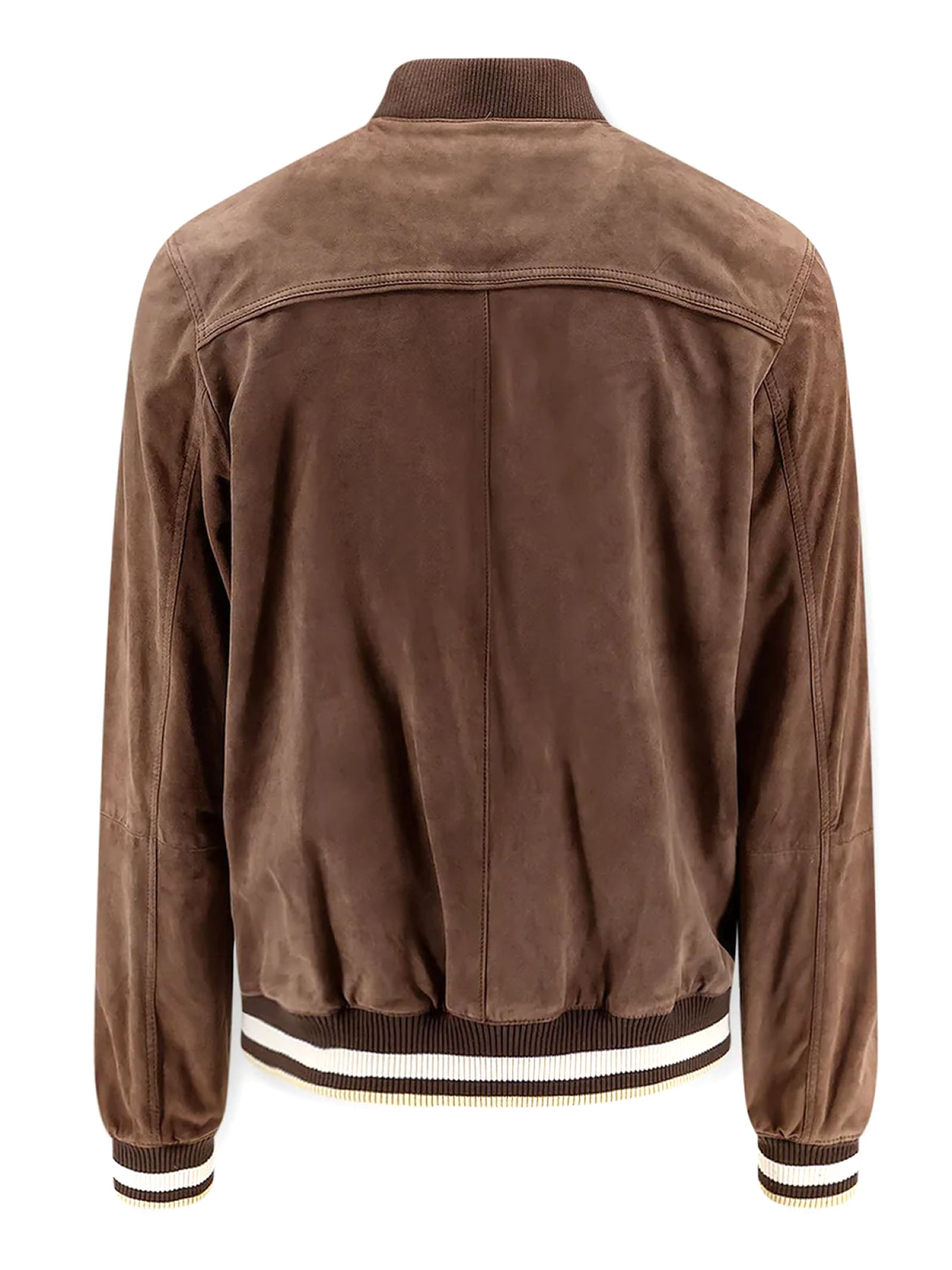 Bomber in suede marrone con con zip, tasche anteriori con zip, manica lunga con polsino a costine, profili a costine a righe