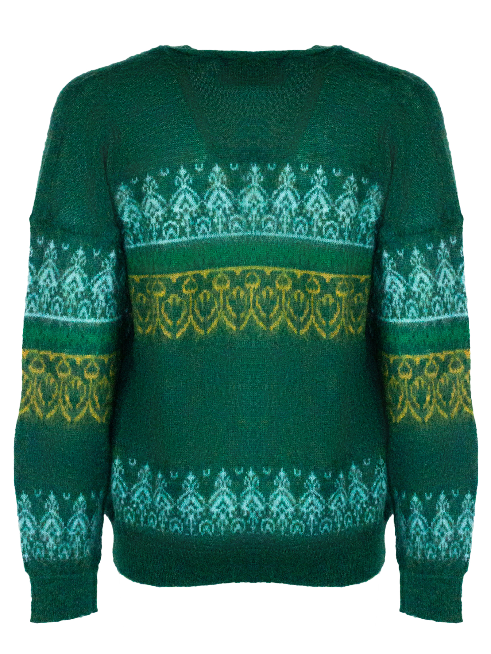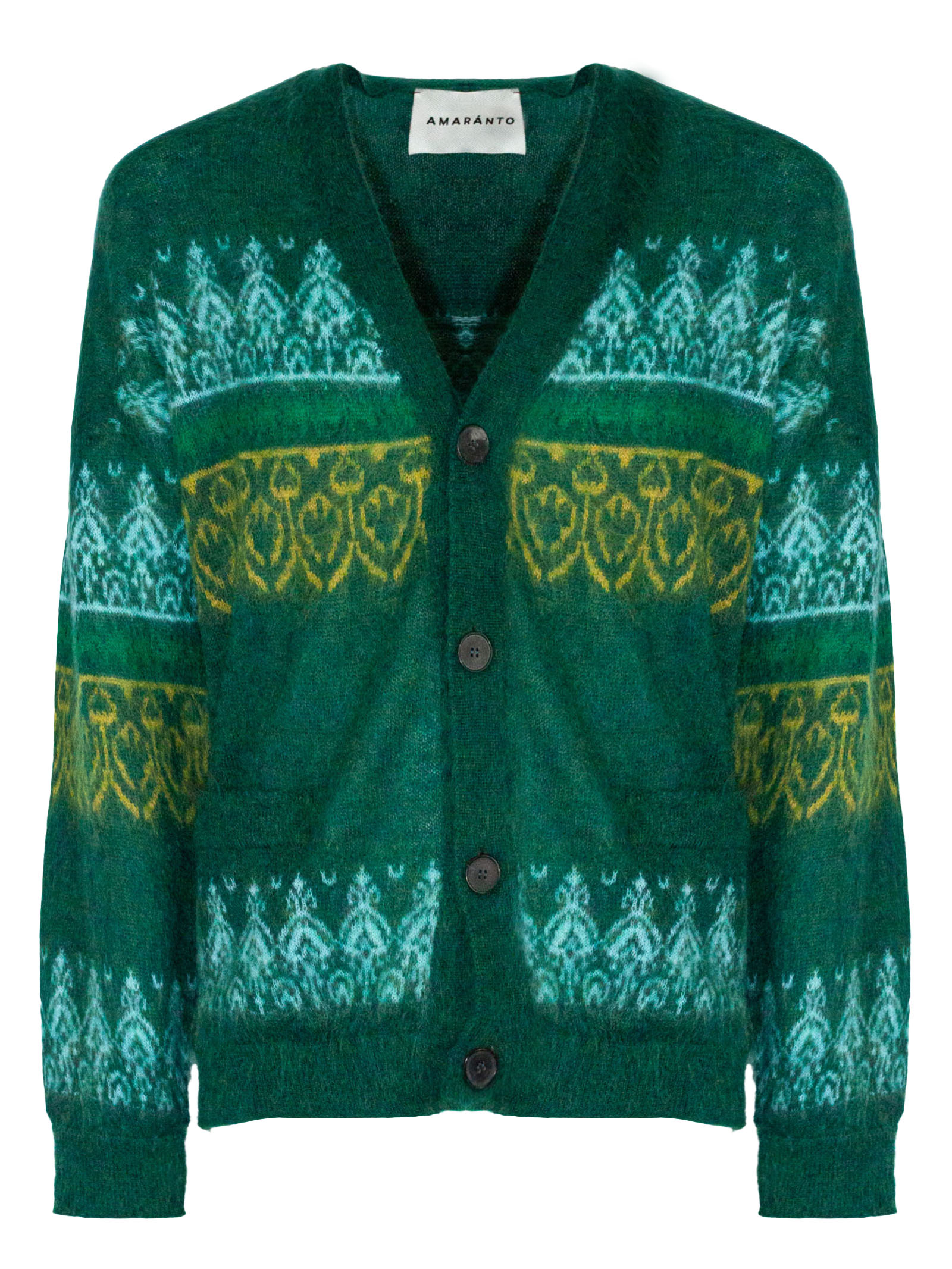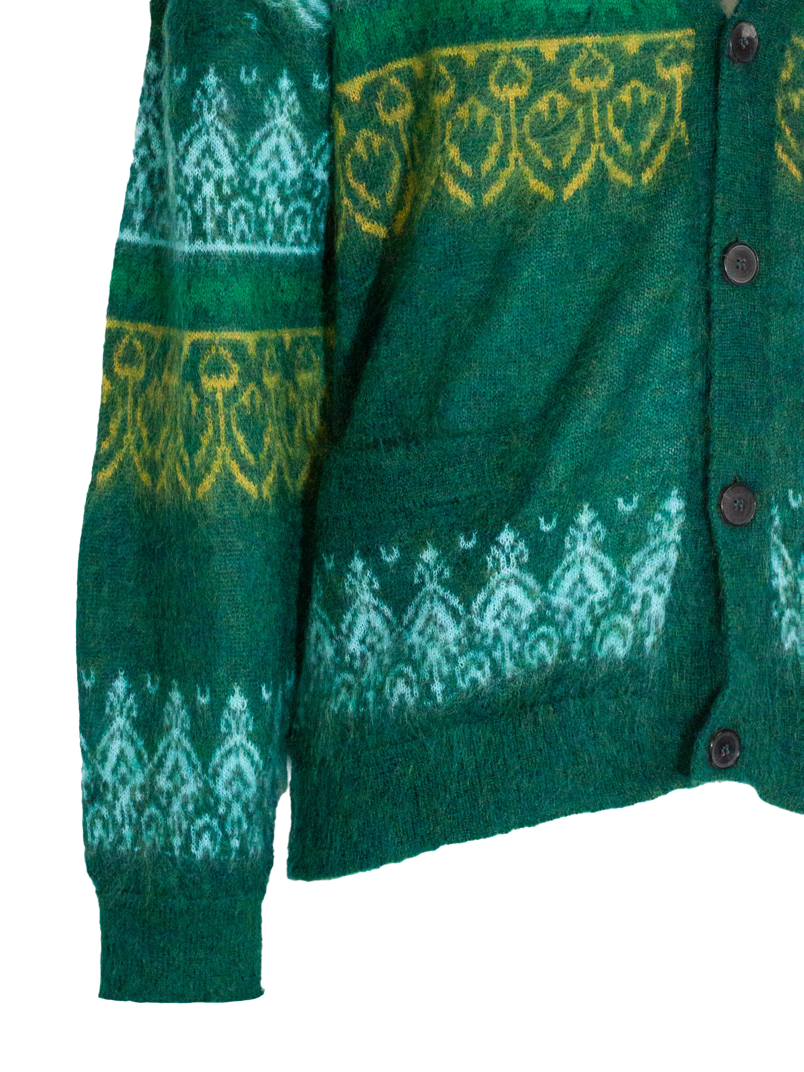 Cardigan in misto mohair e lana verde, design all over, chisuura frontale con bottoni, scollo a V profondo, finiture a coste