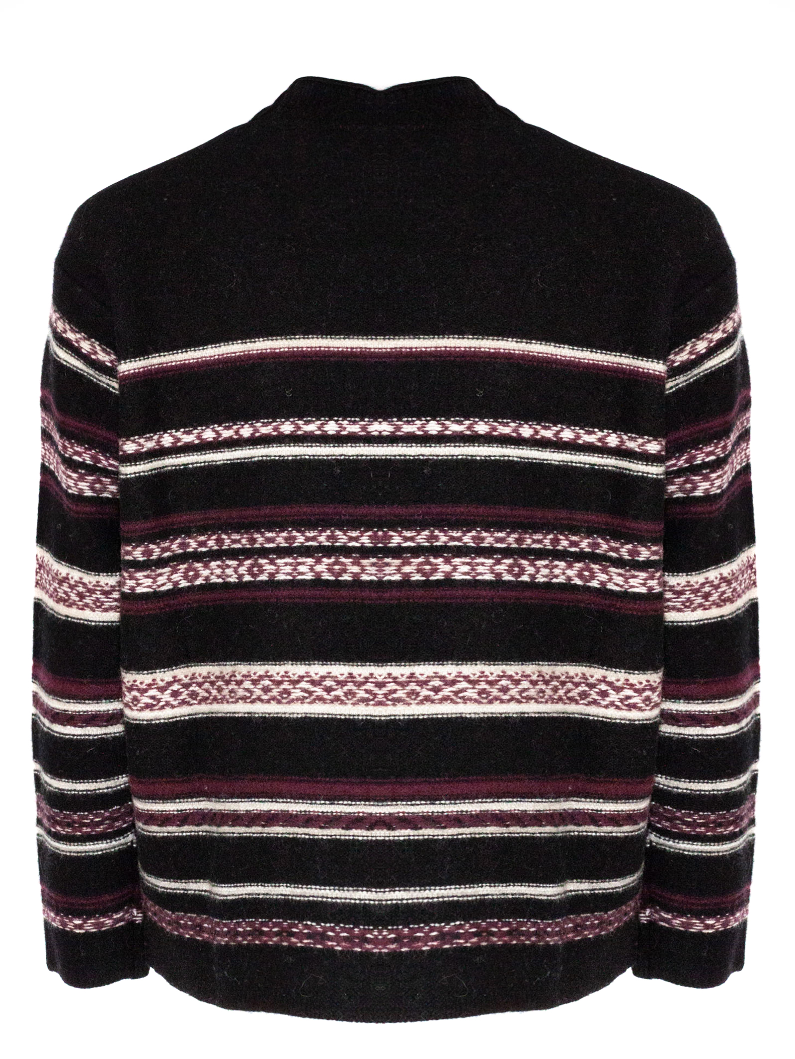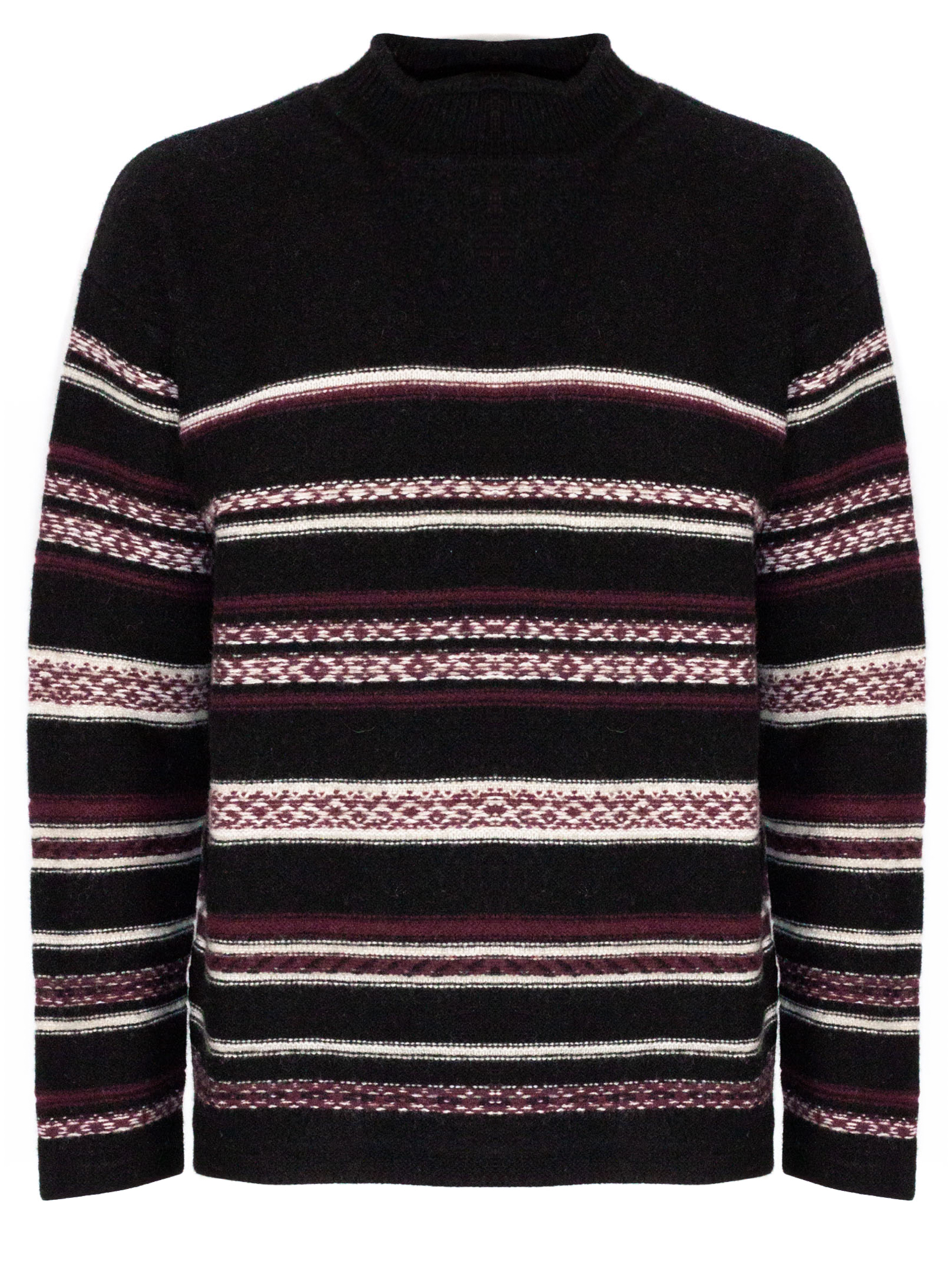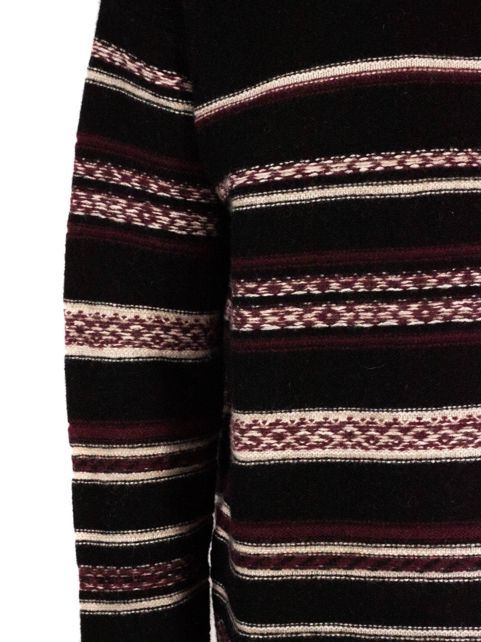 Maglia in lana nera con design a righe bianche e bordeaux, mezzo collo, maniche lunghe, finiture a coste